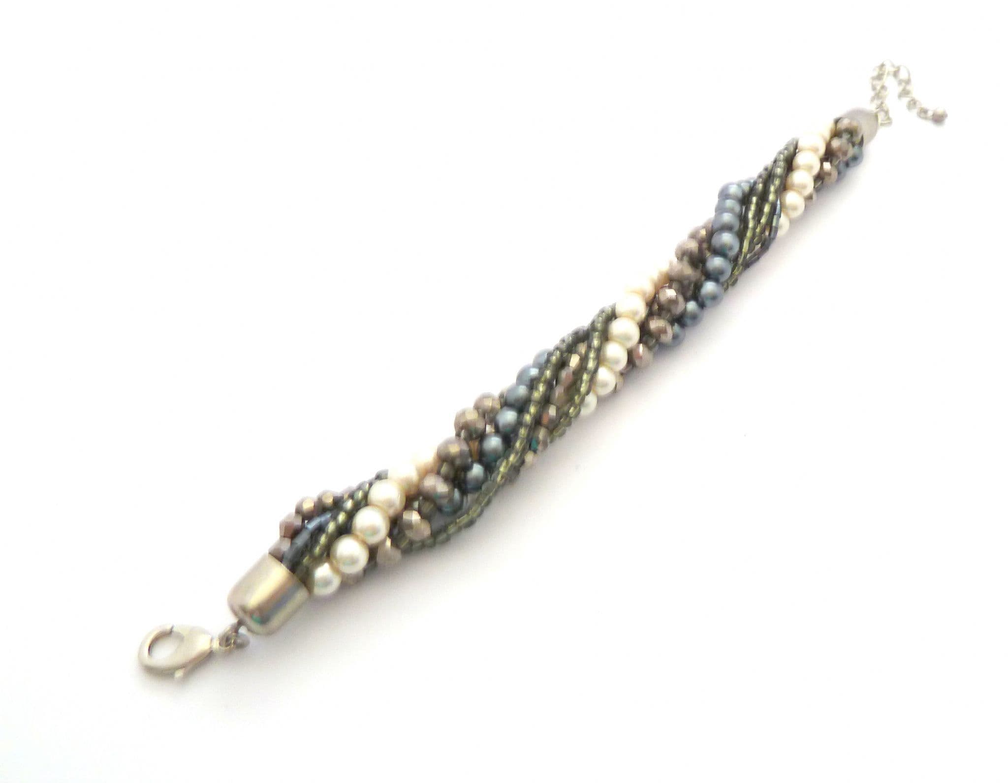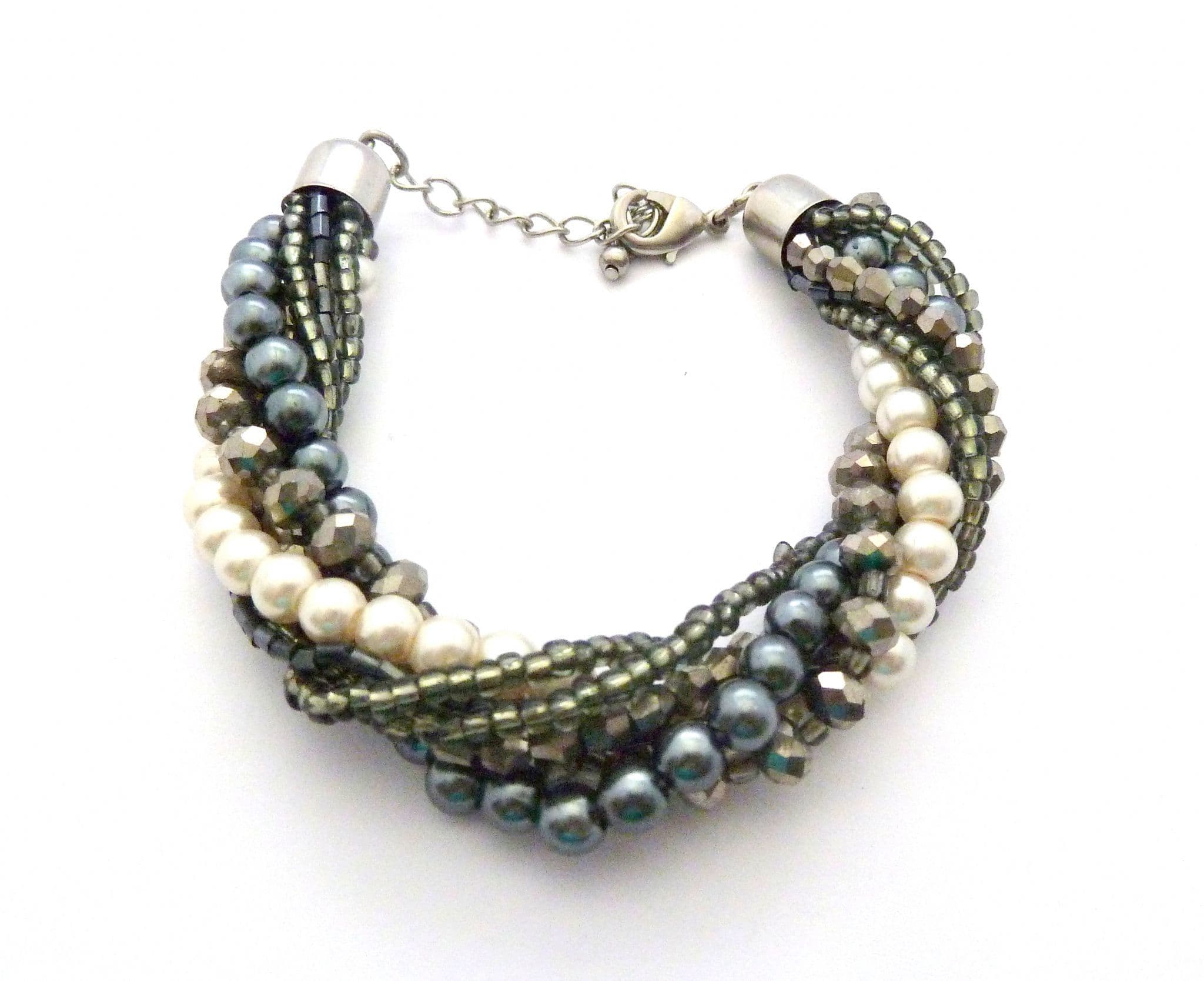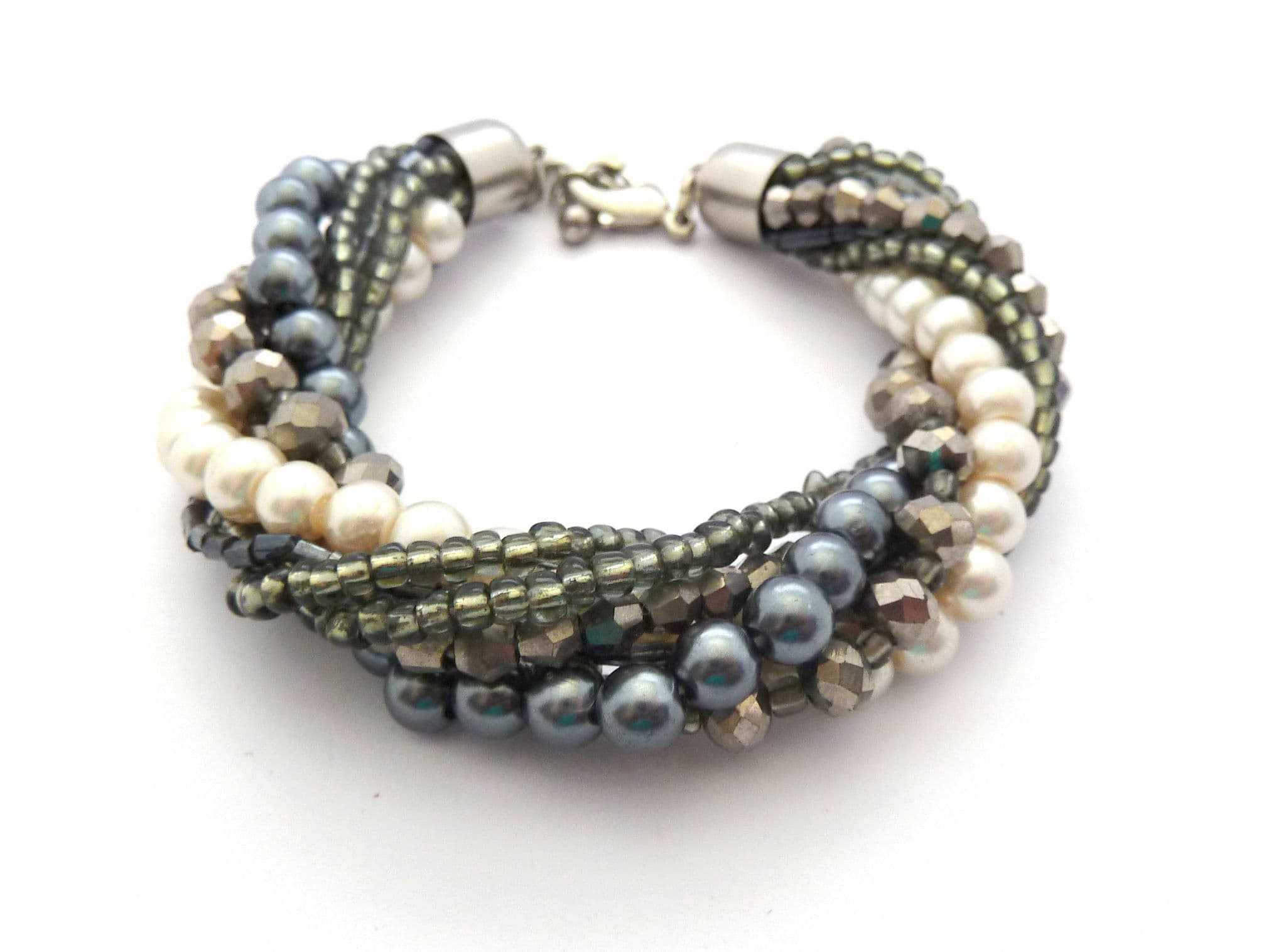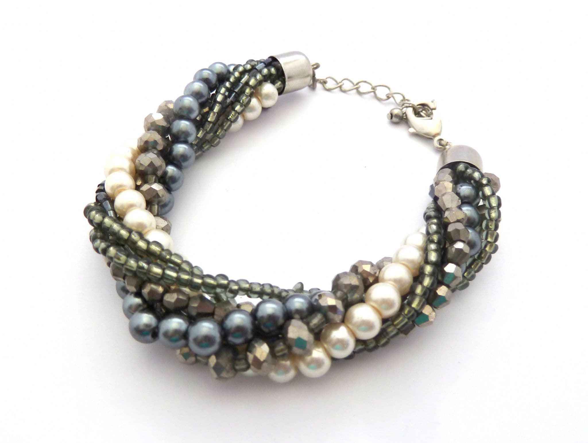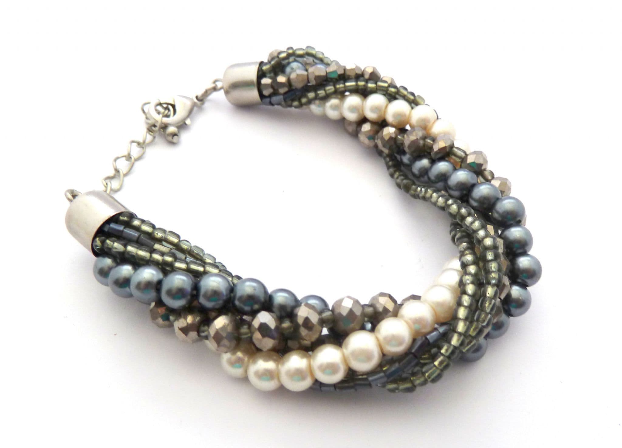 Chunky twisted faux pearl and grey beaded twisted torsade design bracelet. The bracelet is formed from seven strands of faux pearl and grey mixed beads, twisted together to form a chunky torsade style single rope. Adjustable length lobster claw fastener.