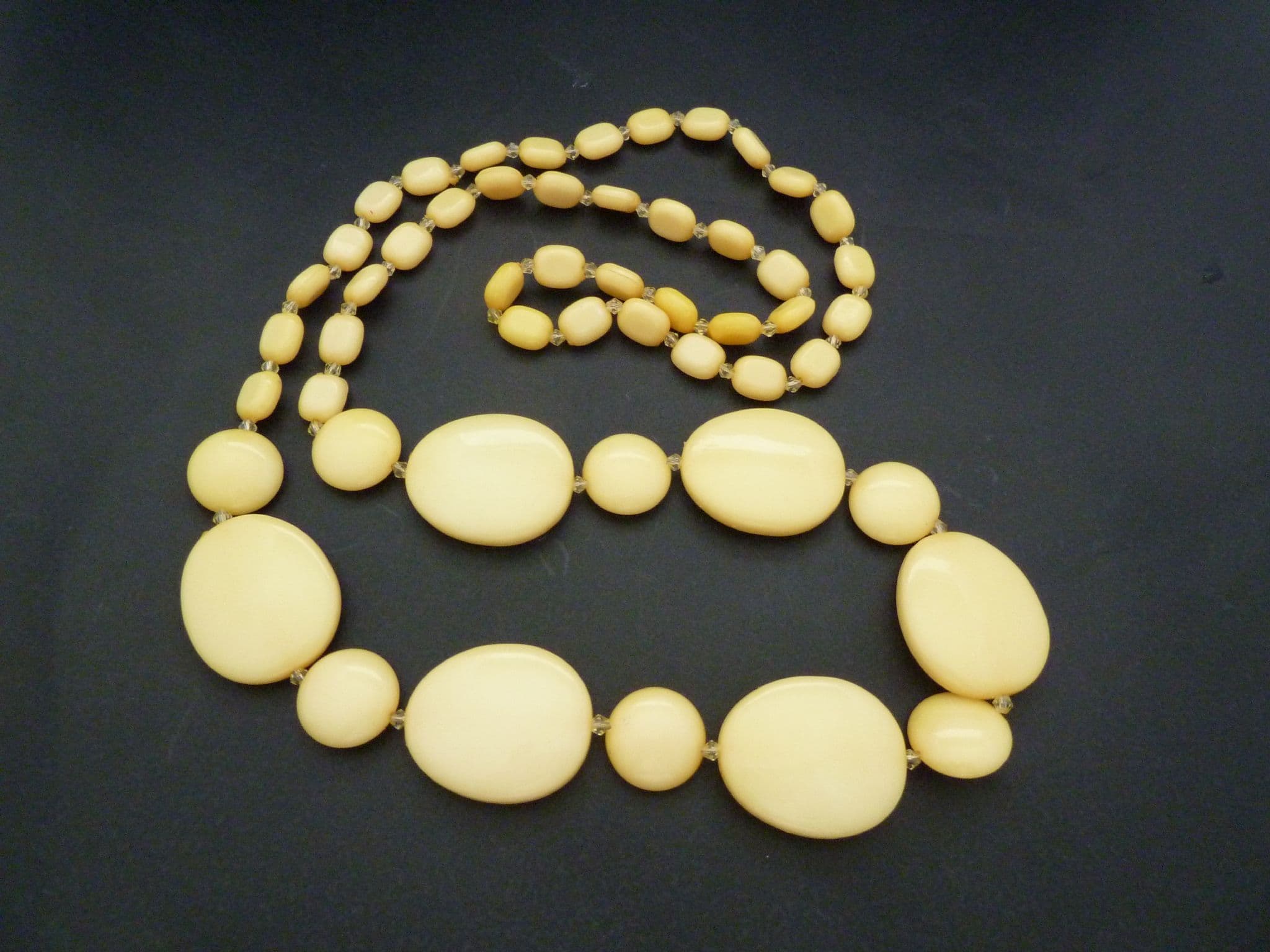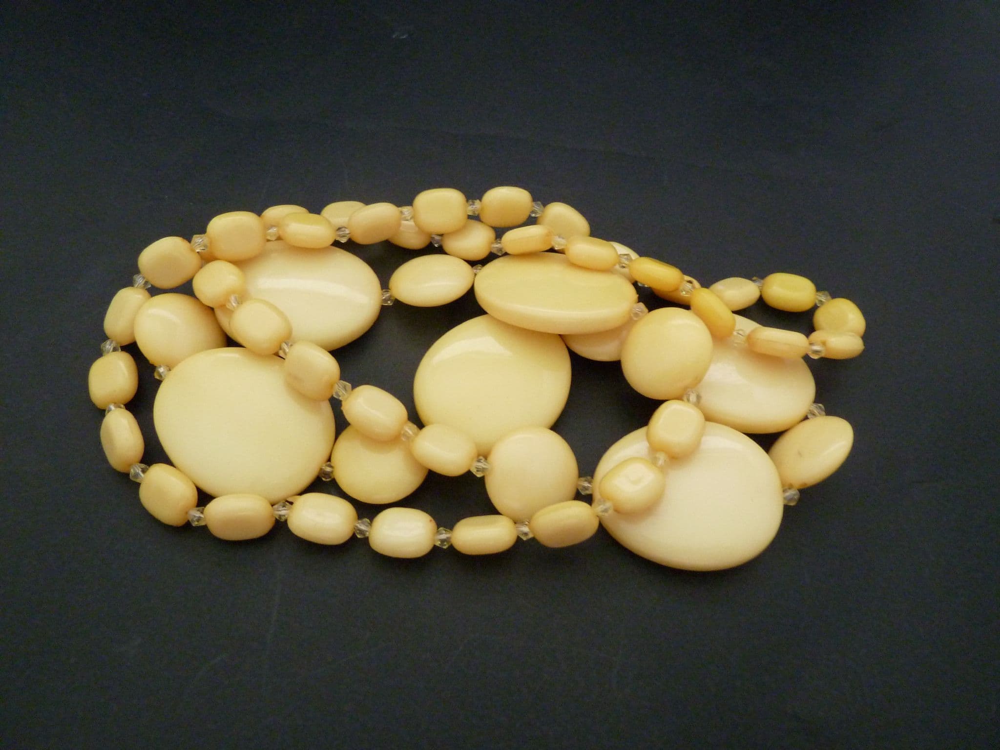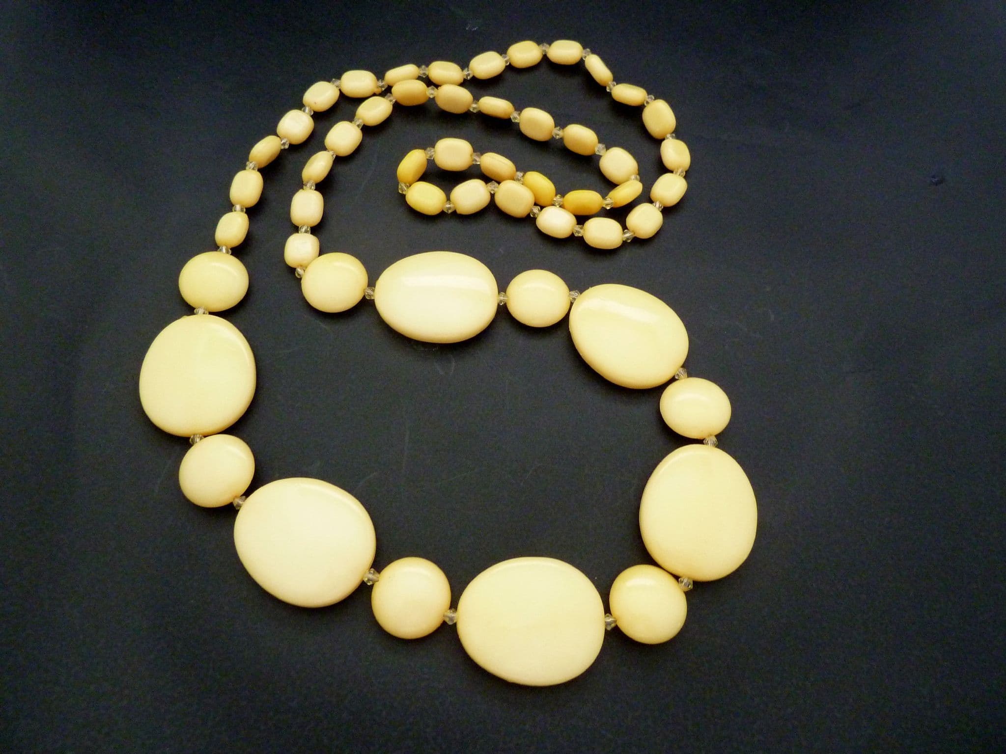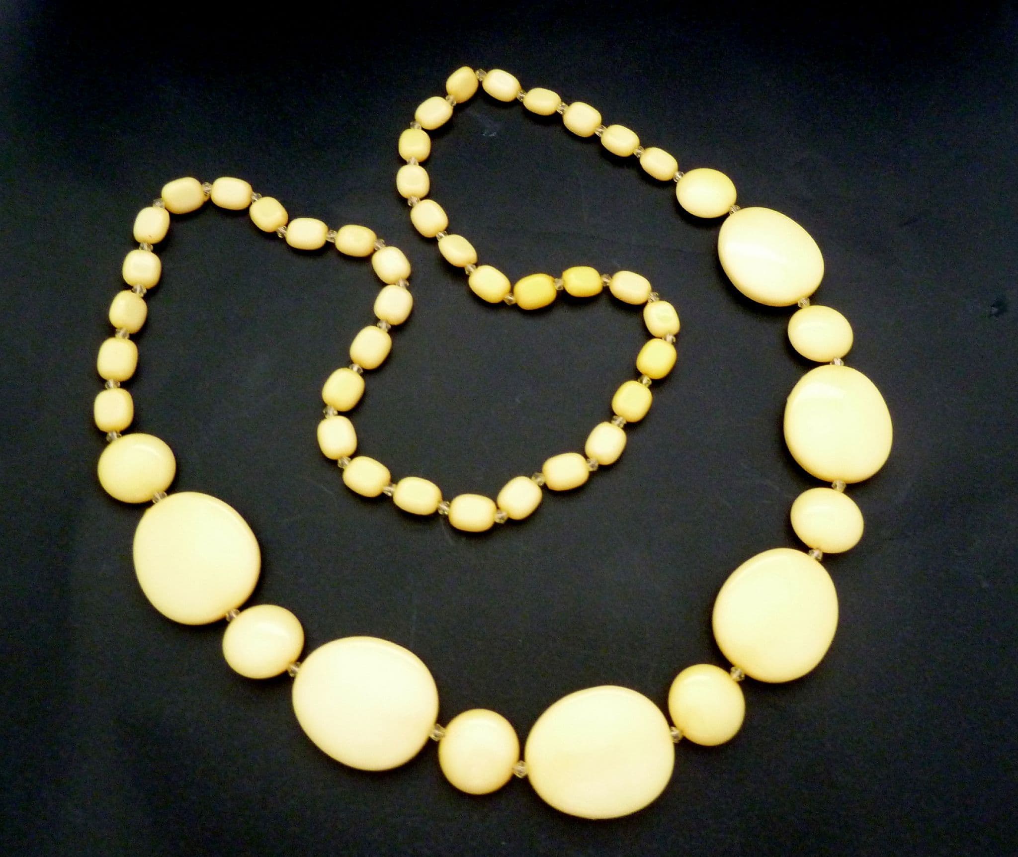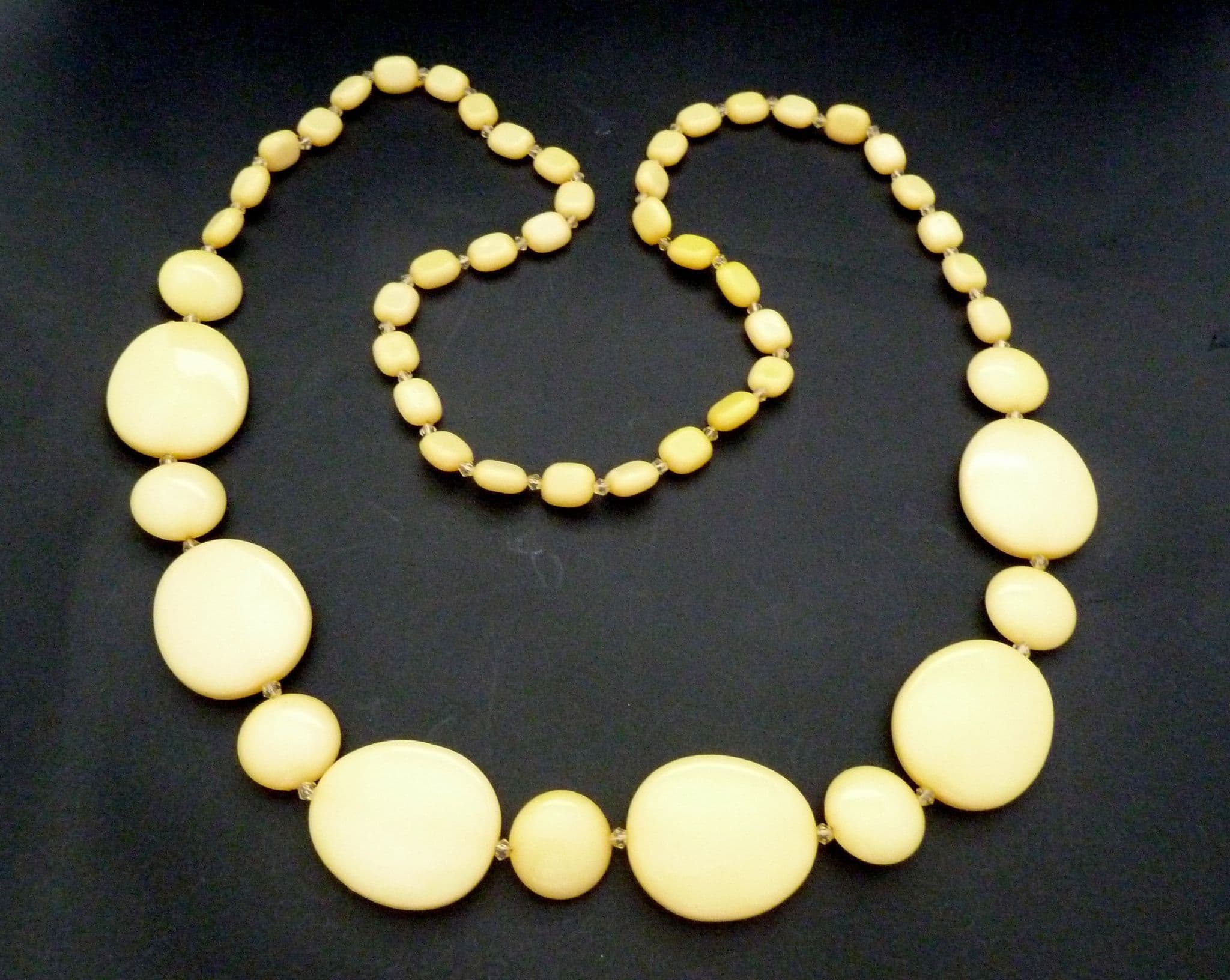 A vintage chunky long length mellow yellow beaded retro style necklace. The necklace is formed from graduating in size yellow, flattened disc beads, with small clear crystal seed bead dividers beads. No fastener it doesn't need one simply lift on and off.