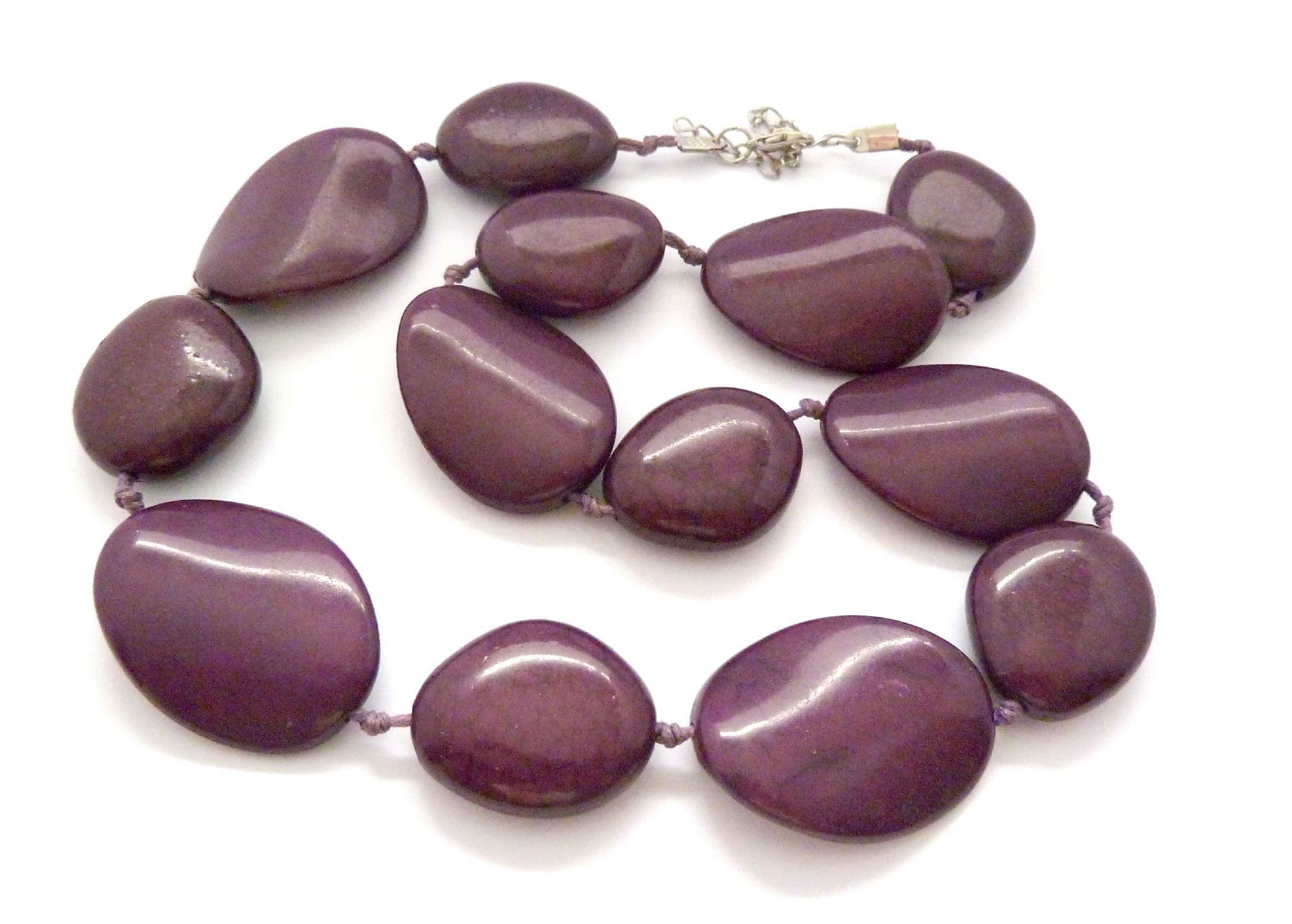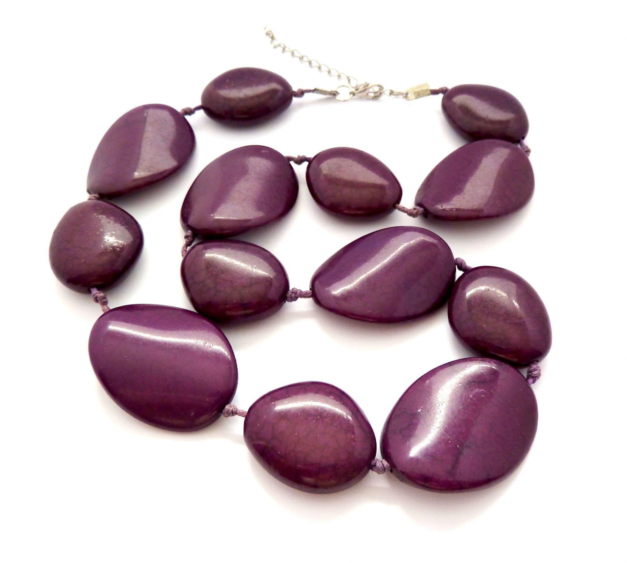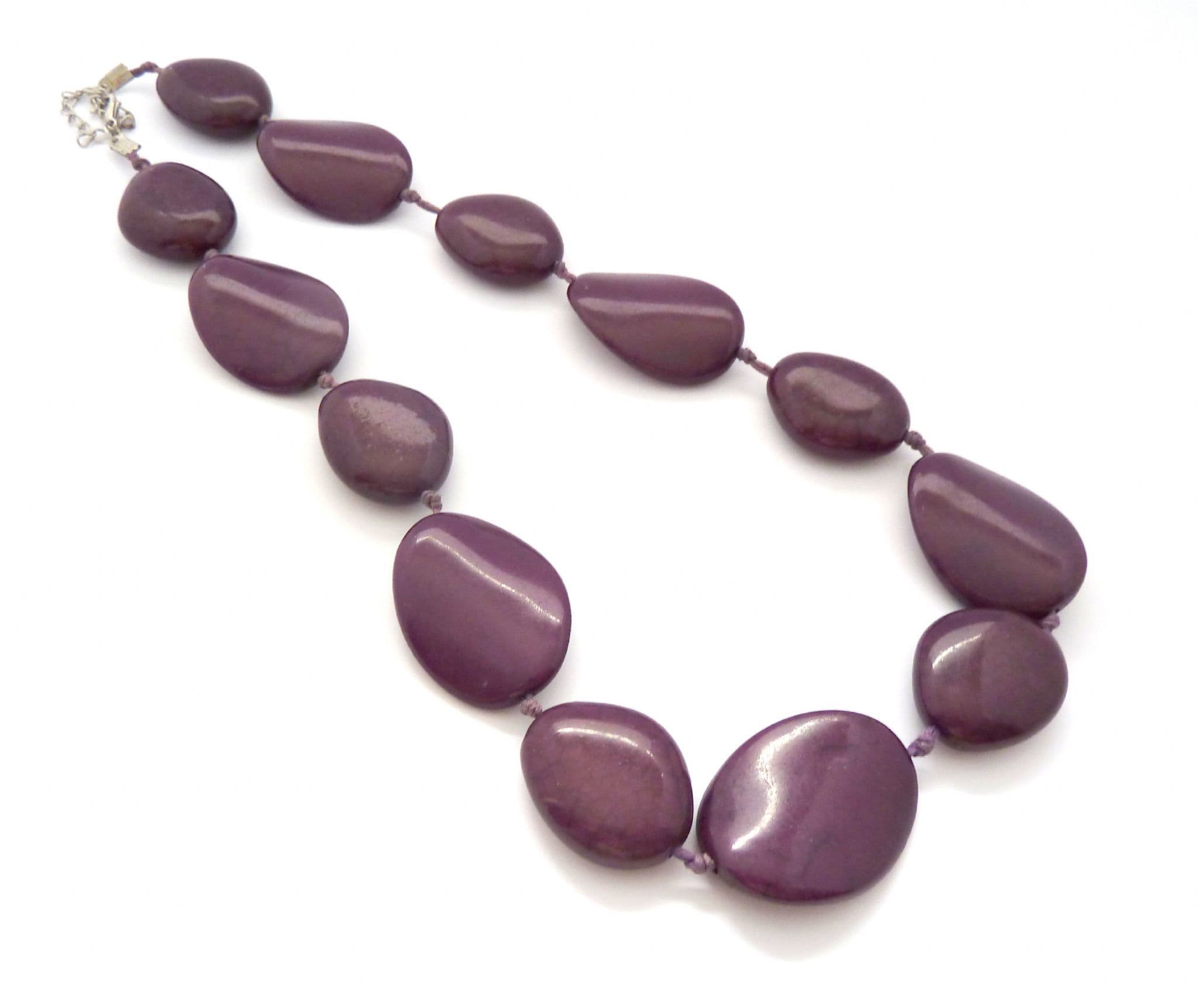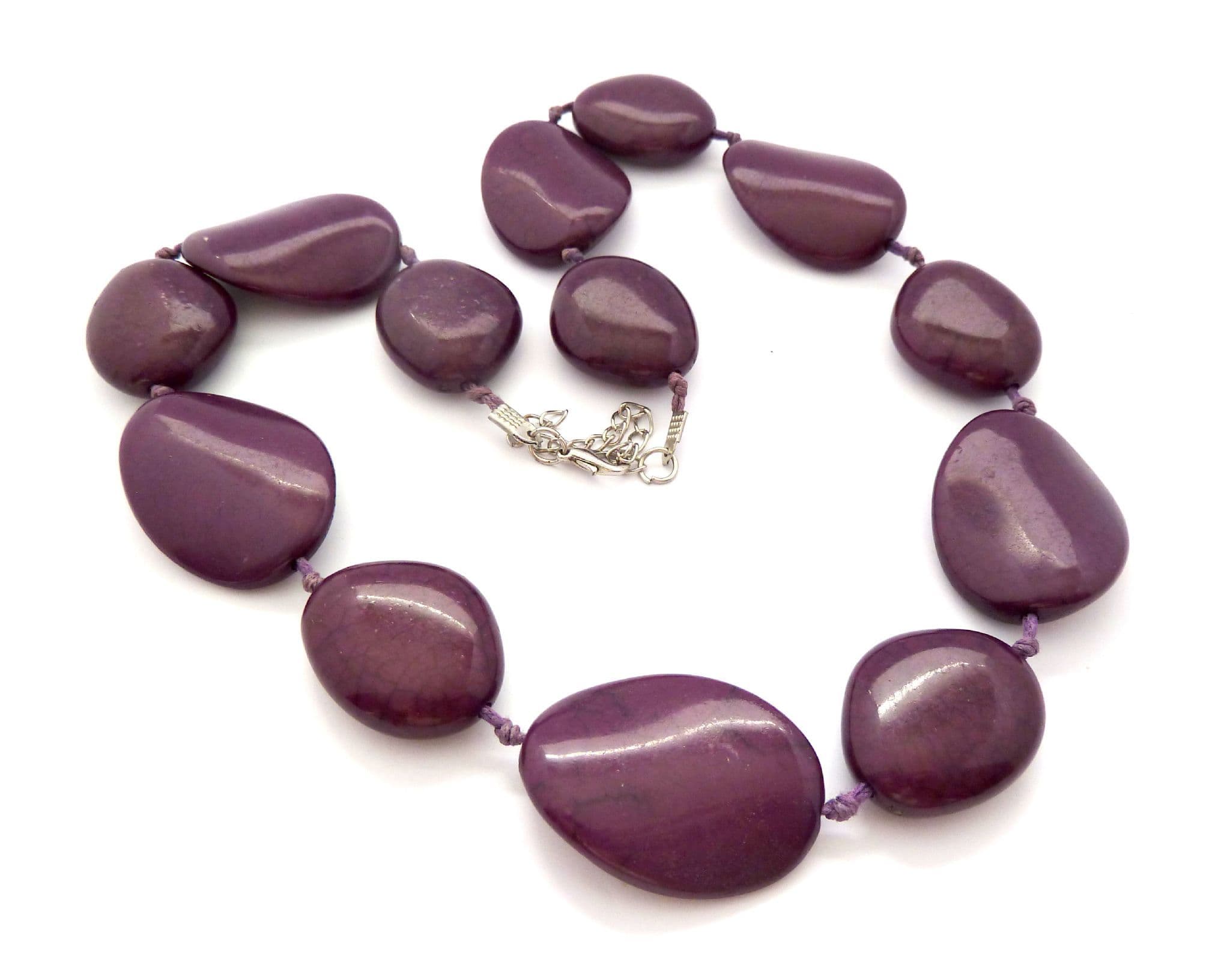 Chunky purple plastic beaded retro design matinee adjustable length necklace. The necklace is formed from uniform in size purple oval and abstractly shaped lucite beads with hand hand knotting. Fastened with an adjustable length lobster claw clasp. .