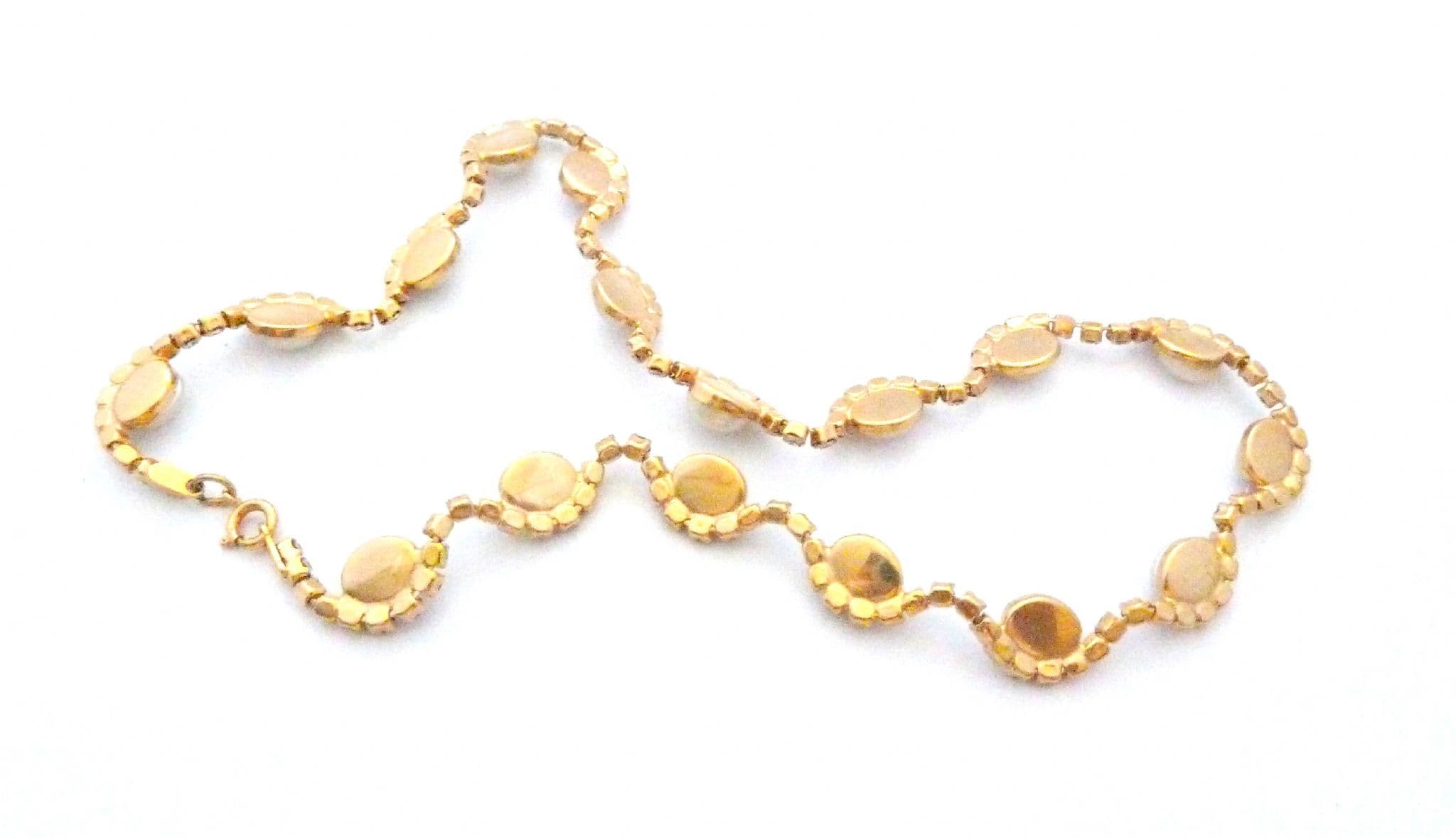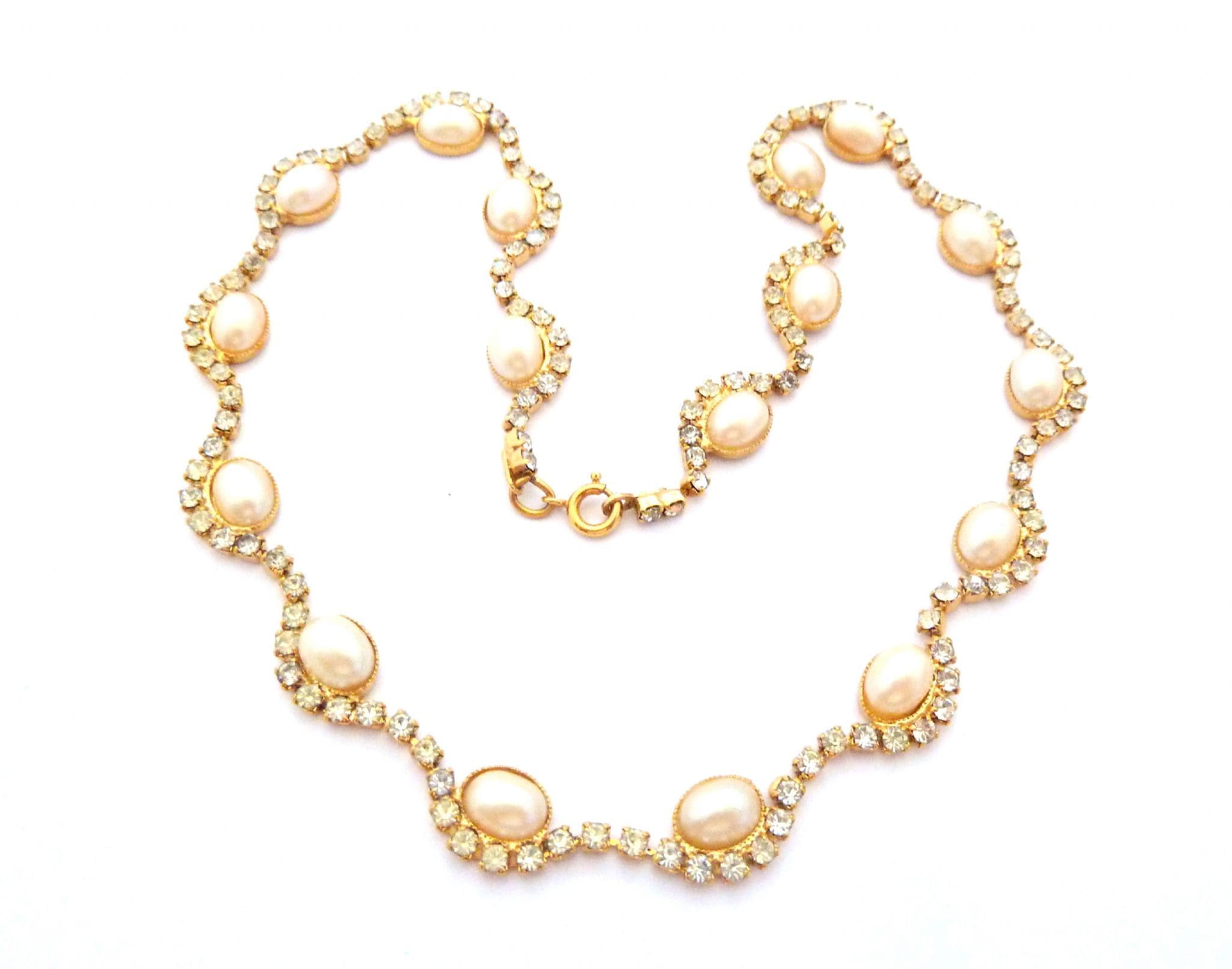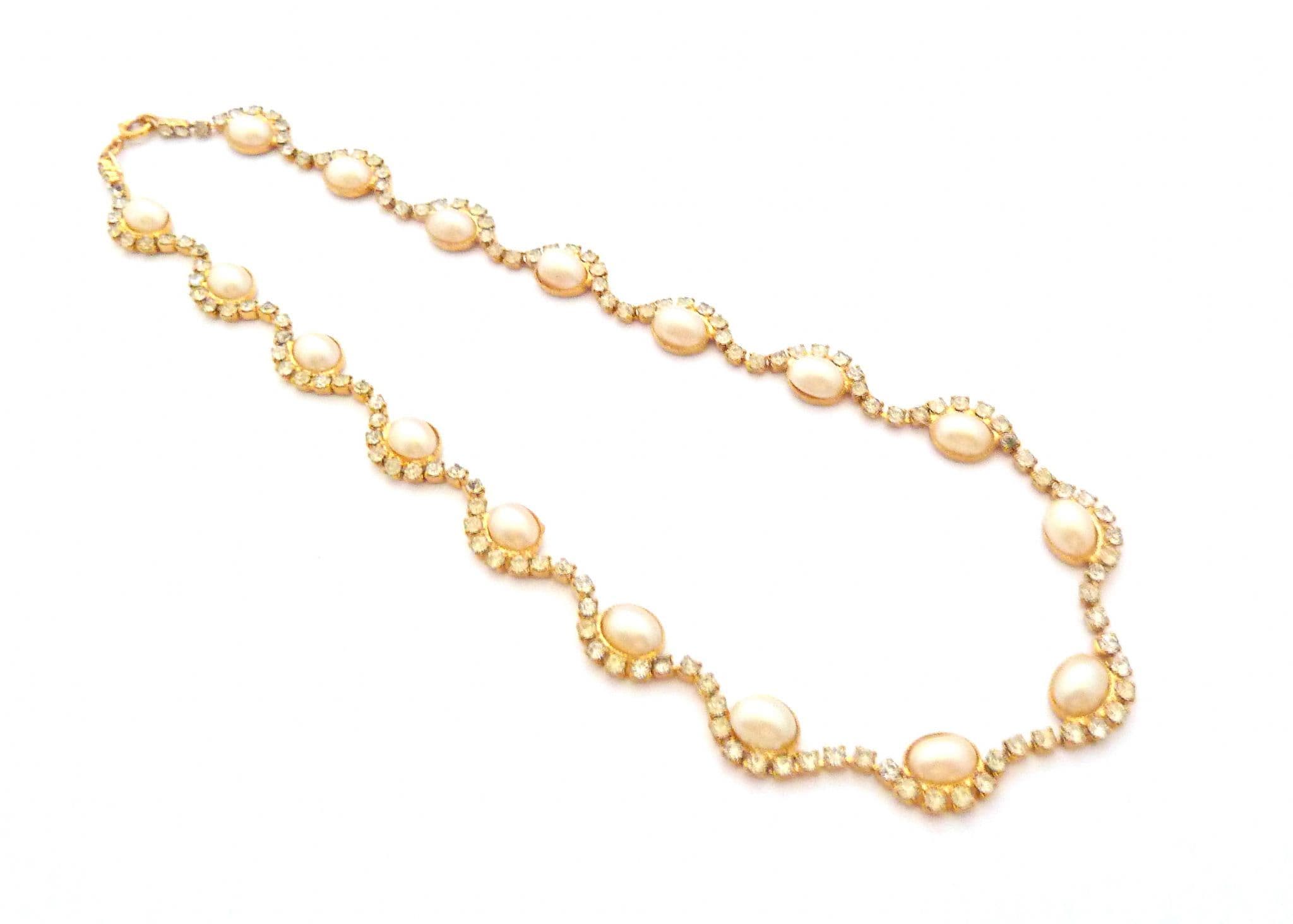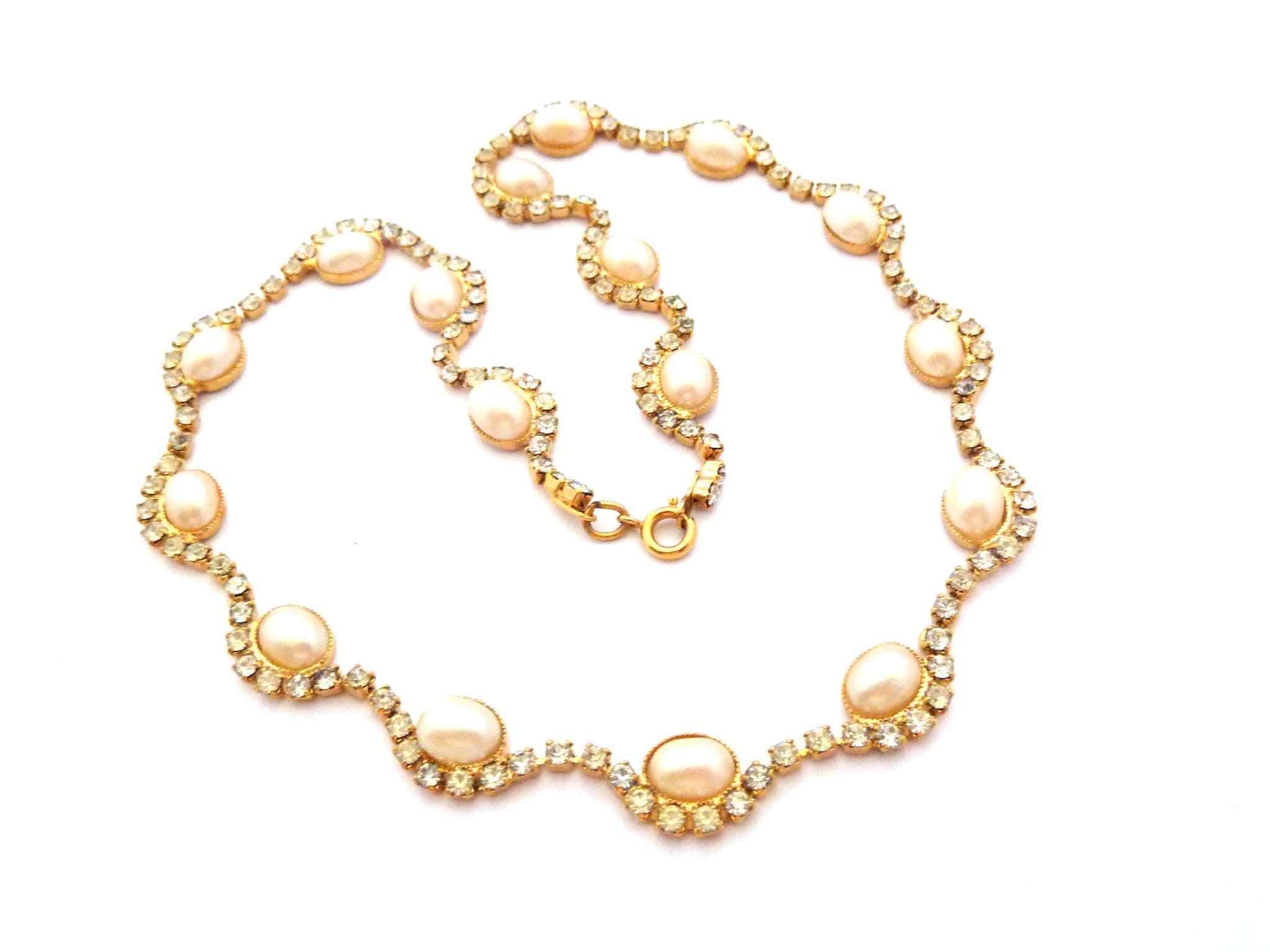A faux pearl and clear rhinestone set ornate design choker necklace. The necklace is formed from gold tone metal set with a single row of clear rhinestones with faux pearl detailing creating a lightly scalloped shaped design The necklace has a spring ring clasp. Circa Y2K.