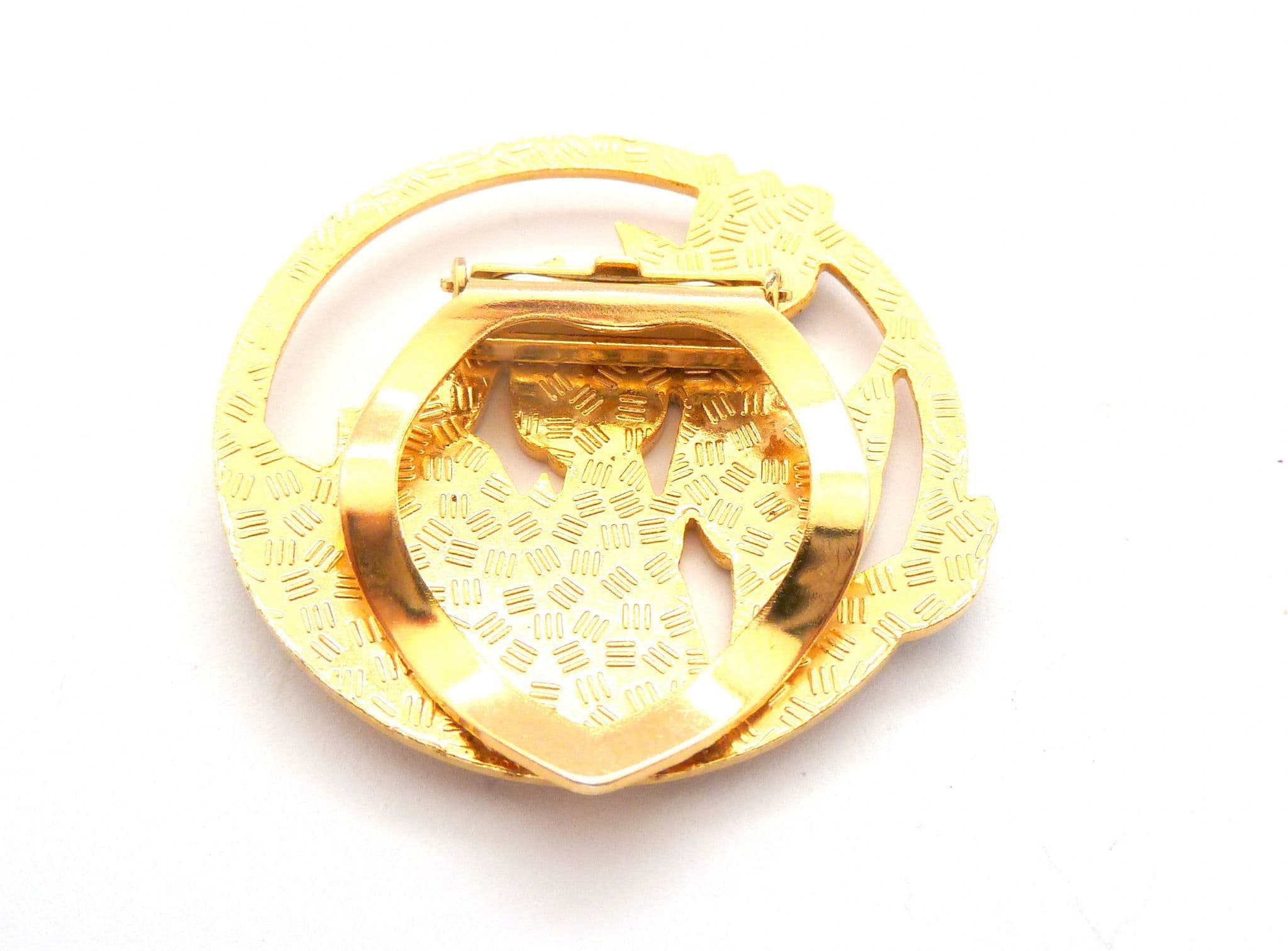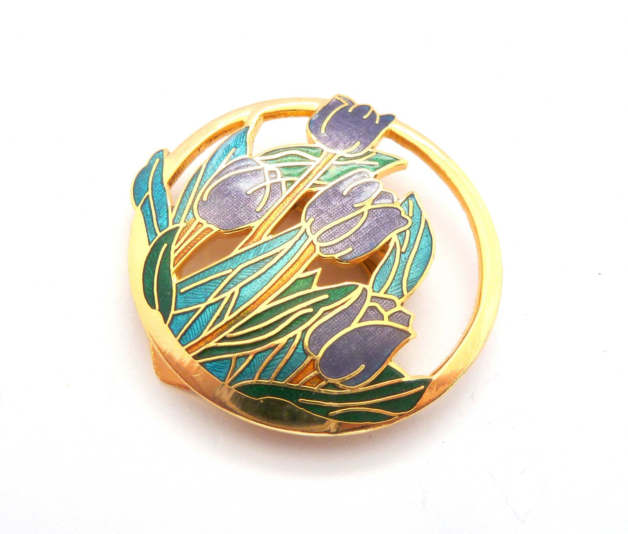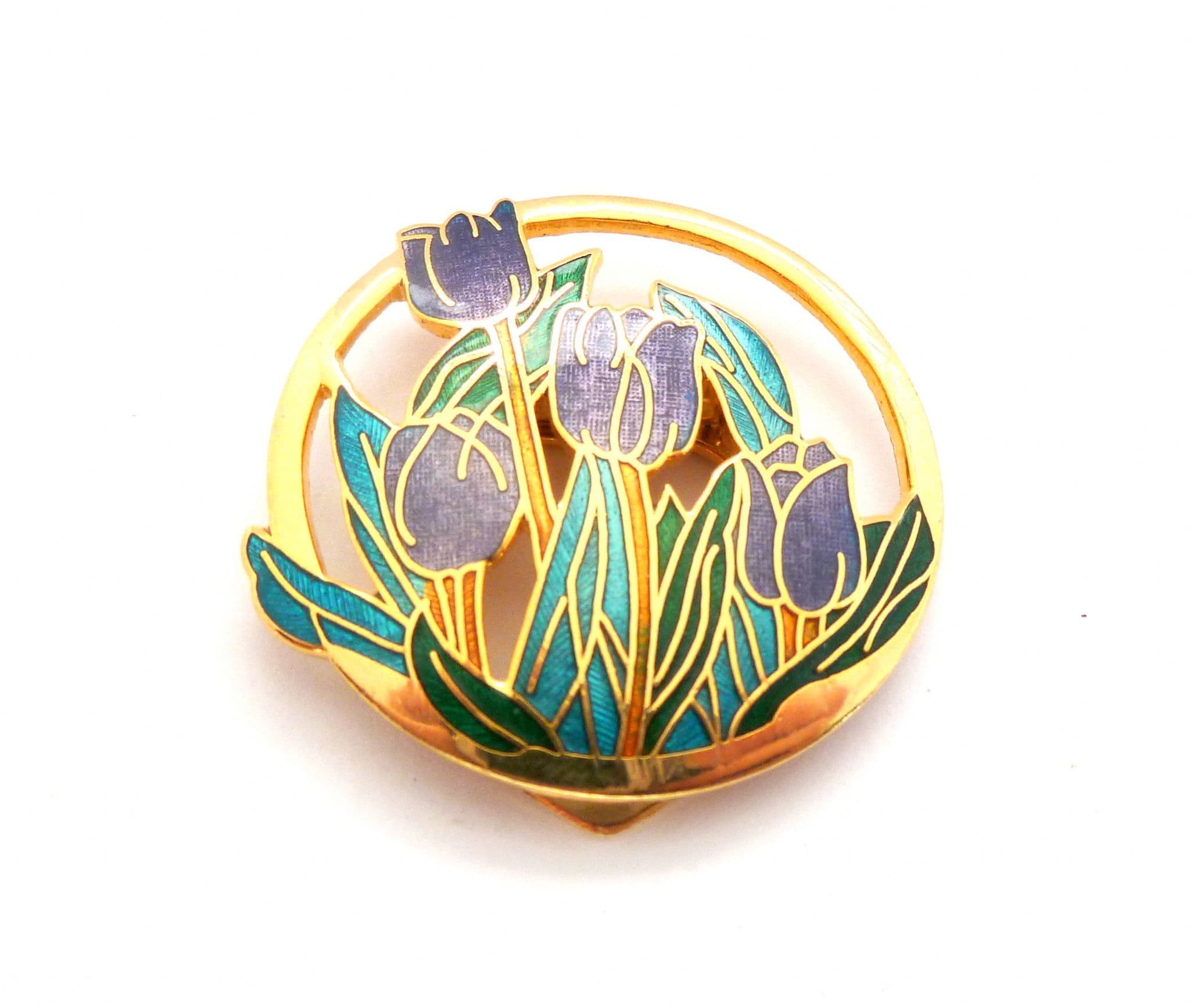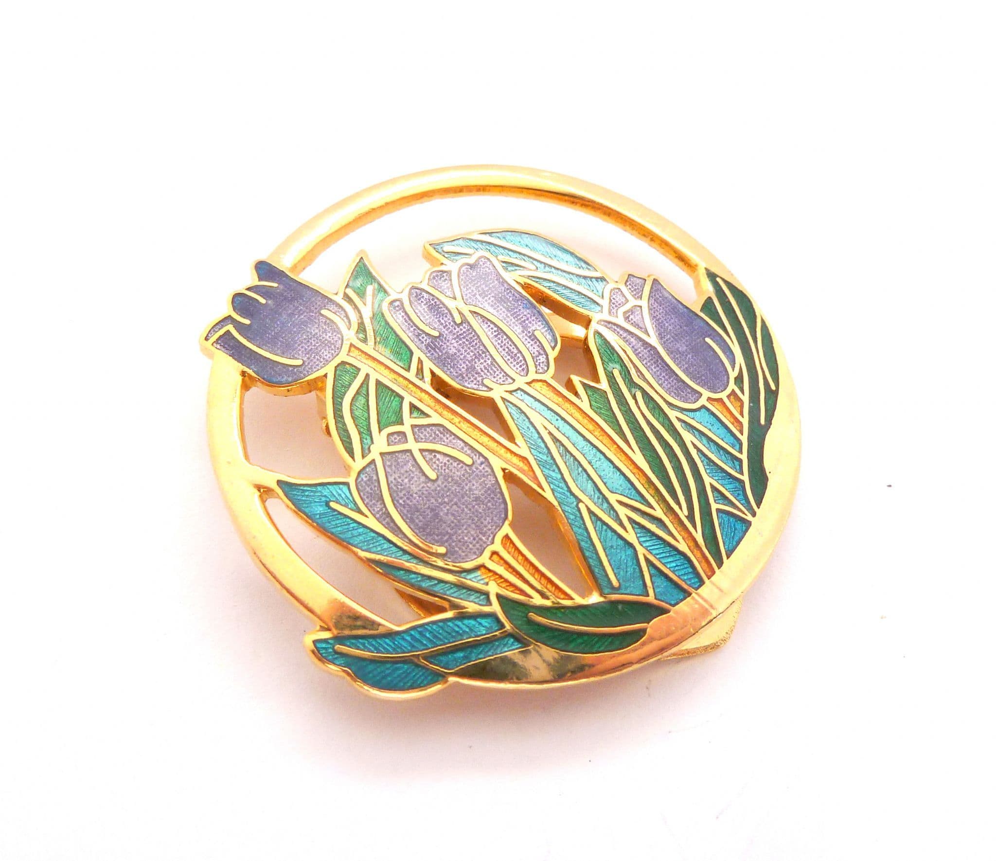 Vintage large circular shaped cloisonne enamel tulip flower design scarf clip. Formed from gold tone metal in a circular shape with a tulip flower design in cloisonne enamel. Strong clip mechanism to the back. Circa Y2K.