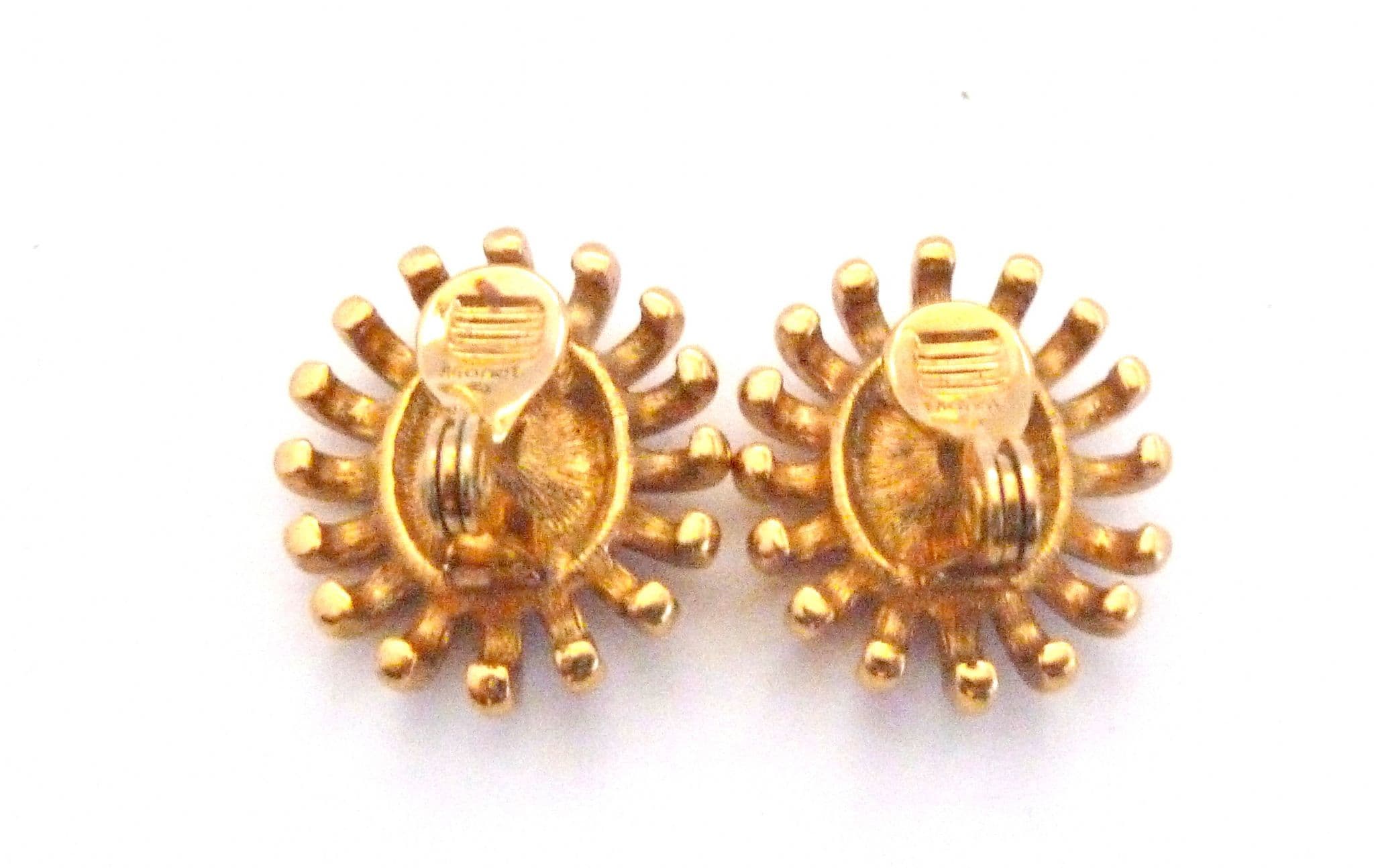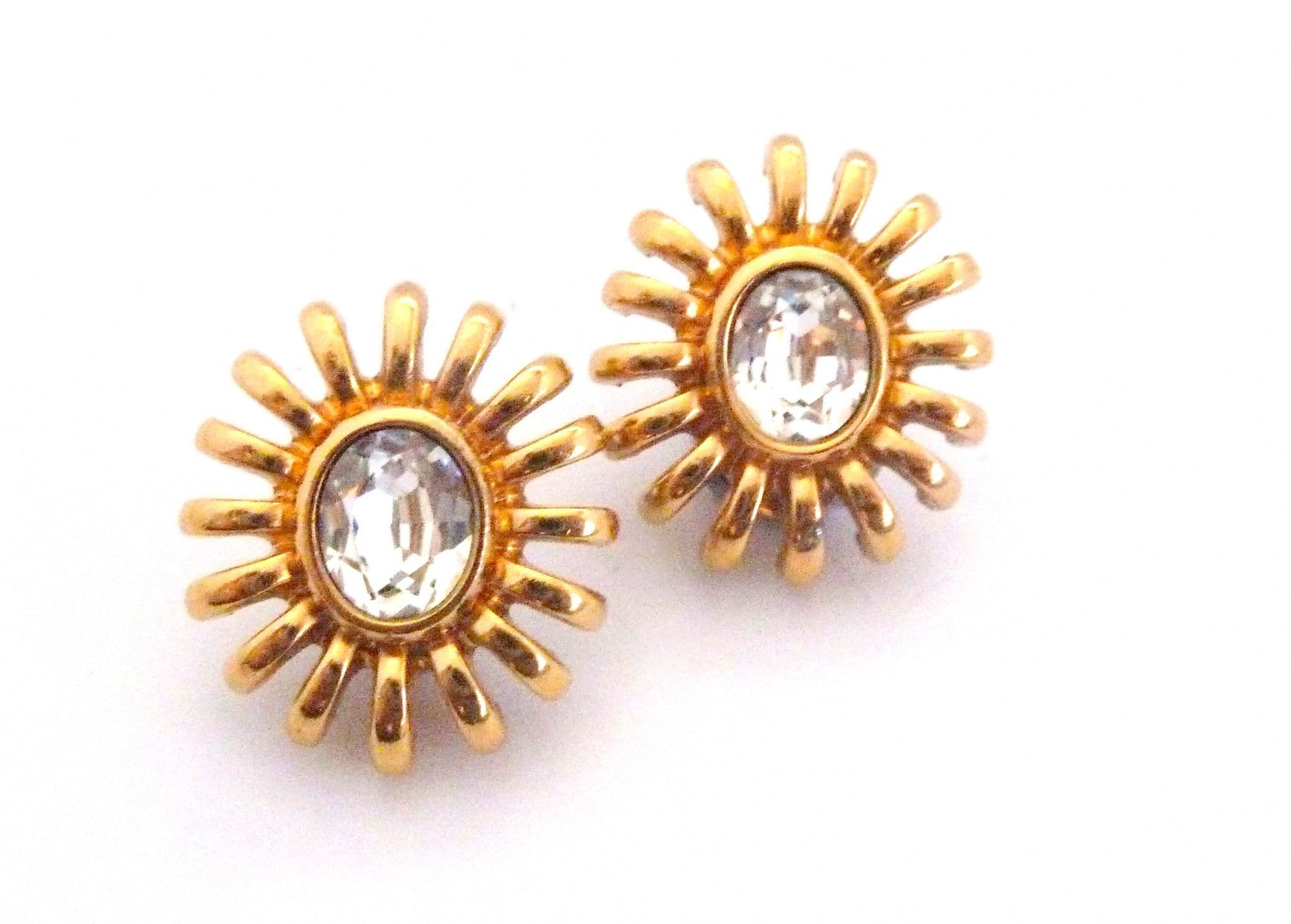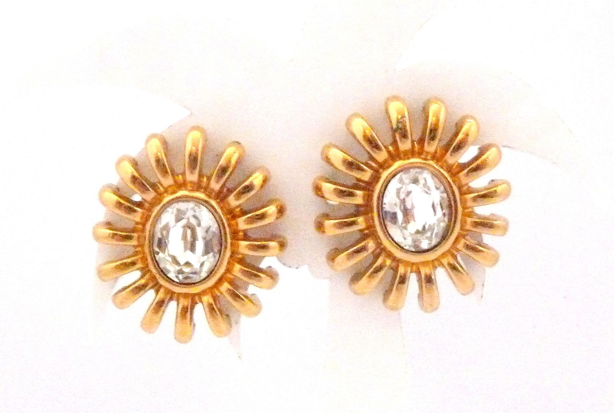 A pair of Monet star burst style rhinestone detailed clip on earrings. Formed from gold tone metal set with clear rhinestones to the centers. The backs are marked Monet. Circa 1990's - early 2000's