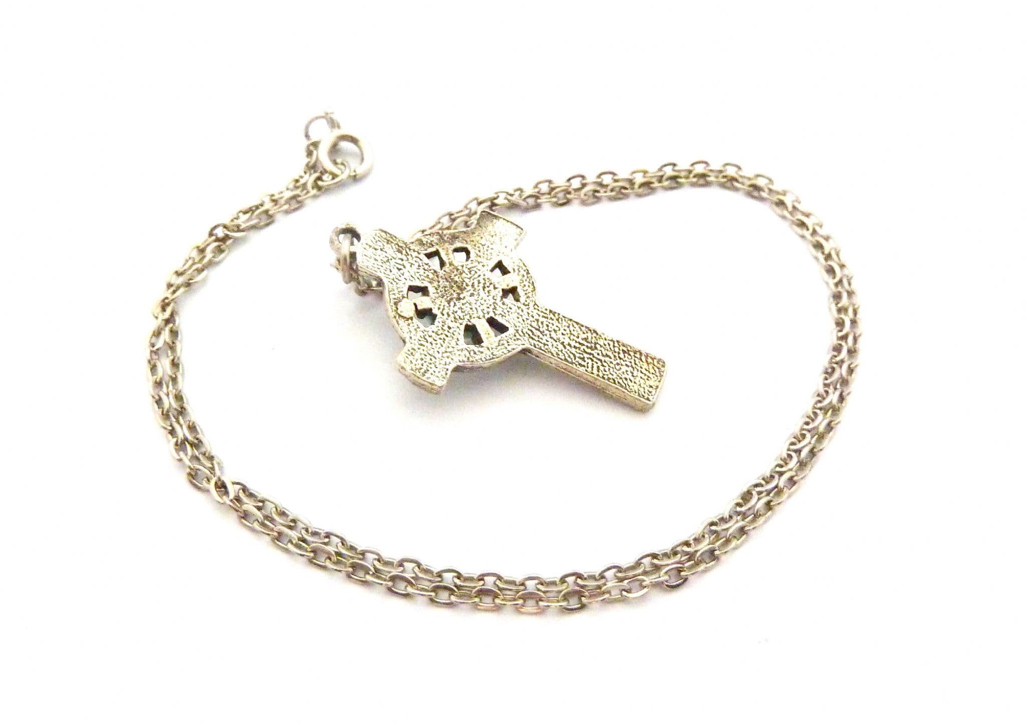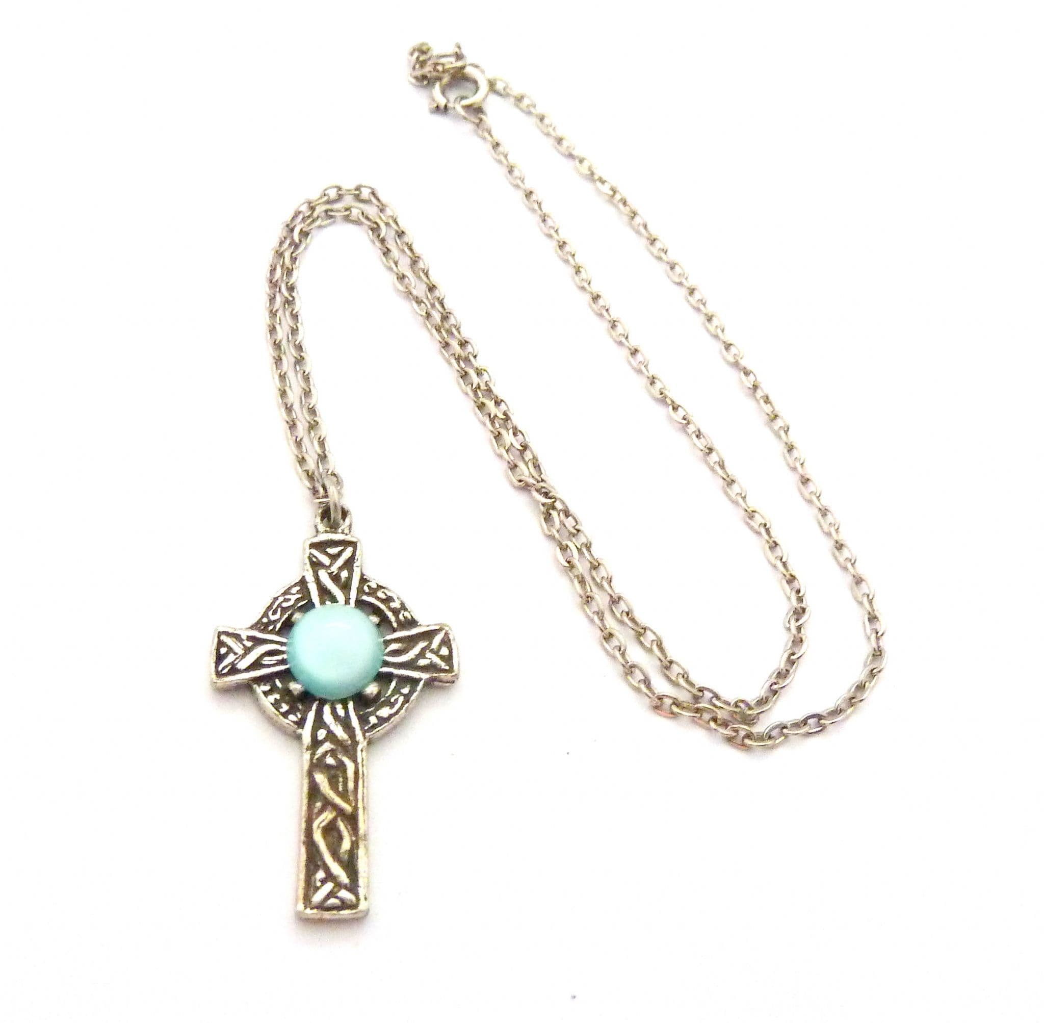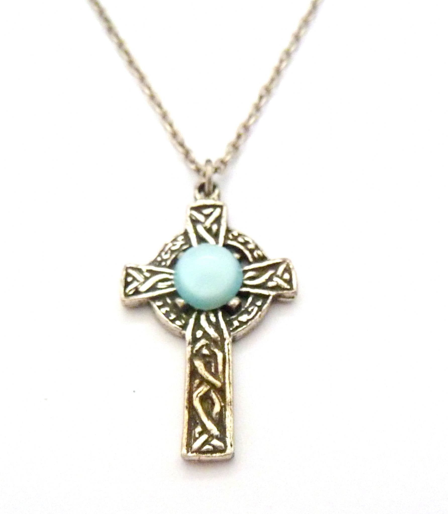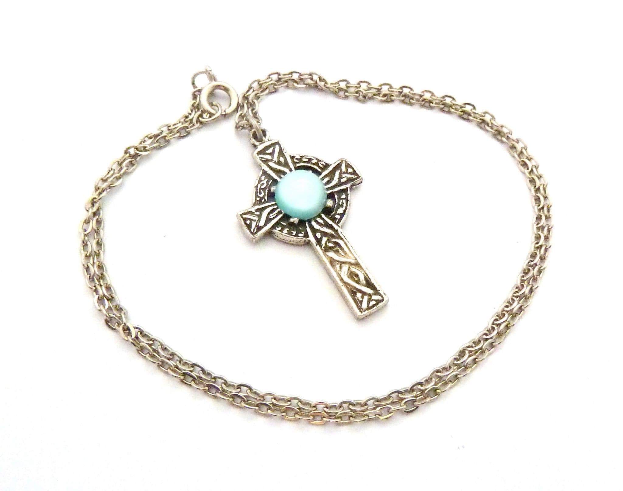 Small Celtic cross style pendant set with a blue glass moonglow style cabochon on a silver tone necklace chain. The small cross is formed from silver tone metal and is set with a blue glass cabochon, Set on a short length chain with a spring ring fastener. Circa late 1990's- to early 2000's.