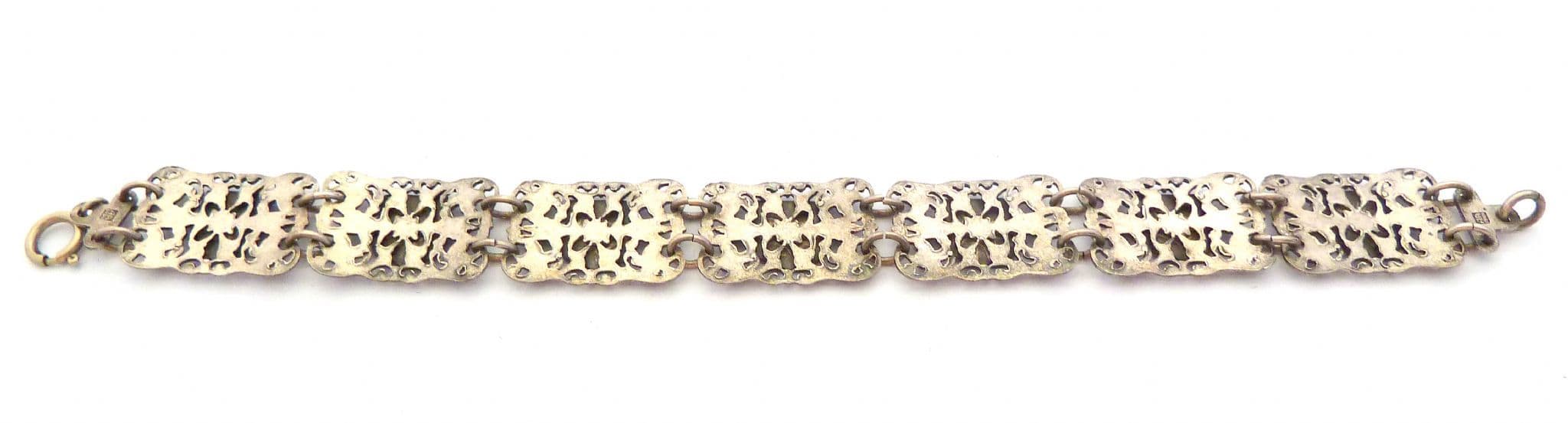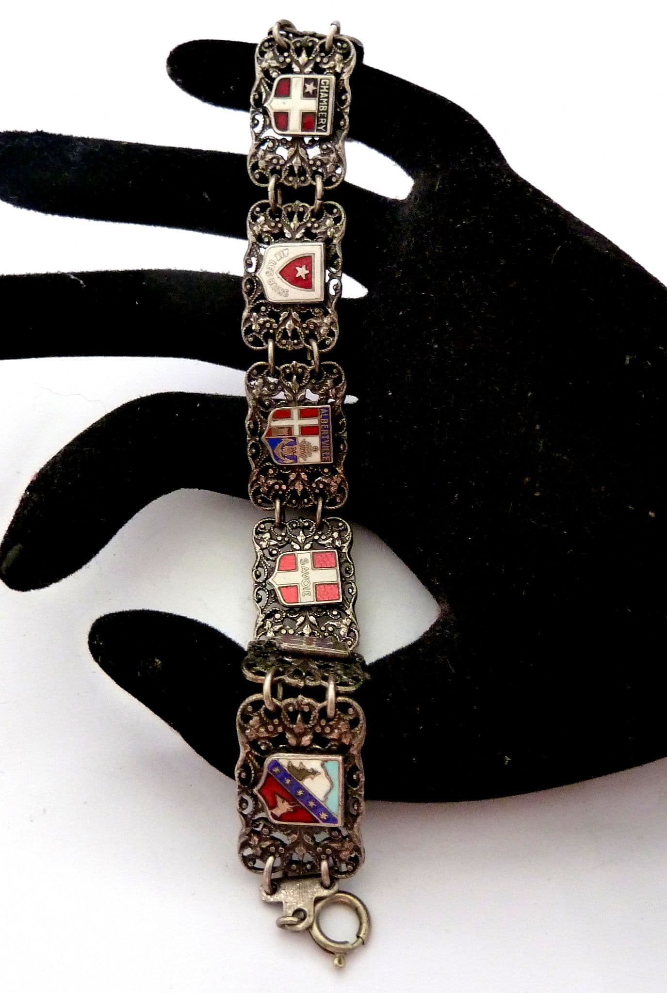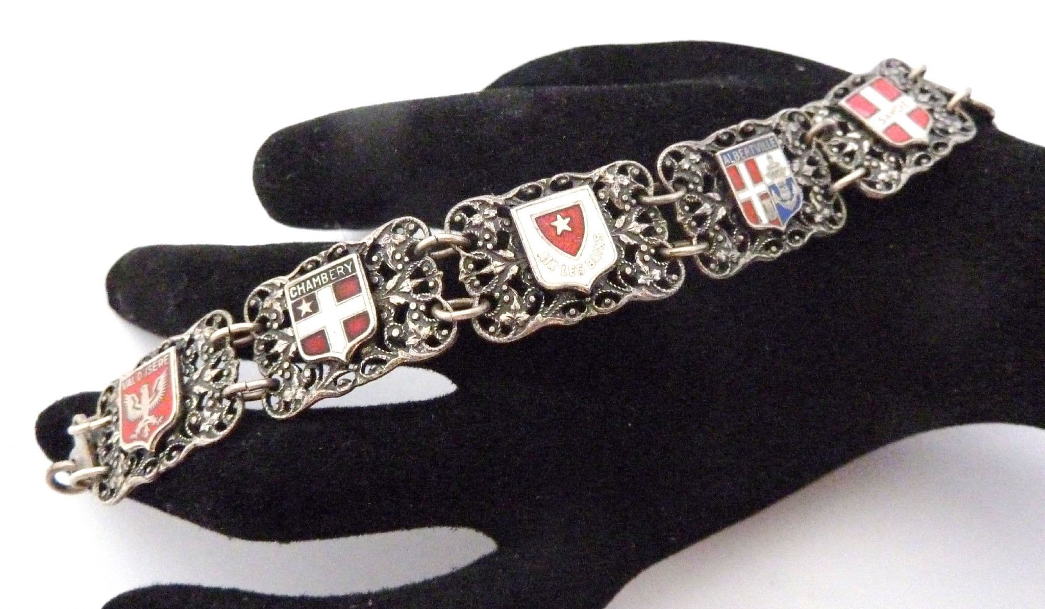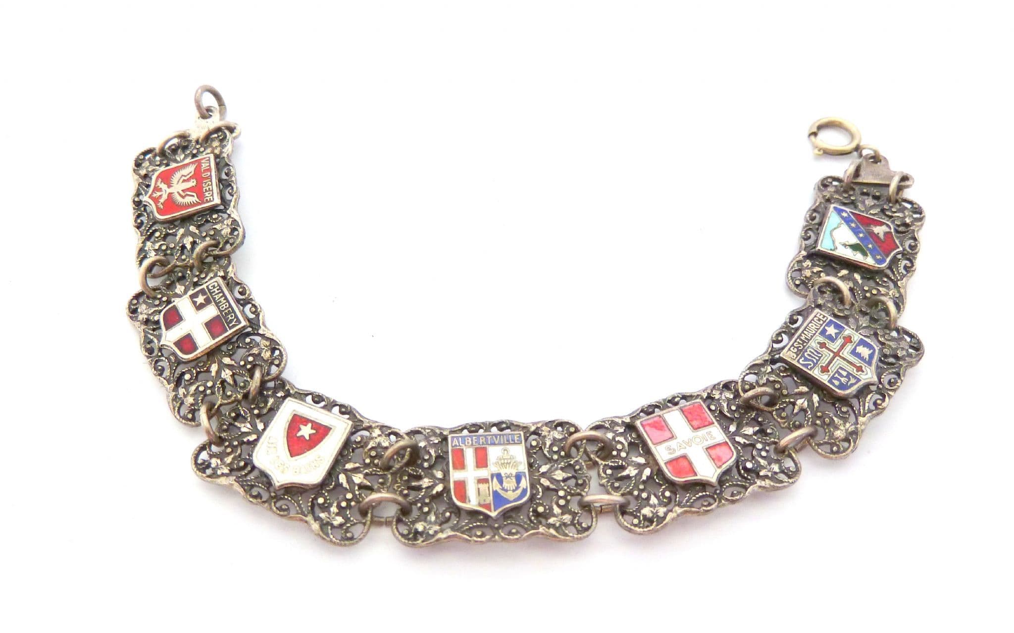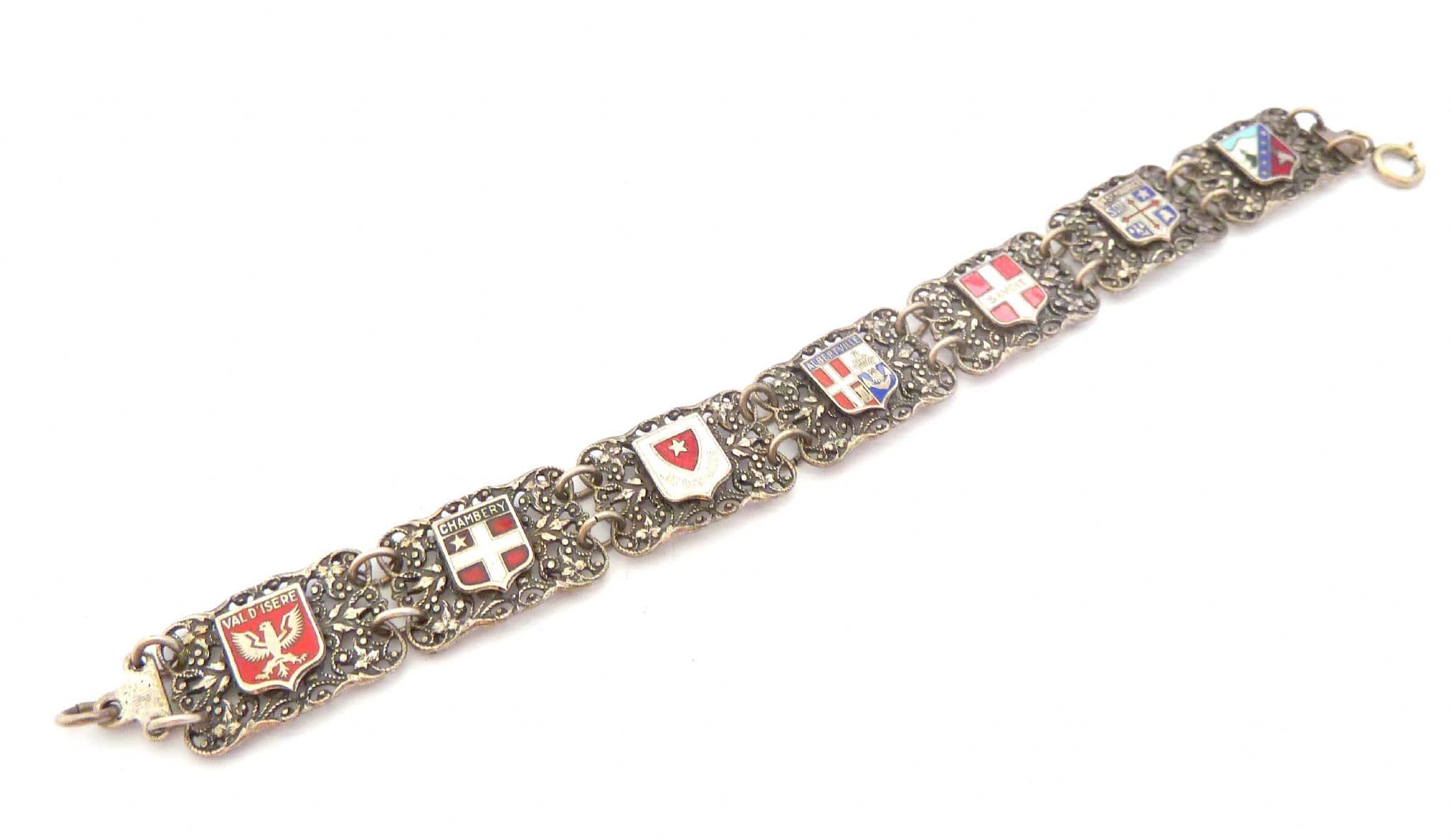 Vintage AA Lyon French souvenir panel bracelet. The bracelet is formed from silver plated metal in a panel design. The panels feature French town flags including Savoi, Albertville and Chamberry. The bracelet measures approx 19.5cm. It has a push box fastener. Circa 1950's - 60's.