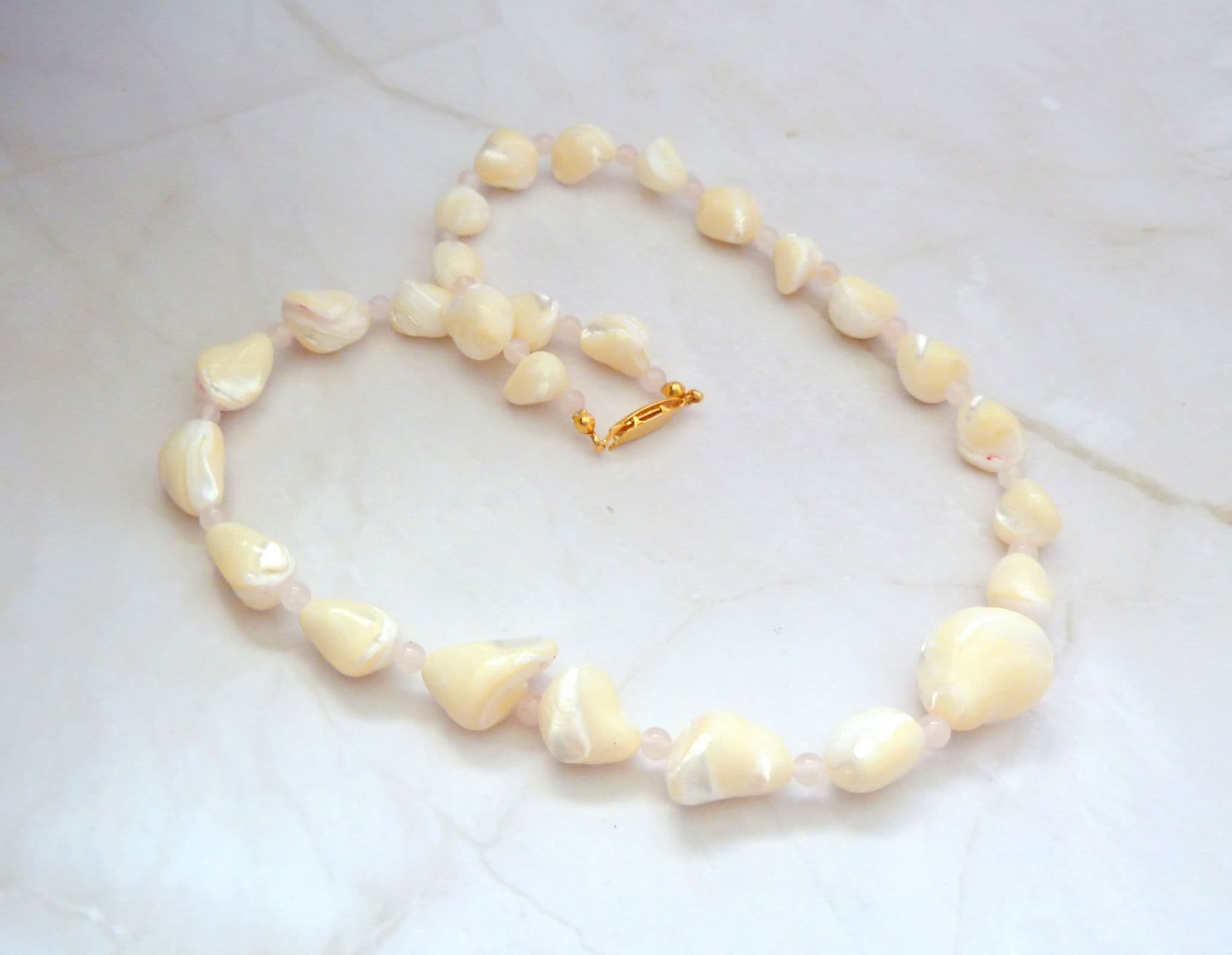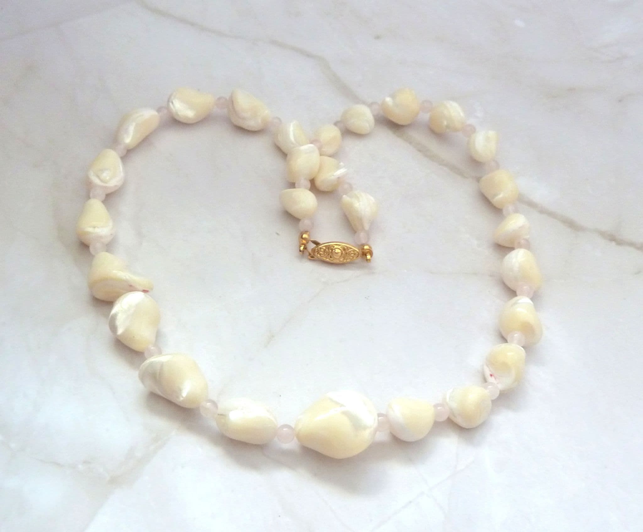 Vintage mother of pearl shell and rose quartz beaded short length necklace. The necklace is formed from abstractly shaped mother of pearl shell beads with smaller rose quartz beads between each larger mother of pearl bead, fastens with a hook and box clasp closure.