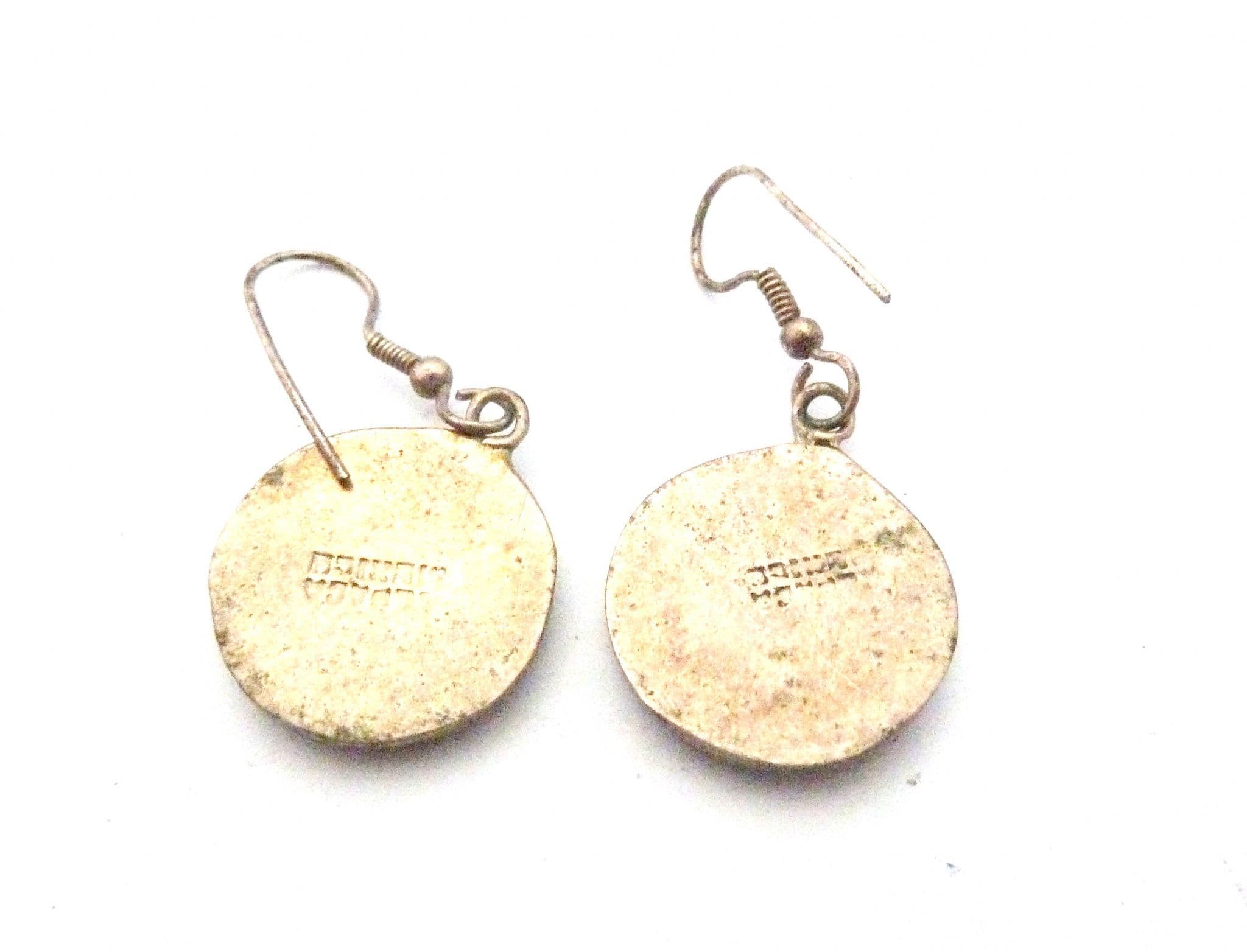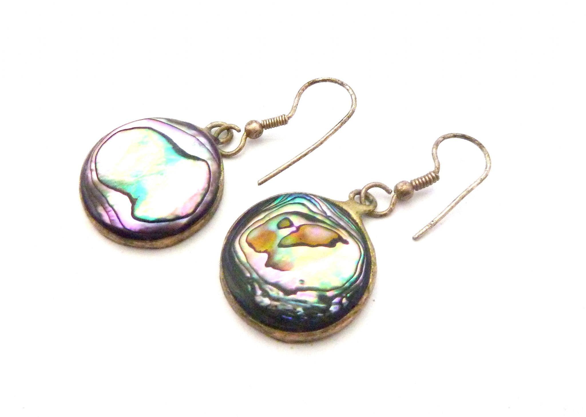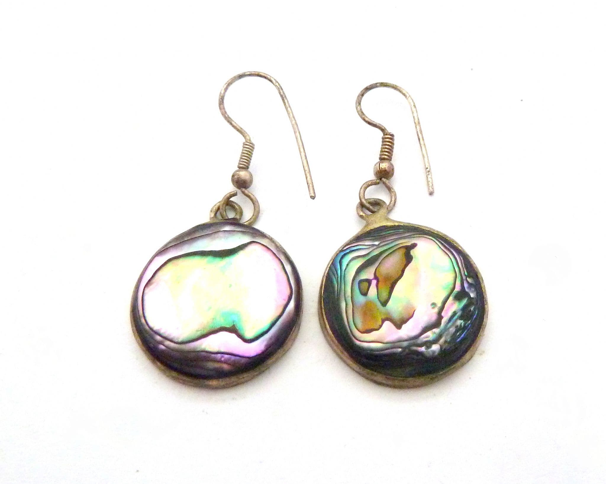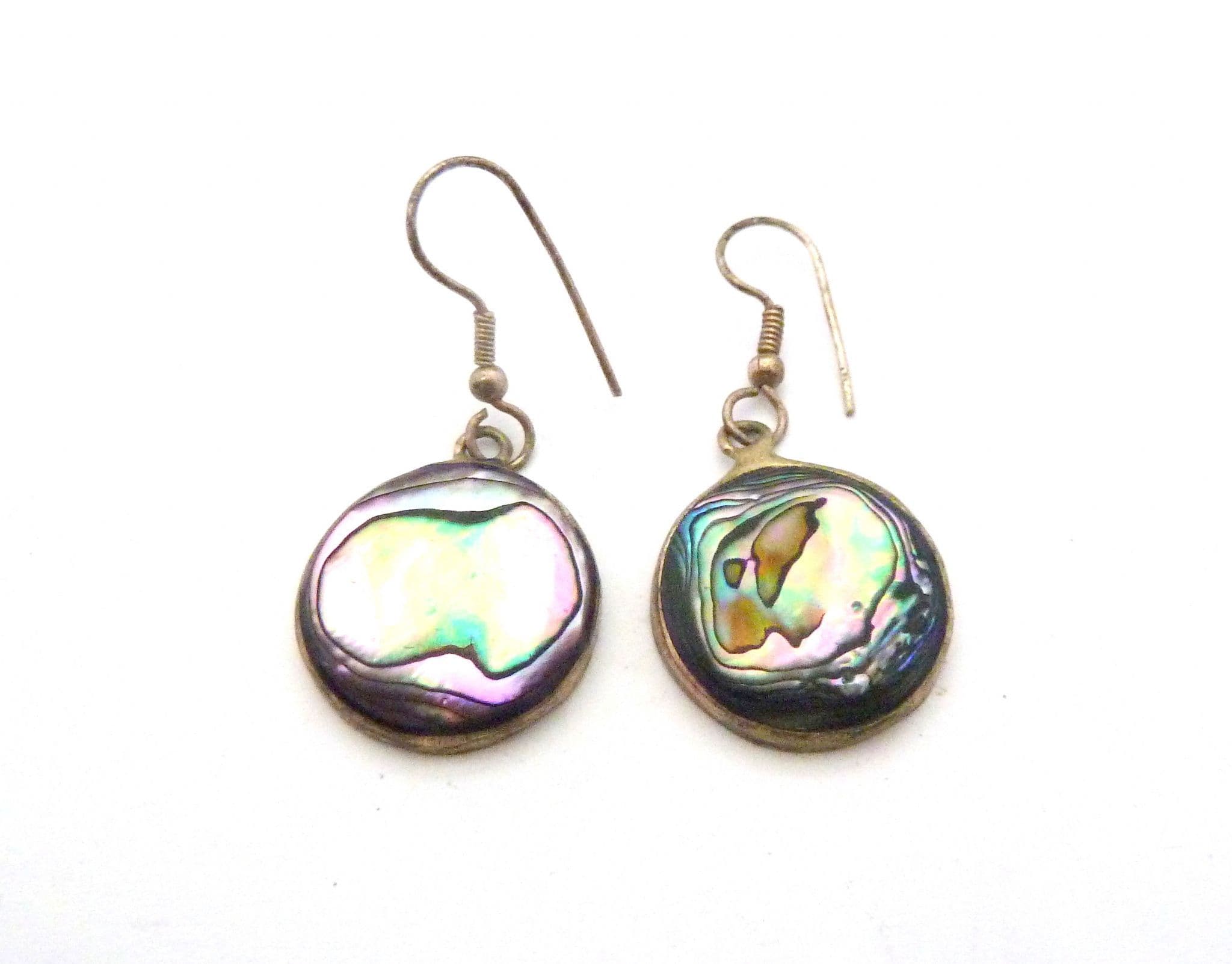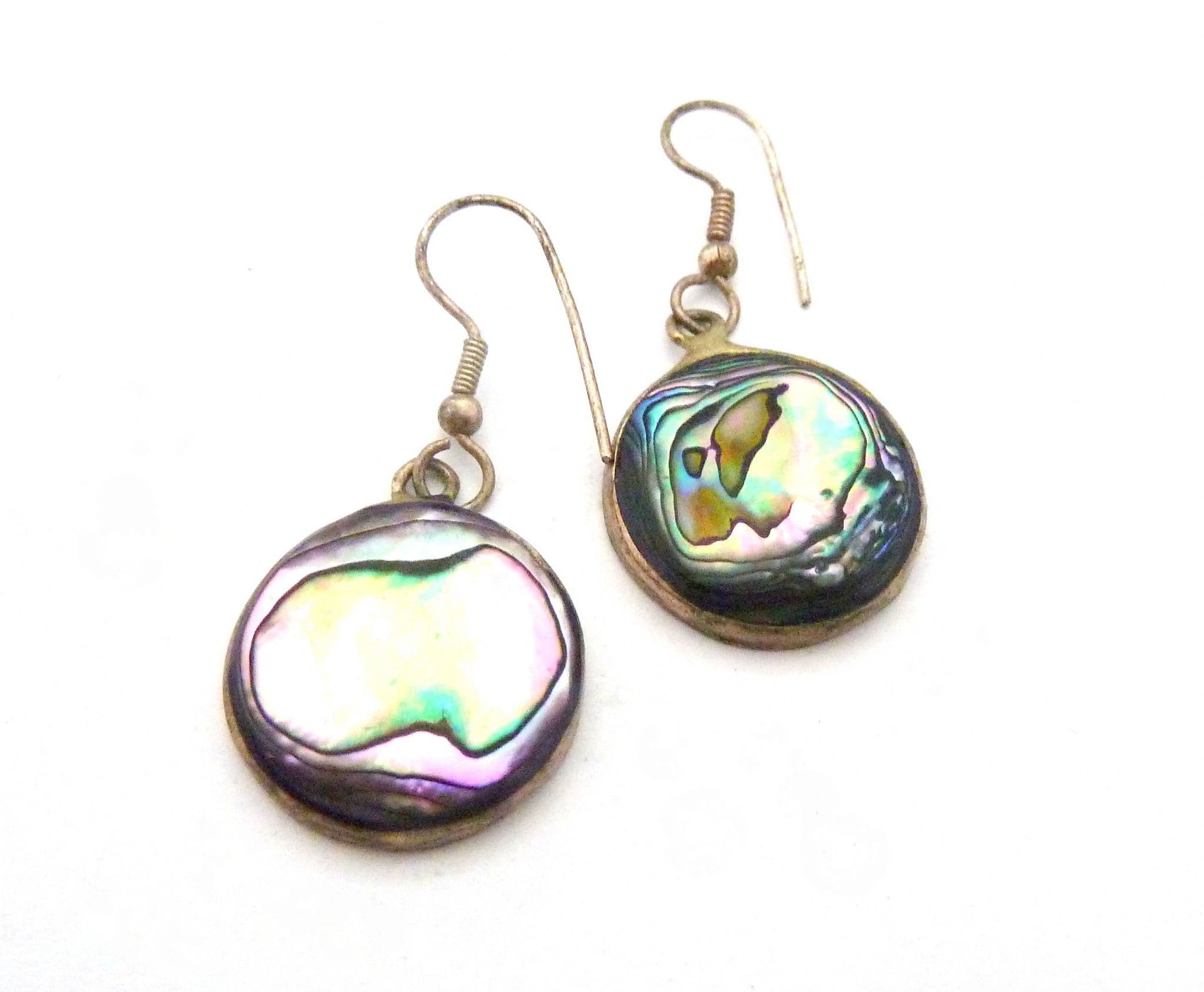 Vintage small Alpaca silver and abalone shell circular disc design drop earrings. Formed from Alpaca silver with abalone shell inserts in an circular shaped drop design. Suitable for pierced ears with new silver plated fish hook backs.
