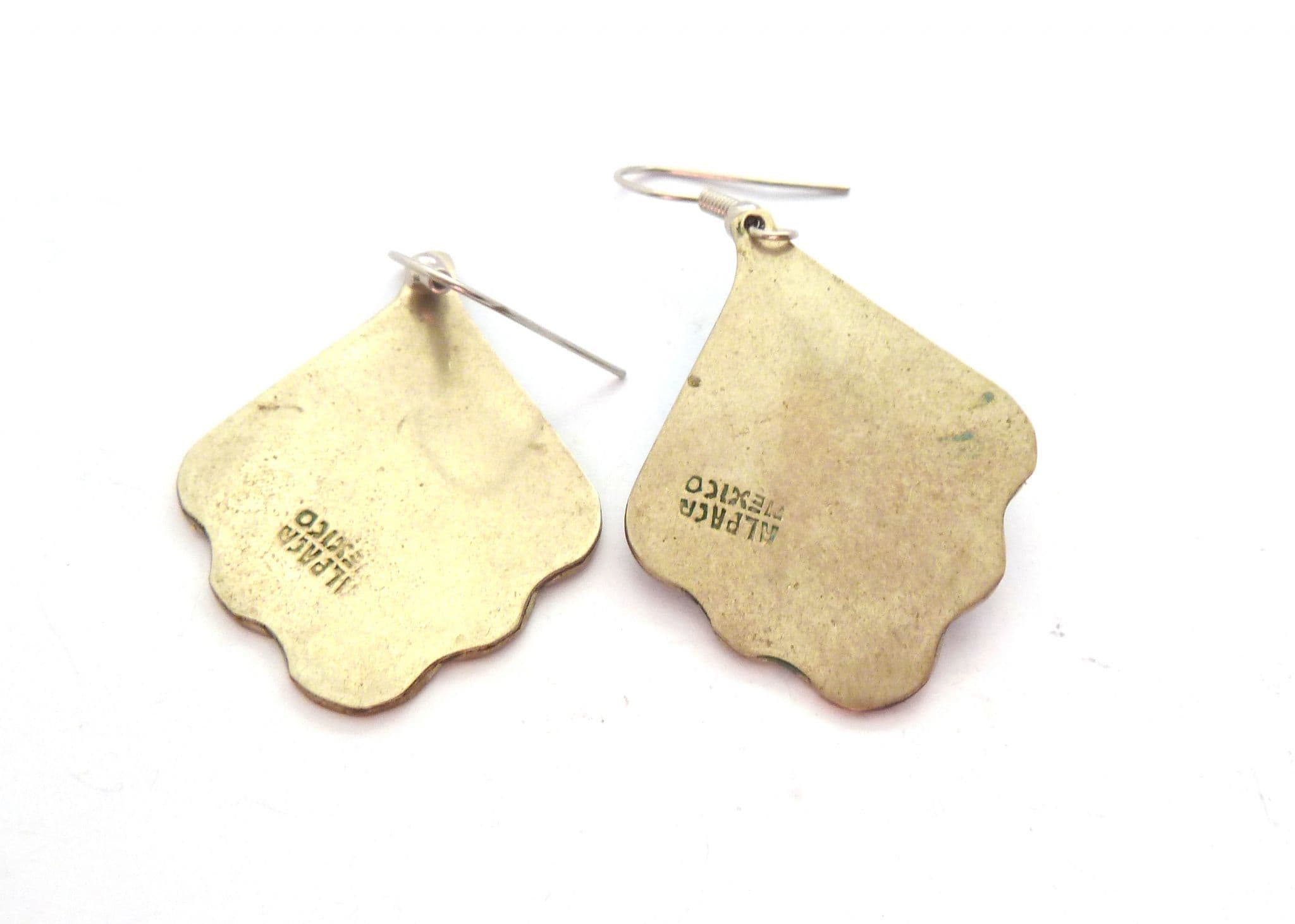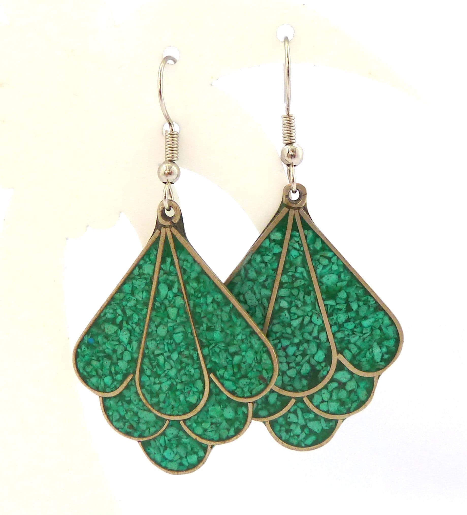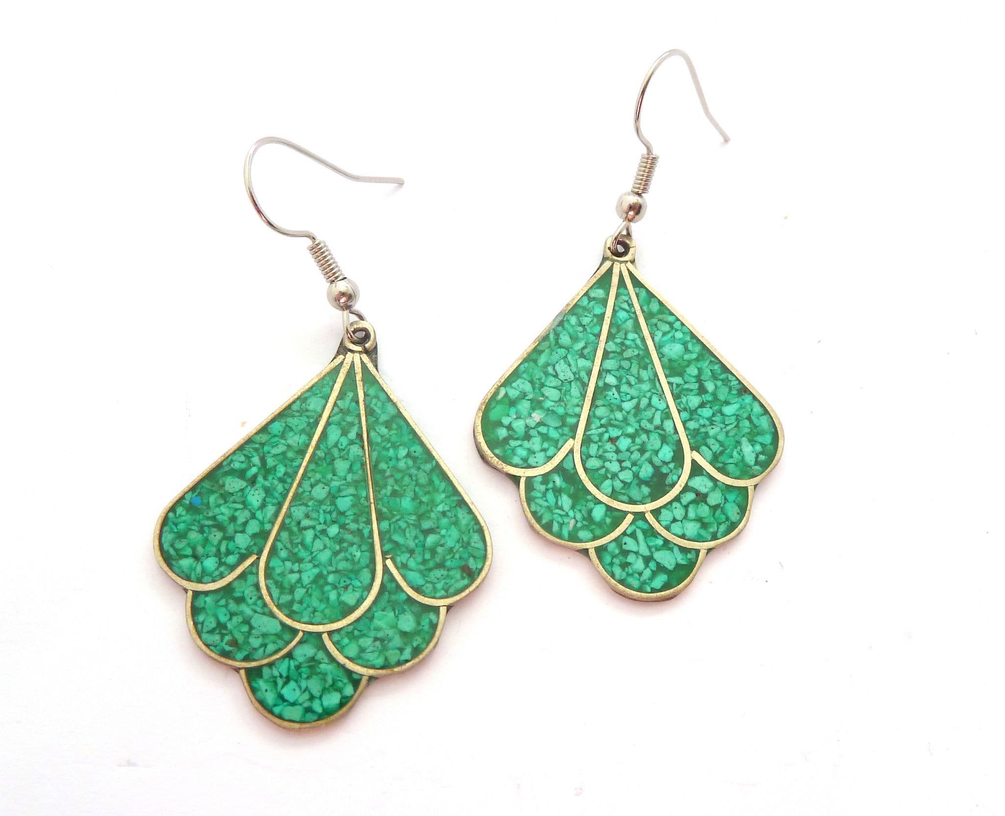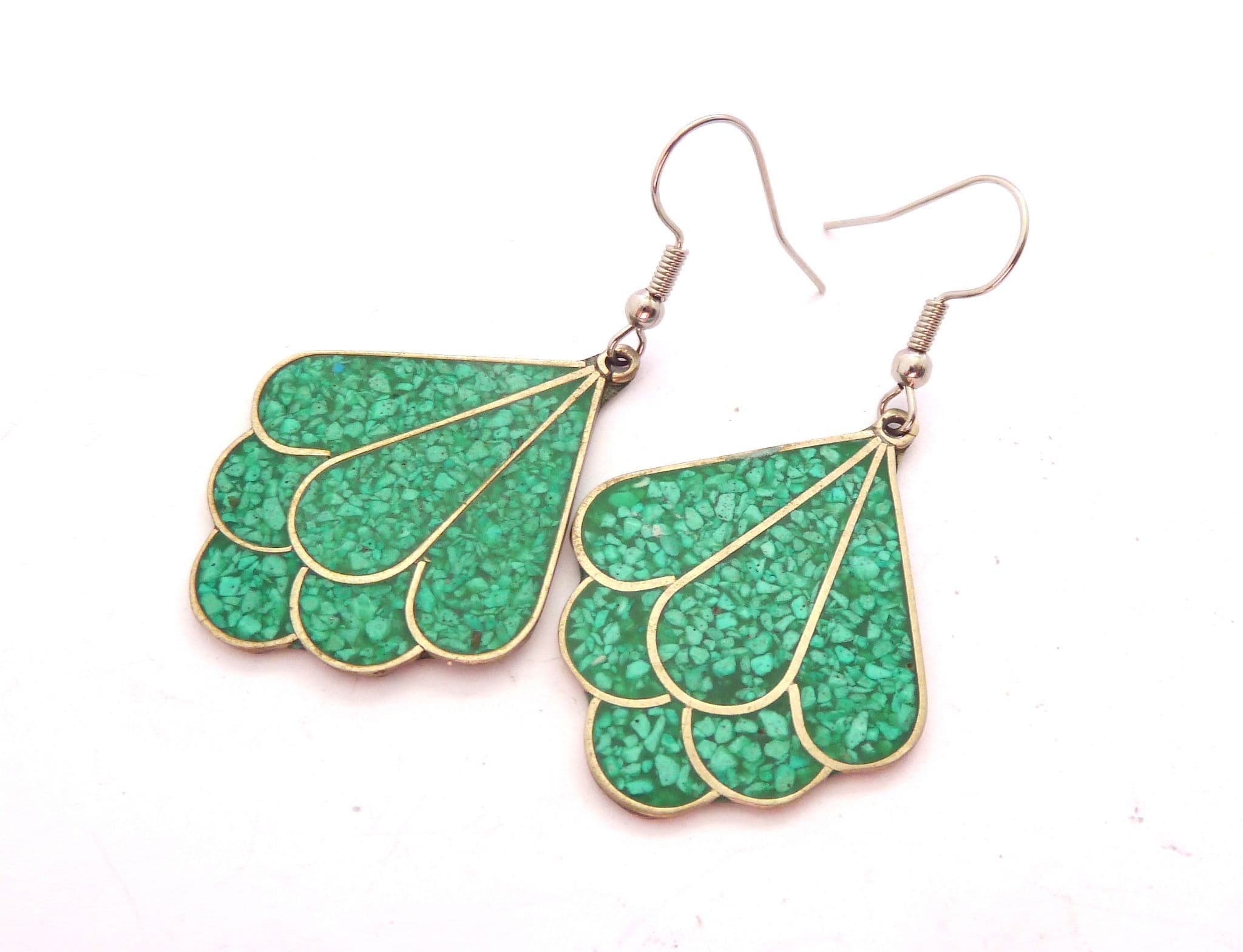 A vintage pair of crushed turquoise inlaid Alpaca silver abstract fan shaped drop design earrings. The earrings are formed from alpaca silver in an abstract fan shape with a crushed turquoise inlay. Circa 1980's - 90's