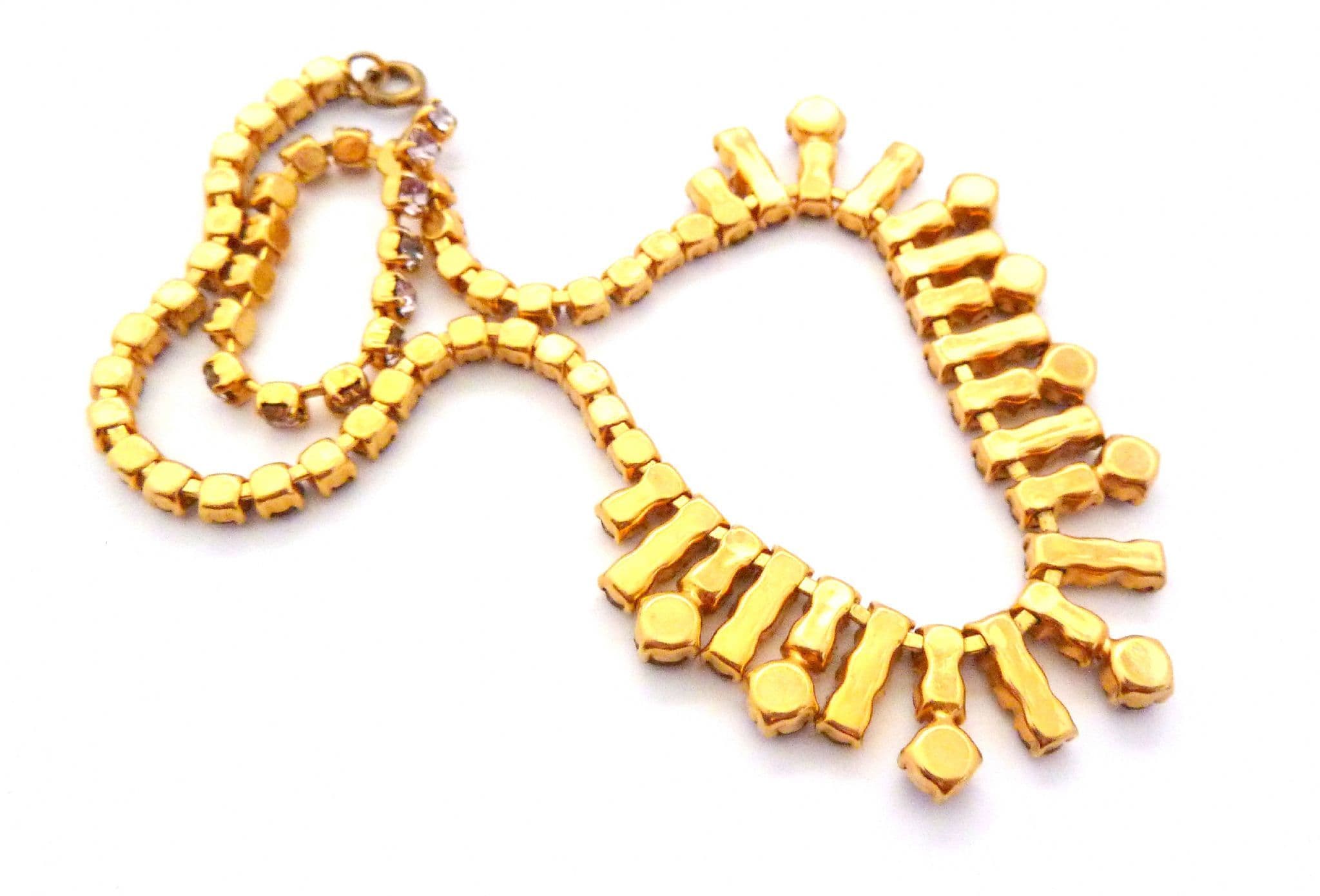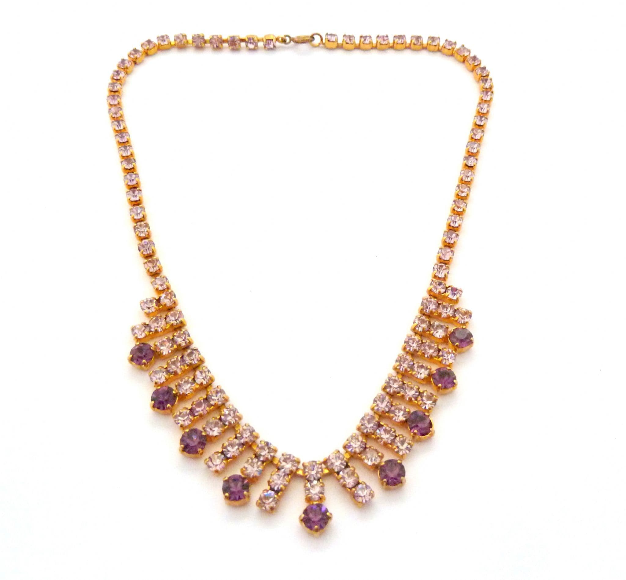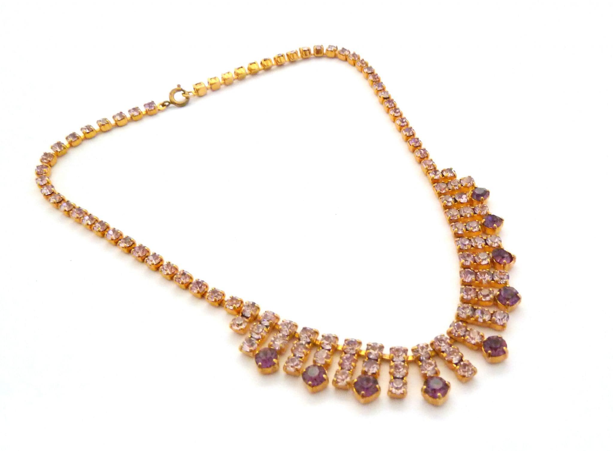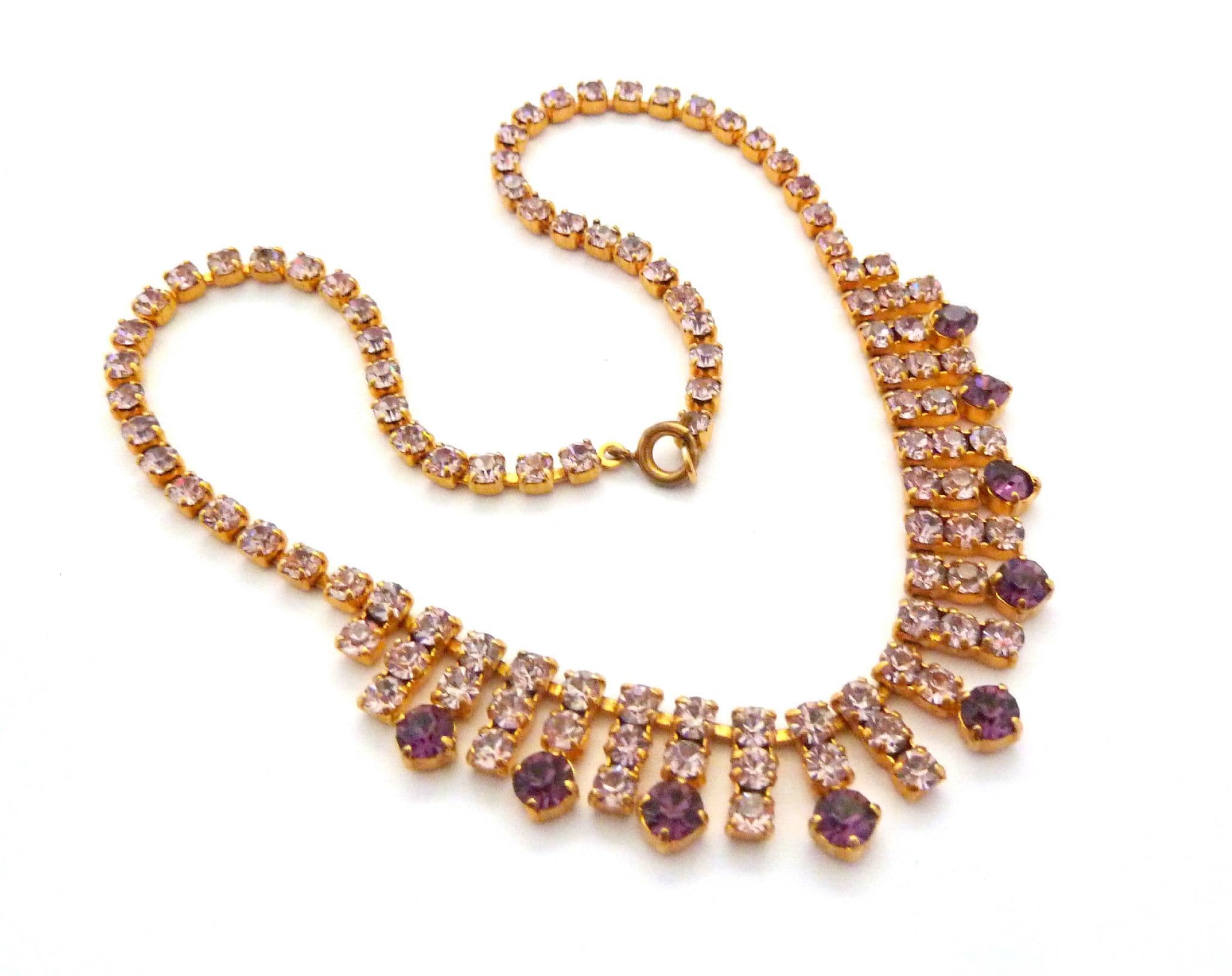 Lilac and Amethyst purple rhinestones adorn the complete length of this lovely necklace , featuring a short rhinestone fringe at the front 11cm. Necklace measures approx 39.5cms in length and is fastened with a spring ring clasp.