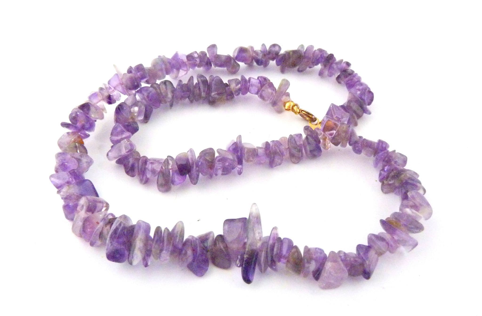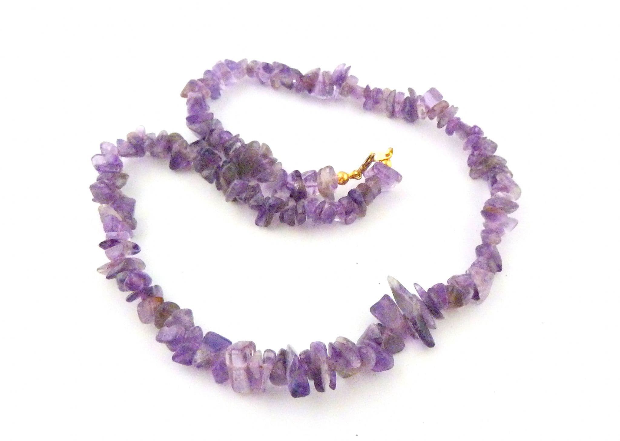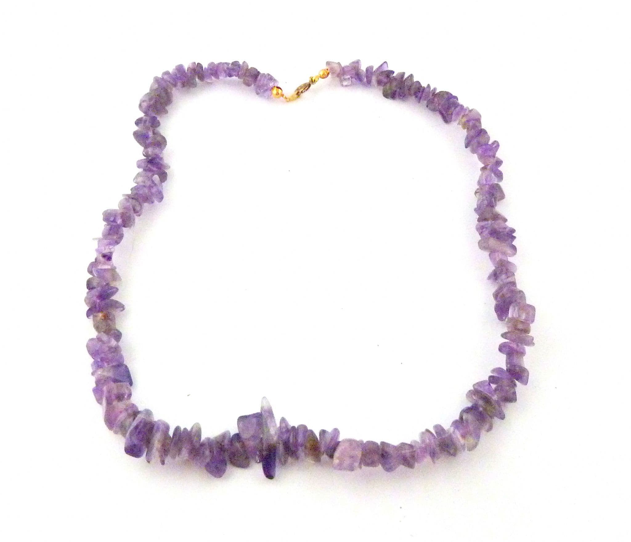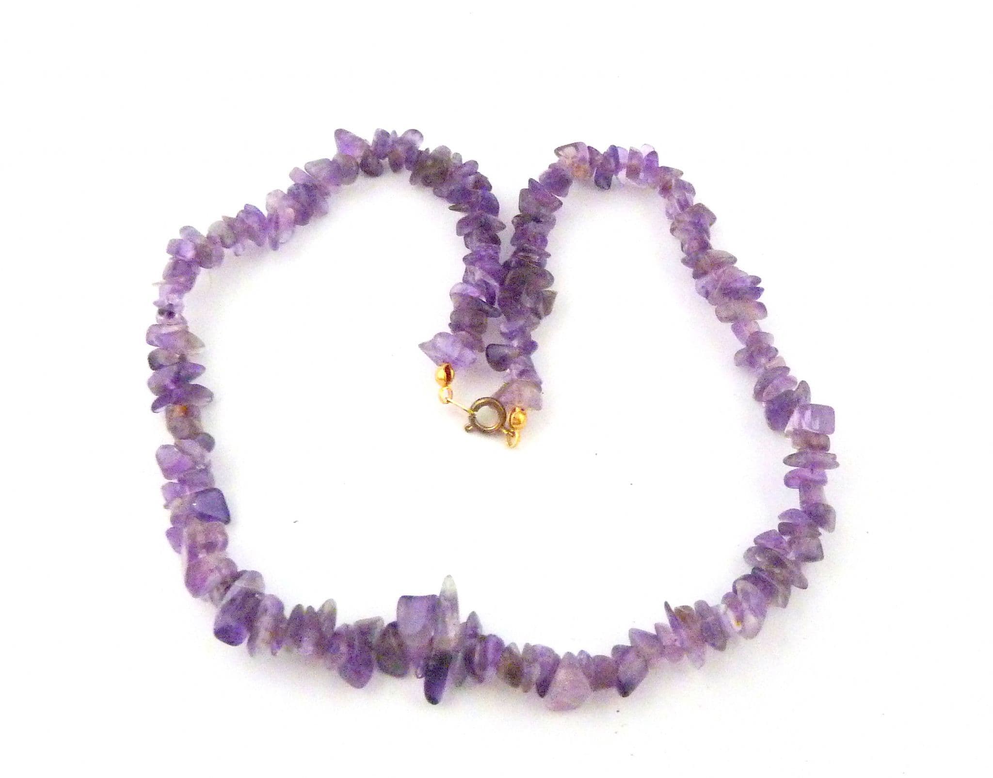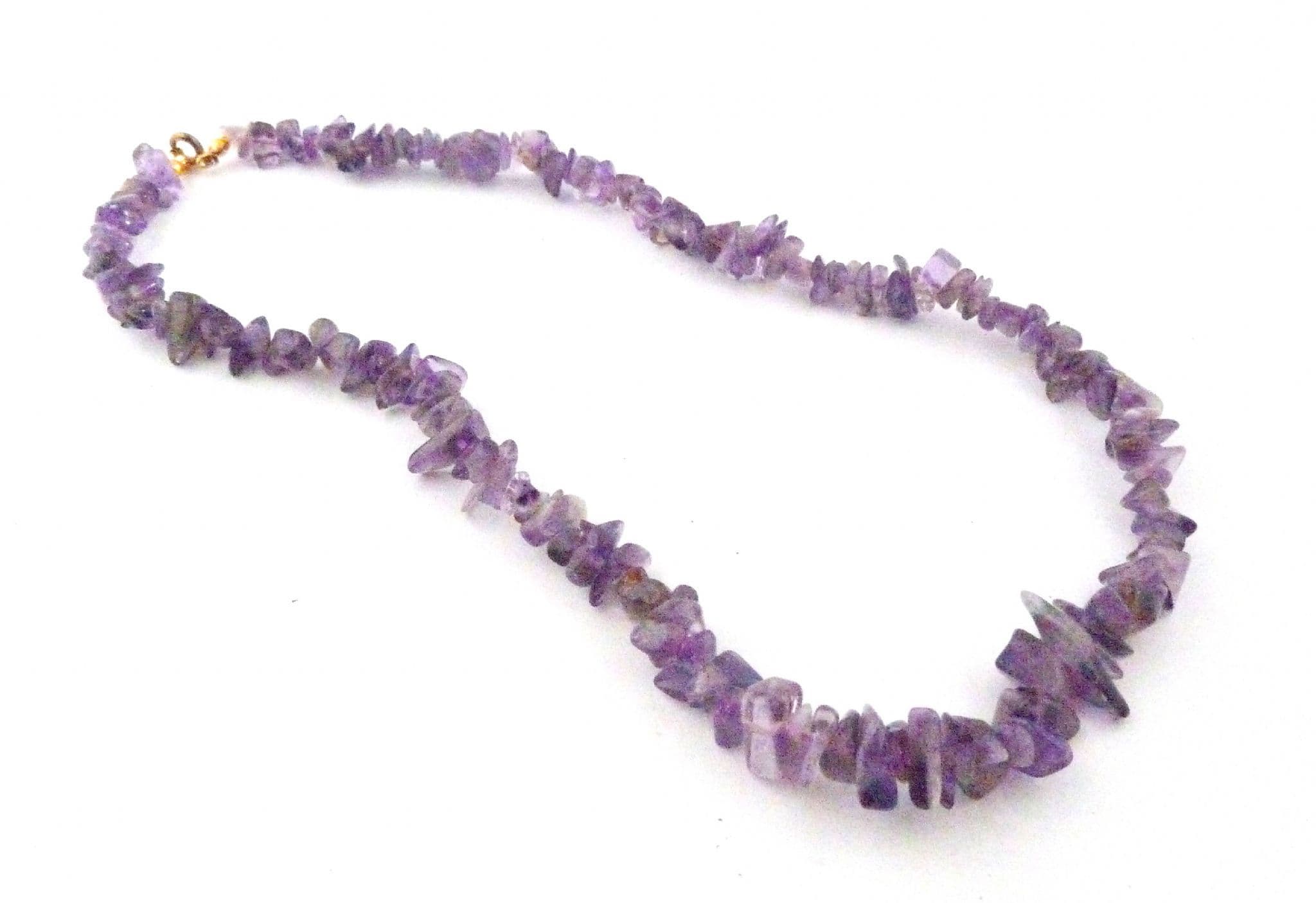 An amethyst gemstone chip necklace. The necklace is formed from amethyst gemstone chips, fastens with a spring ring clasp