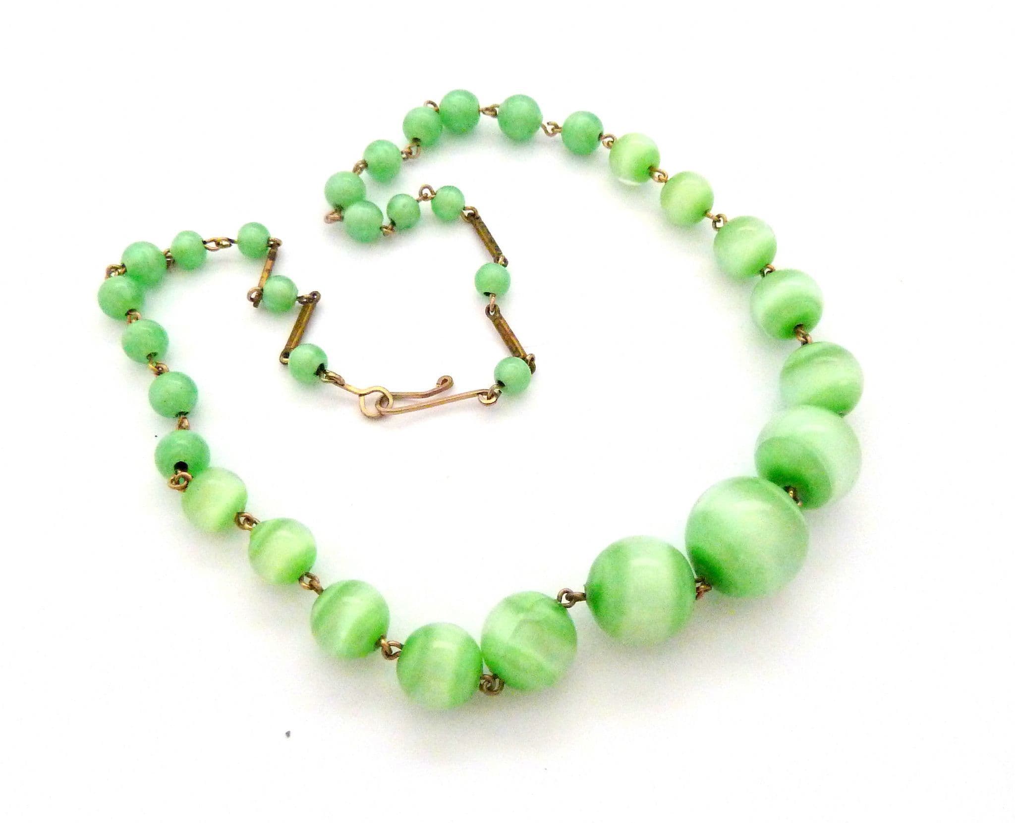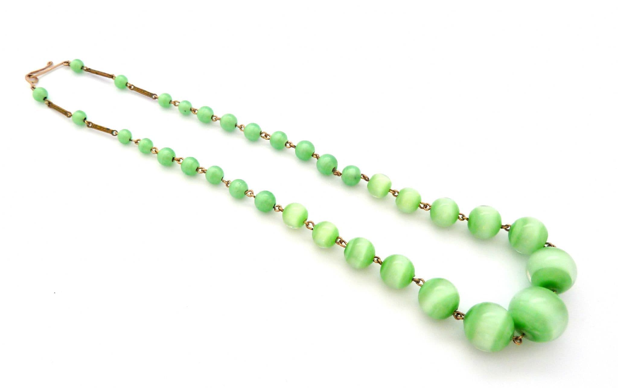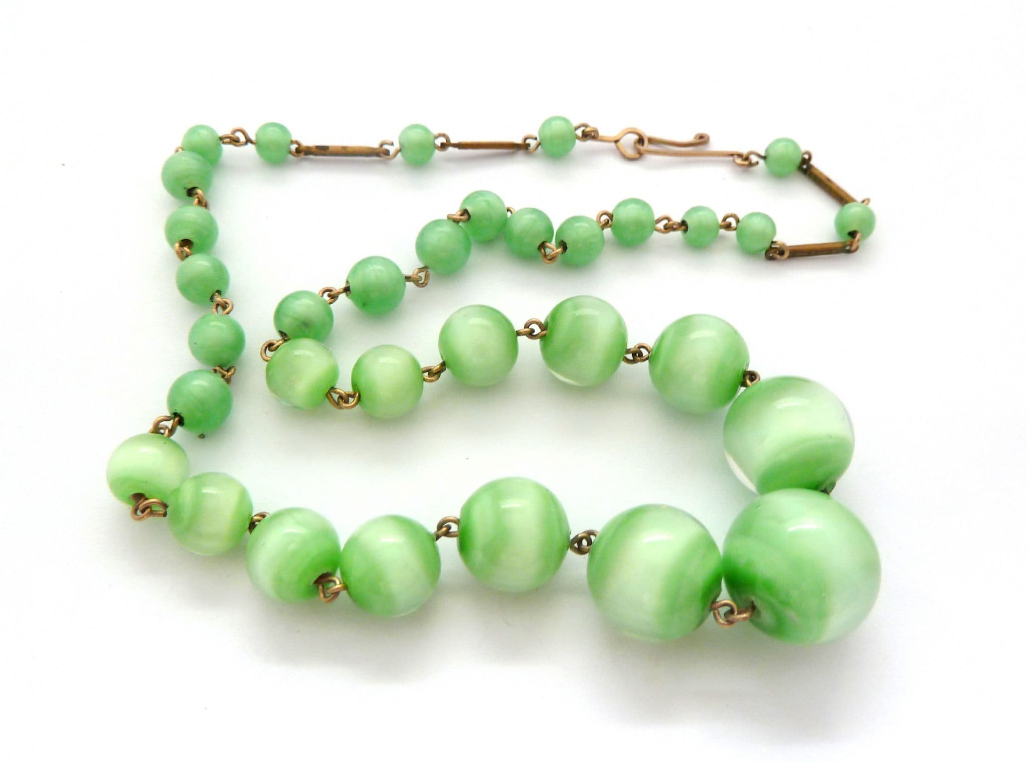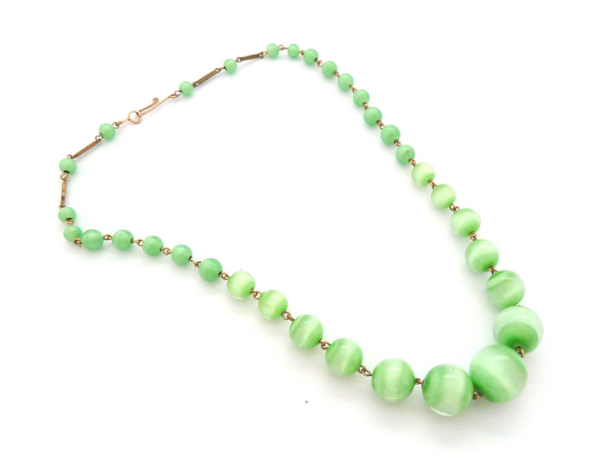 Vintage art deco era marbled green glass beaded choker necklace. The necklace is set with graduating in size circular shaped marbled green glass beads, hook clasp fastening. Circa 1930's - 40's.