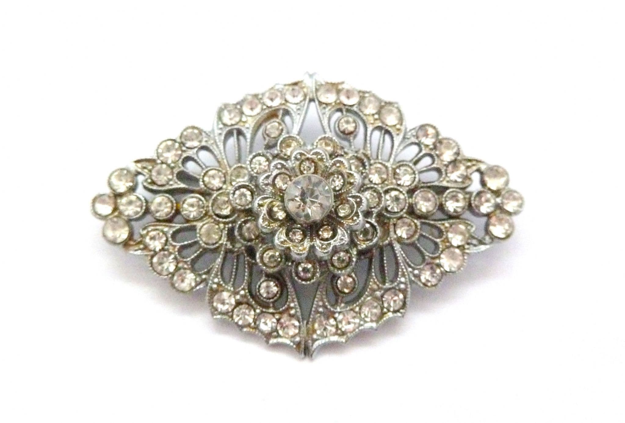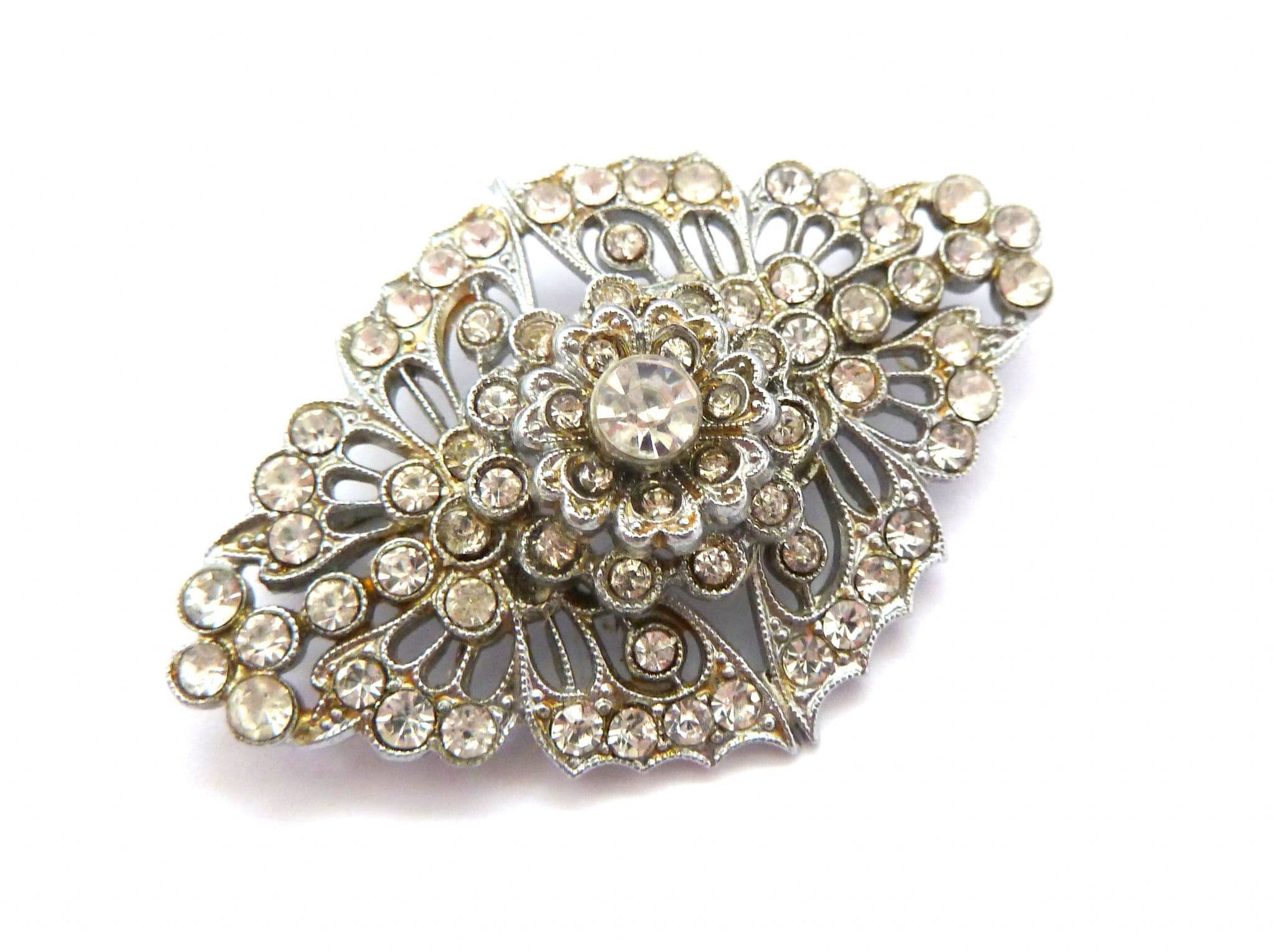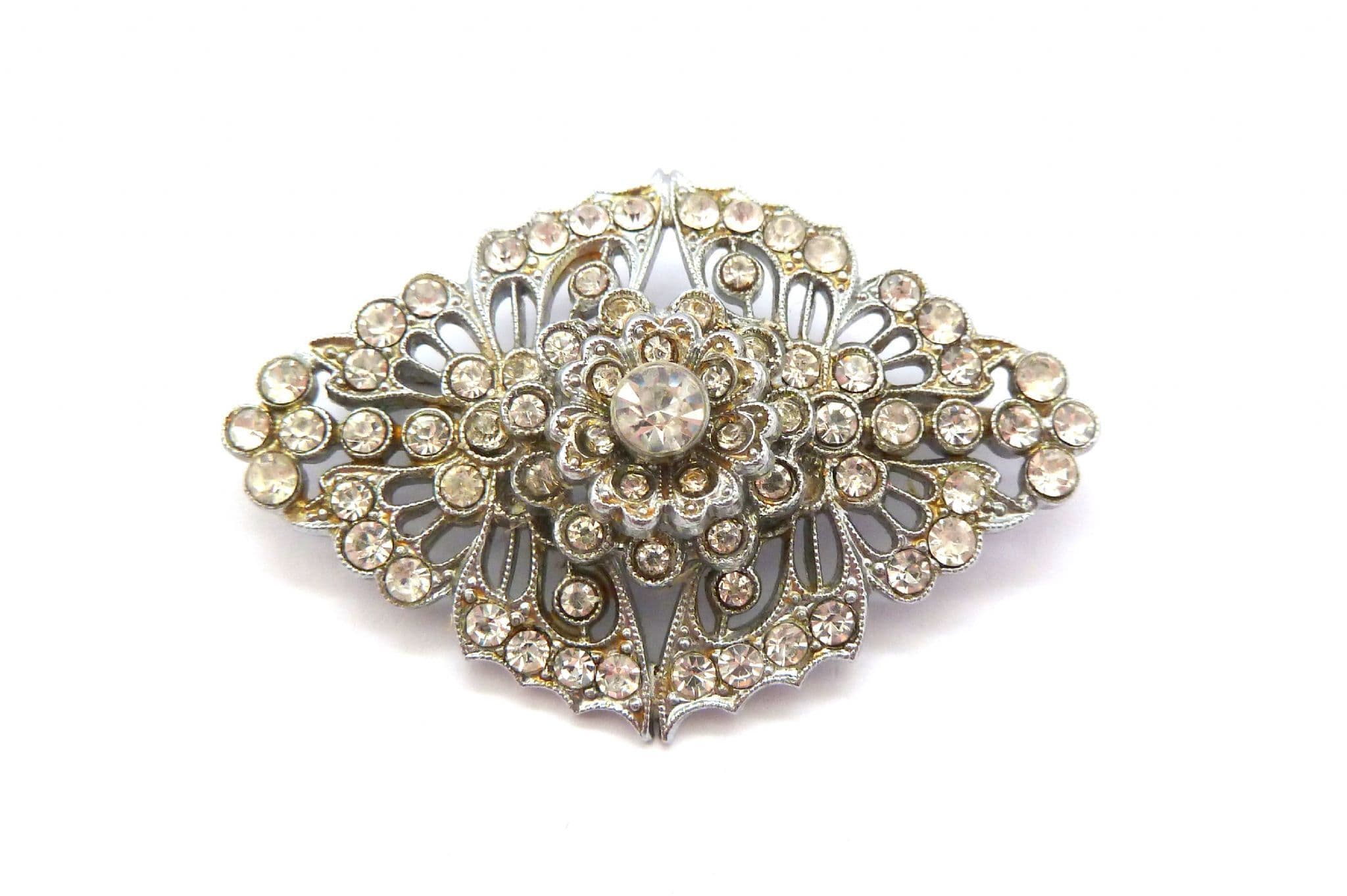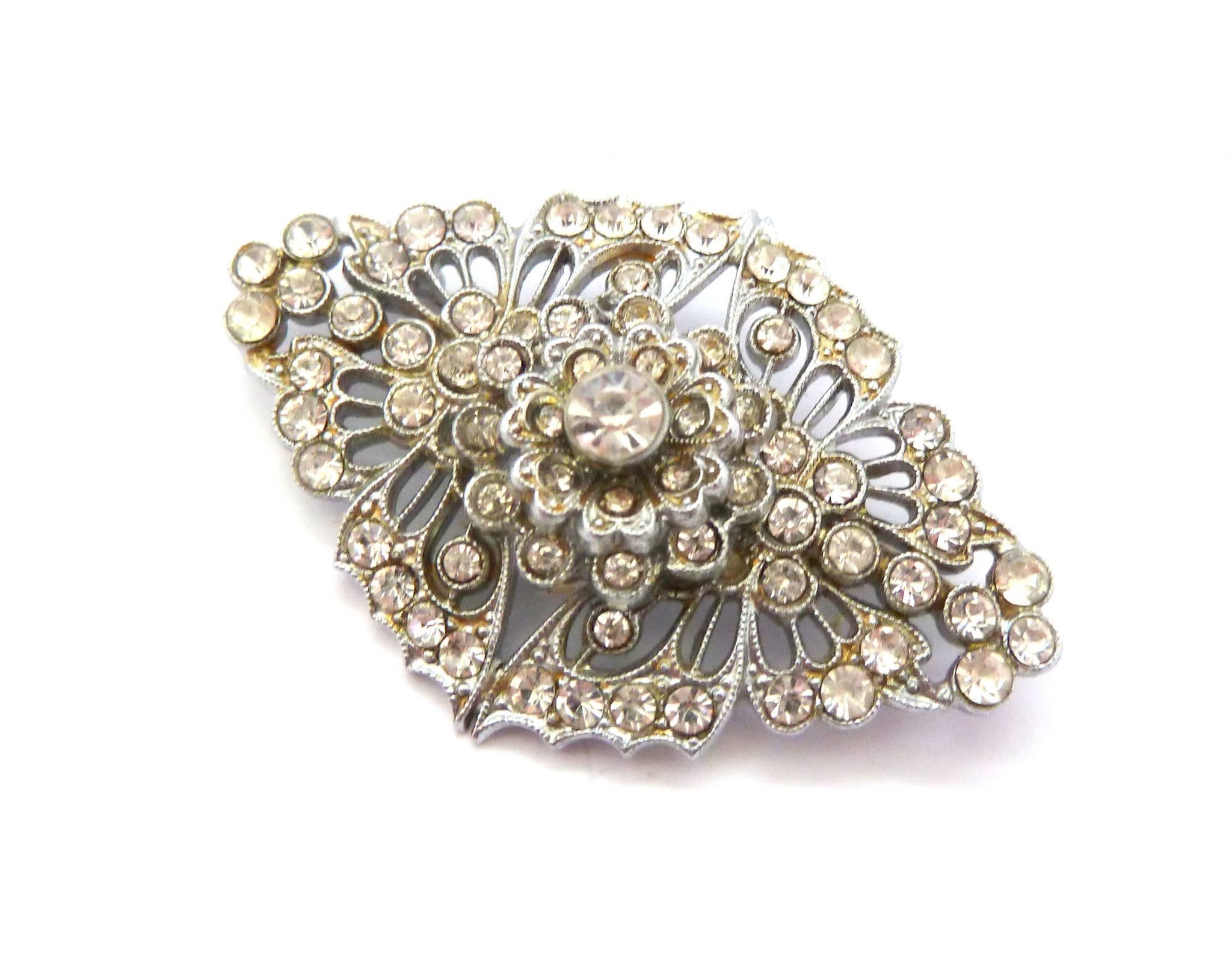A vintage art deco ear rhinestone set abstract geometric design brooch. Formed from silver tone metal set with clear rhinestones in a classic geometric art deco design. Circa 1930's - early 40's