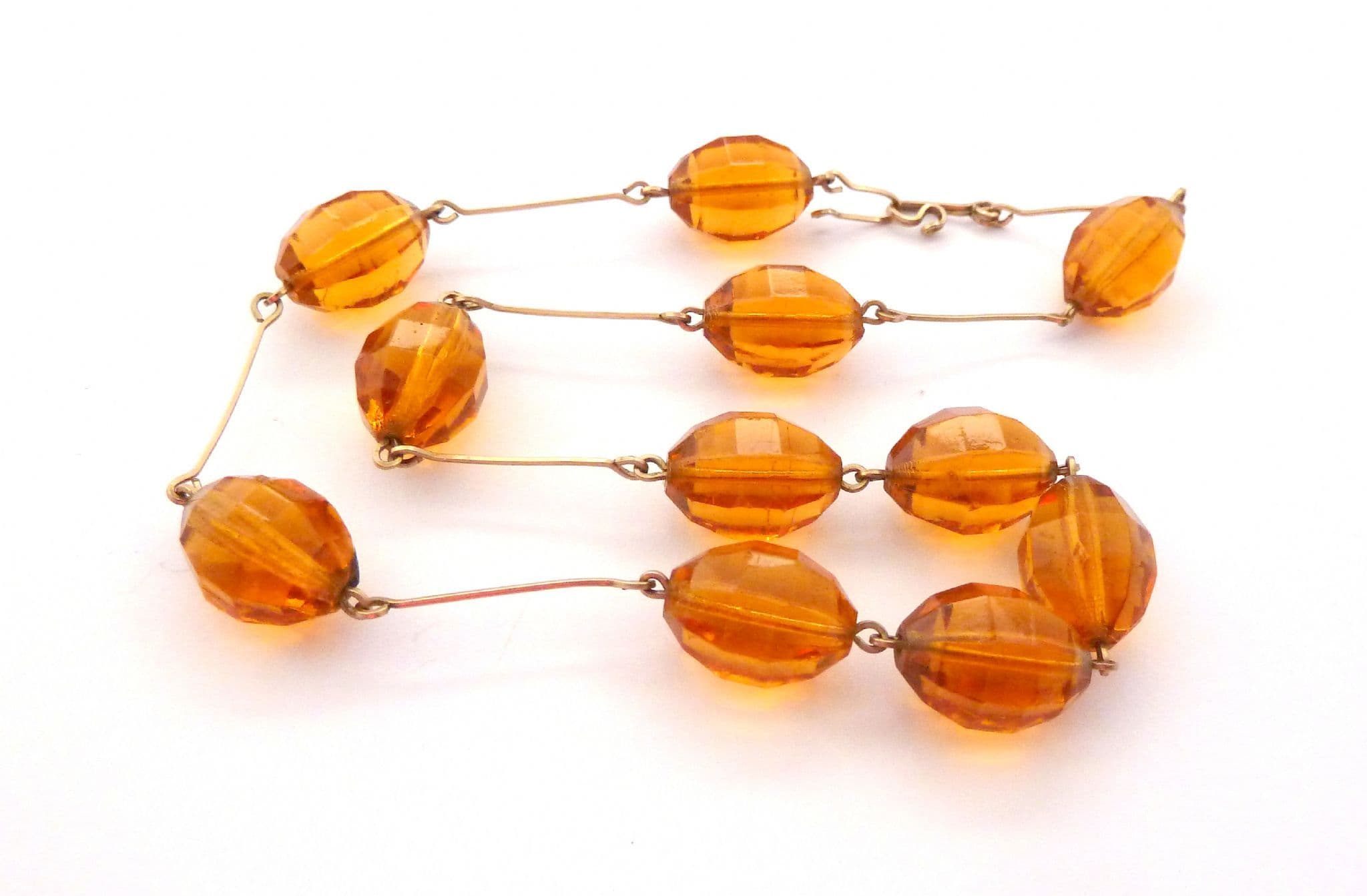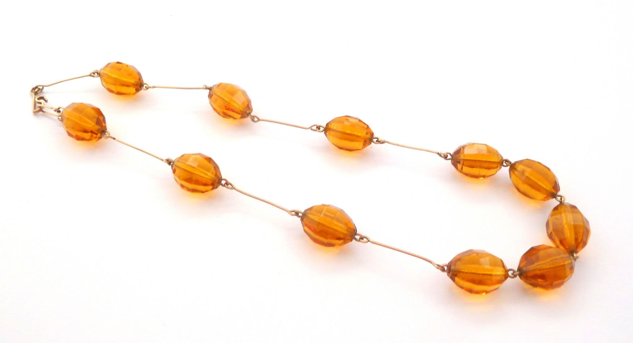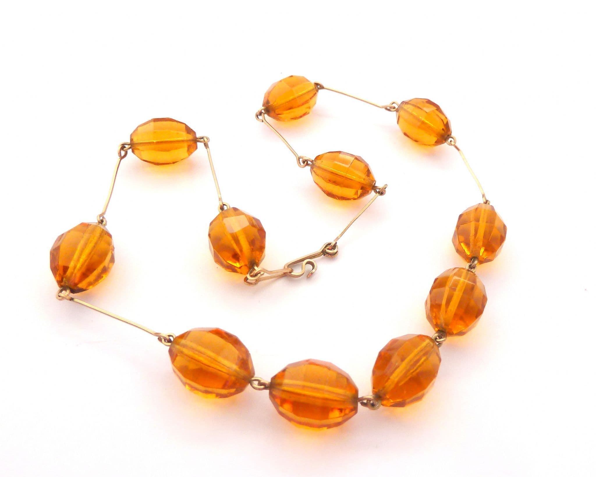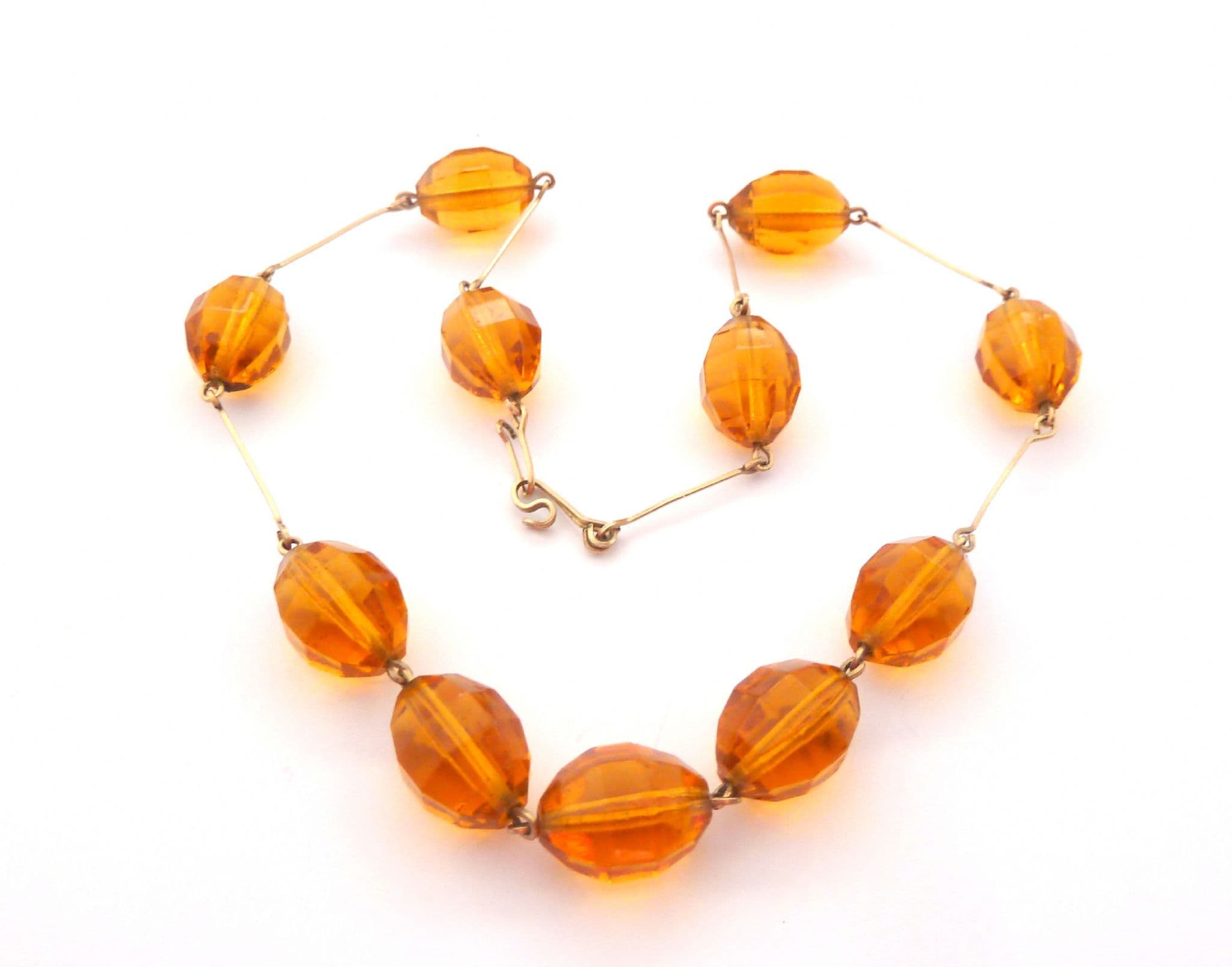 A vintage art deco, amber coloured large glass beaded necklace. The necklace is set with uniform in size large faceted amber coloured glass oval shaped beads. The necklace has a secure hook clasp fastening. Circa 1920's - 30's.