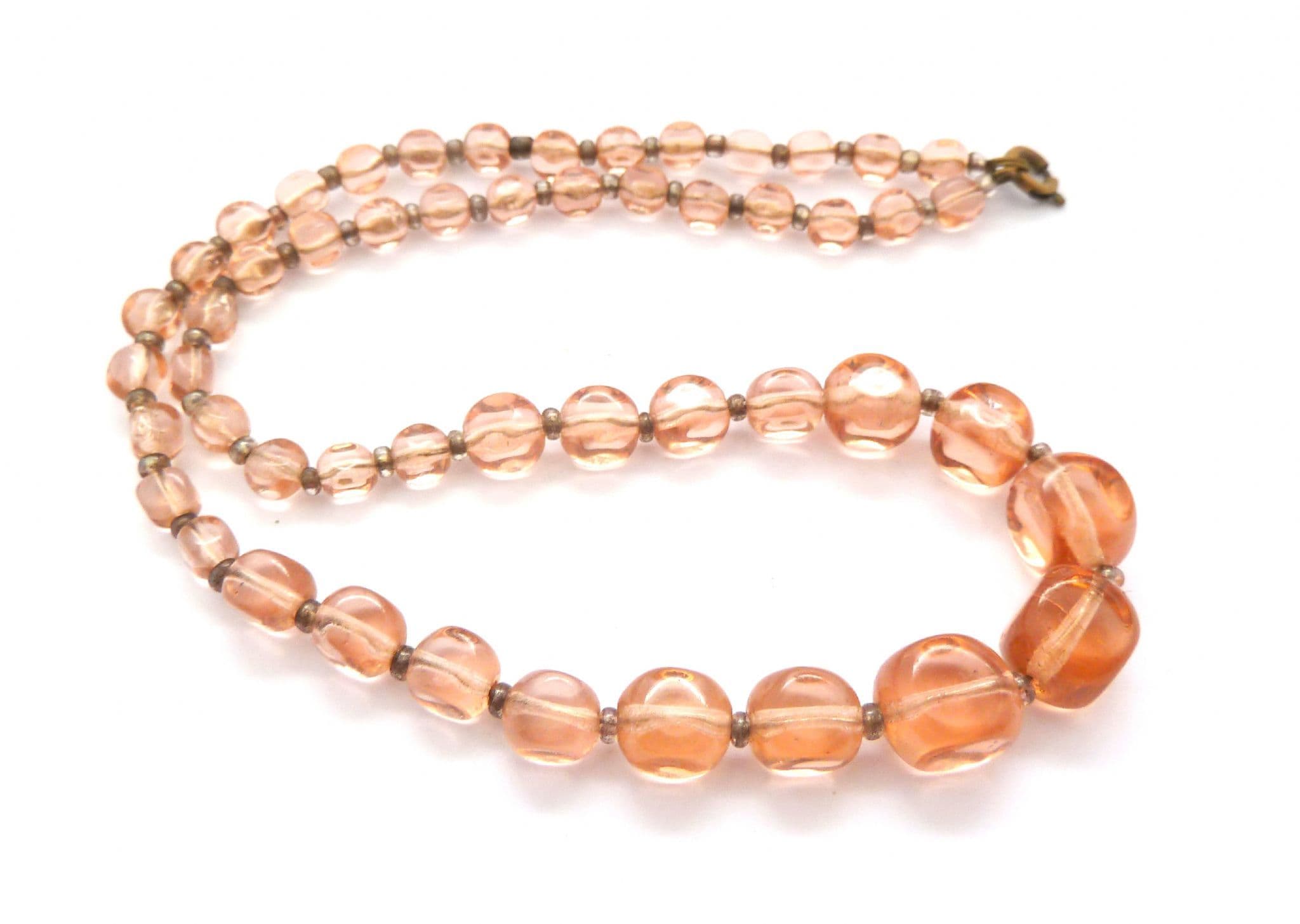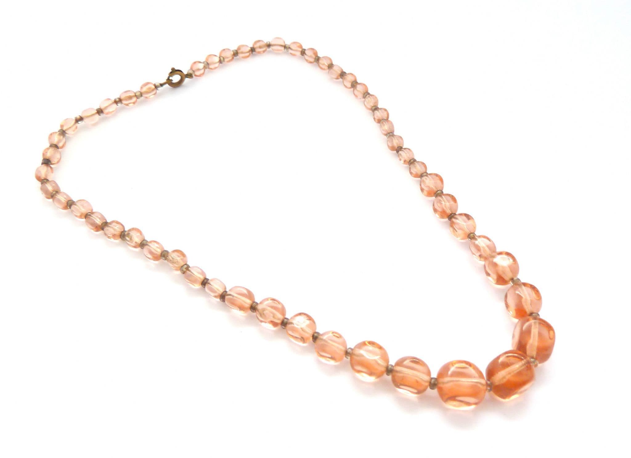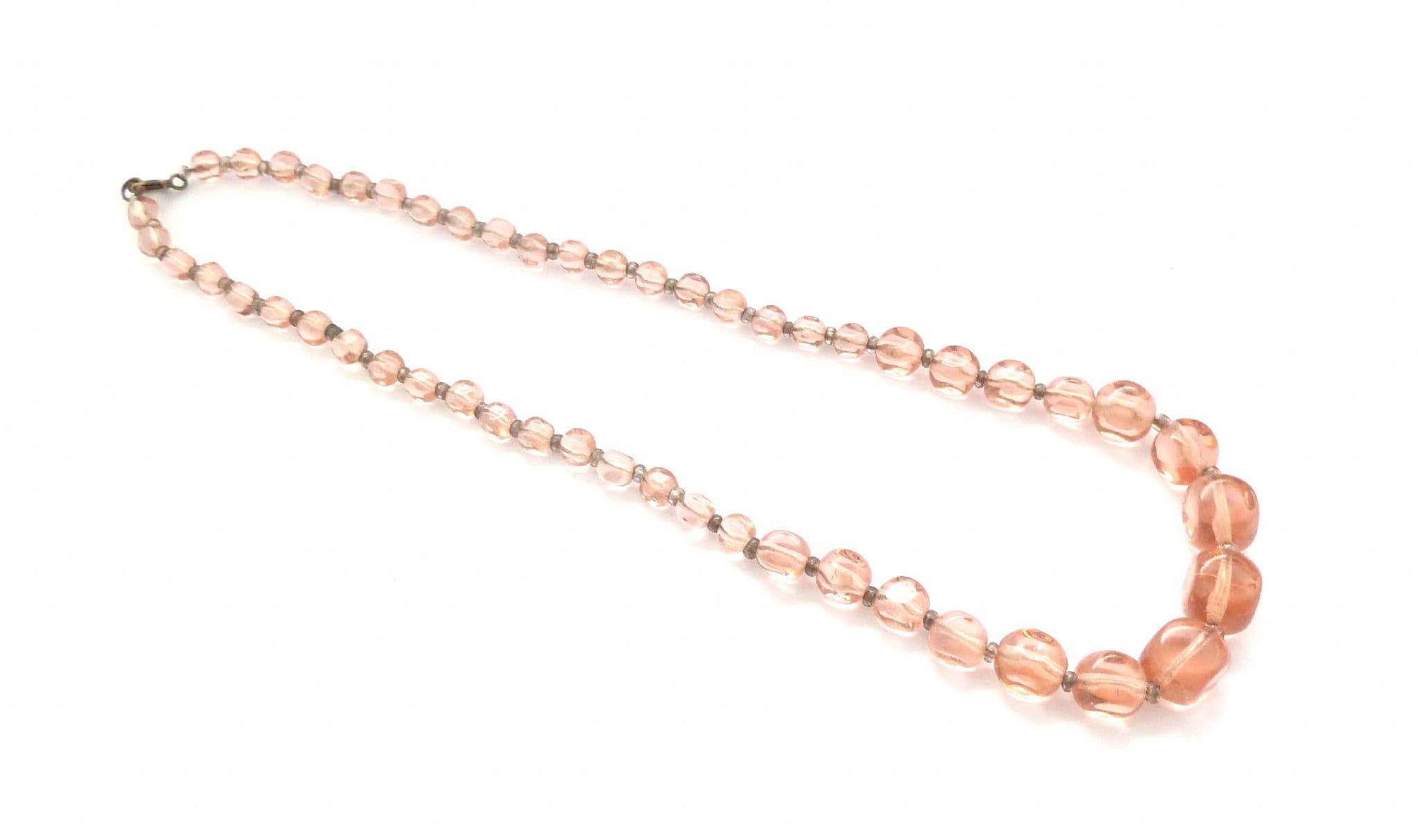 A vintage art deco era pink glass beaded choker necklace. The necklace is formed from faceted geometric shaped pink glass beads graduating in size to the front, separated by glass spacer beads. The necklace has a secure spring ring clasp fastening. Circa 1930's - 40's.