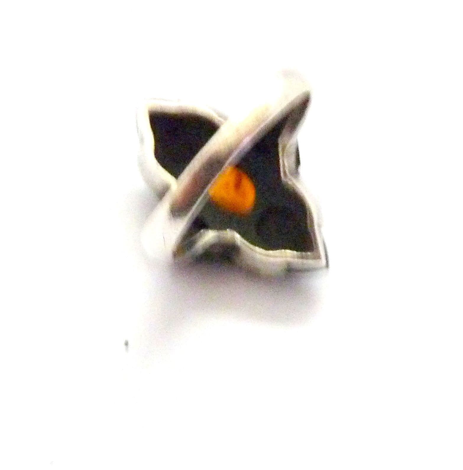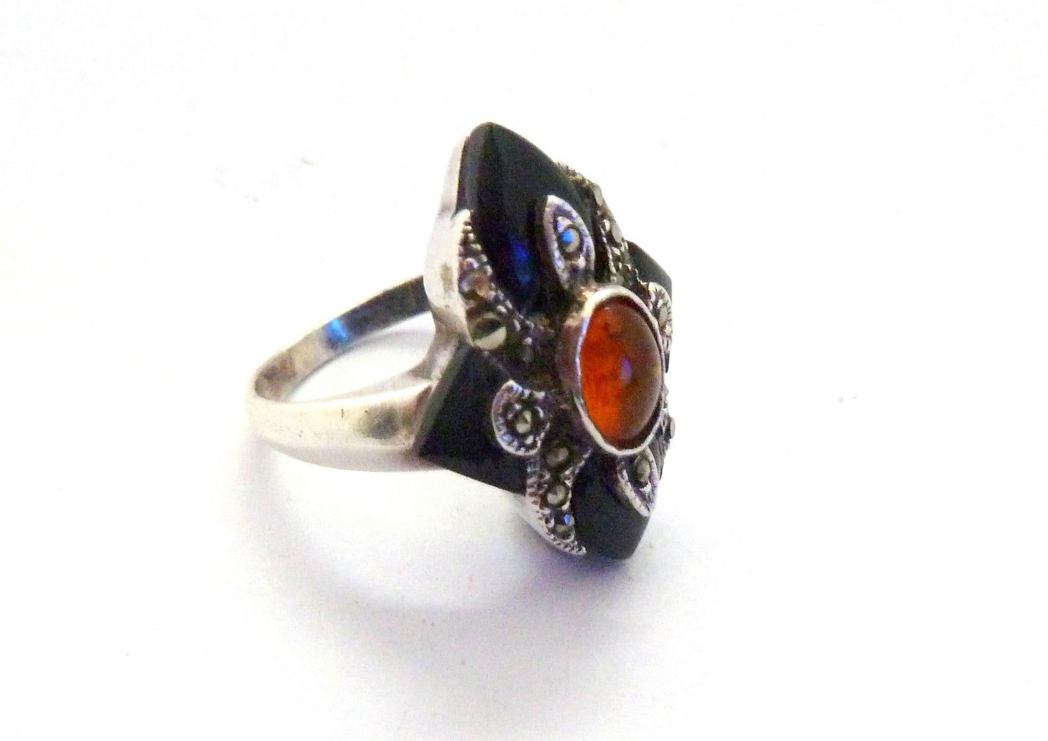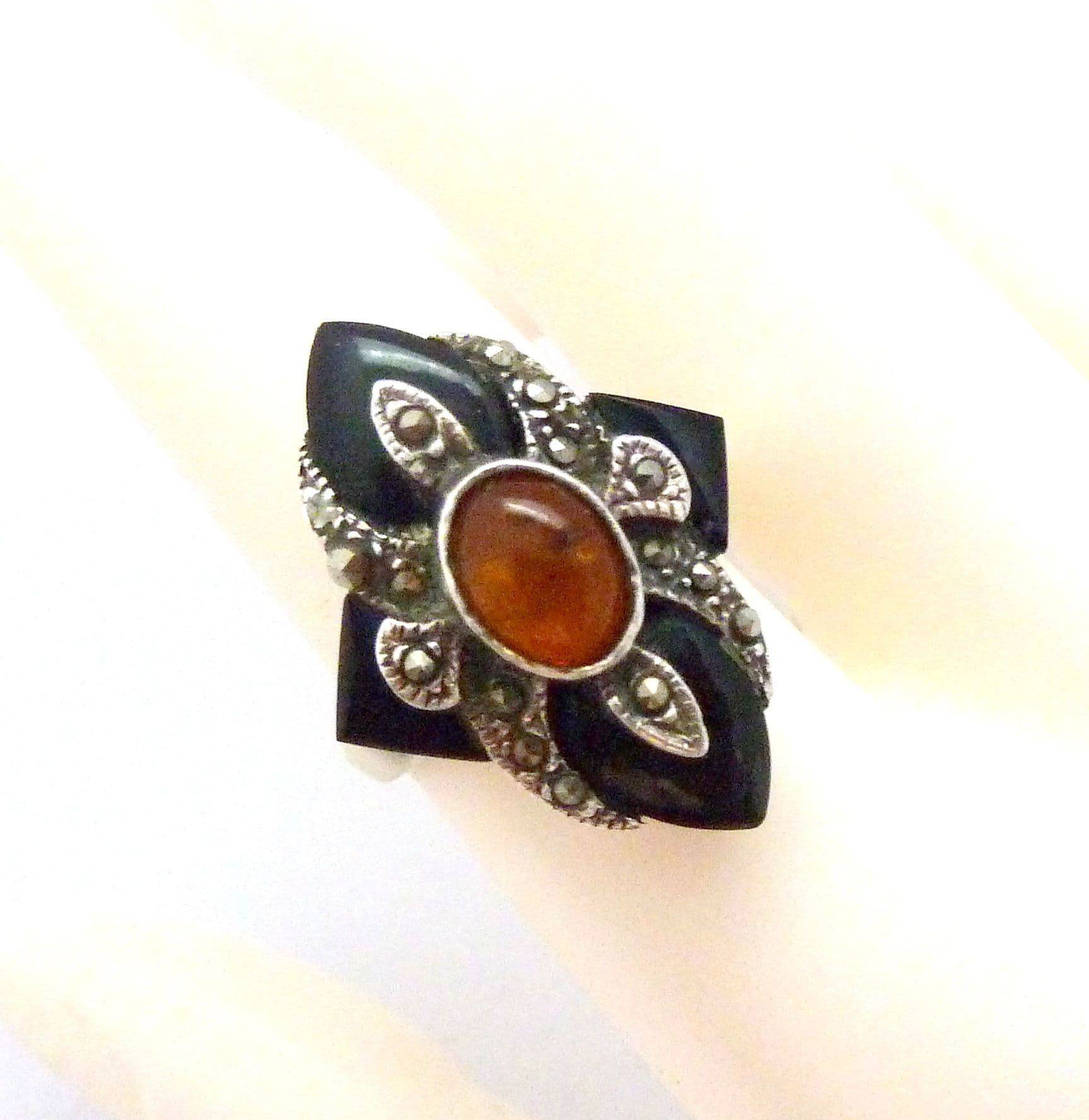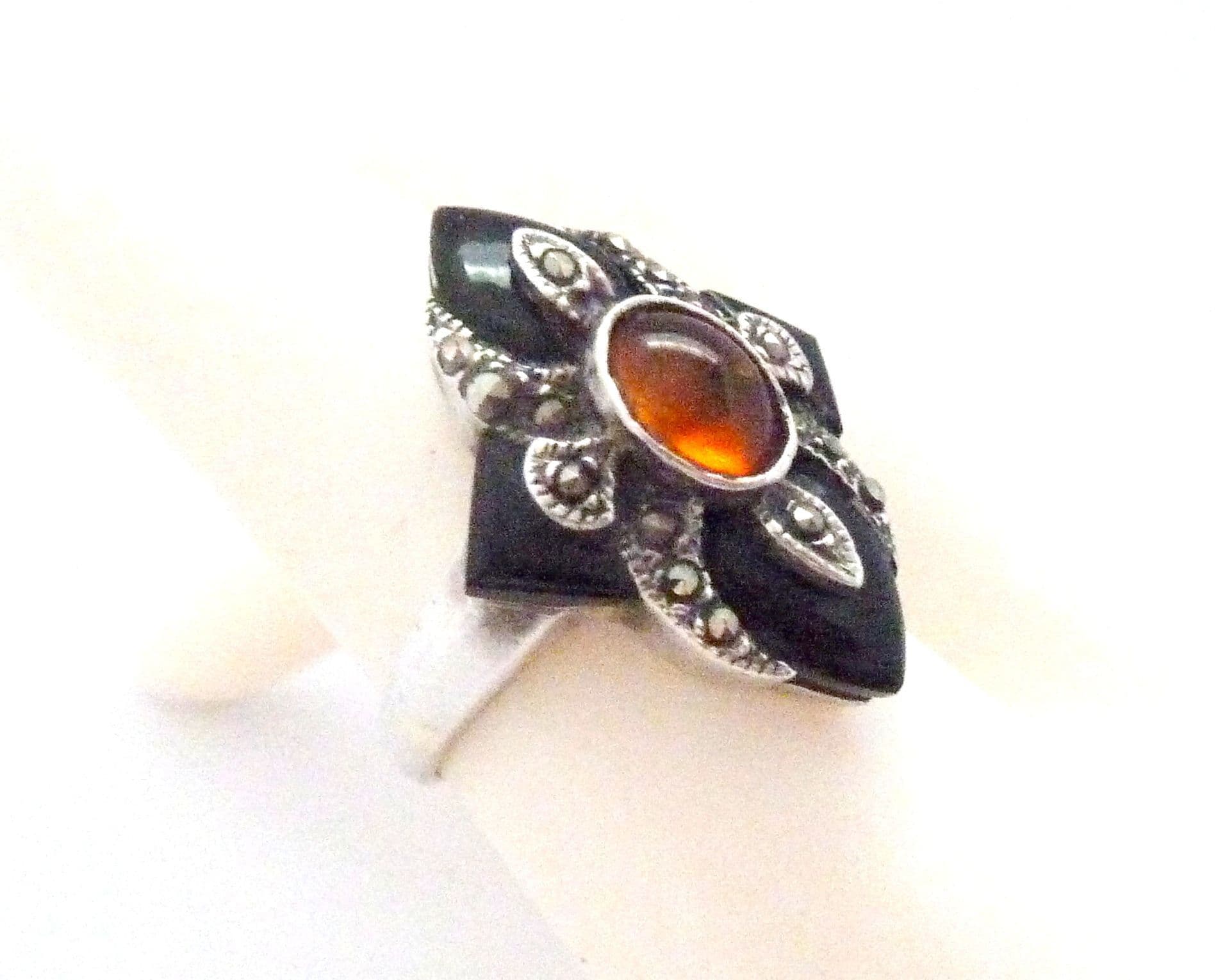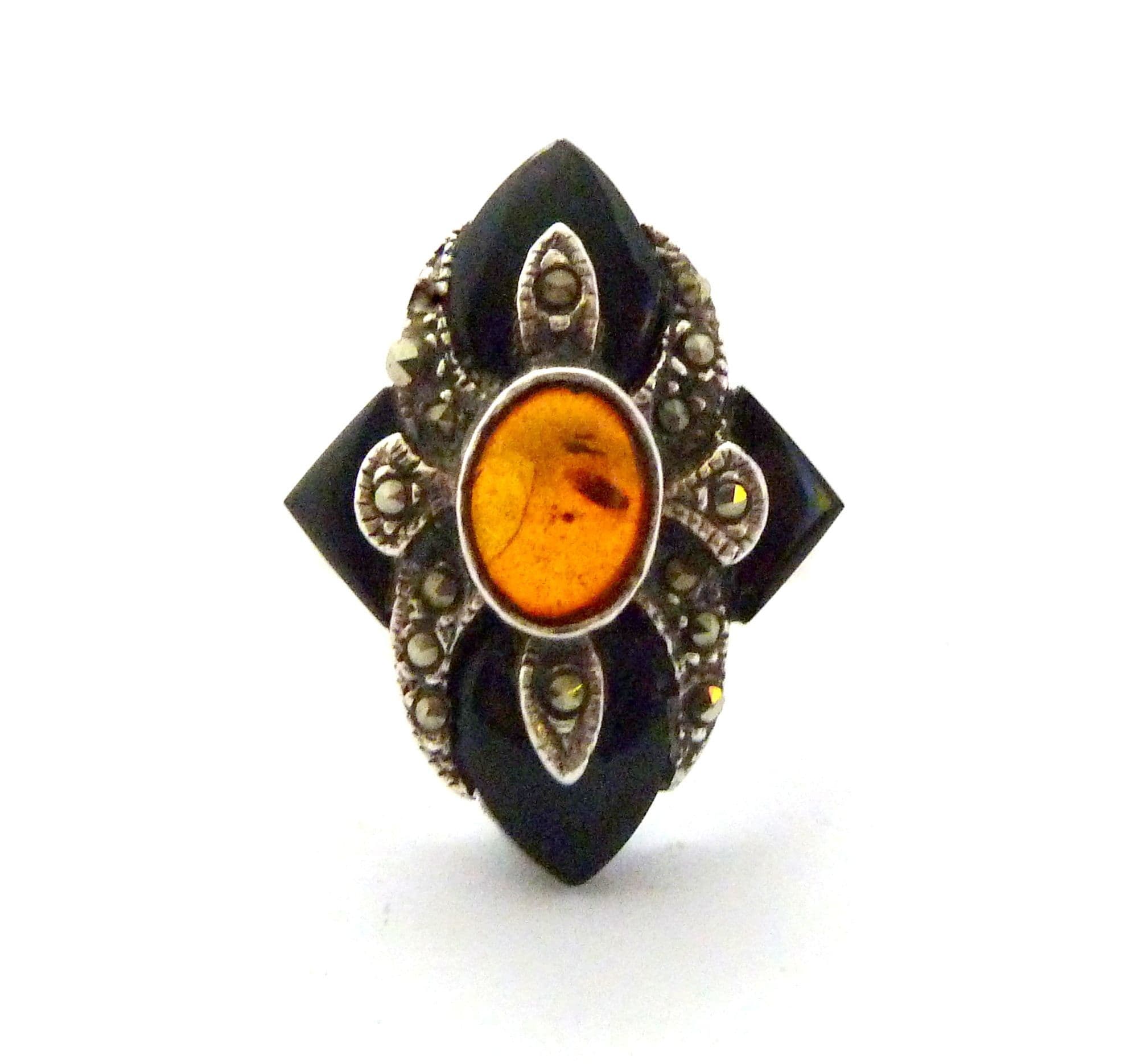 Vintage art deco revival style sterling silver, marcasite onyx and amber gemstone set ring. Formed from sterling silver with a polished plain band set with an art deco revival style marcasite, onyx and amber set head piece. Suitable for UK size Q, USA size 8. Stamped 925 for sterling silver to the inside of the band