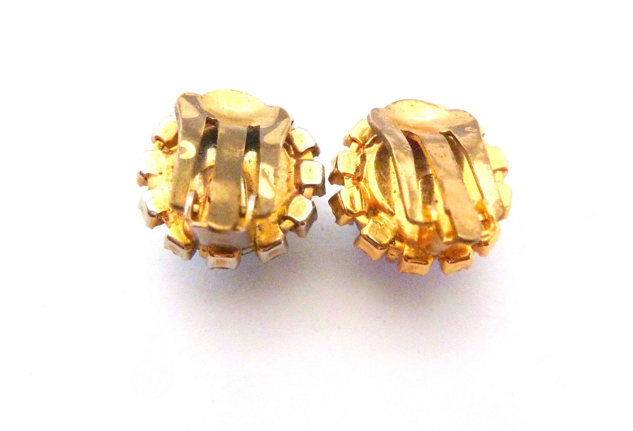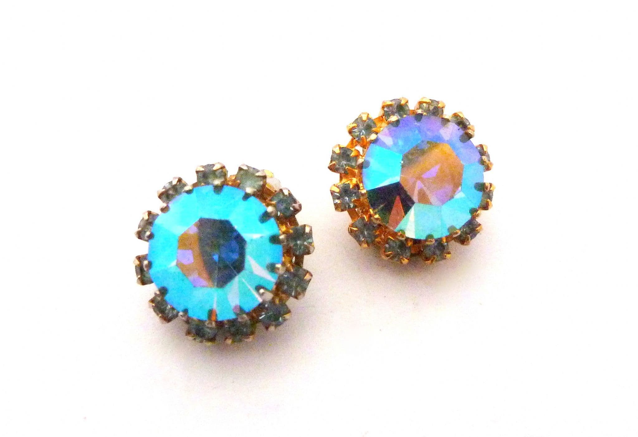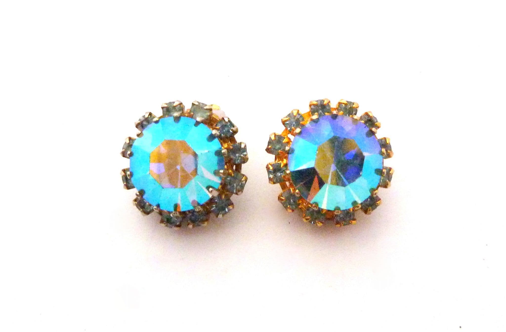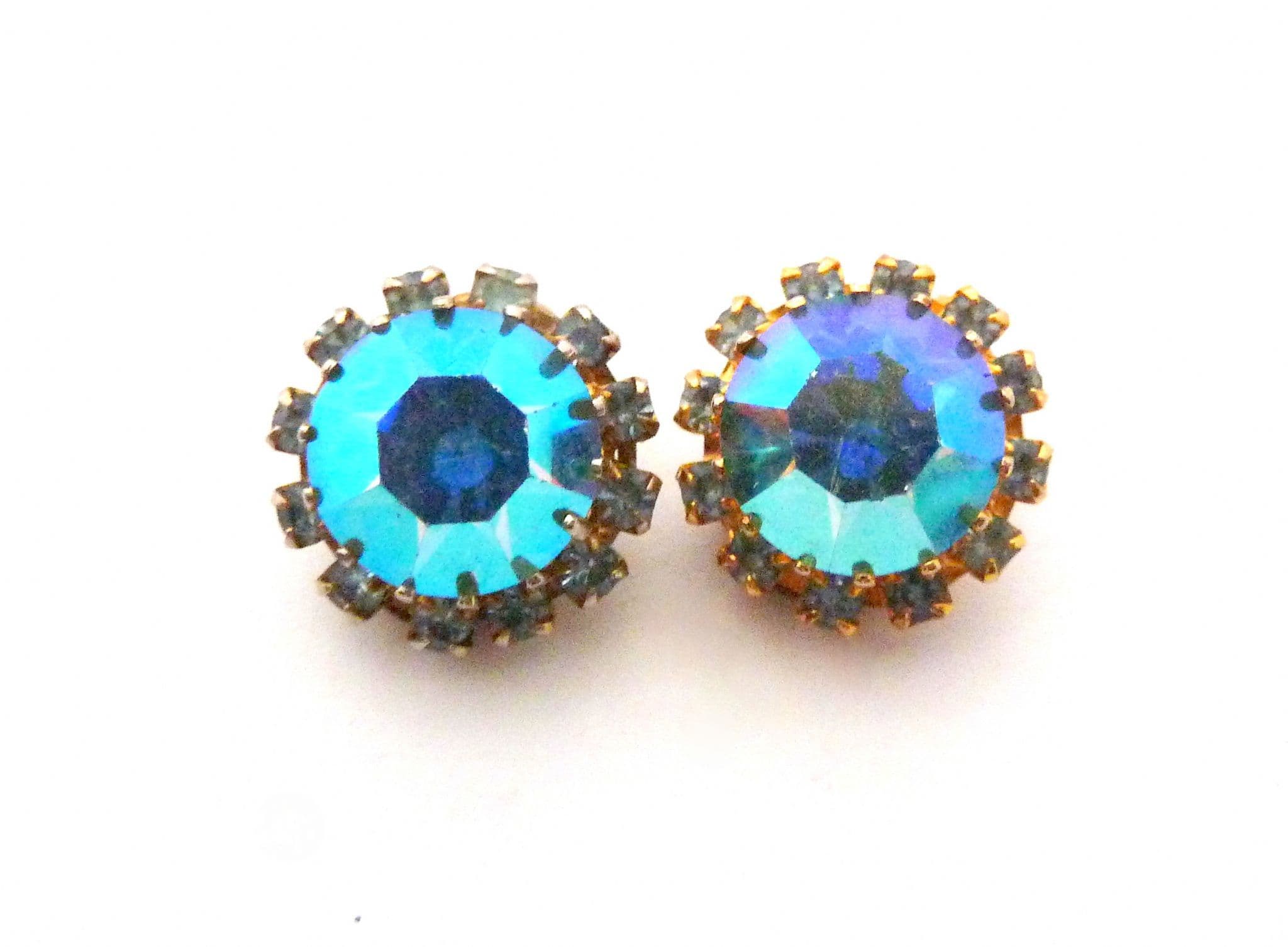 Vintage aurora borealis and blue rhinestone abstract floral style clip on earrings. The earrings are formed from gold tone metal set with aurora borealis and blue rhinestones in an abstract floral style design. Circa late 1950's - 60's.