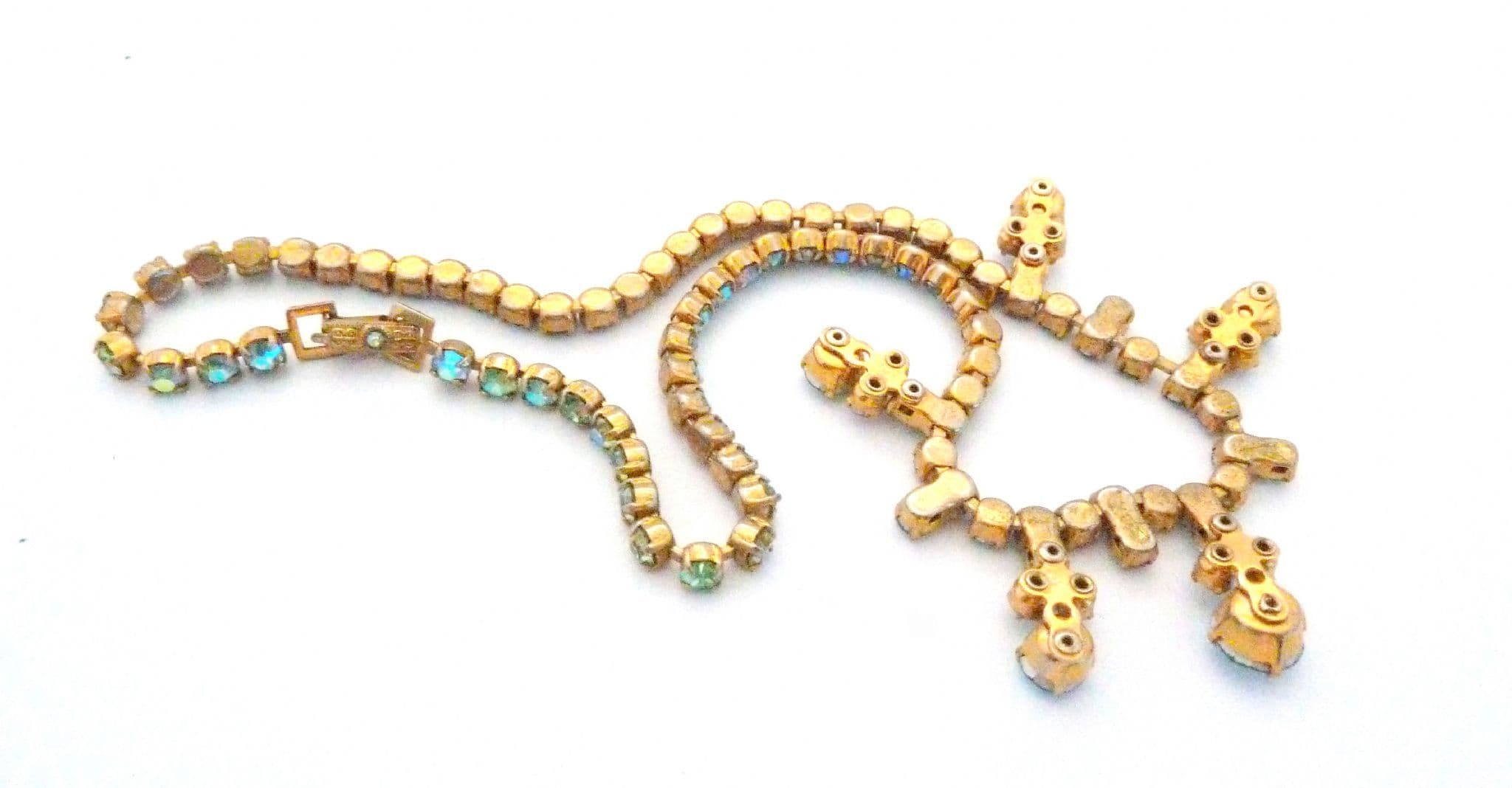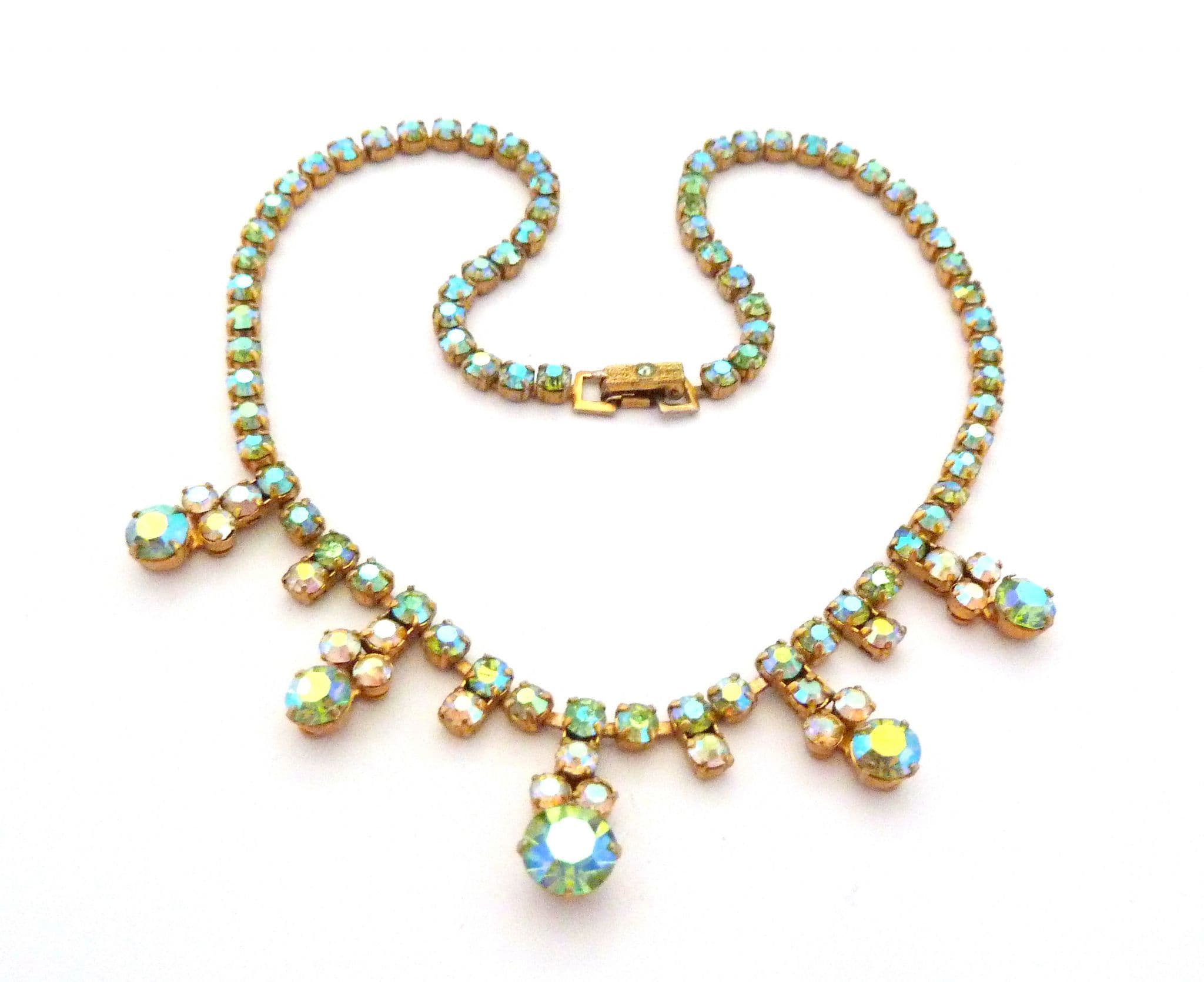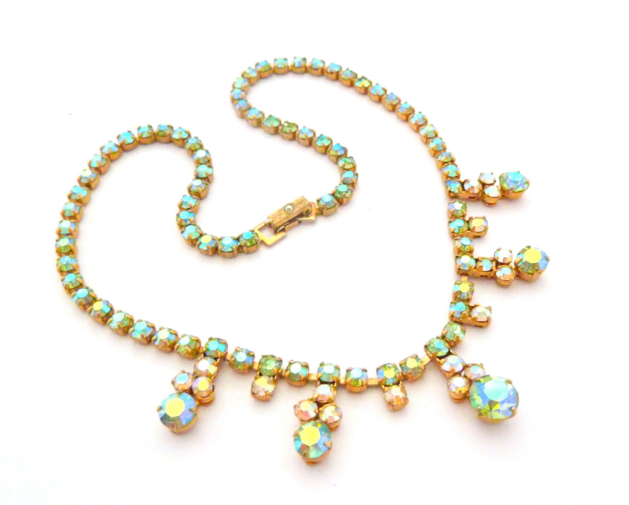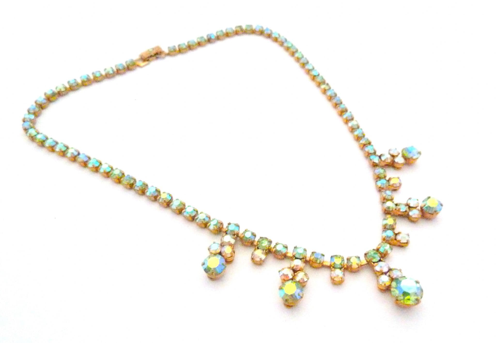 Vintage aurora borealis rhinestone set small drop design choker necklace. Formed from a single row of green tone aurora borealis rhinestones uniform in size. The front 9cm of the necklace has a geometric and abstract style drop design with green and clear aurora borealis rhinestone detailing. All the stones are bright and shiny and individually claw set, fastens with a fold over snap clasp.