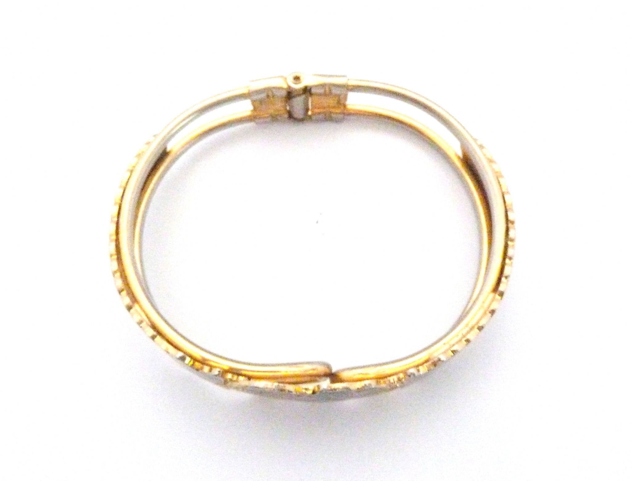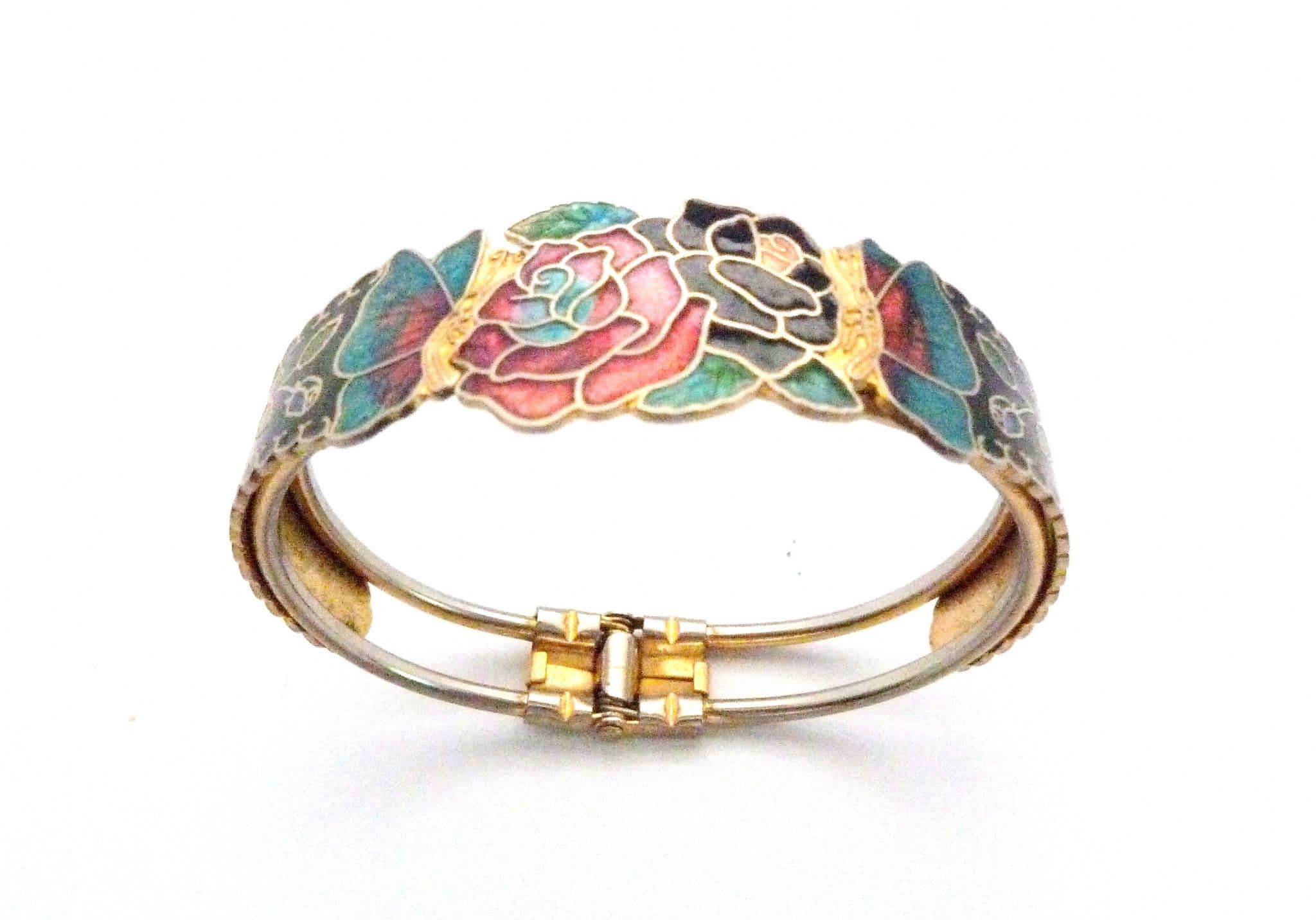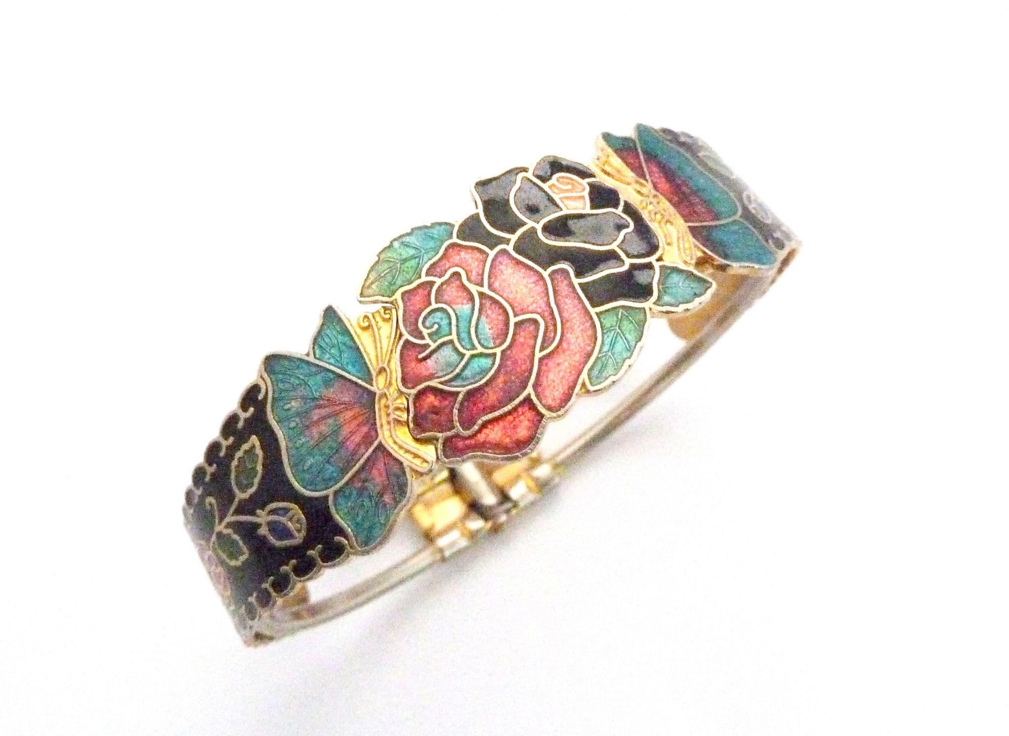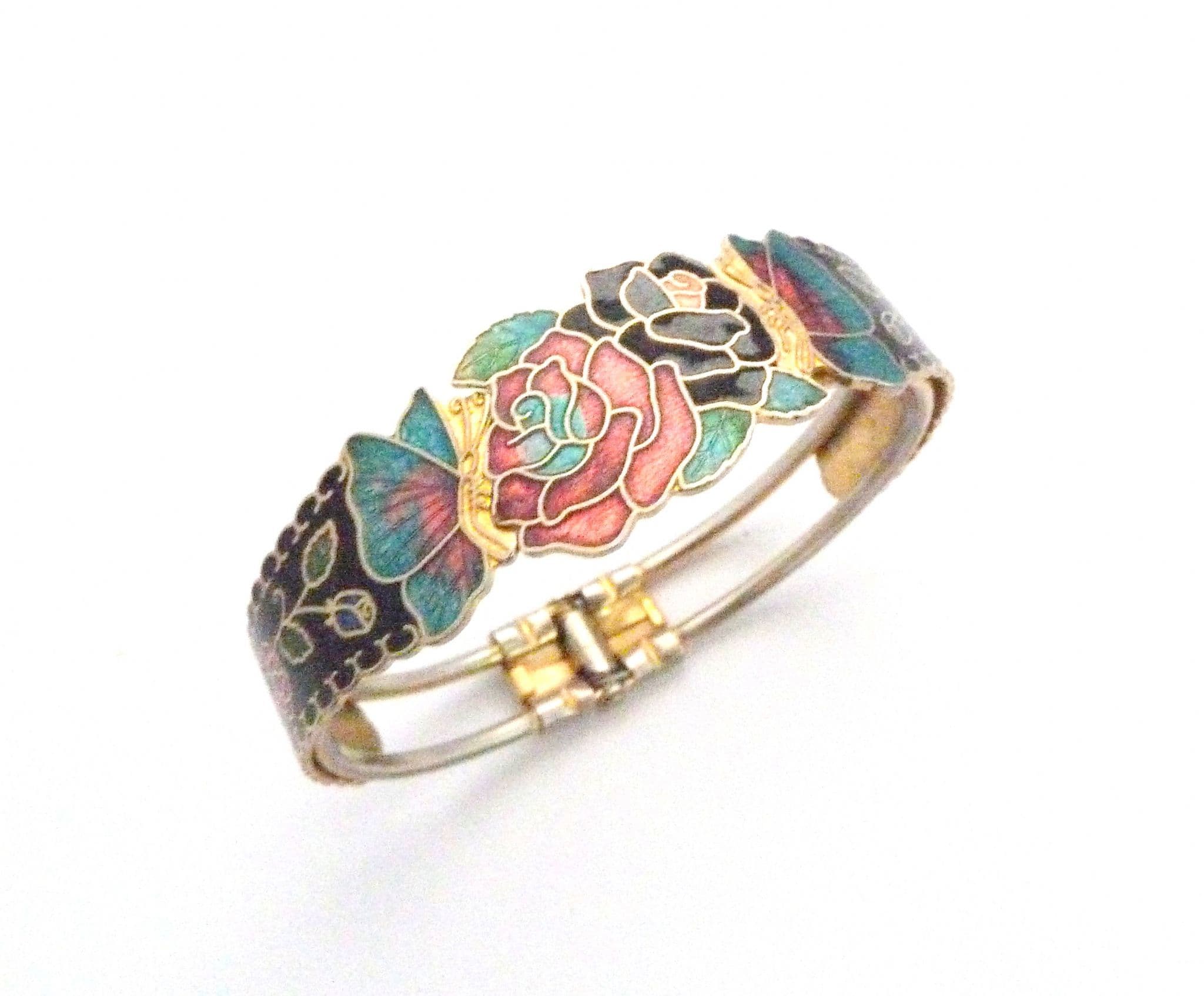 A vintage cloisonne enamel hinged bangle. The bangle has a lovely design of butterflies visiting flowers, with a central front panel and detailing to the sides. It has a hinged open and close mechanism. Circa 1980's - 90's.