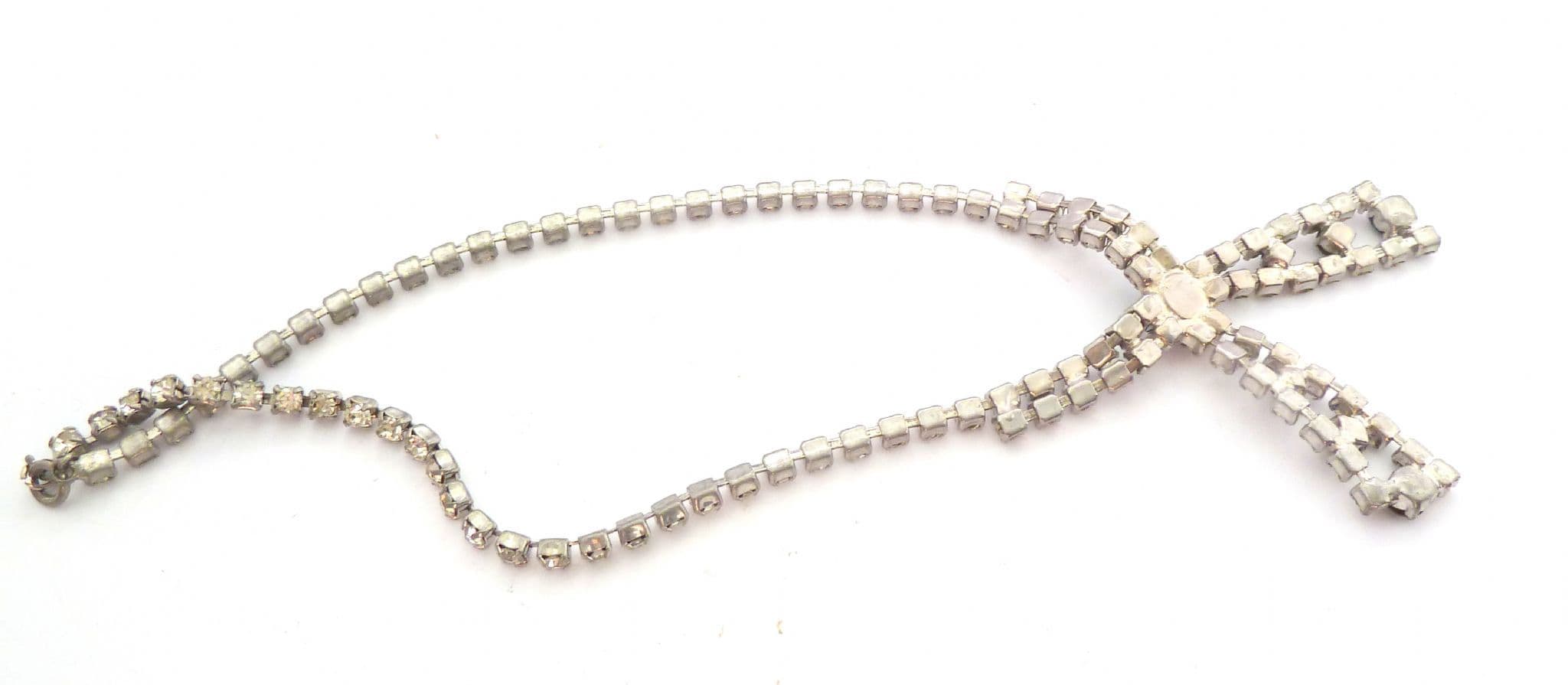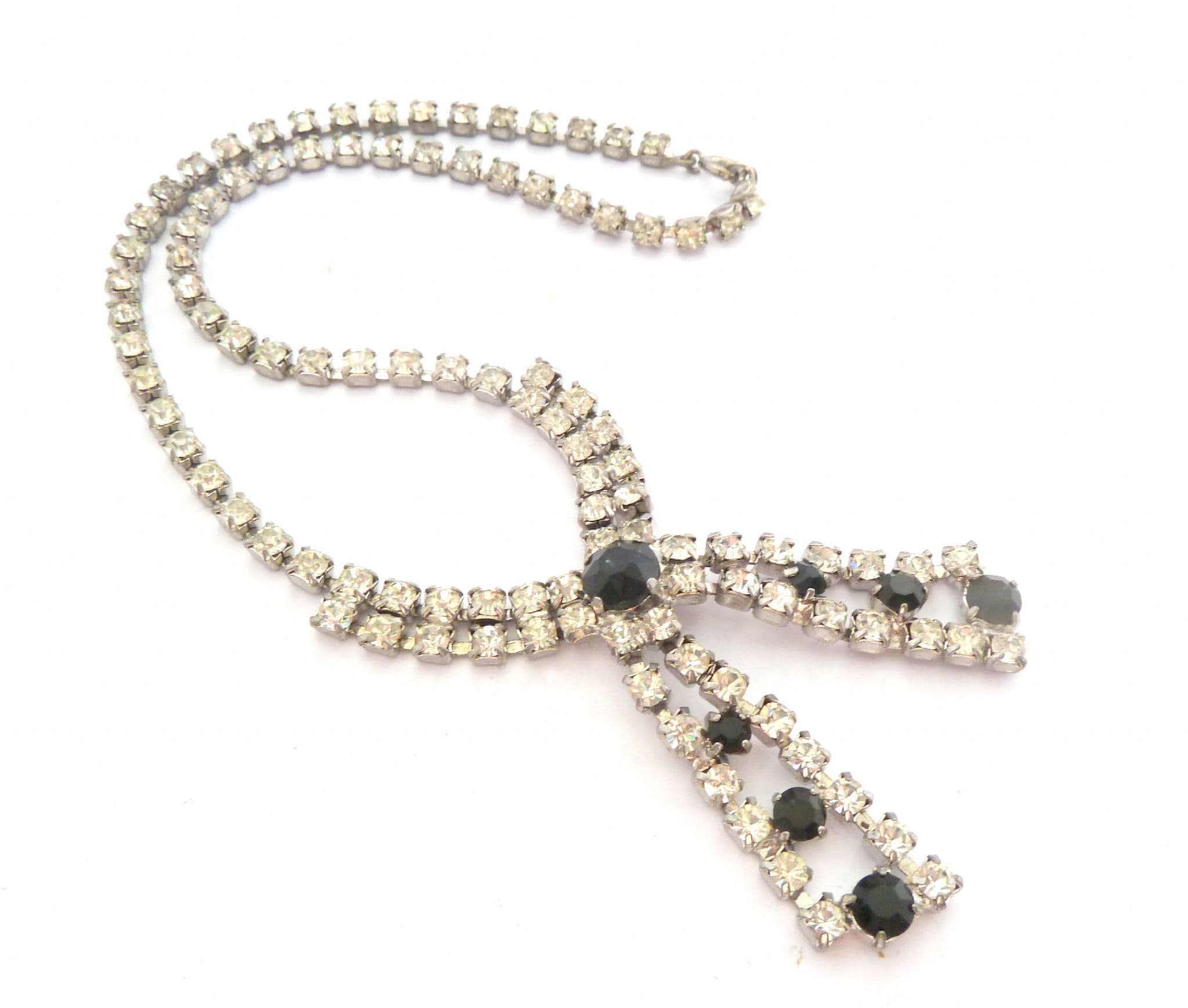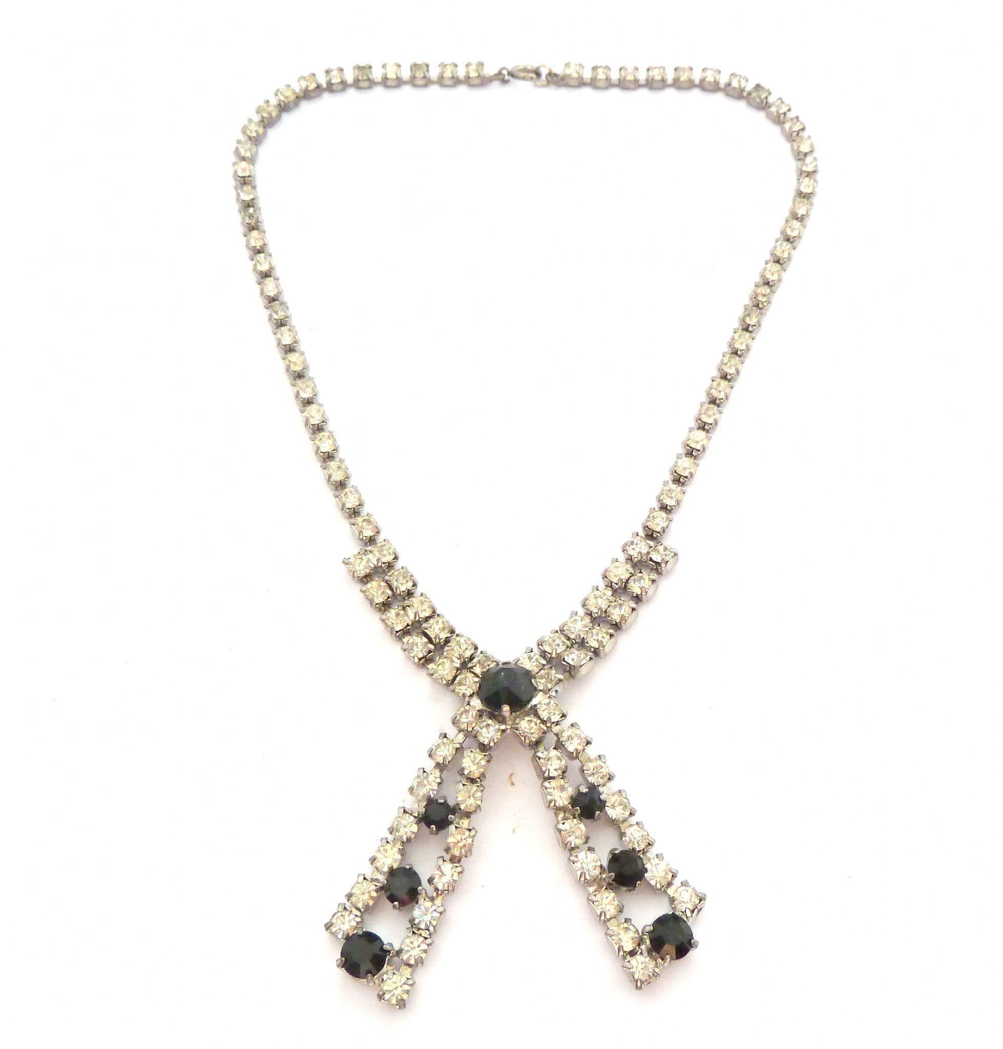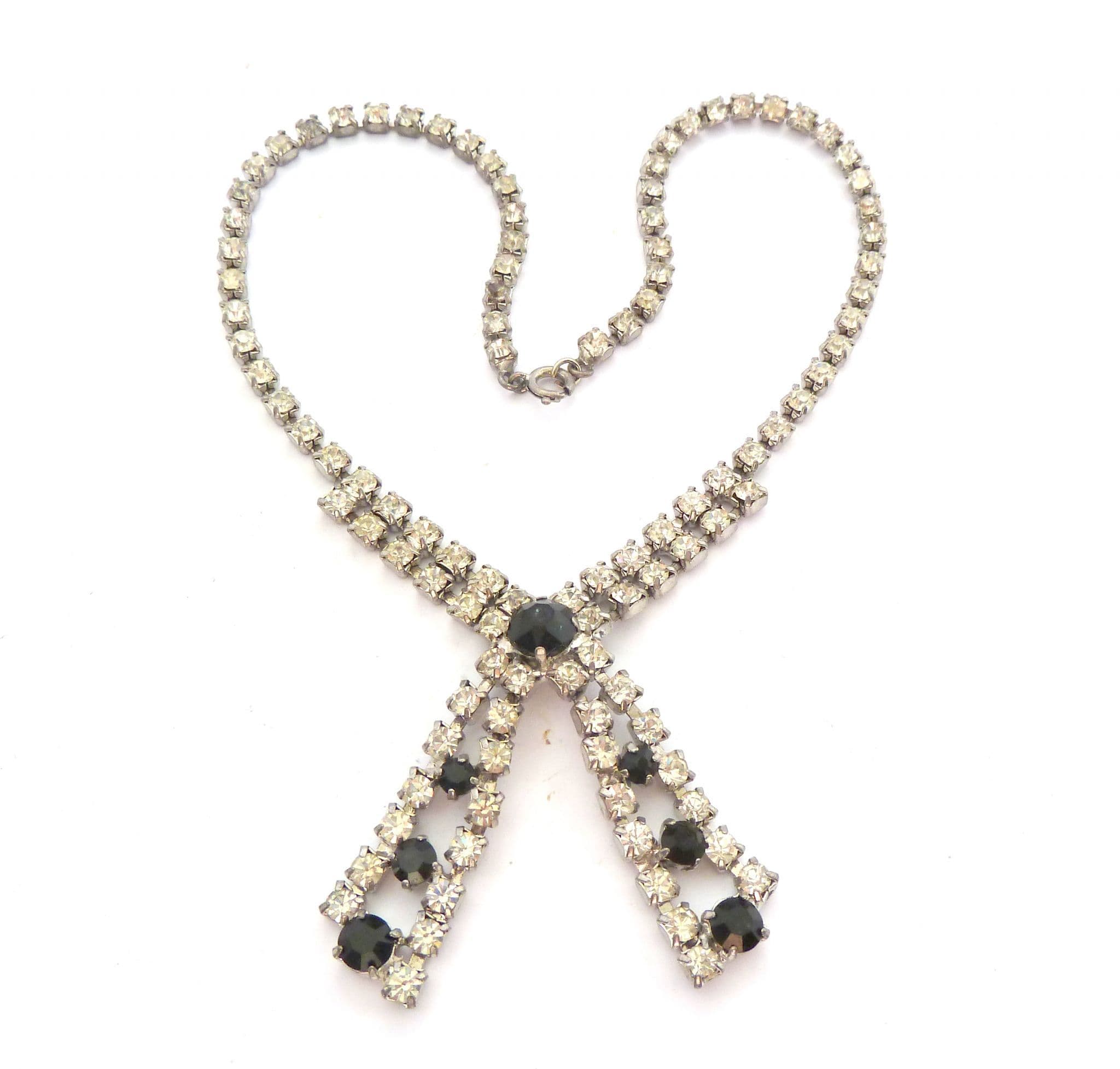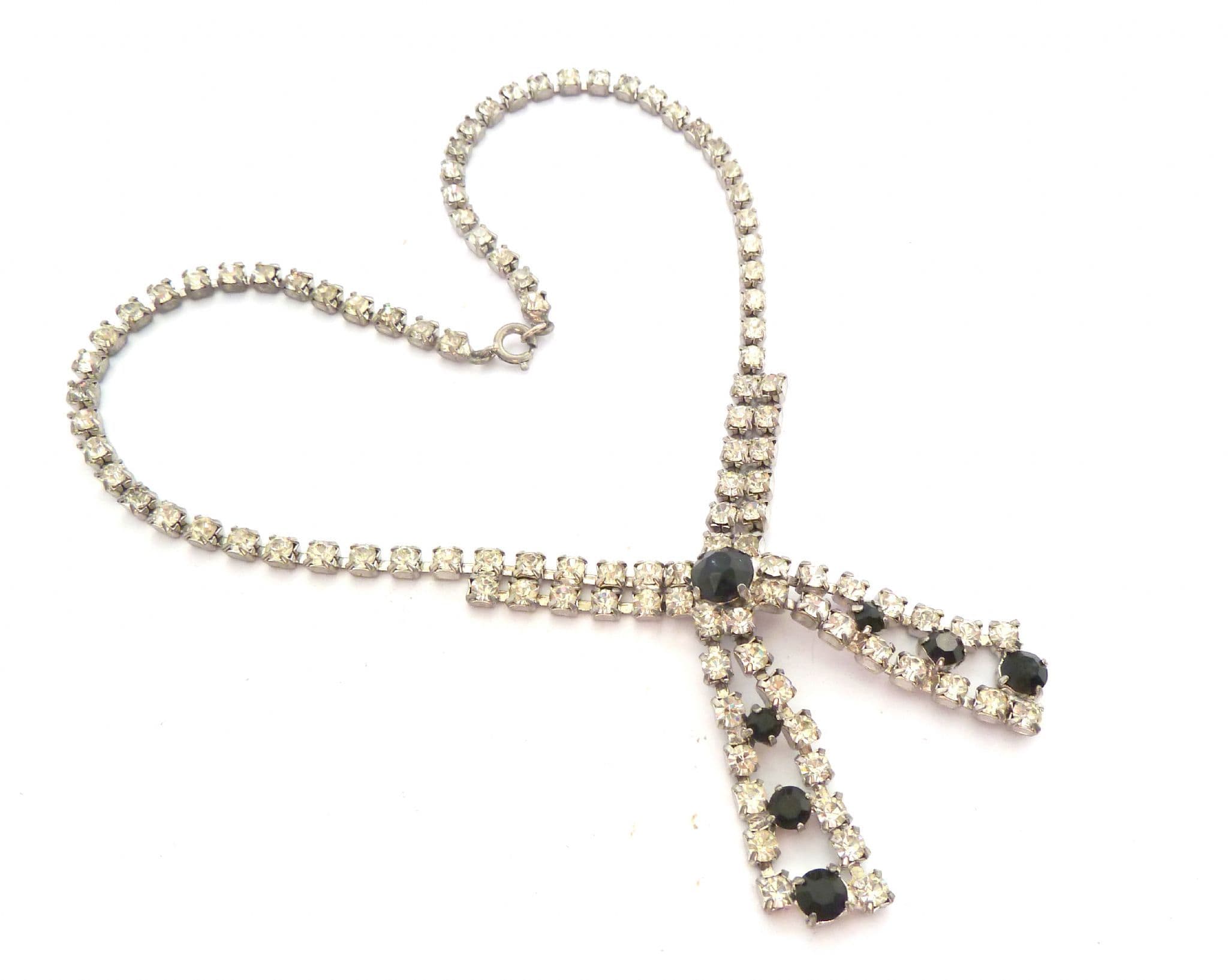 Vintage clear and black rhinestone set double drop design choker necklace. Clear rhinestones adorn the complete length of this lovely necklace , featuring a double flared drop design to the front, detailed with black rhinestones. Spring ring fastener. Circa 1950s - 60s