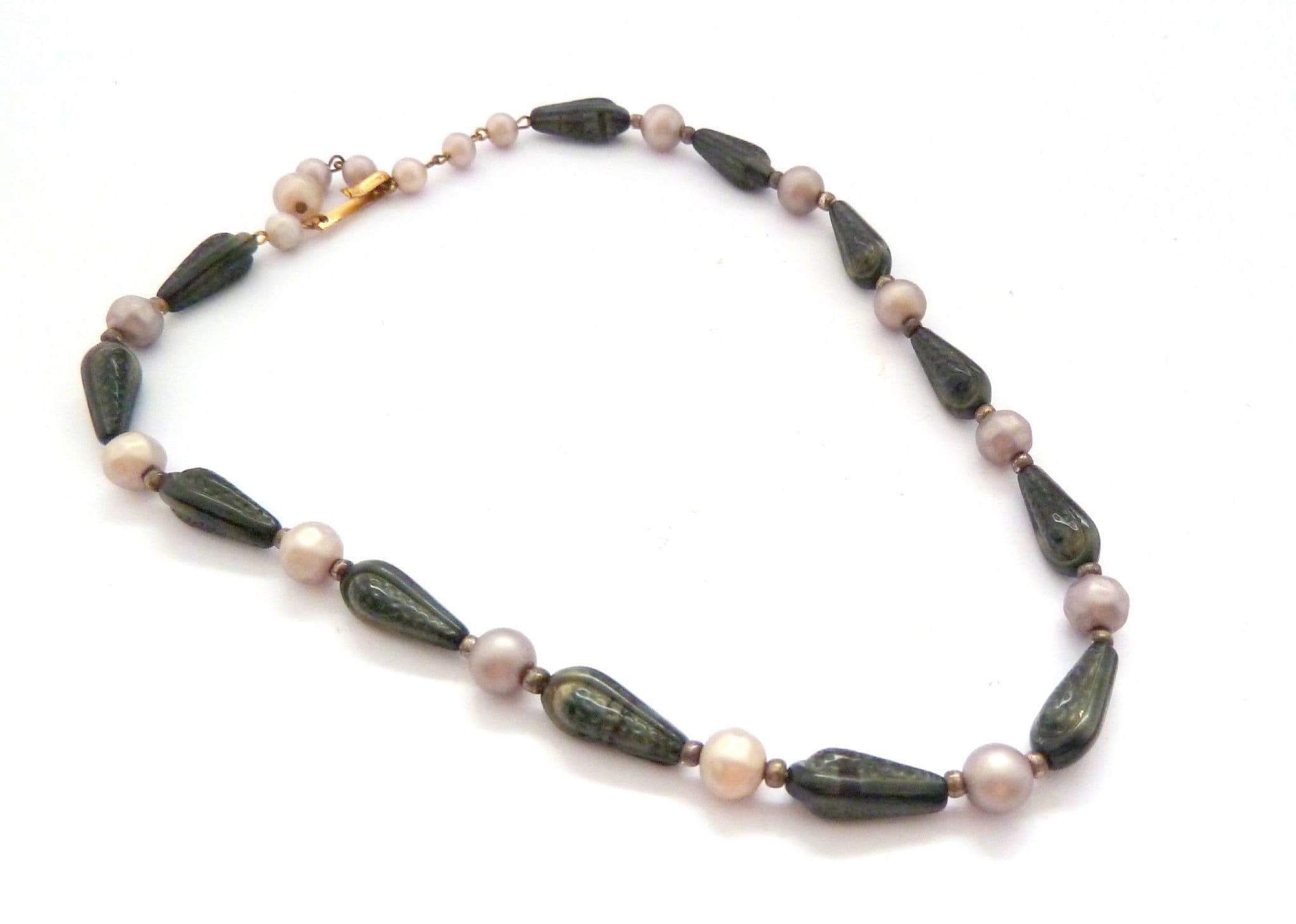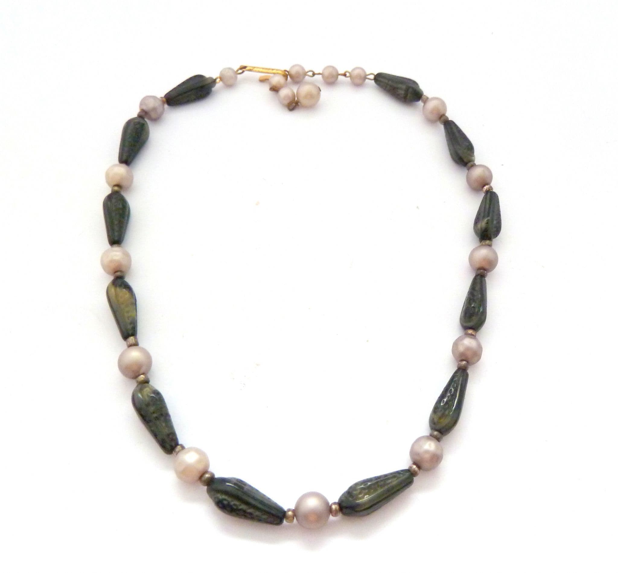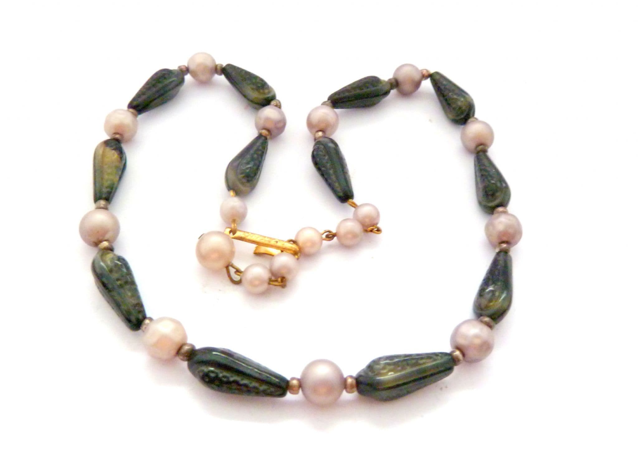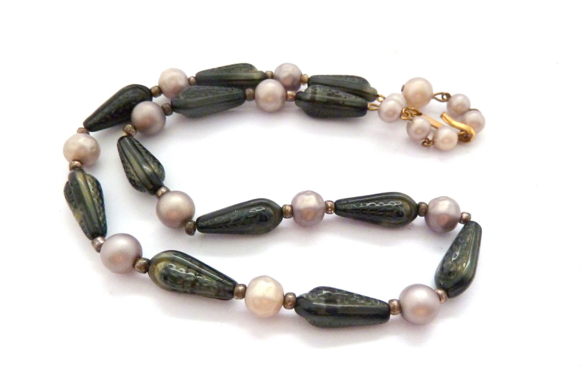 Vintage black glass and pearlised bead adjustable length choker necklace made in Western Germany. The necklace is formed from uniform in size abstract cone shaped marbled black textured glass beads and pearlised finished beads. Fastens with an adjustable length hook clasp. Circa 1950's - 60's.