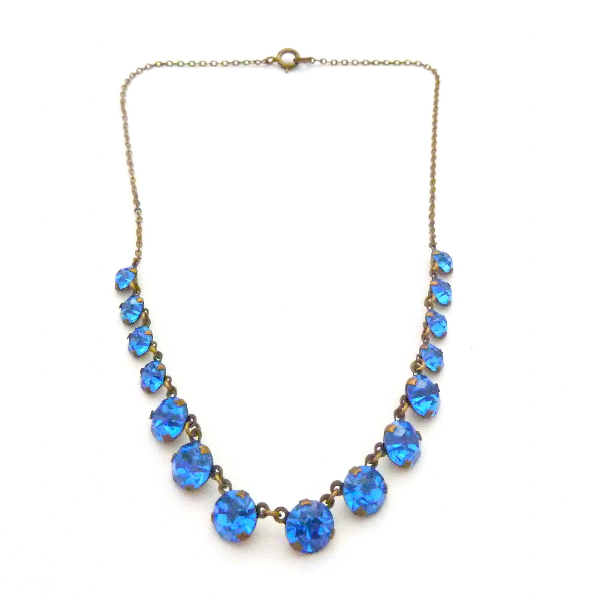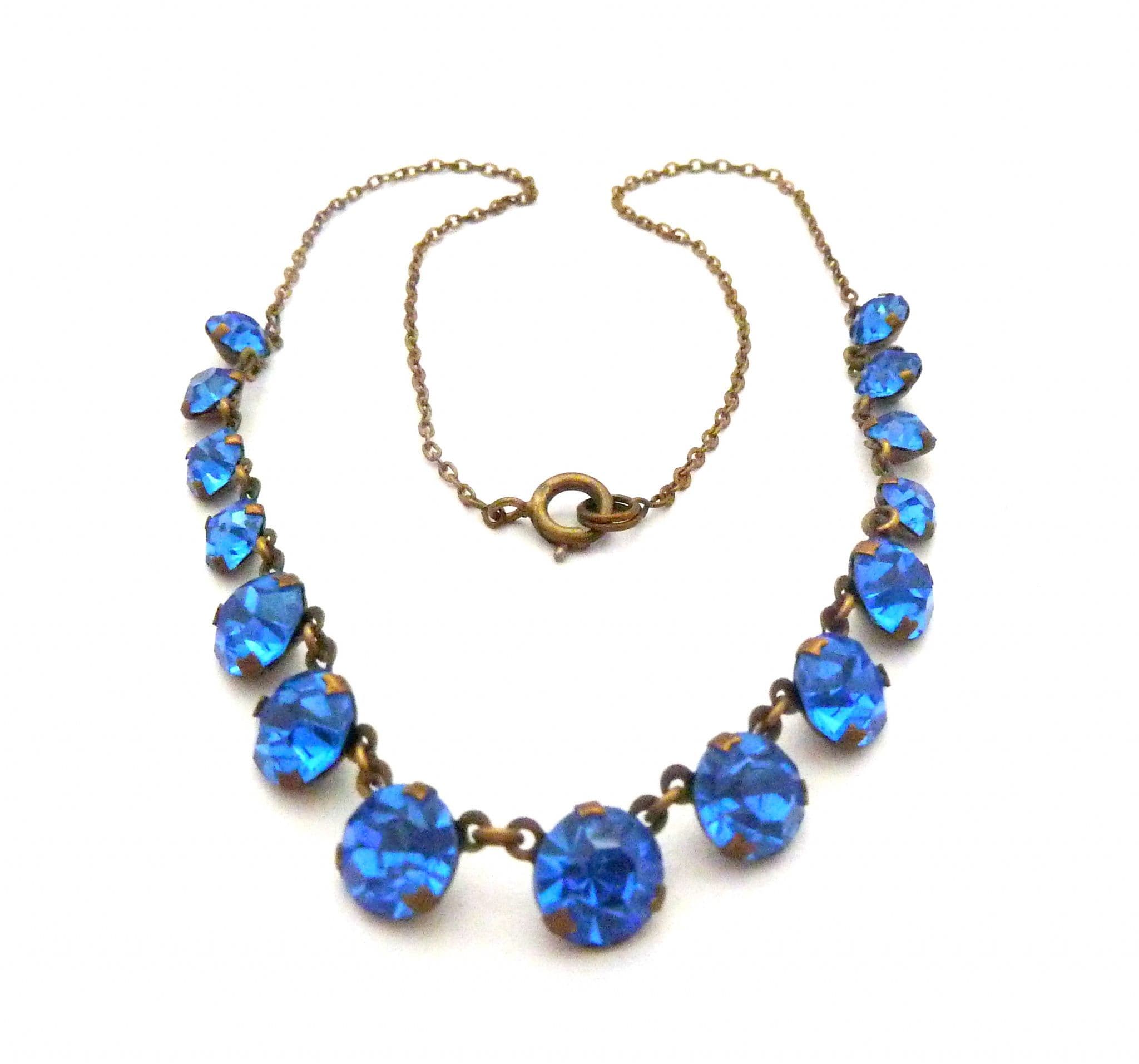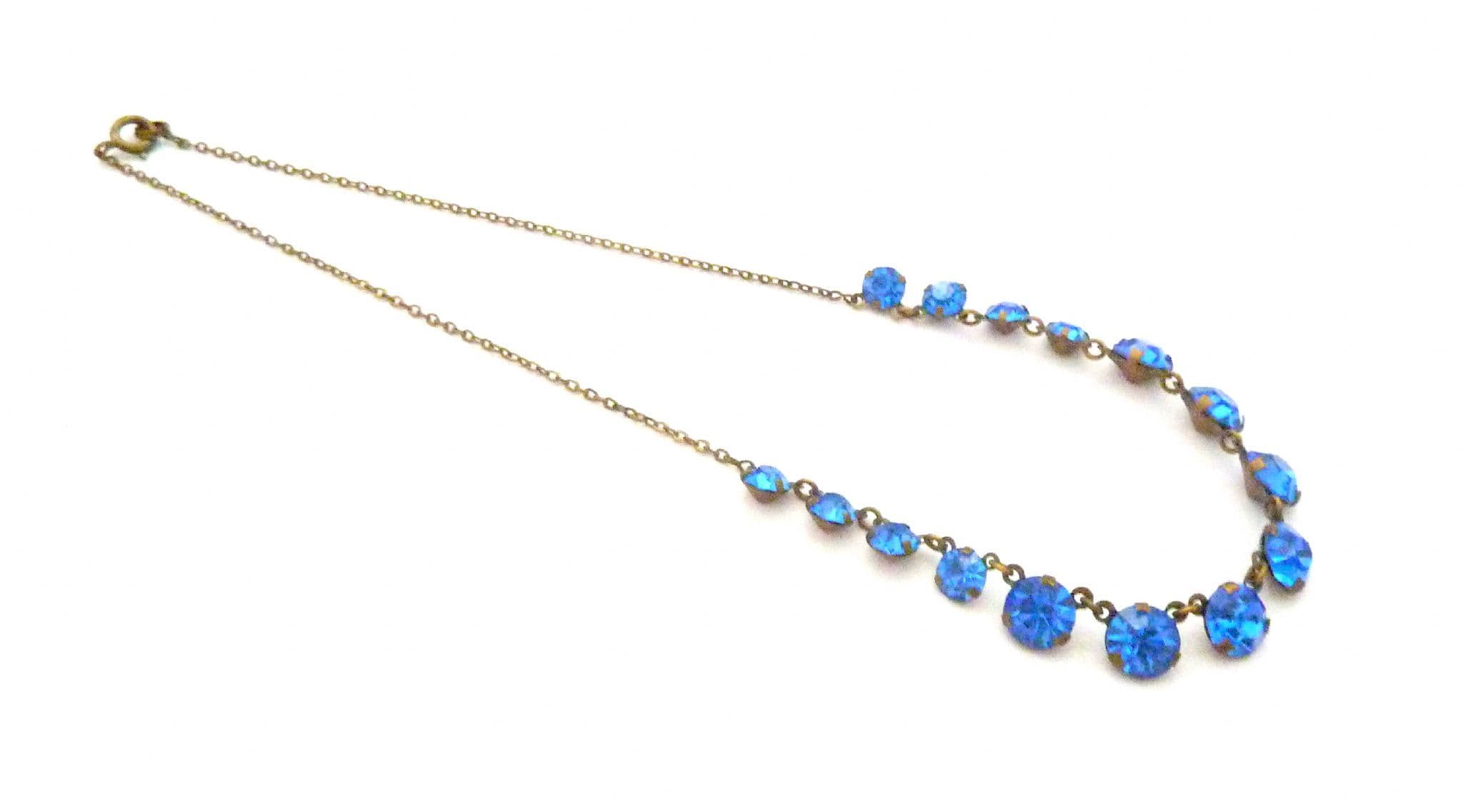Vintage blue rhinestone set riviera style choker necklace. Set with graduated blue glass rhinestones in a riviera style. The necklace fastens with an spring ring clasp fastener. Circa 1930's - 40s.