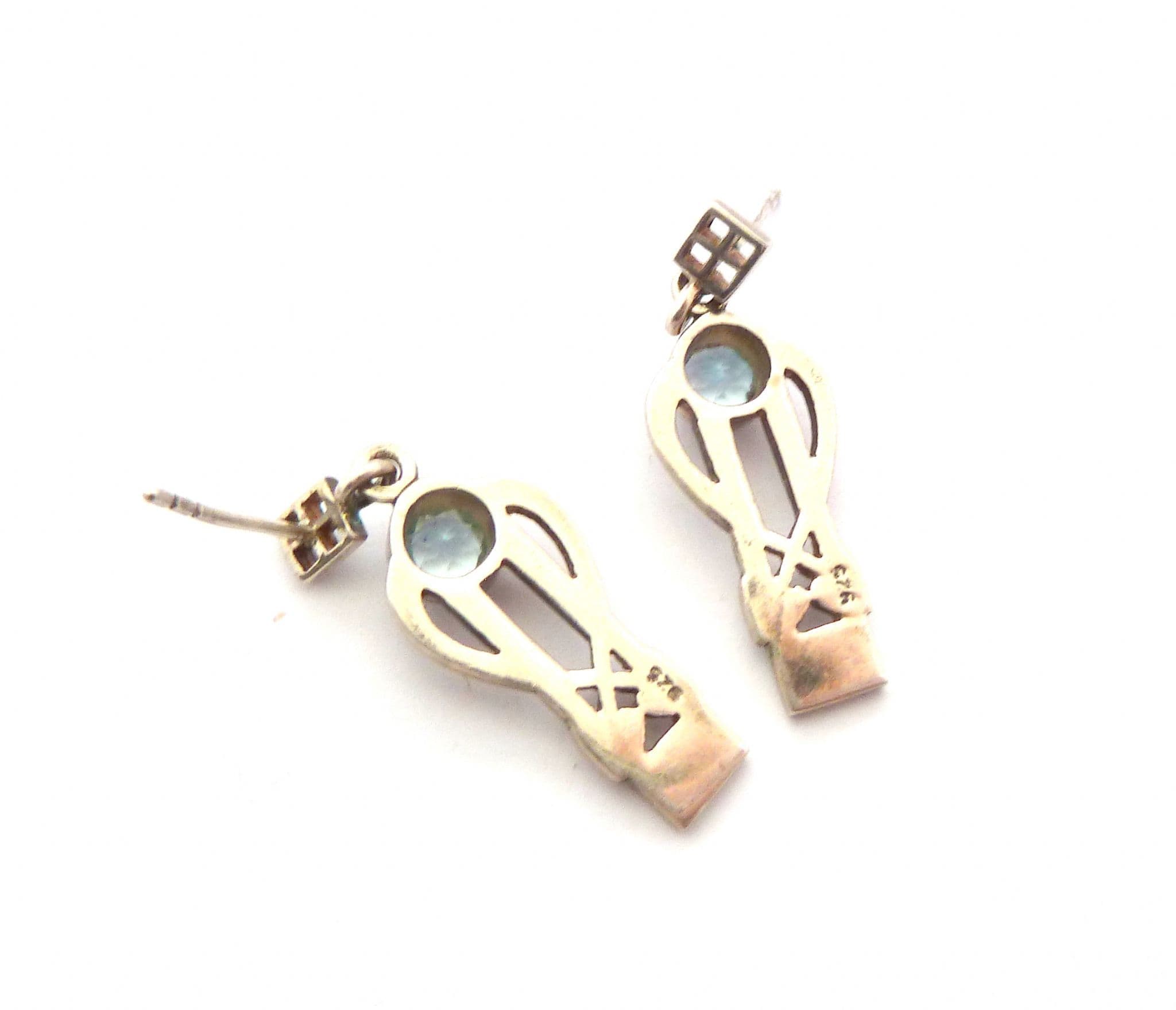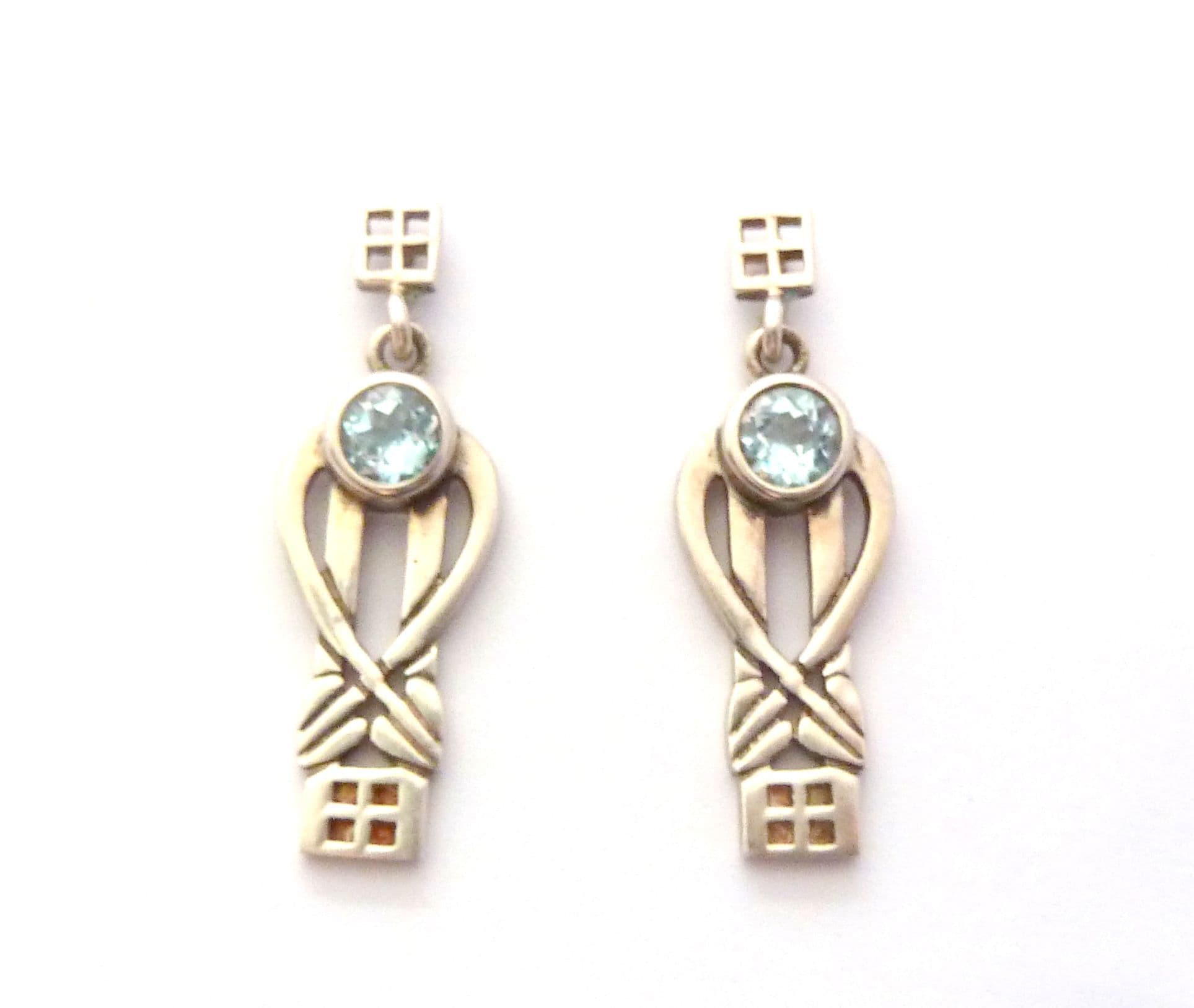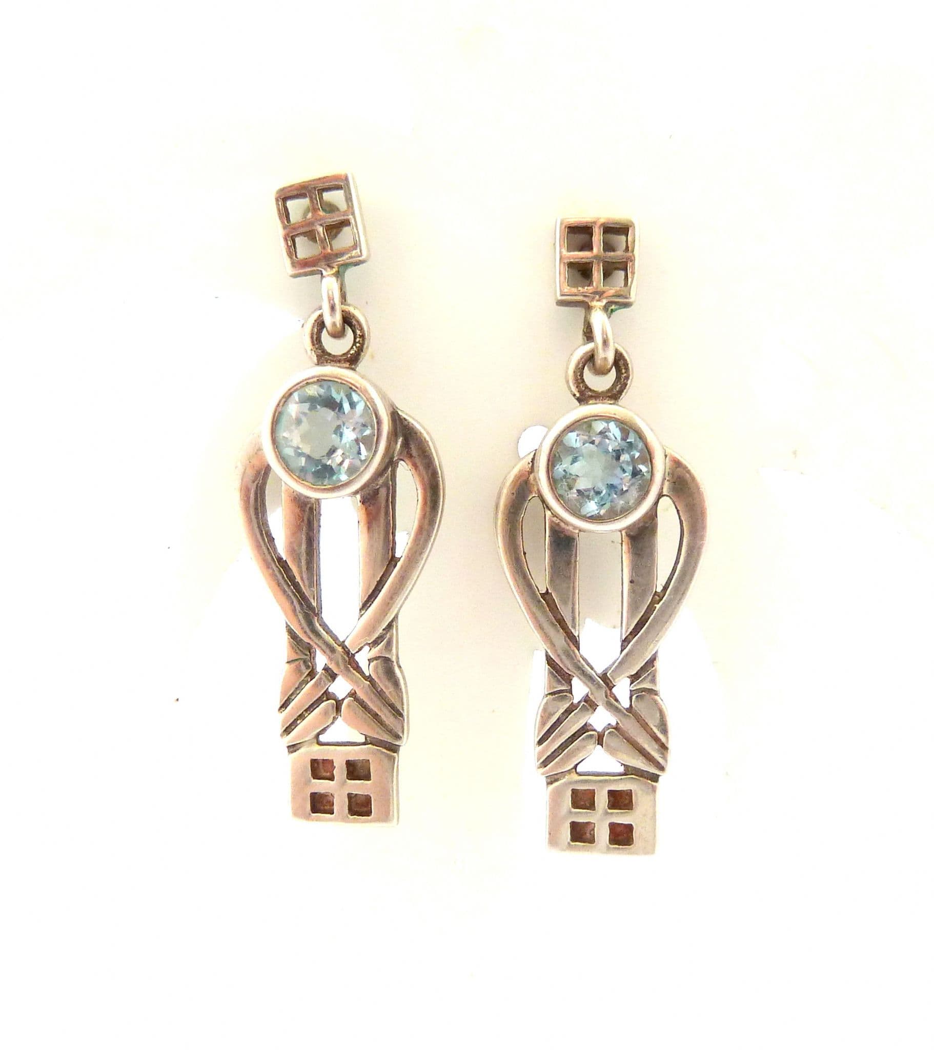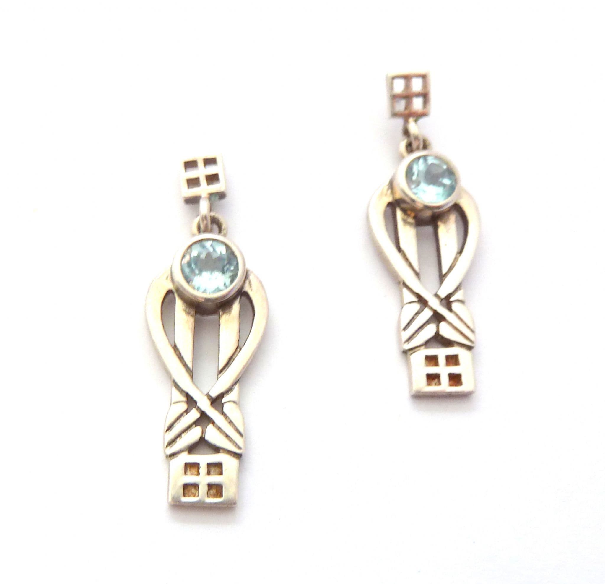 Vintage sterling silver and blue topaz gemstone set Rennie Mackintosh inspired drop design earrings. Each earring is formed from sterling silver in a Rennie Mackintosh inspired drop design set with blue topaz stones. Suitable for pierced ears with fish hook backs. Stamped 925 to the backs. Circa late 1990's - early 2000's.
