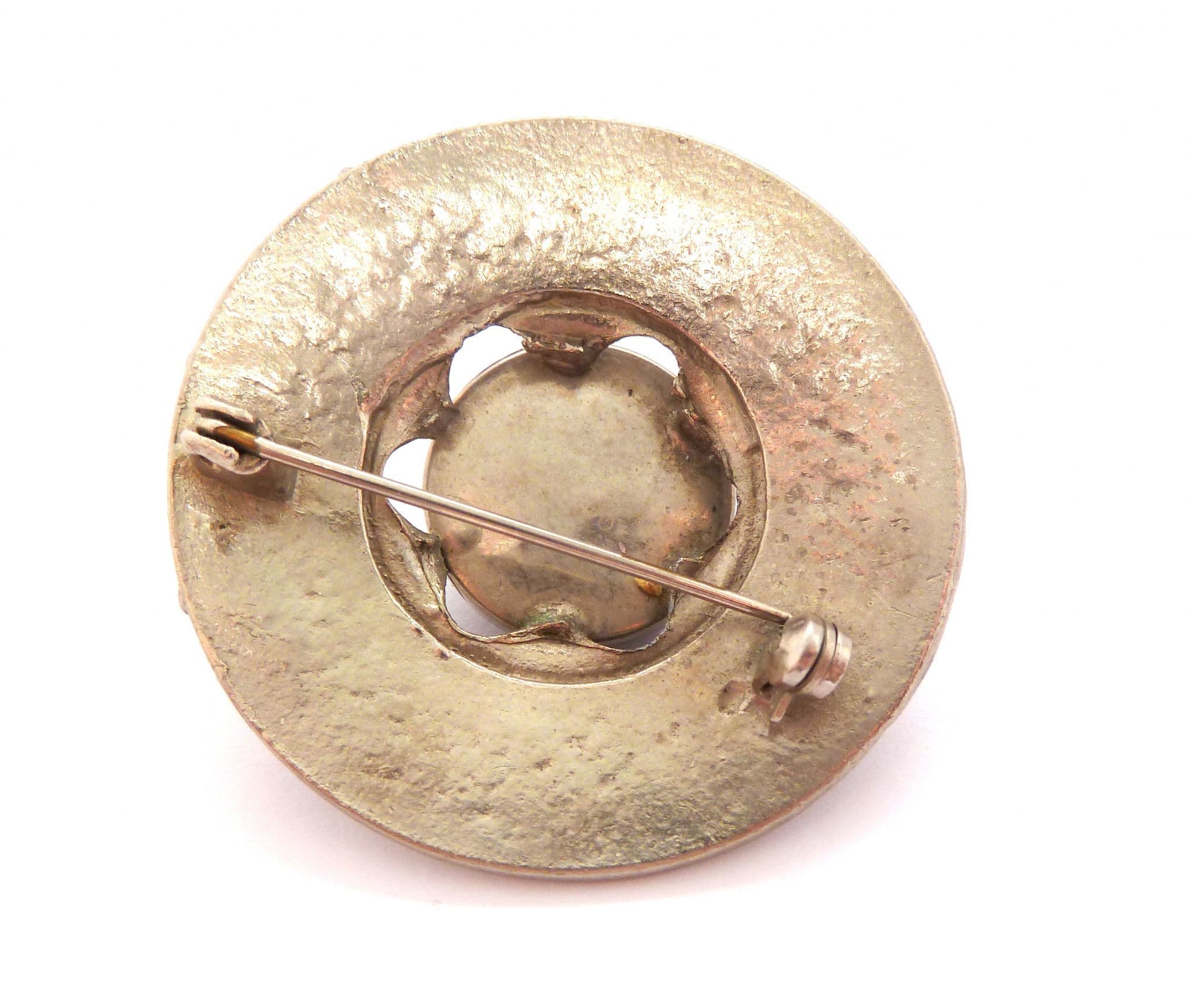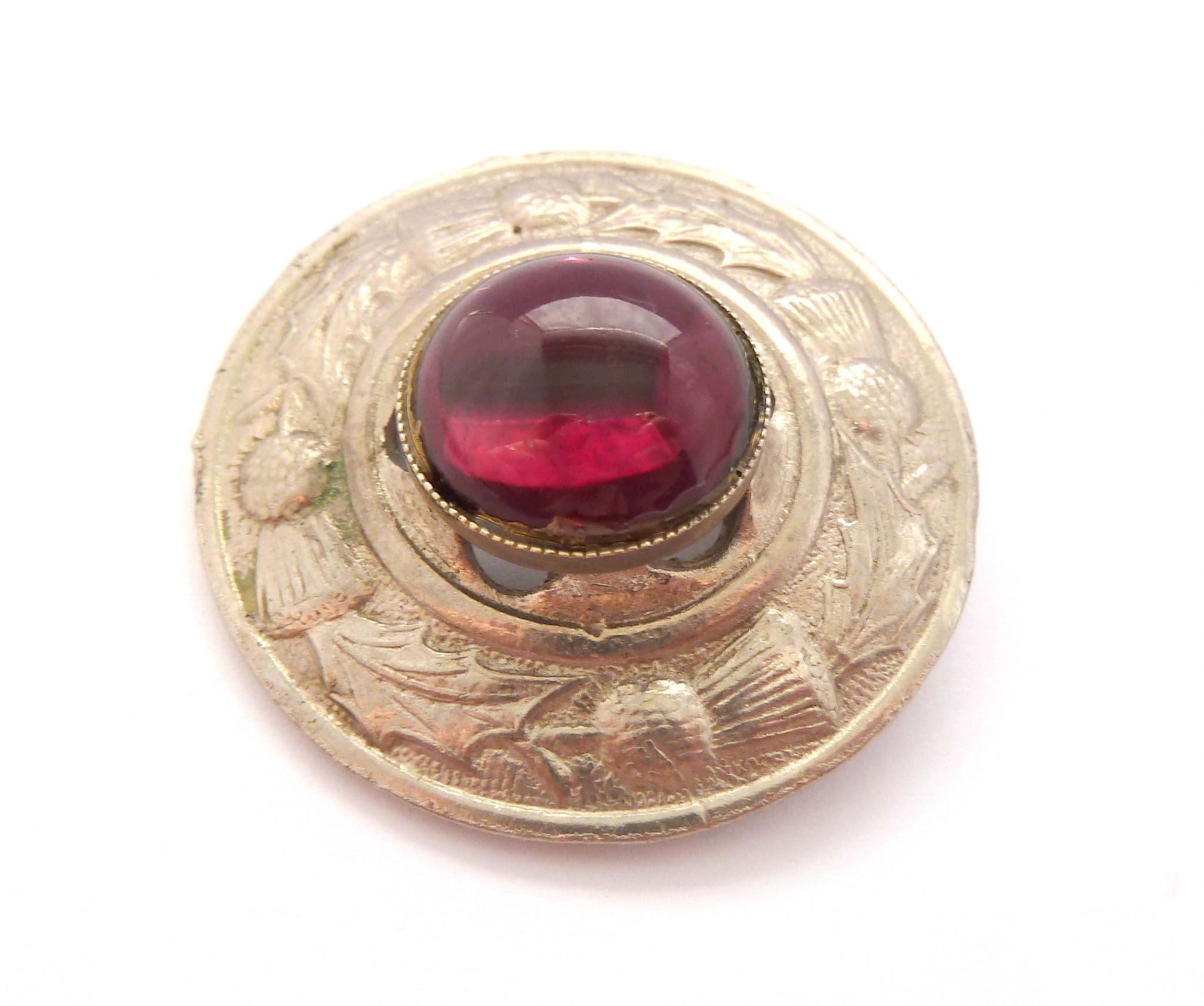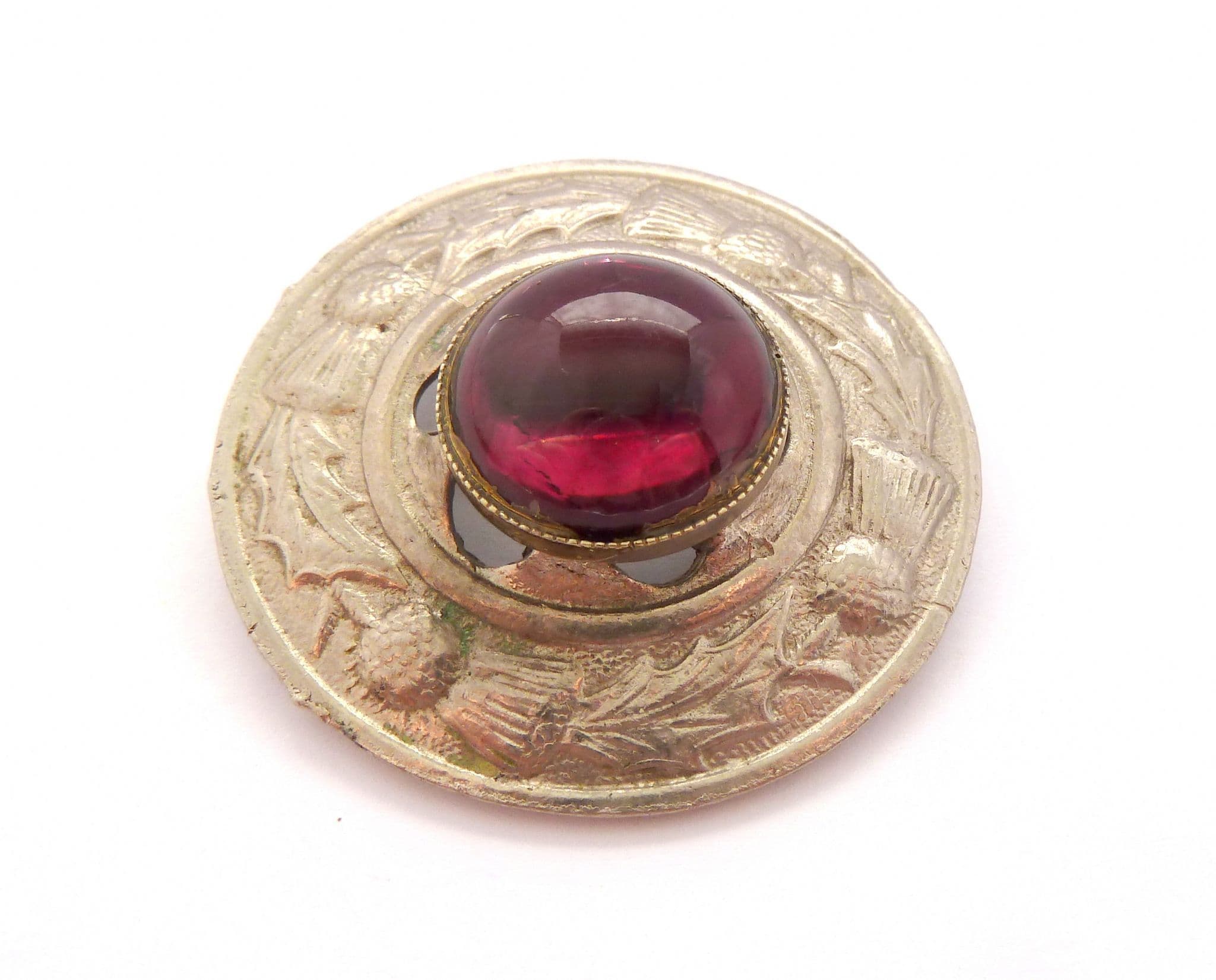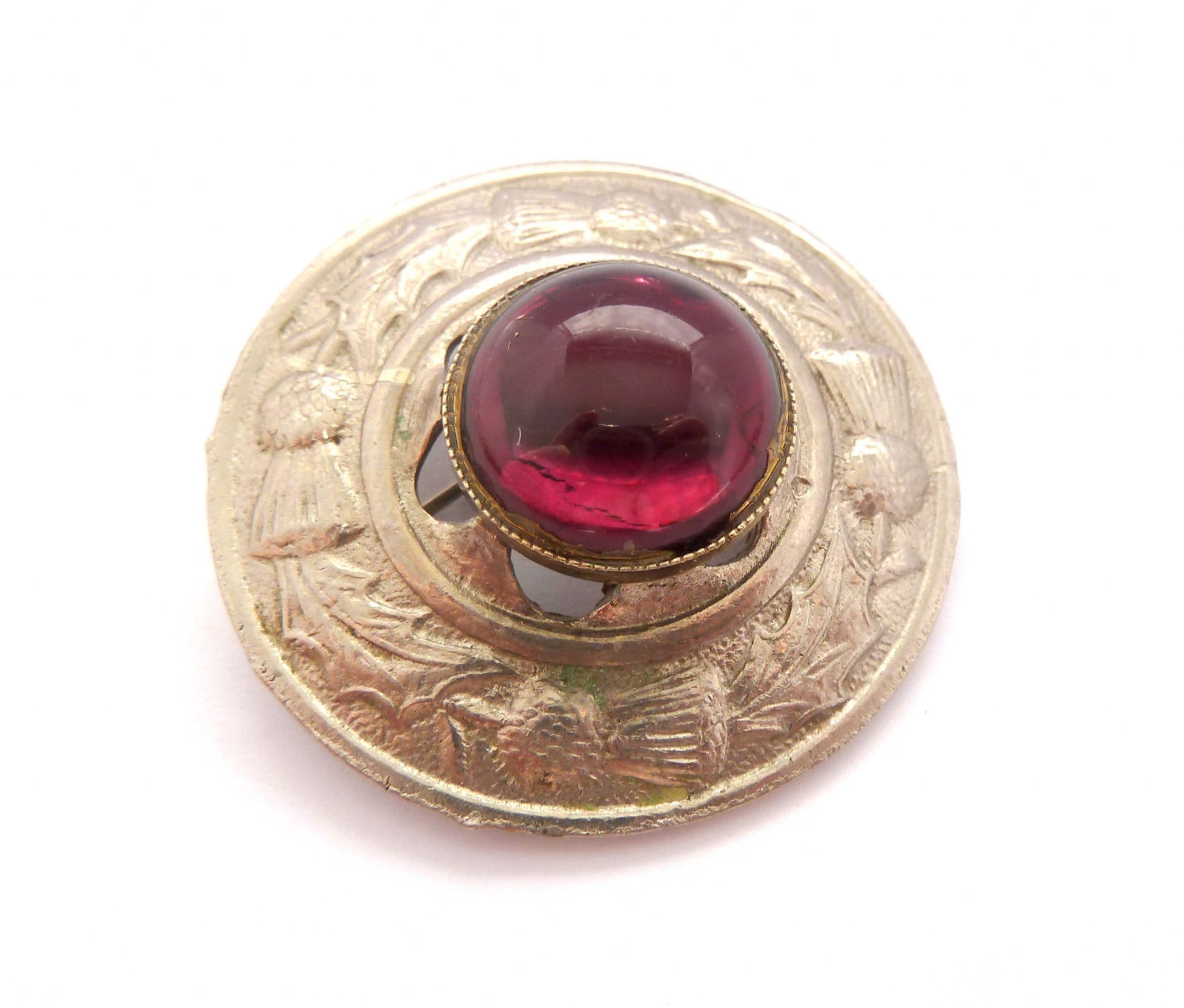 A vintage Celtic Scottish design brooch set with faux amethyst glass cabochon, The brooch is formed from silver tone metal in a Celtic Scottish shield design with thistle flower detailing design set with a faux amethyst glass cabochon. Circa 1960's - 70's.