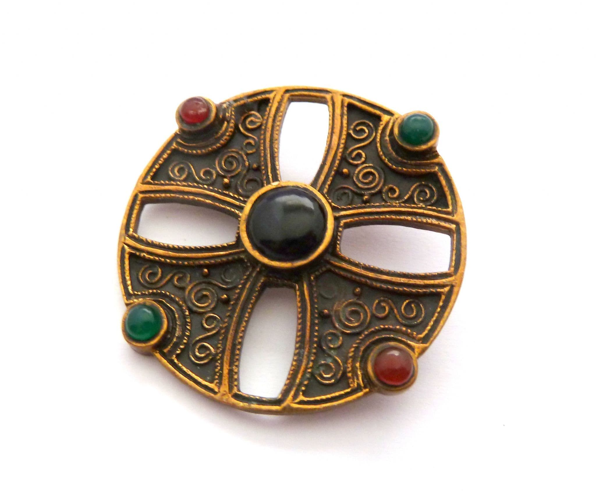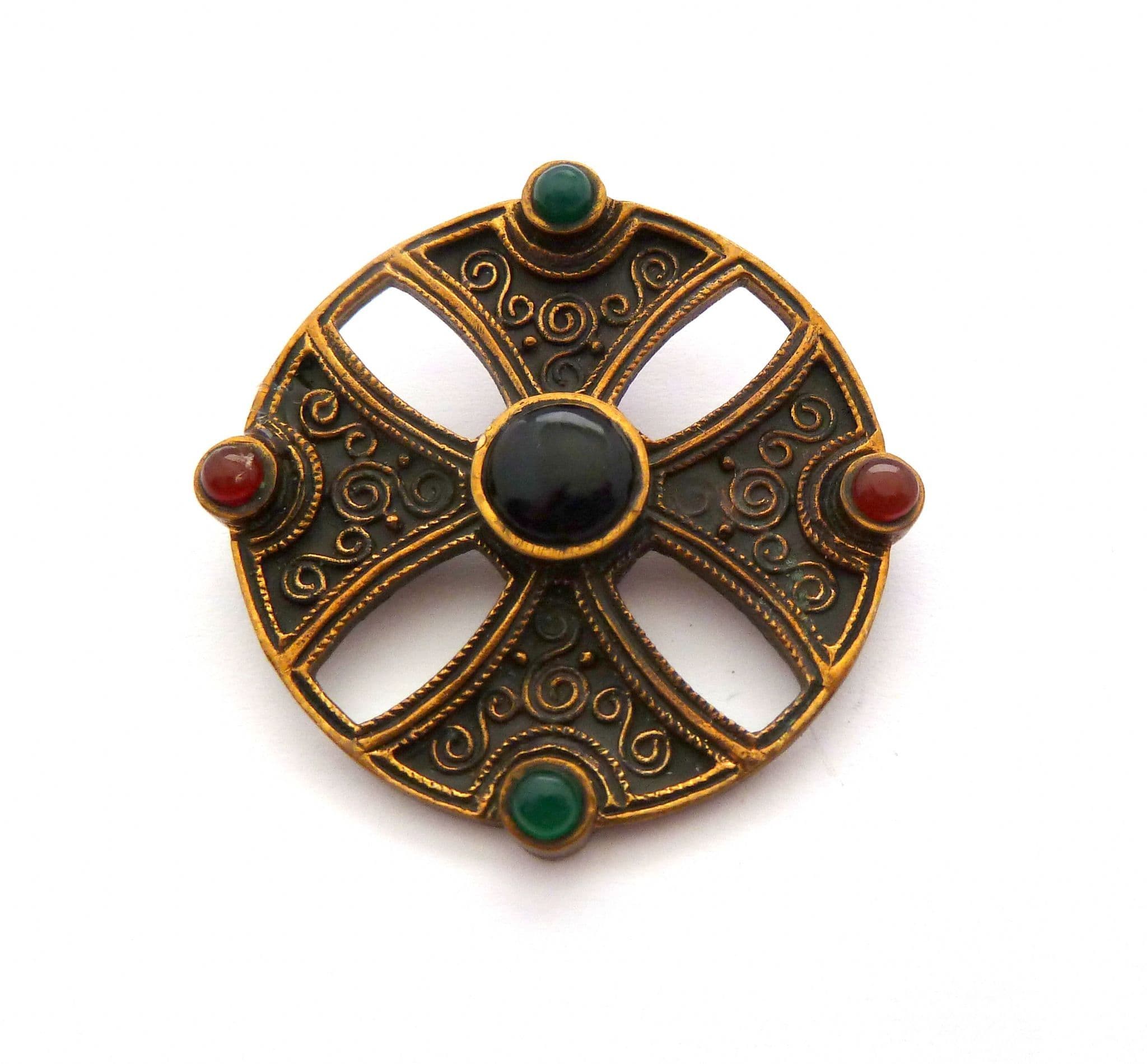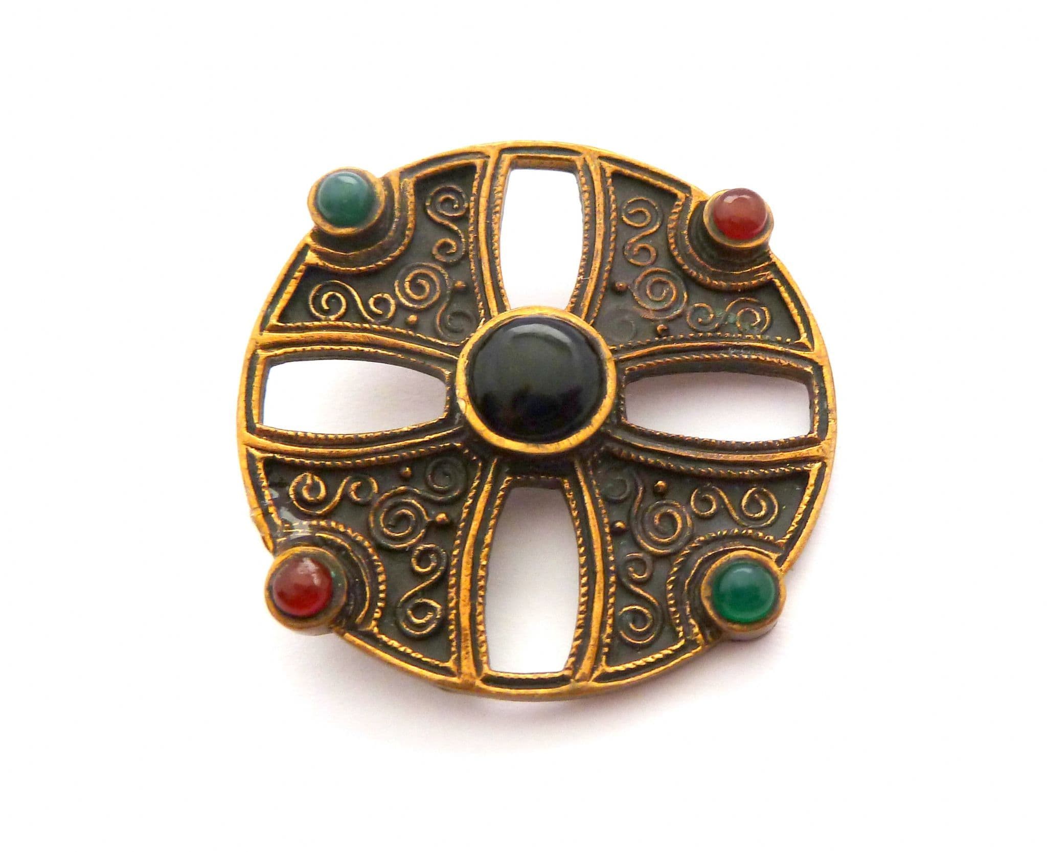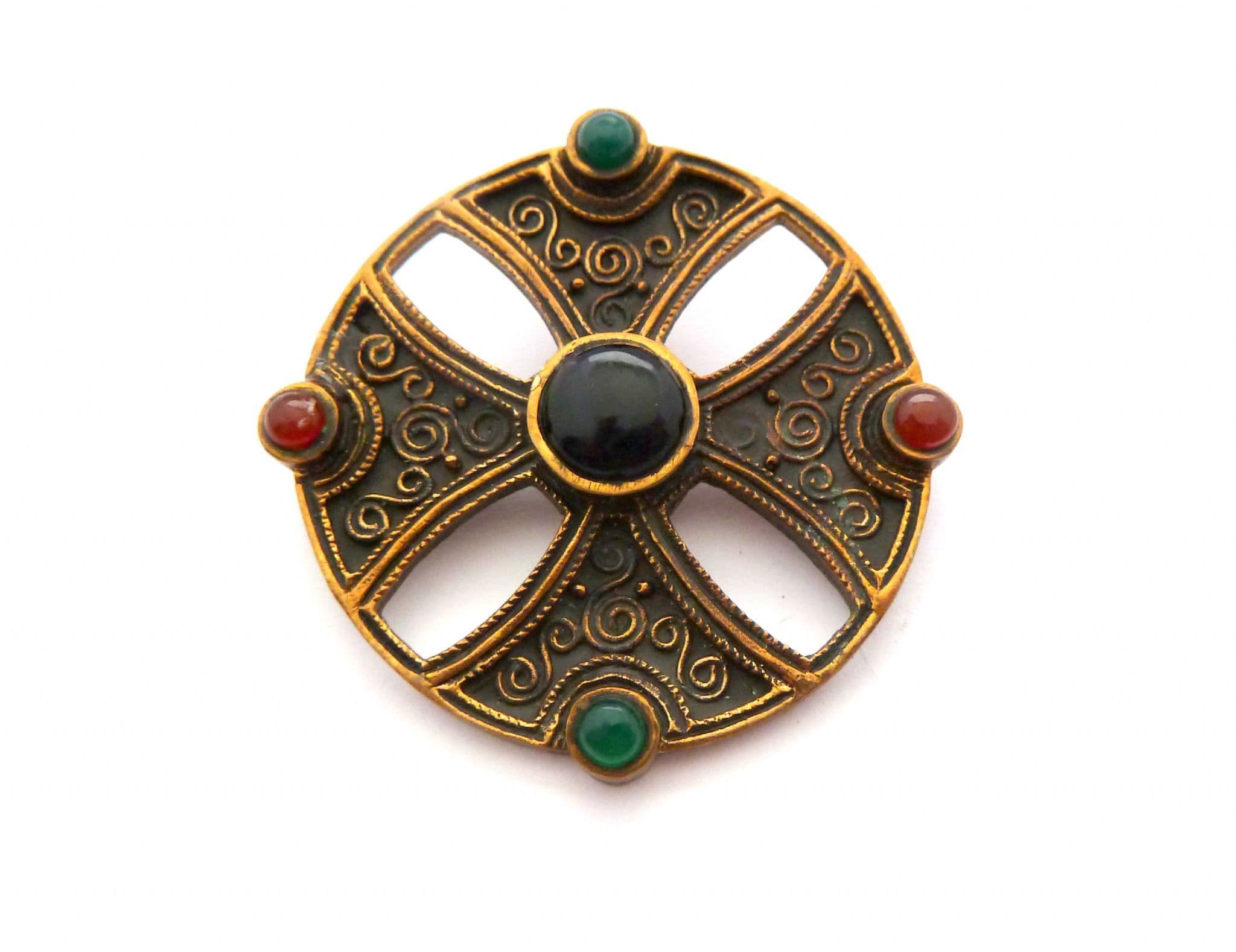 A vintage Celtic Scottish cross design brooch set with faux gemstones. The brooch is formed from gold tone metal in a cross design set with faux gemstones, with spiral detailing. Circa 1980's.