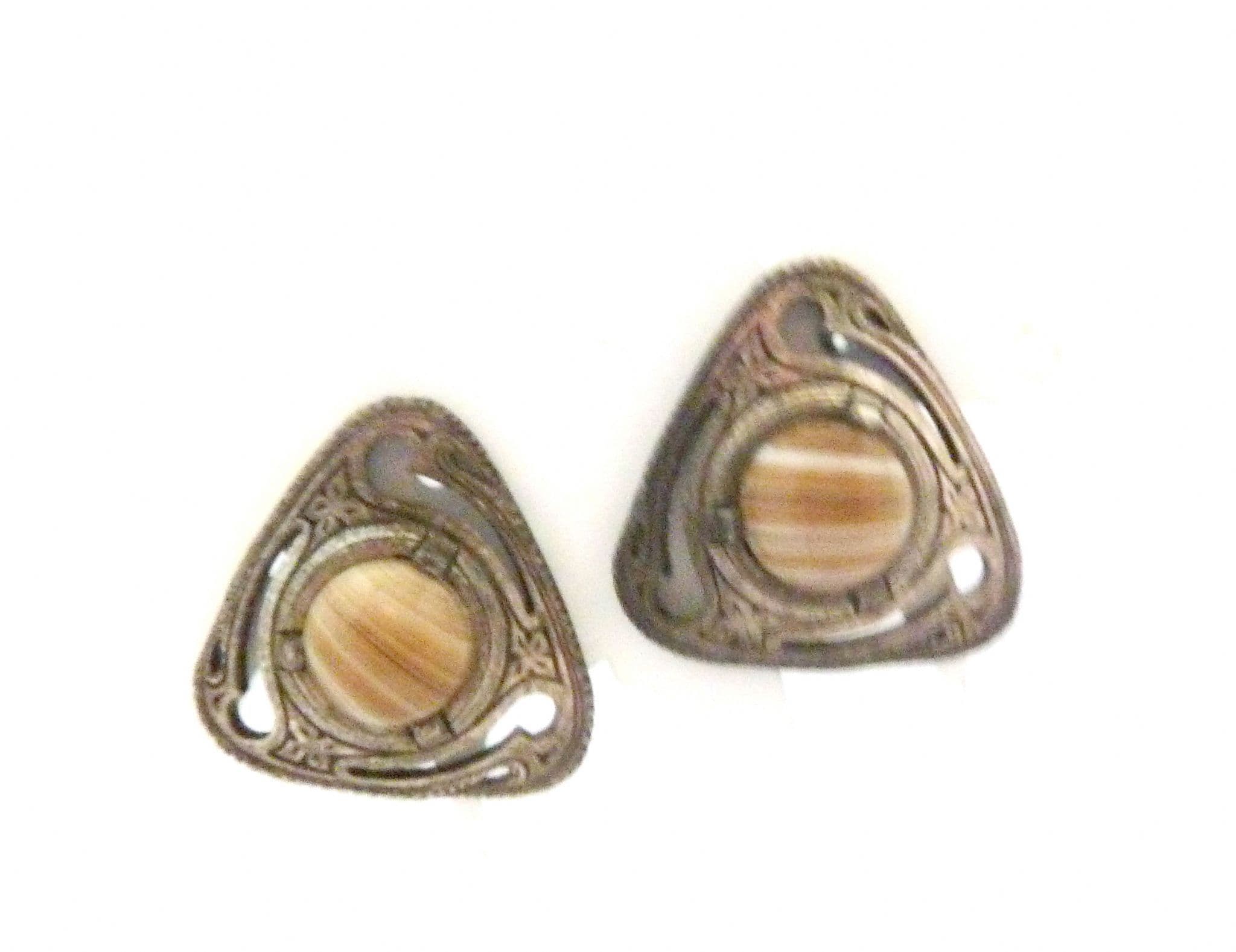 Vintage Scottish Celtic style faux agate glass cabochon set clip on earrings by Miracle. The earrings are formed from silver tone metal in a triangular shaped design in an open work Celtic design set with faux agate marbled glass cabochons. Circa 1980's