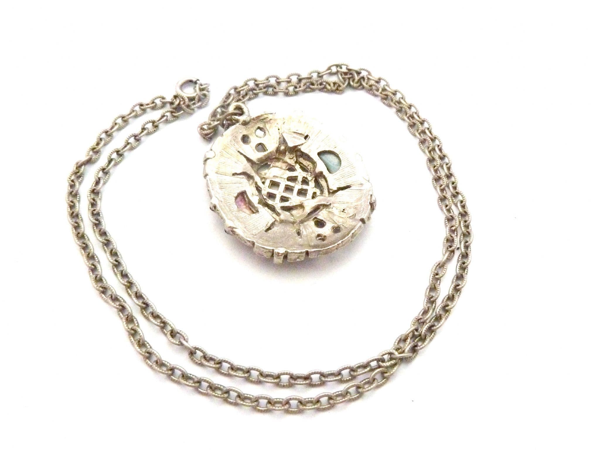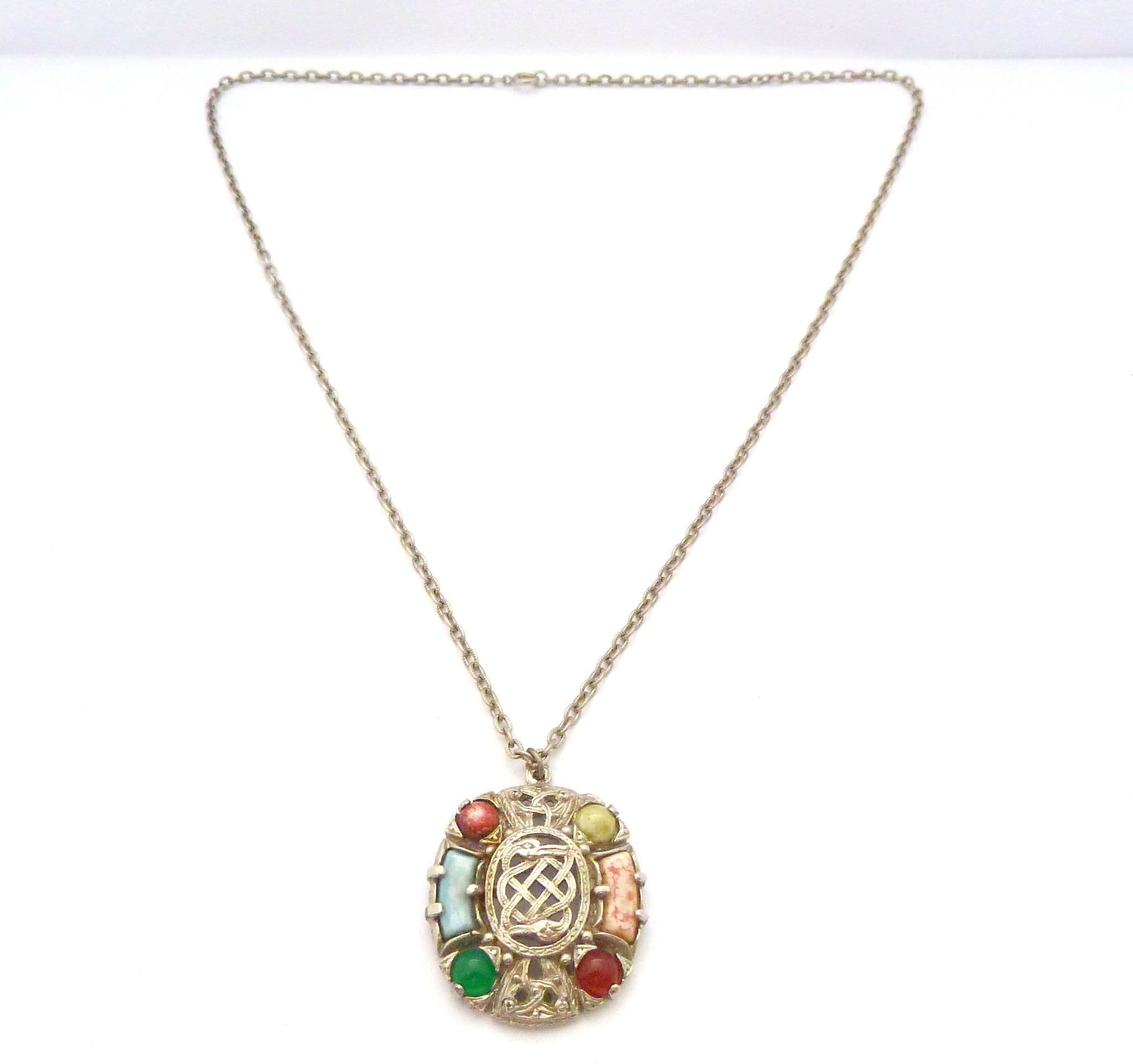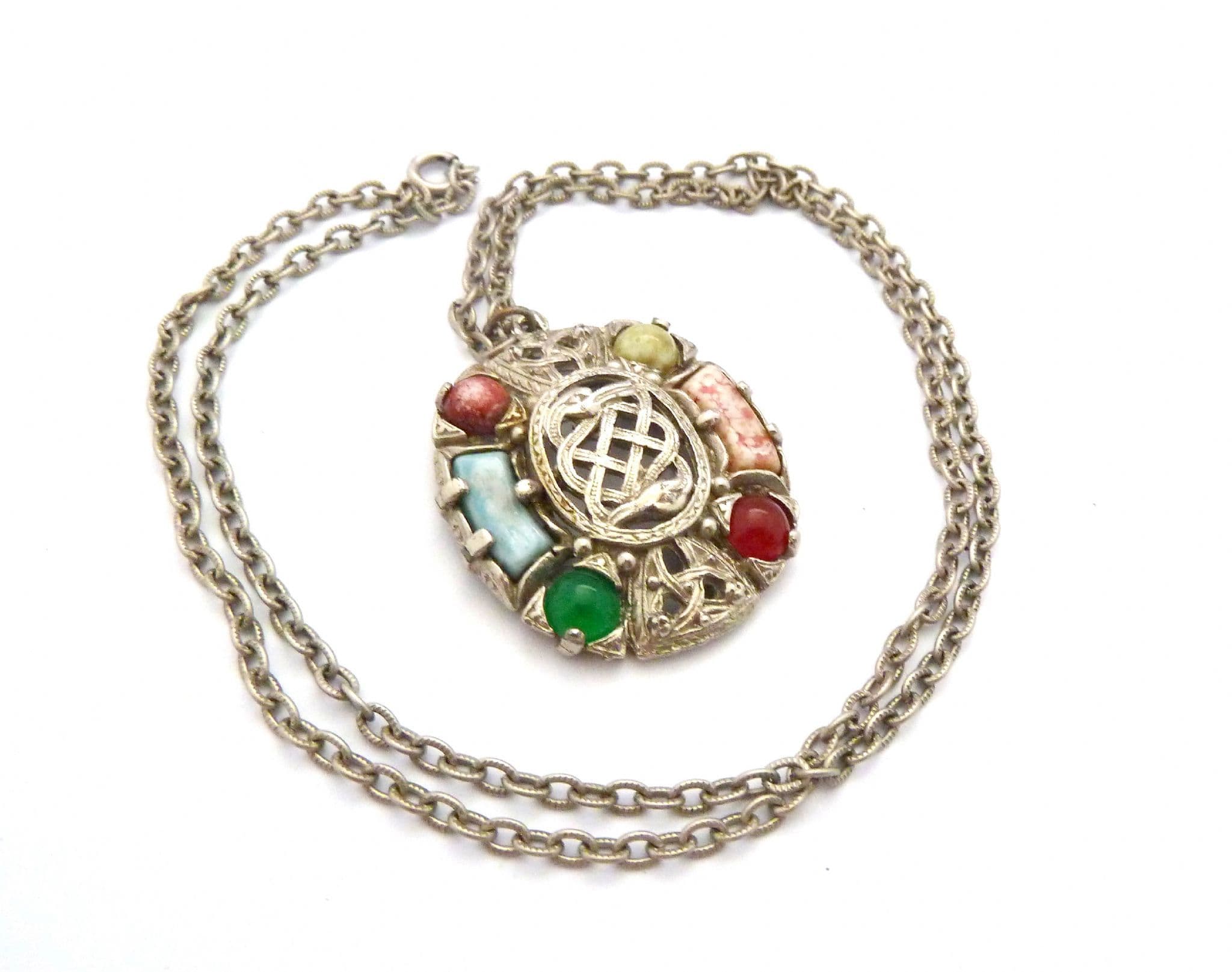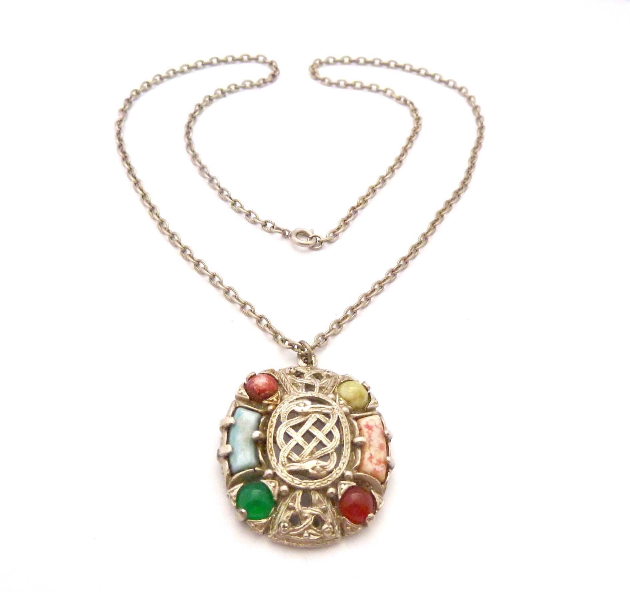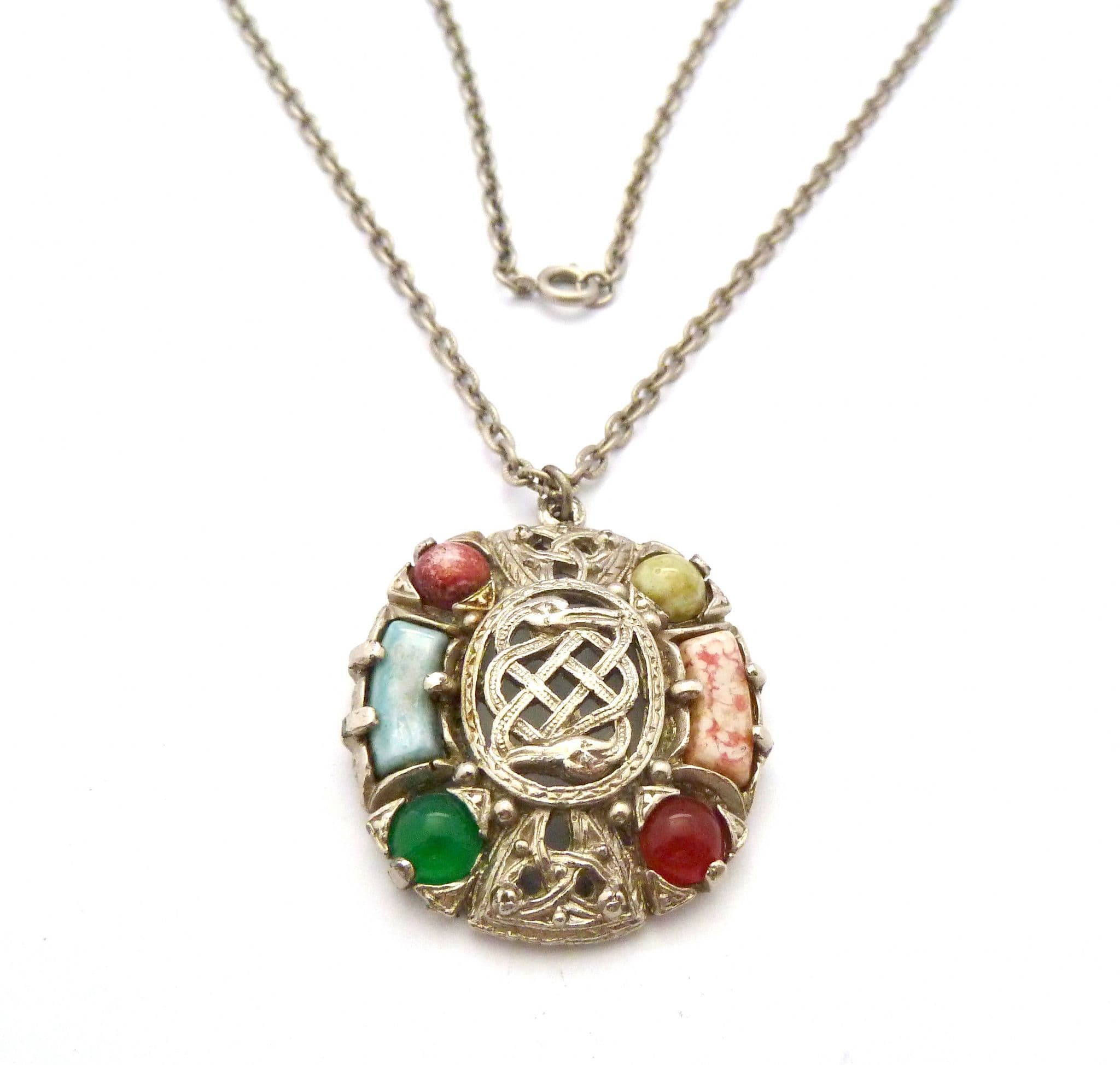 Vintage Celtic zoomorphic abstract bird design faux gem detailed pendant set on a long necklace chain. The pendant is formed from silver tone metal with a central abstract Celtic zoomorphic bird design with faux gem glass cabochons . The pendant is set on a long silver tone chain, with a spring ring clasp. Circa 1970's - 1980's.