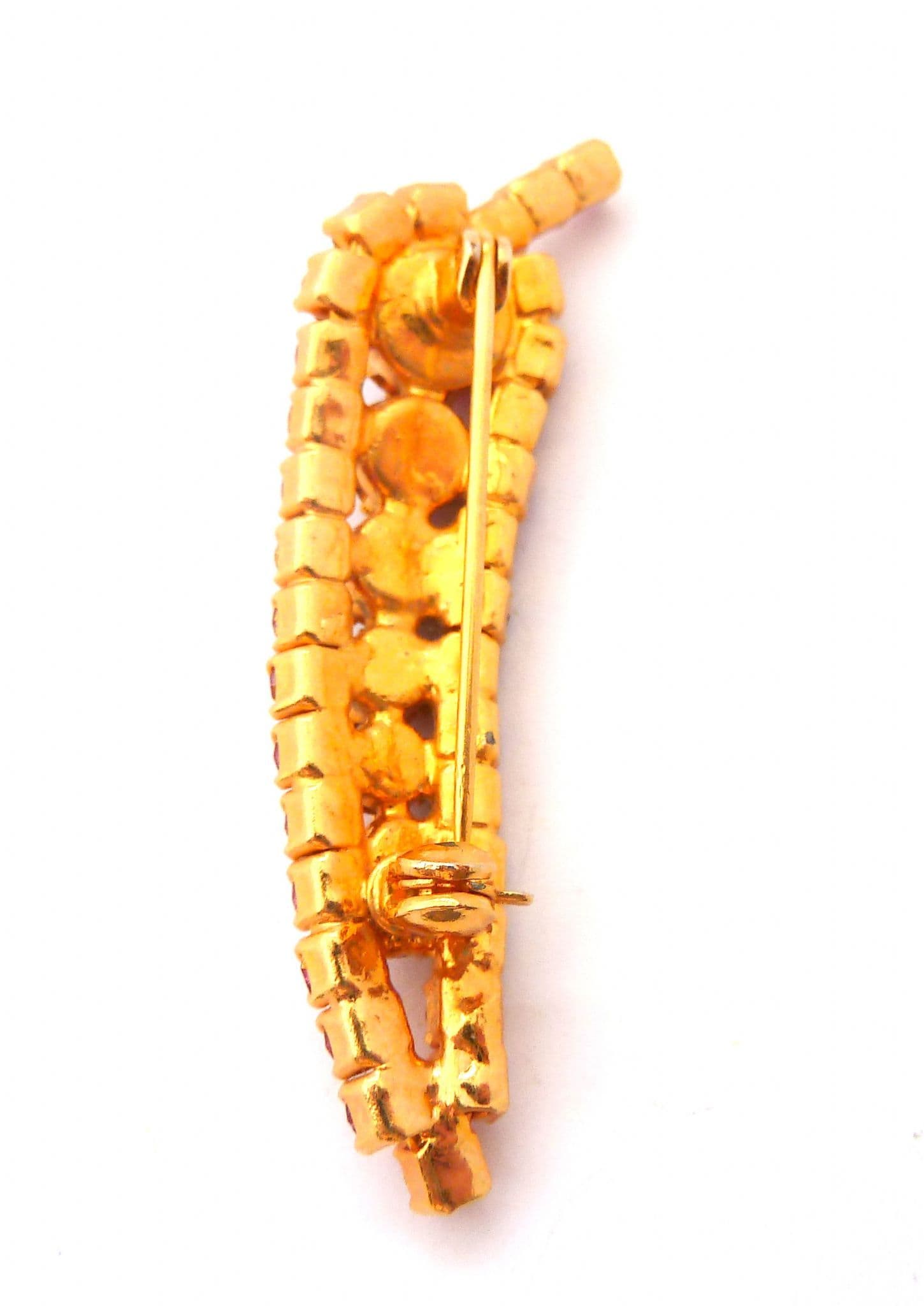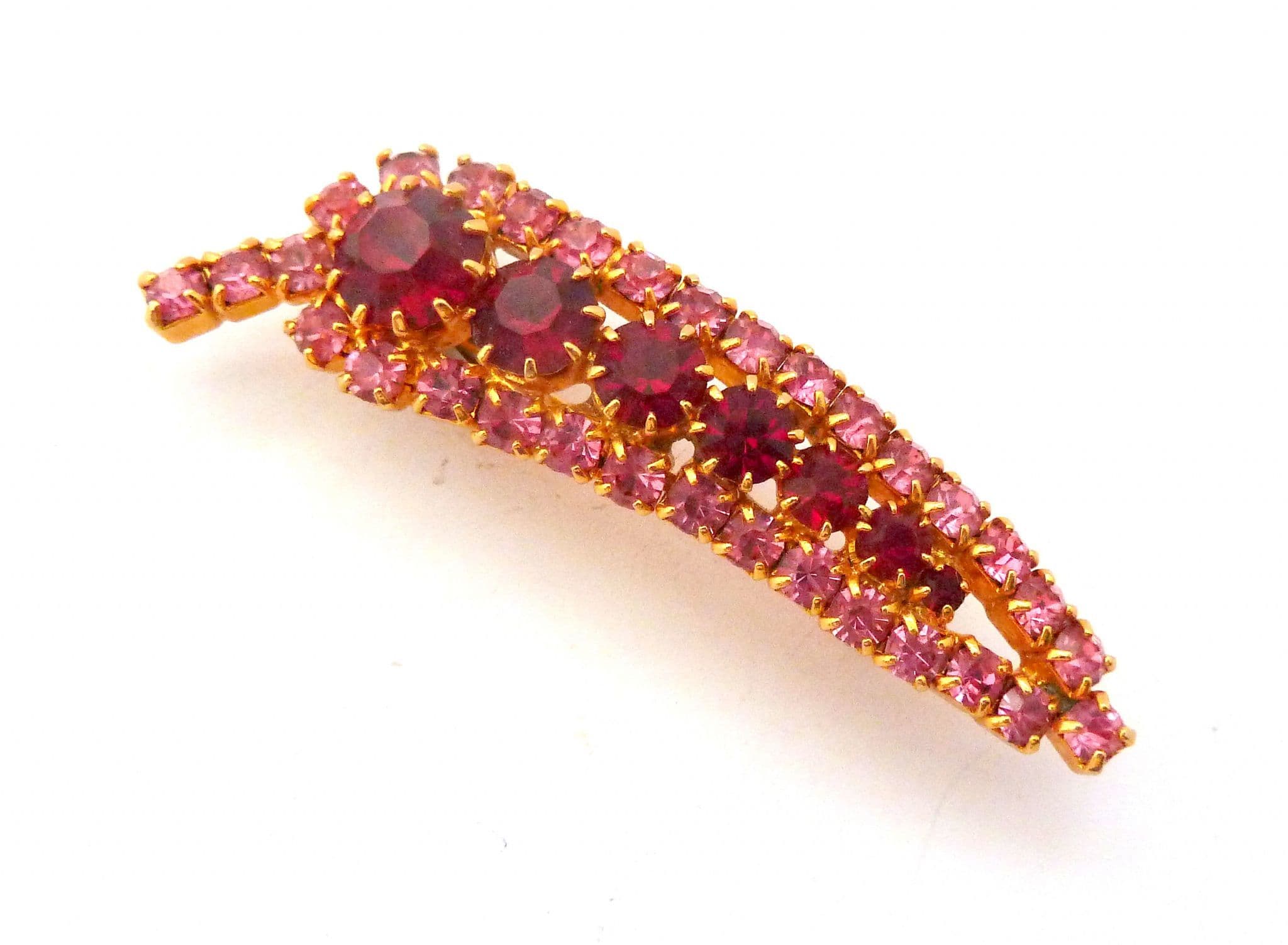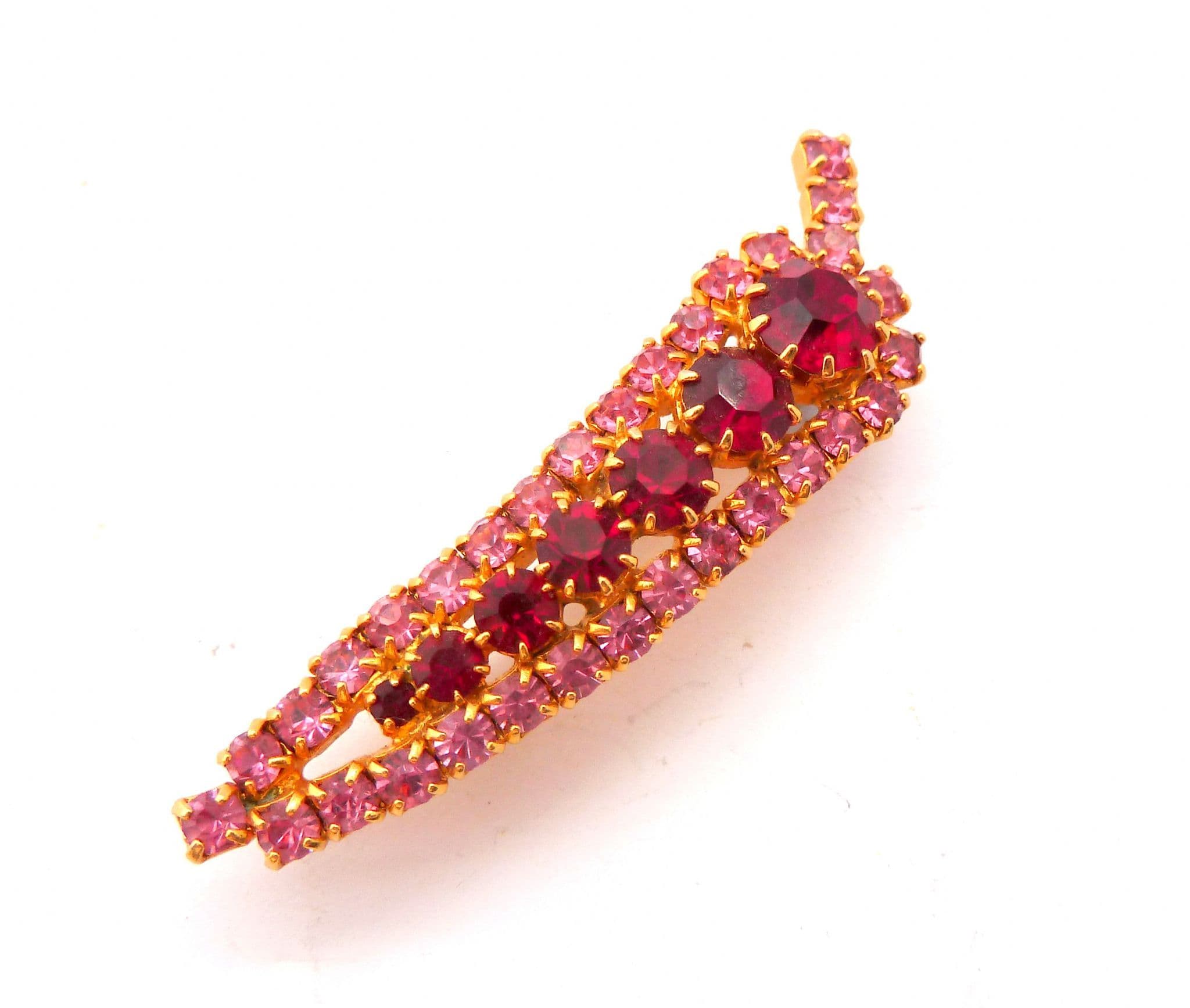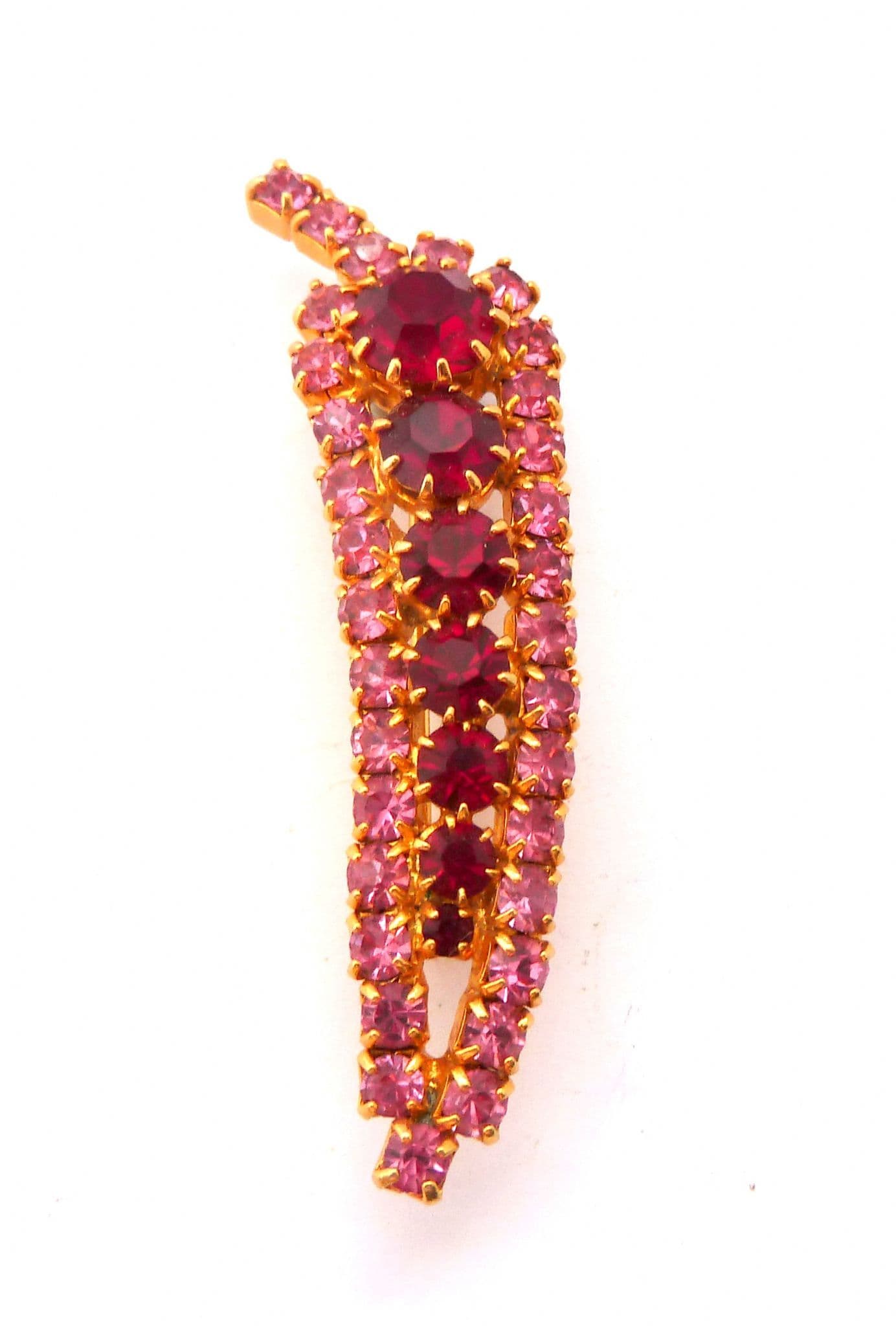 Vintage garnet red and pink coloured rhinestone set chilli pepper design brooch. The brooch is formed from gold tone metal in the shape of a chilli pepper set with pink and garnet red coloured glass rhinestones. Secure roll over safety clasp, Circa 1950's - 60's.