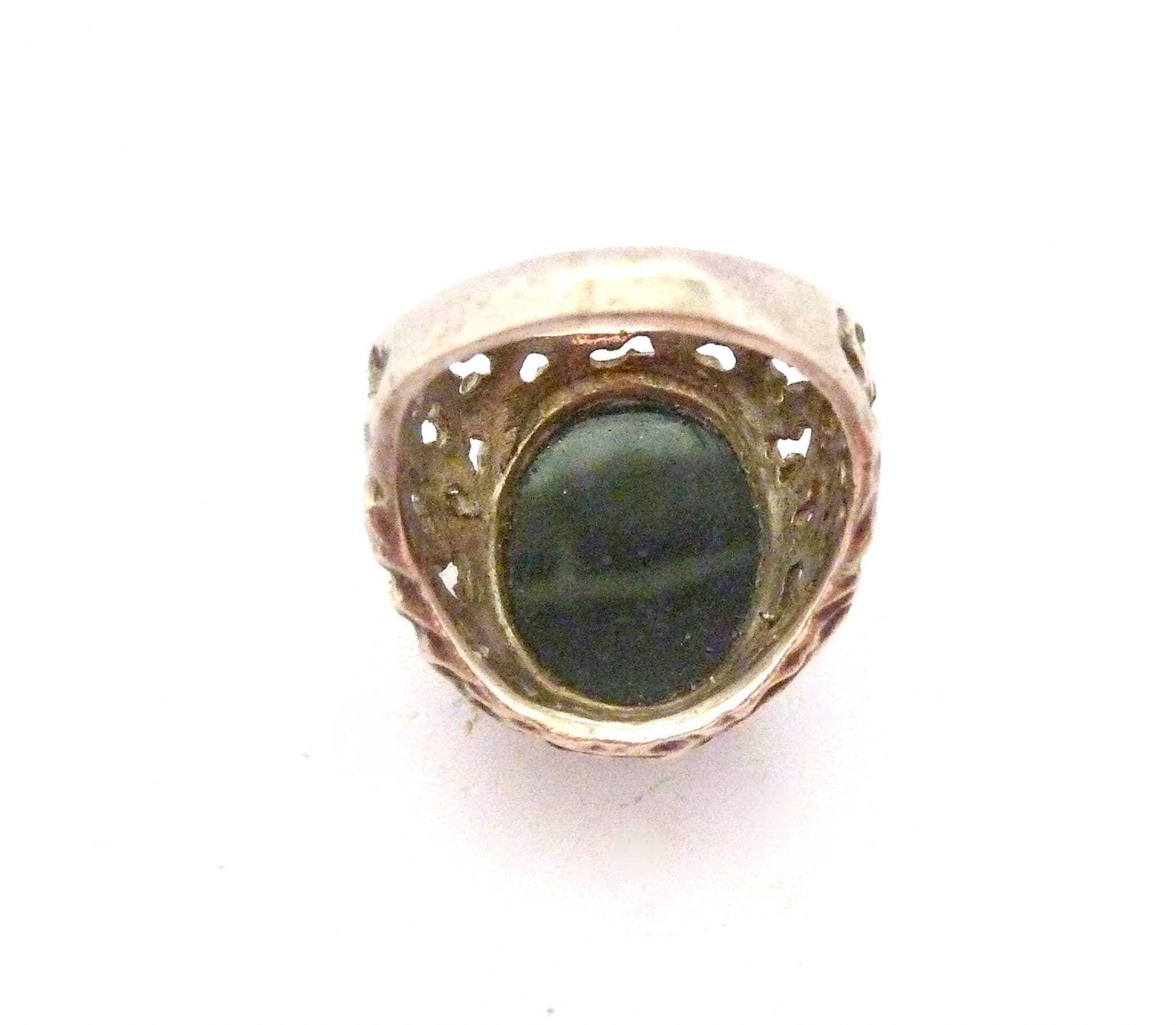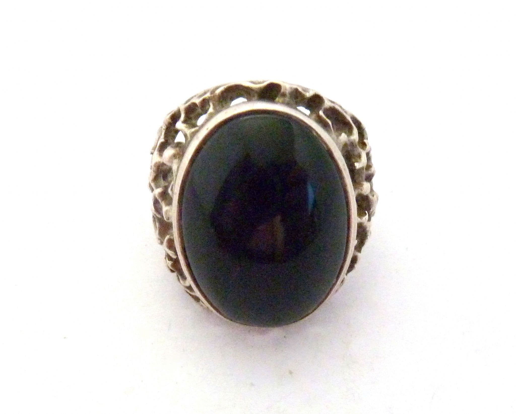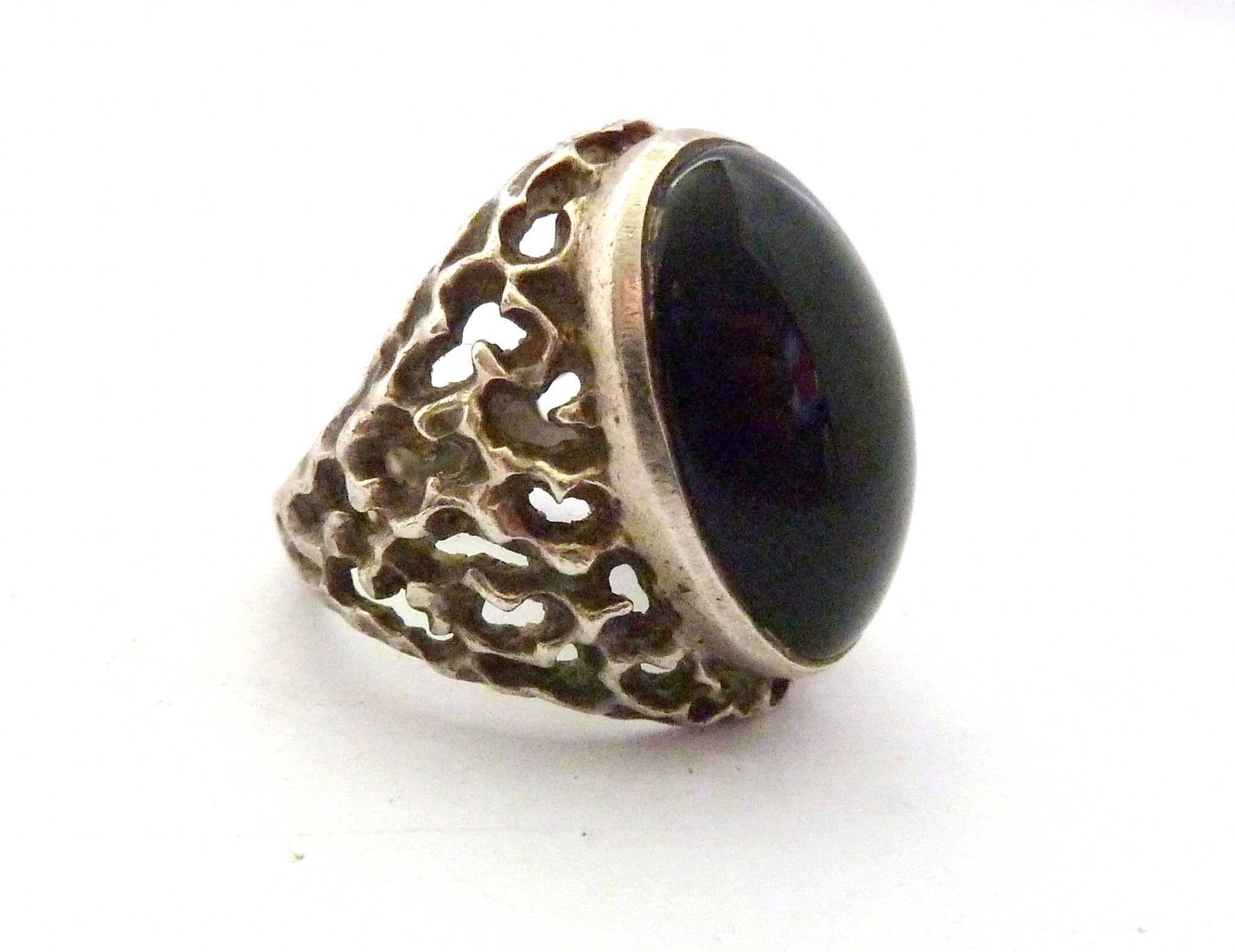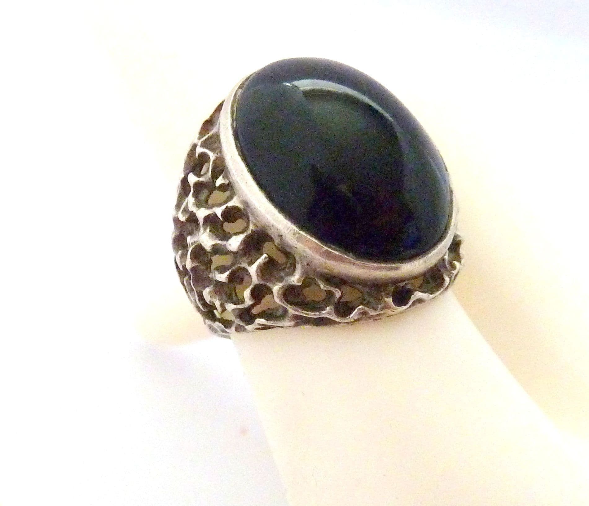A vintage chunky sterling silver and onyx gemstone cabochon set fully hallmarked ring The ring is fully hallmarked to the inside of the band . Formed from sterling silver set with an onyx gemstone cabochon in a chunky brutalist style design. It is suitable for a UK size O, US size 7 1/4.