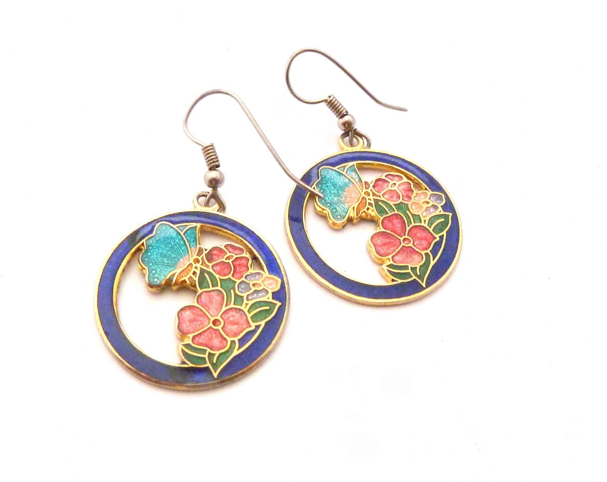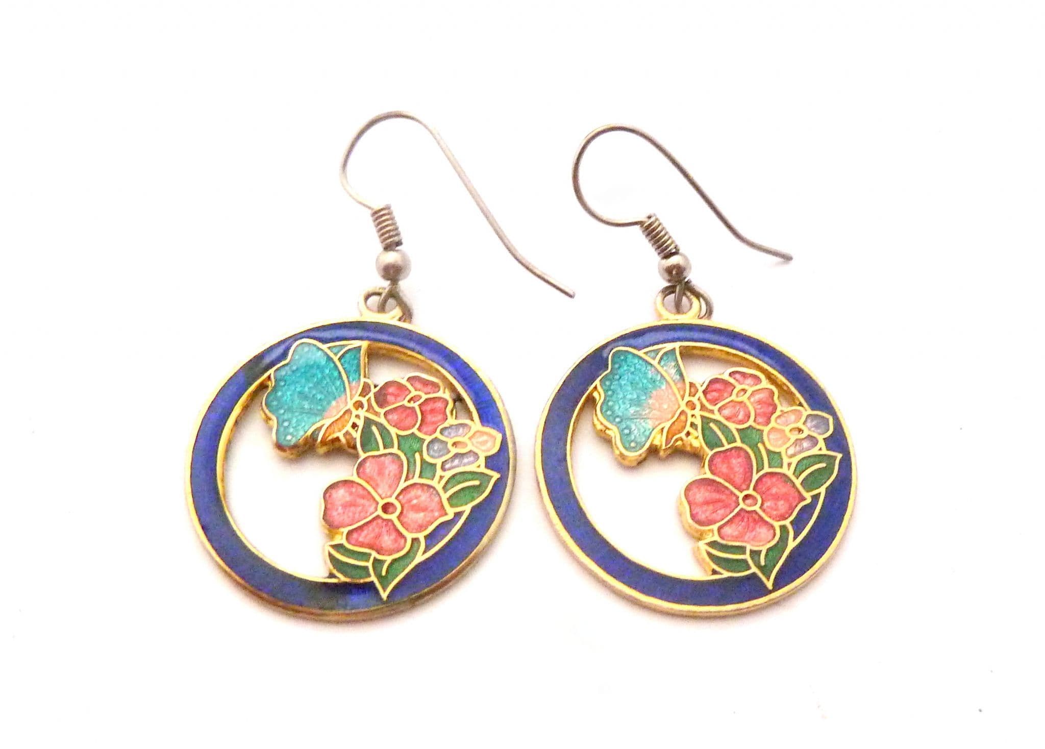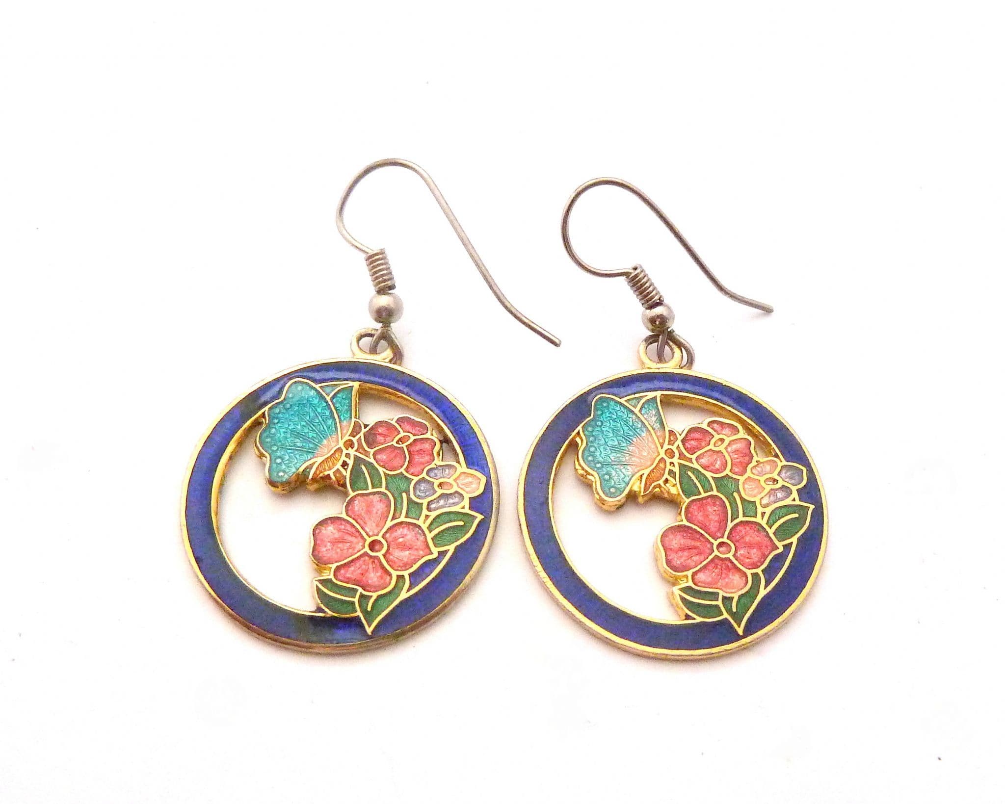 Vintage cloisonne enamel butterfly and flower drop earrings. Formed from gold tone metal an open worked circular shaped design with a butterfly visiting flowers to the centres and a cloisonne enamel finish. Circa 1980's - 90's.