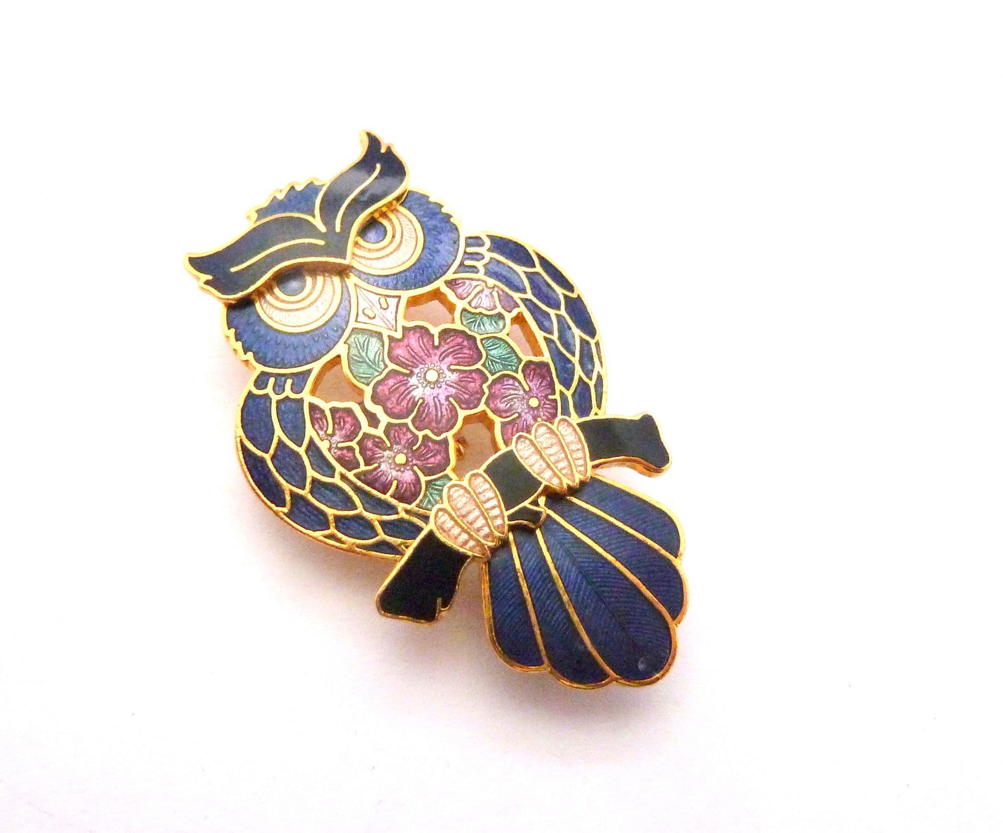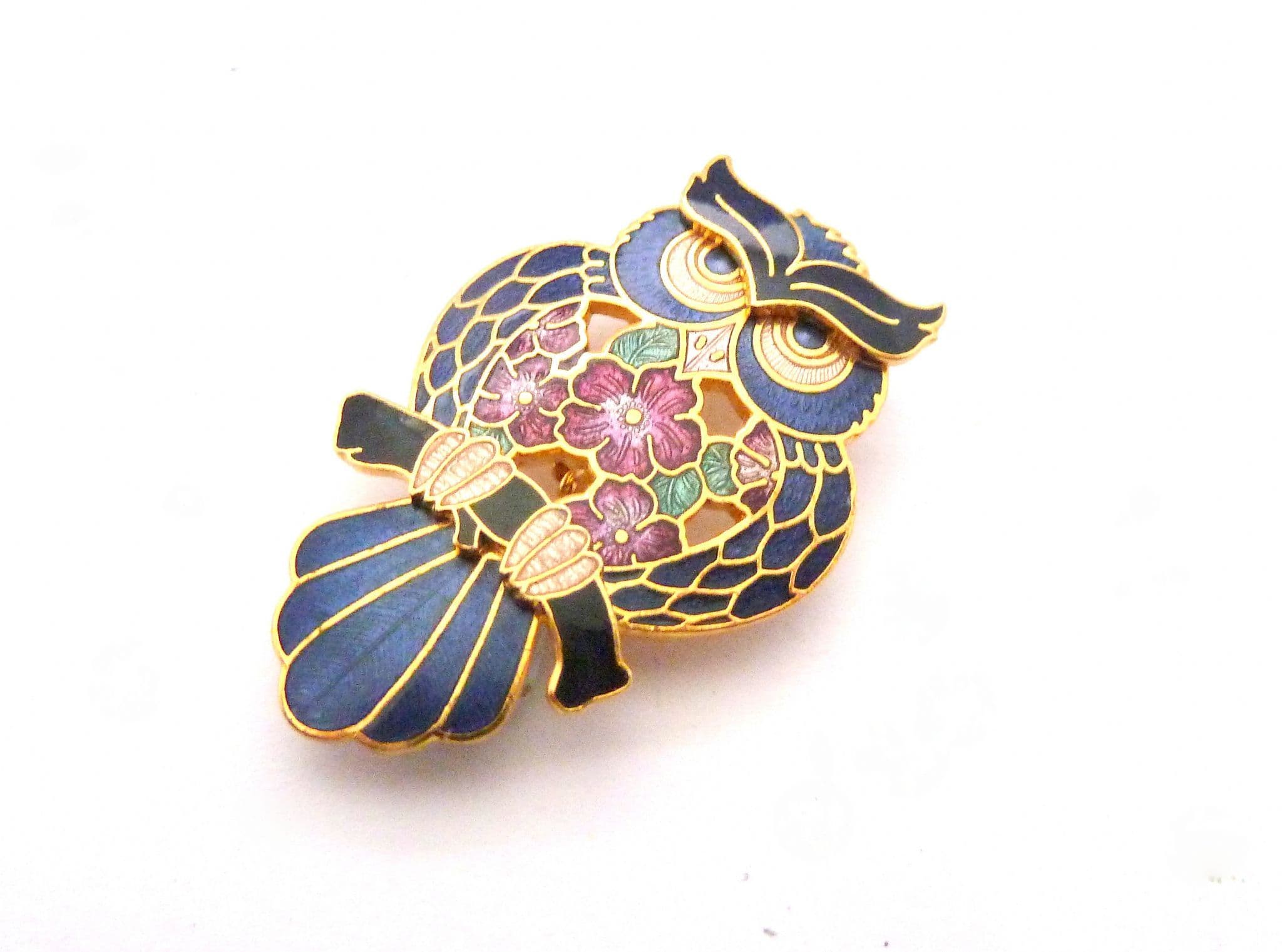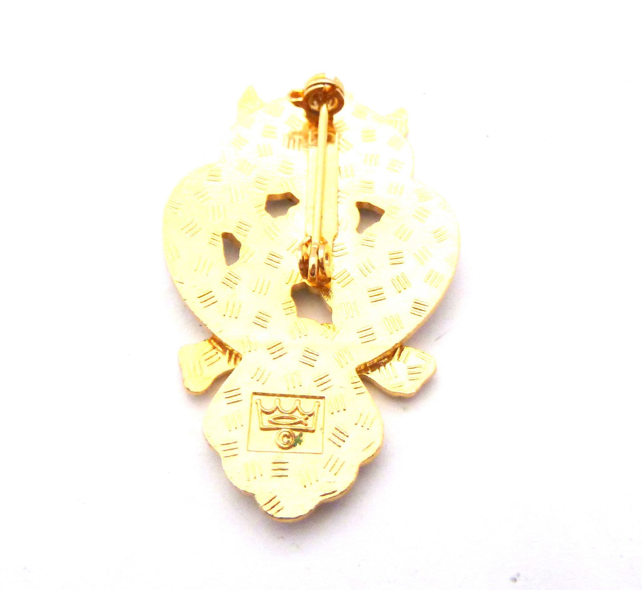 Vintage cloisonne enamel wise owl bird brooch by Fish and Crown. The brooch is formed from gold plated metal in the shape of an owl bird perching on a brooch with a cloisonne finish. The brooch has a roll over safety clasp fastening with fish crown and a copyright symbol to the back.