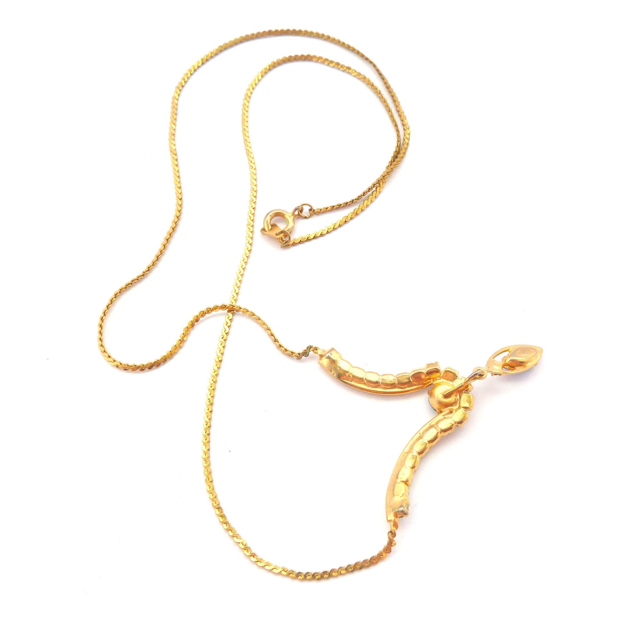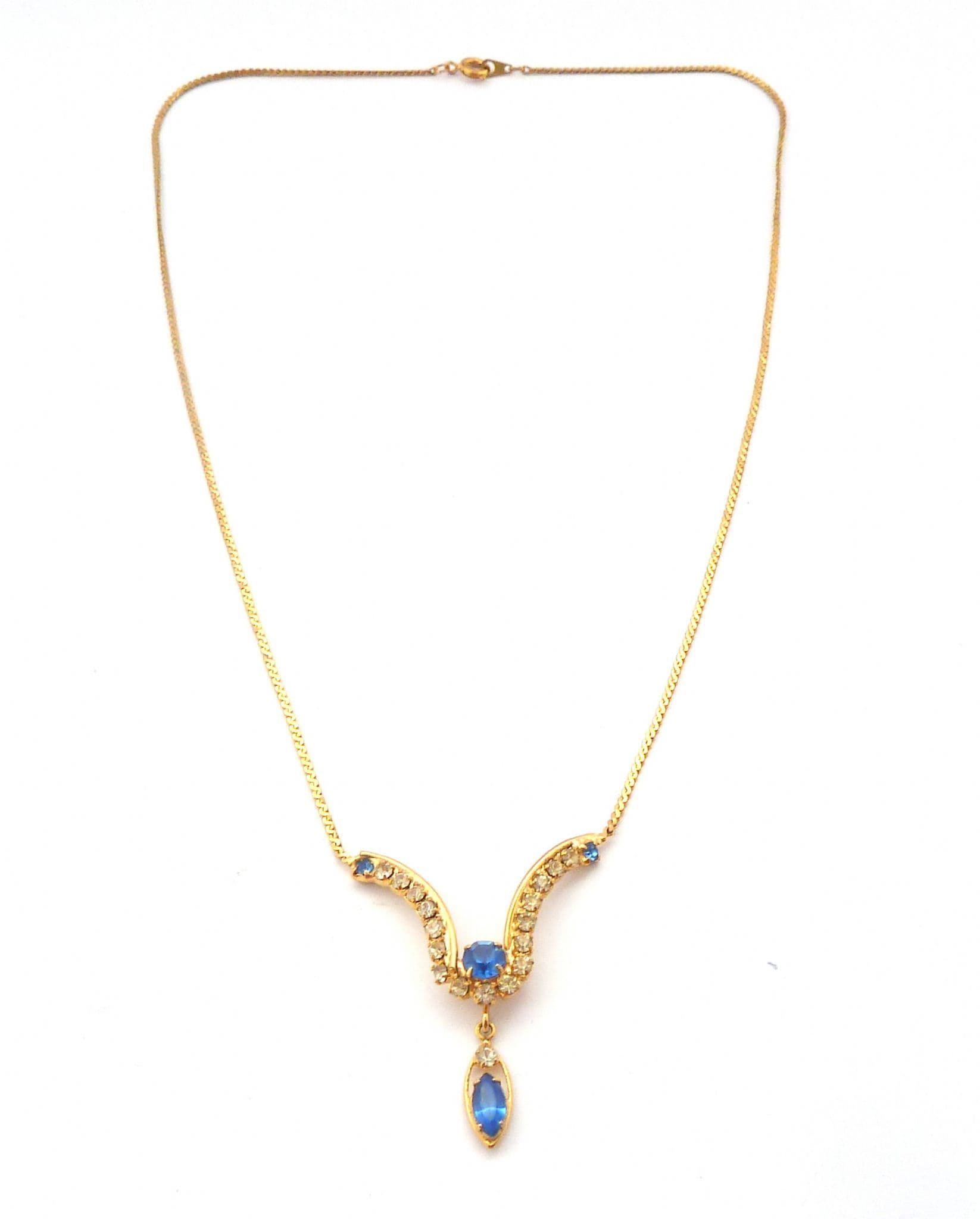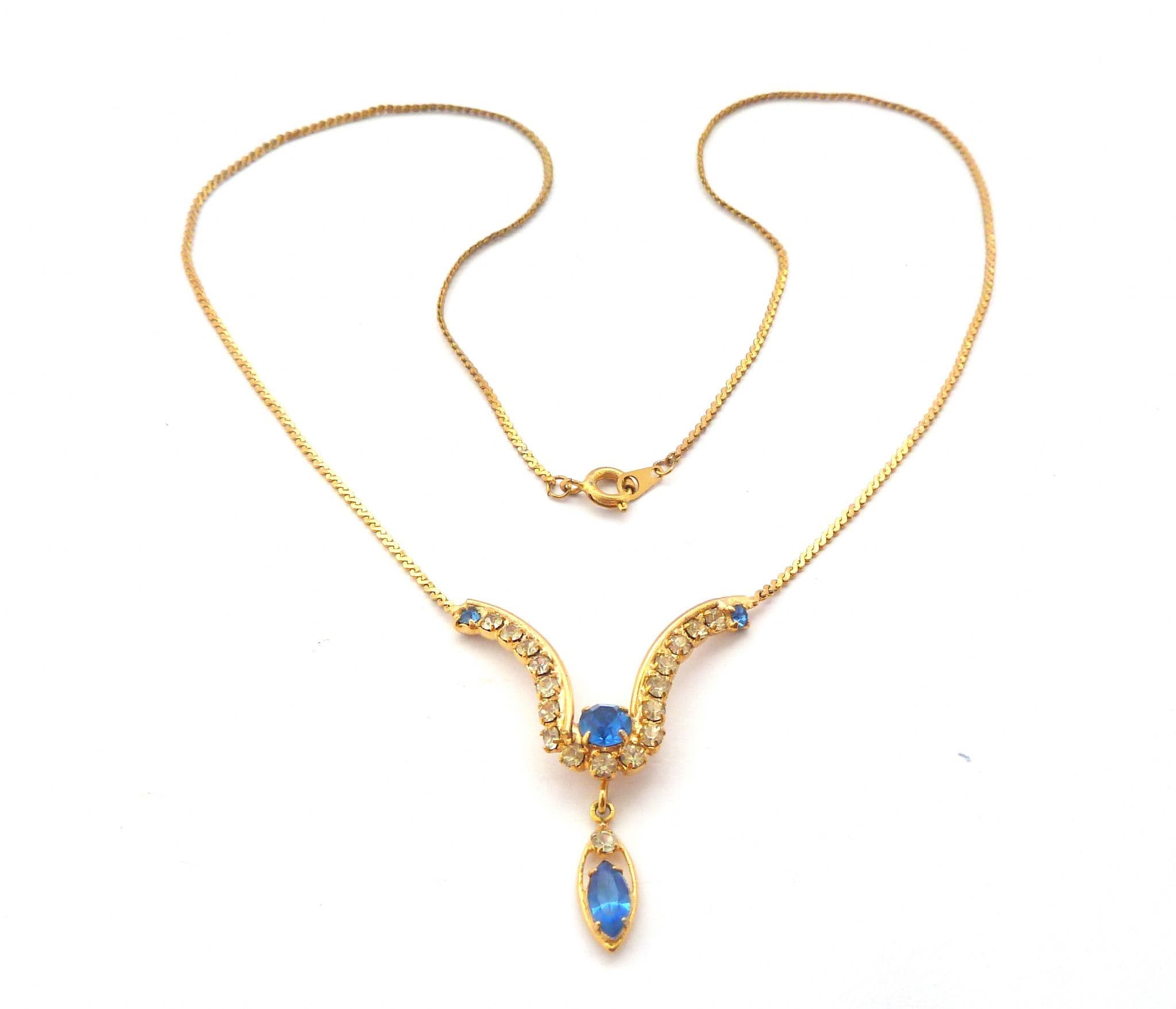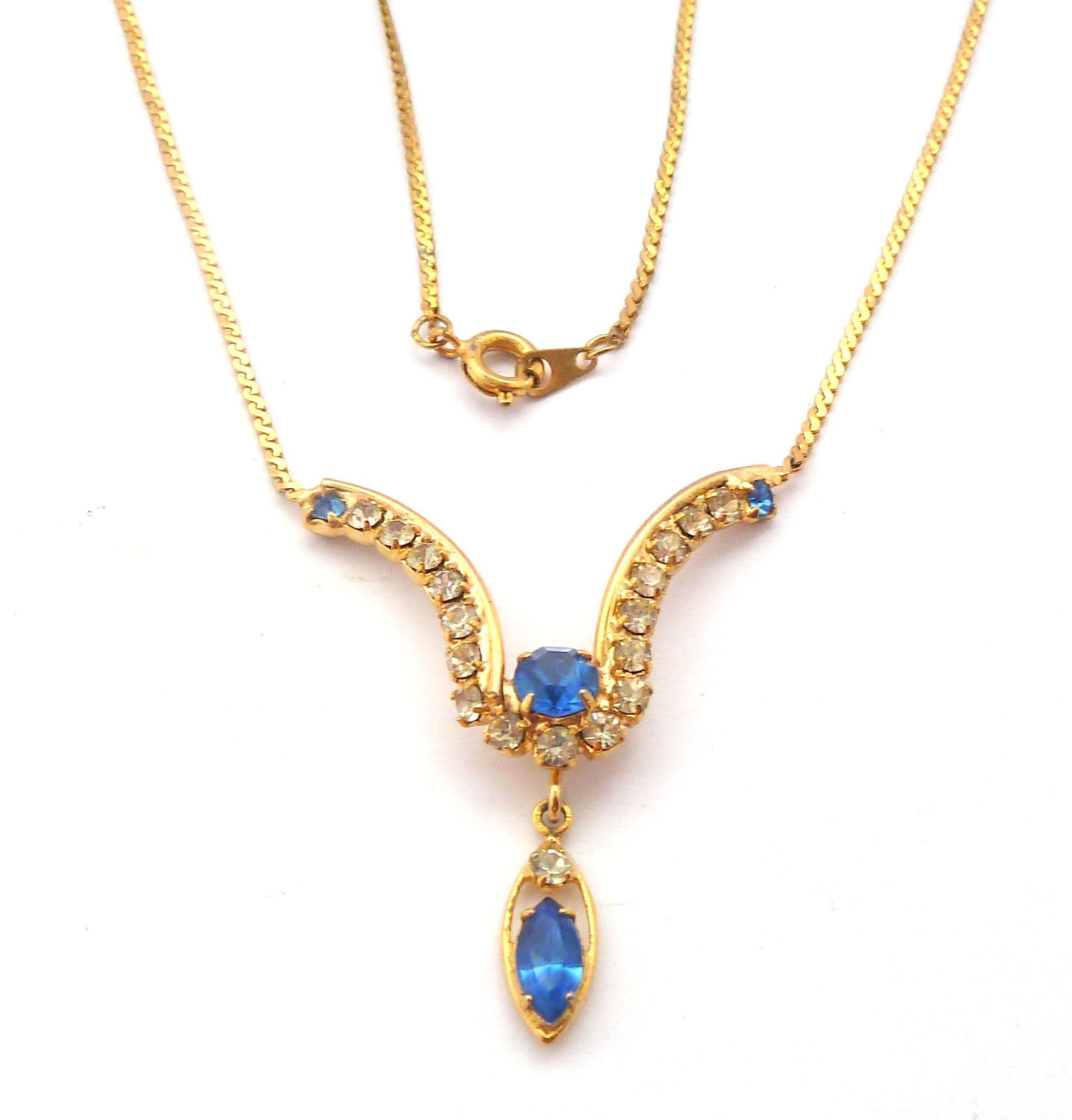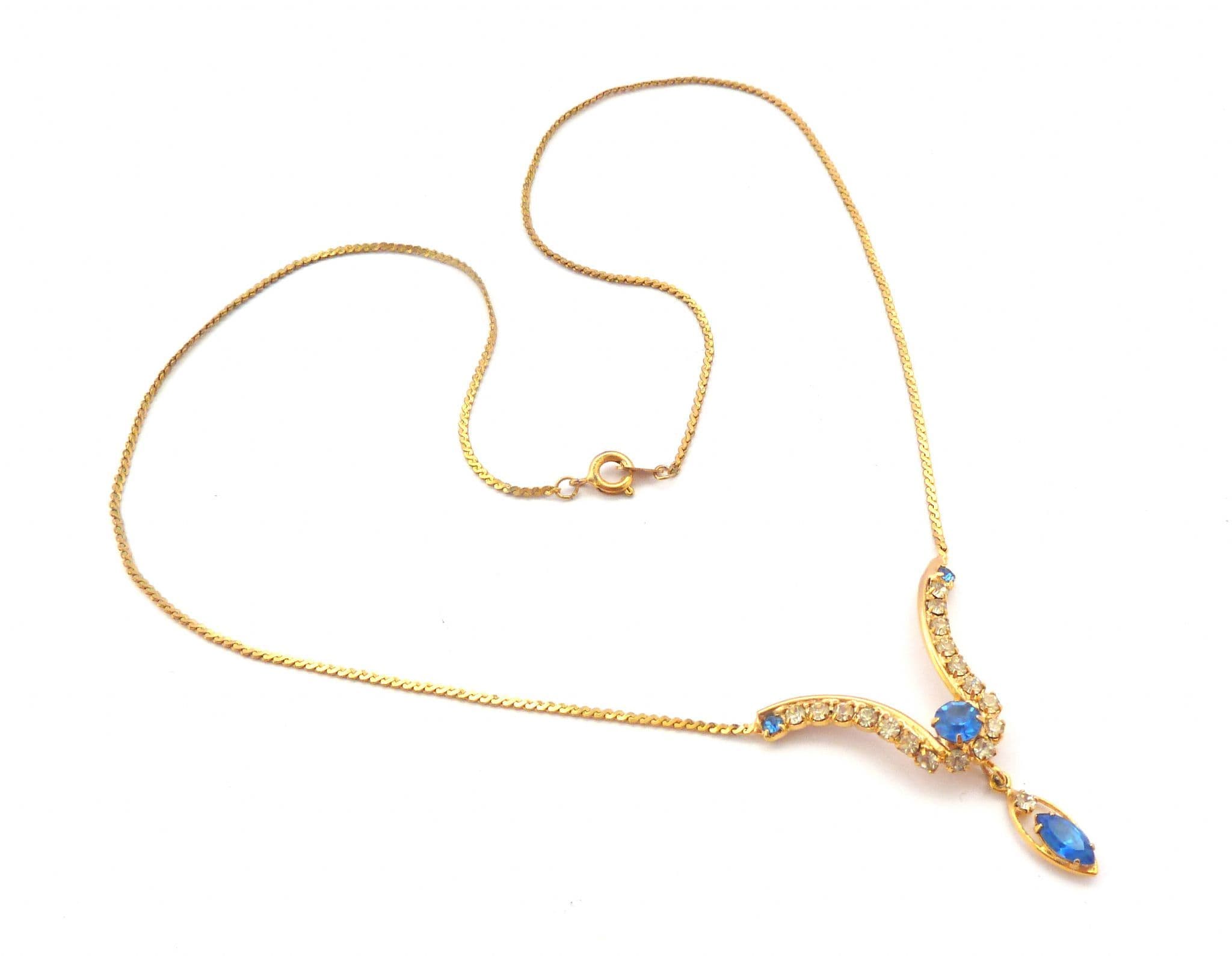 A vintage dainty rhinestone set panel drop design necklace. The necklace is formed from a gold tone chain leading to a central clear rhinestone detailed panel from which is suspended a small blue and clear rhinestone detailed navette shaped dropper. The necklace has a spring ring clasp closure. Circa 1980's.