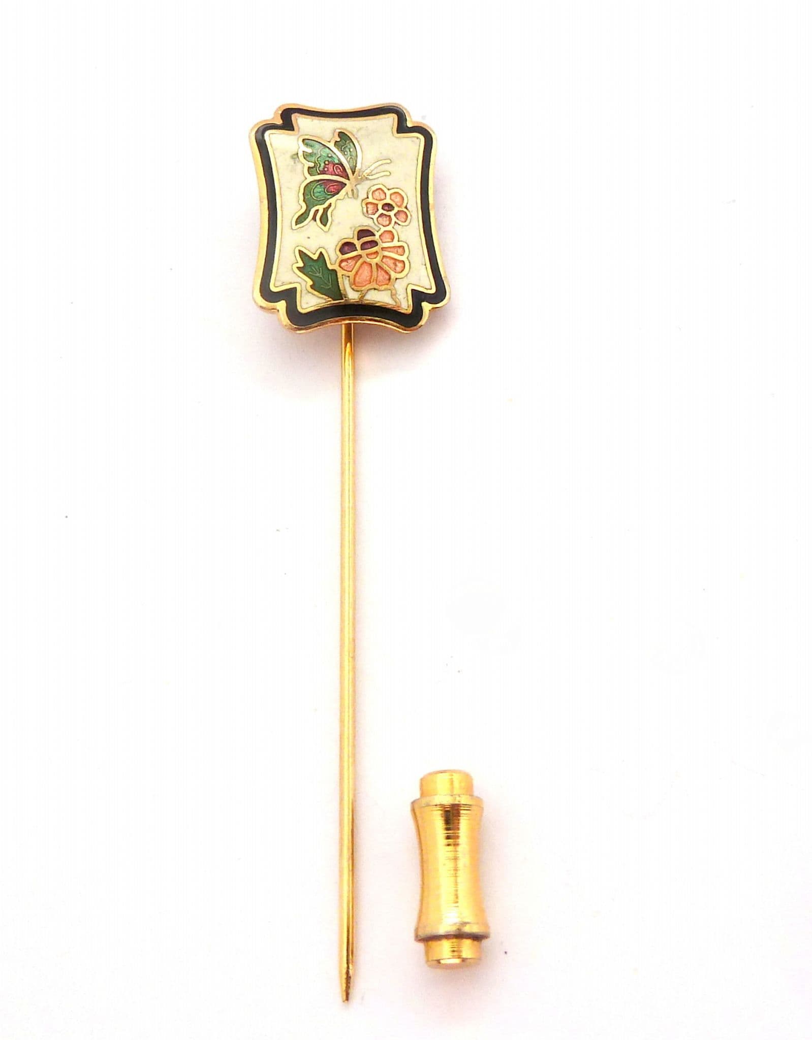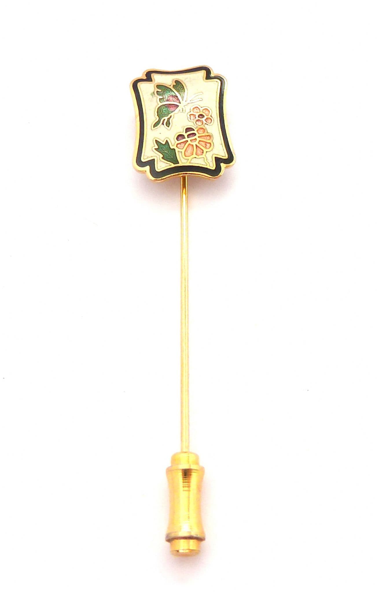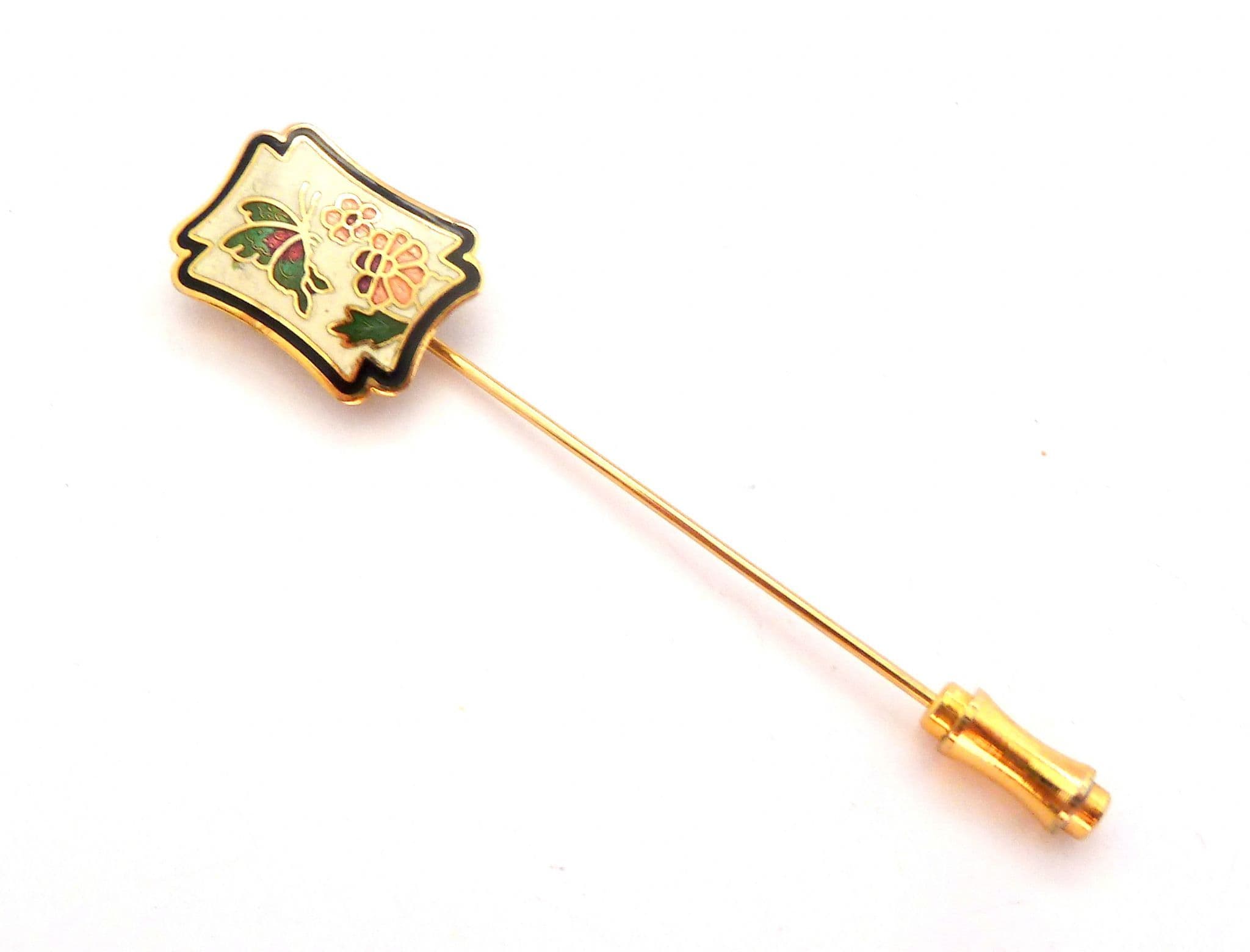 Vintage dainty Cloisonne enamel flower and butterfly design stick pin brooch. The stick pin is formed in a abstract curving rectangular shape with a butterfly visiting a flower design. Circa 1980's - 90's.