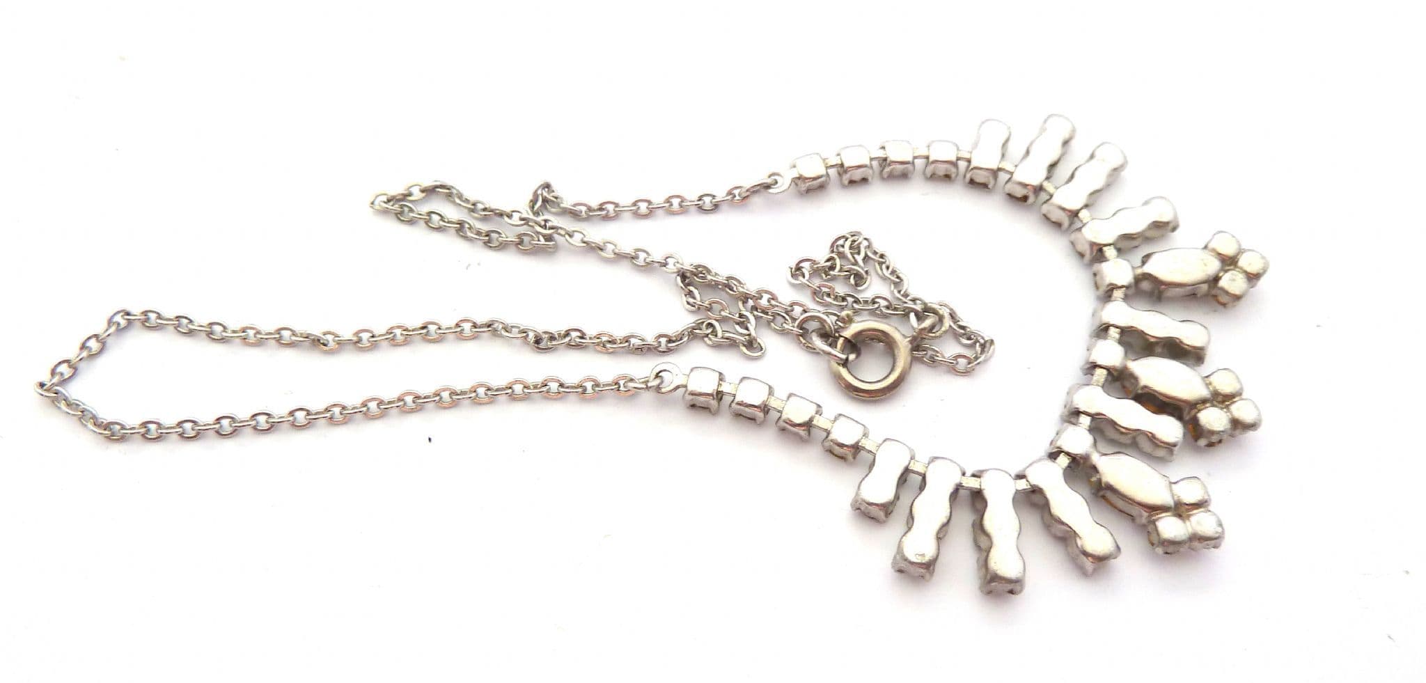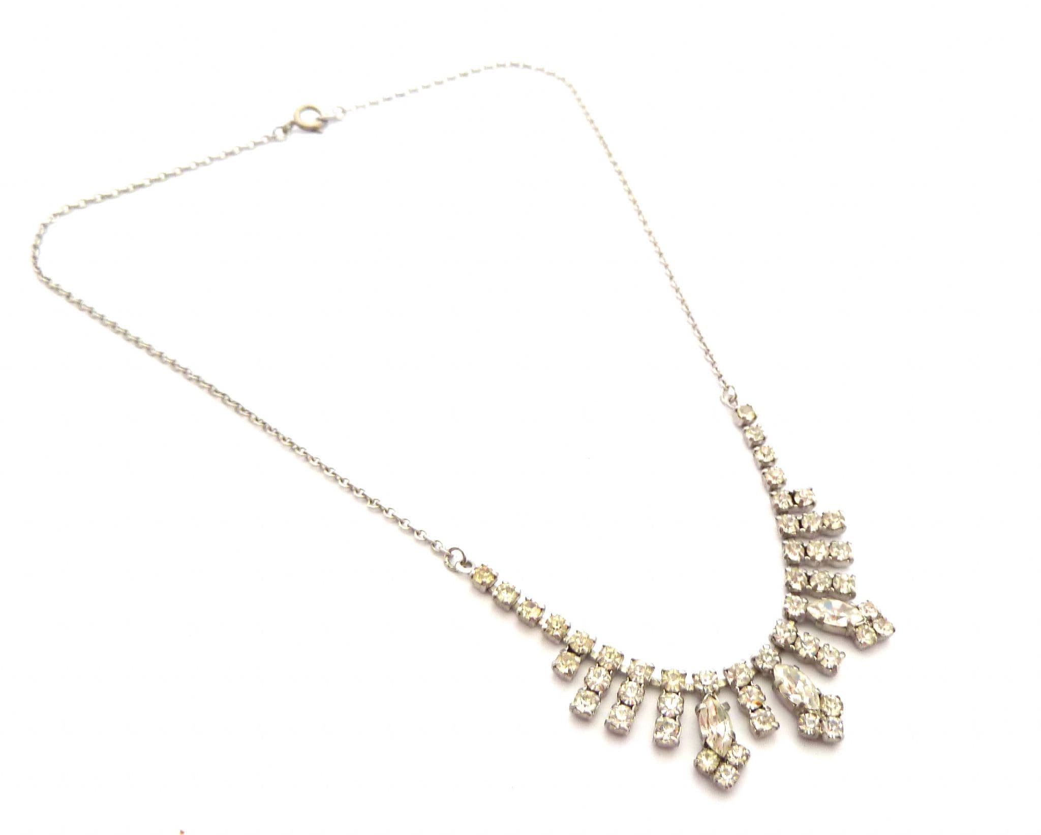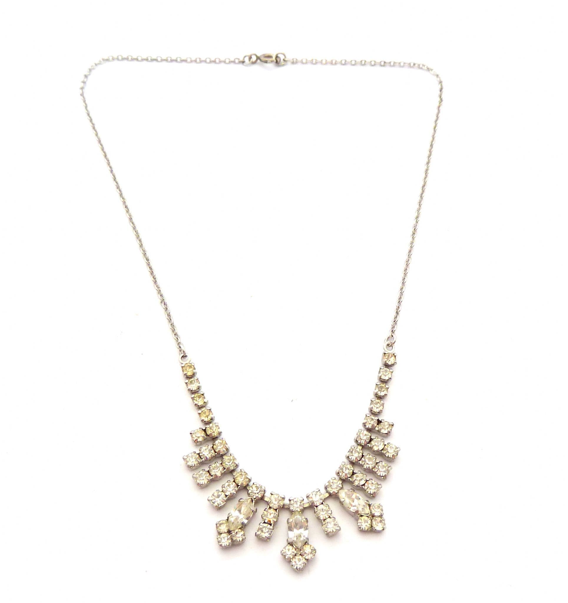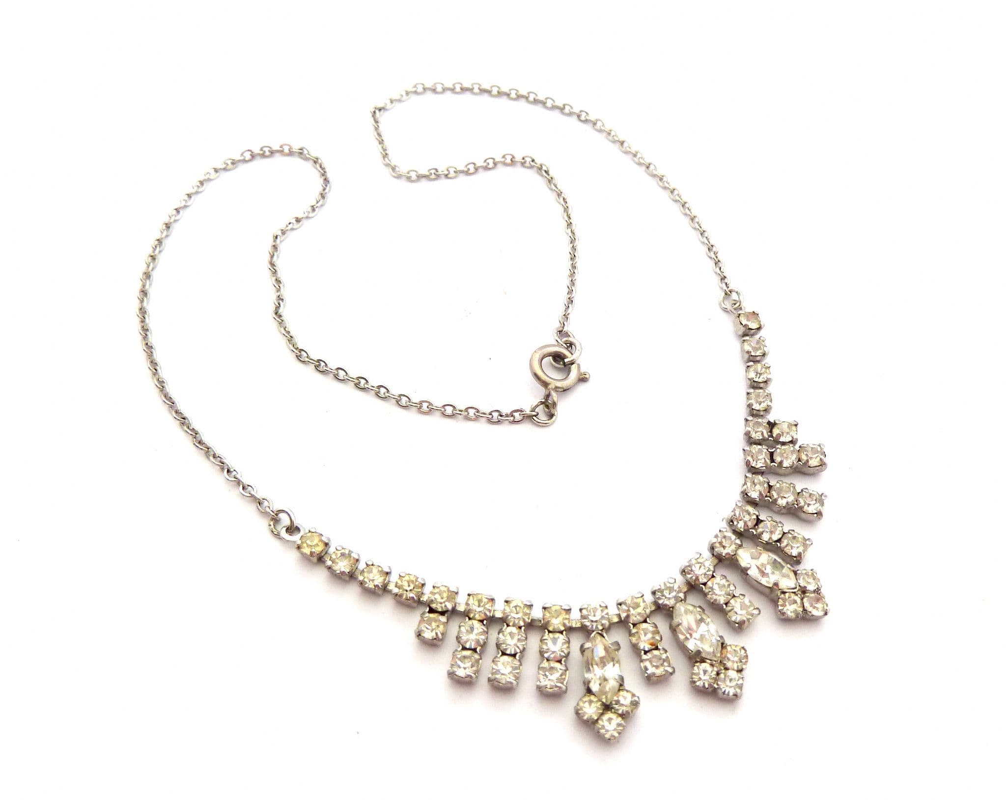 A vintage dainty rhinestone set ornate geometric fringe style drop design choker necklace. Short length necklace measuring approx 41.5cms with rhinestone detailing to the front 9cm, the rest of the necklace is set on a fine silver tone chain. All the stones are claw set, the necklace fastens with a spring ring clasp. Circa 1950s.