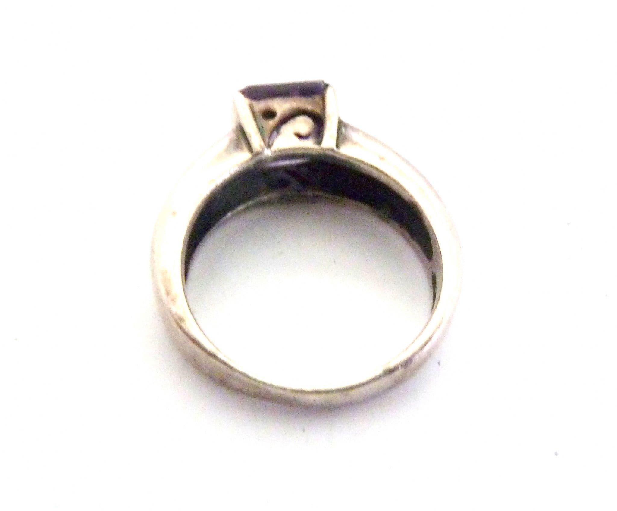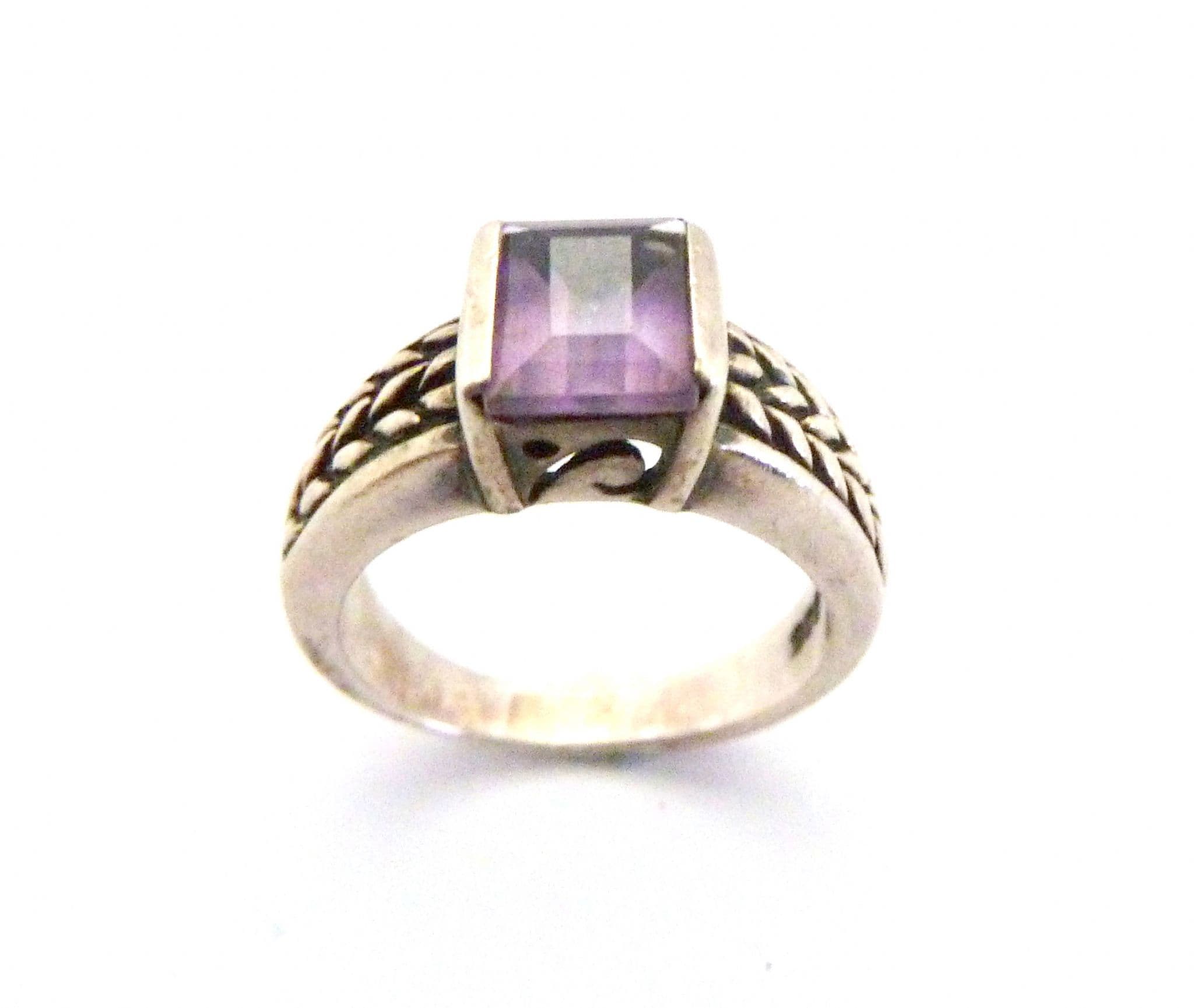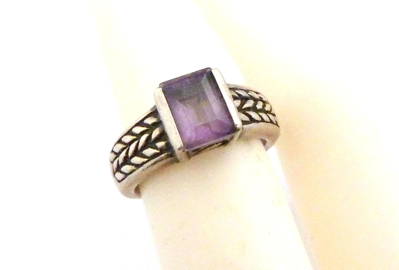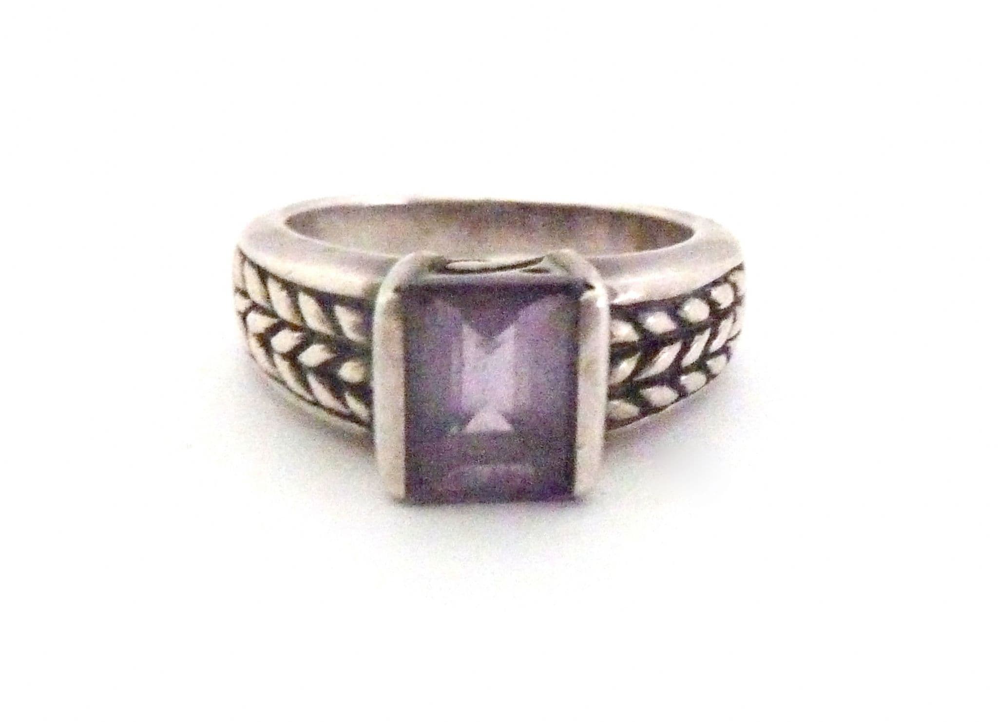Vintage sterling silver emerald cut amethyst gemstone and foliate band detailed ring. Formed from sterling silver set with a single emerald cut amethyst. Suitable for UK size L, USA size 5 3/4. Stamped 925 for sterling silver to the inside of the band