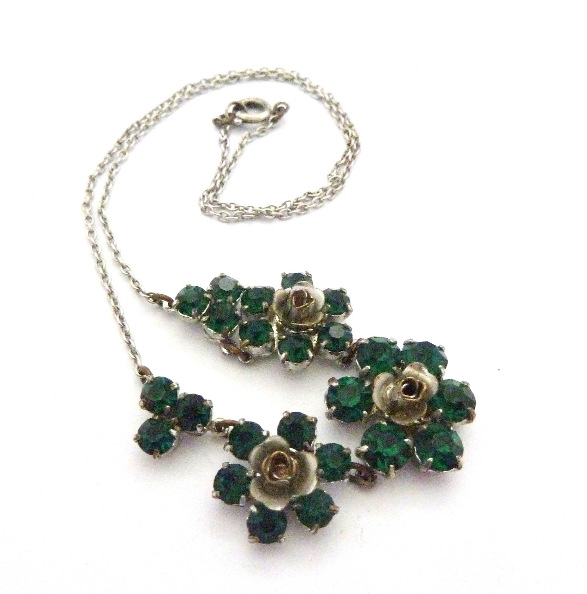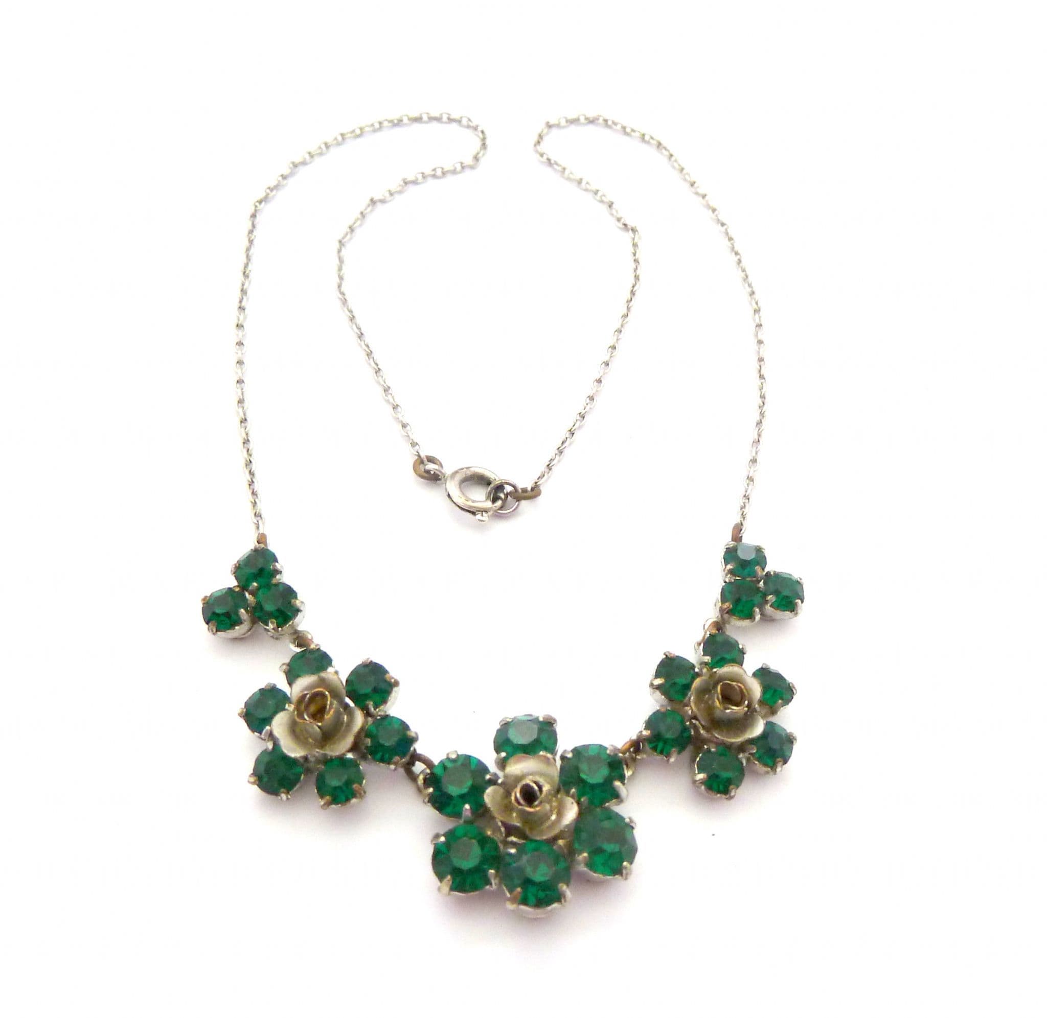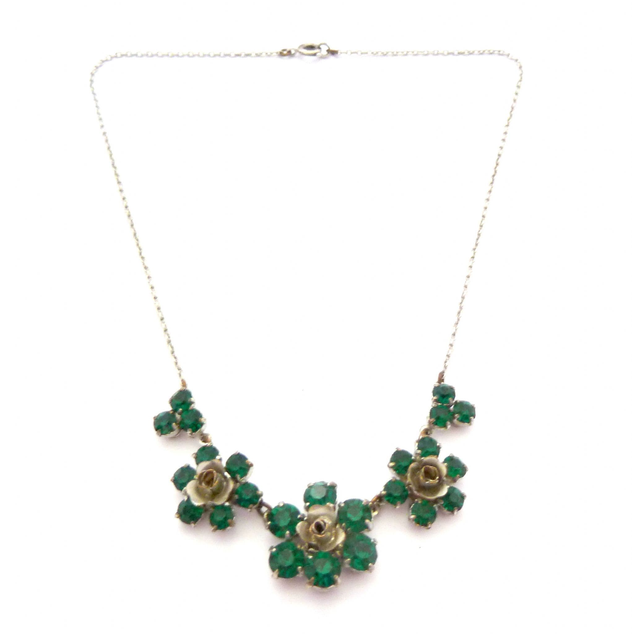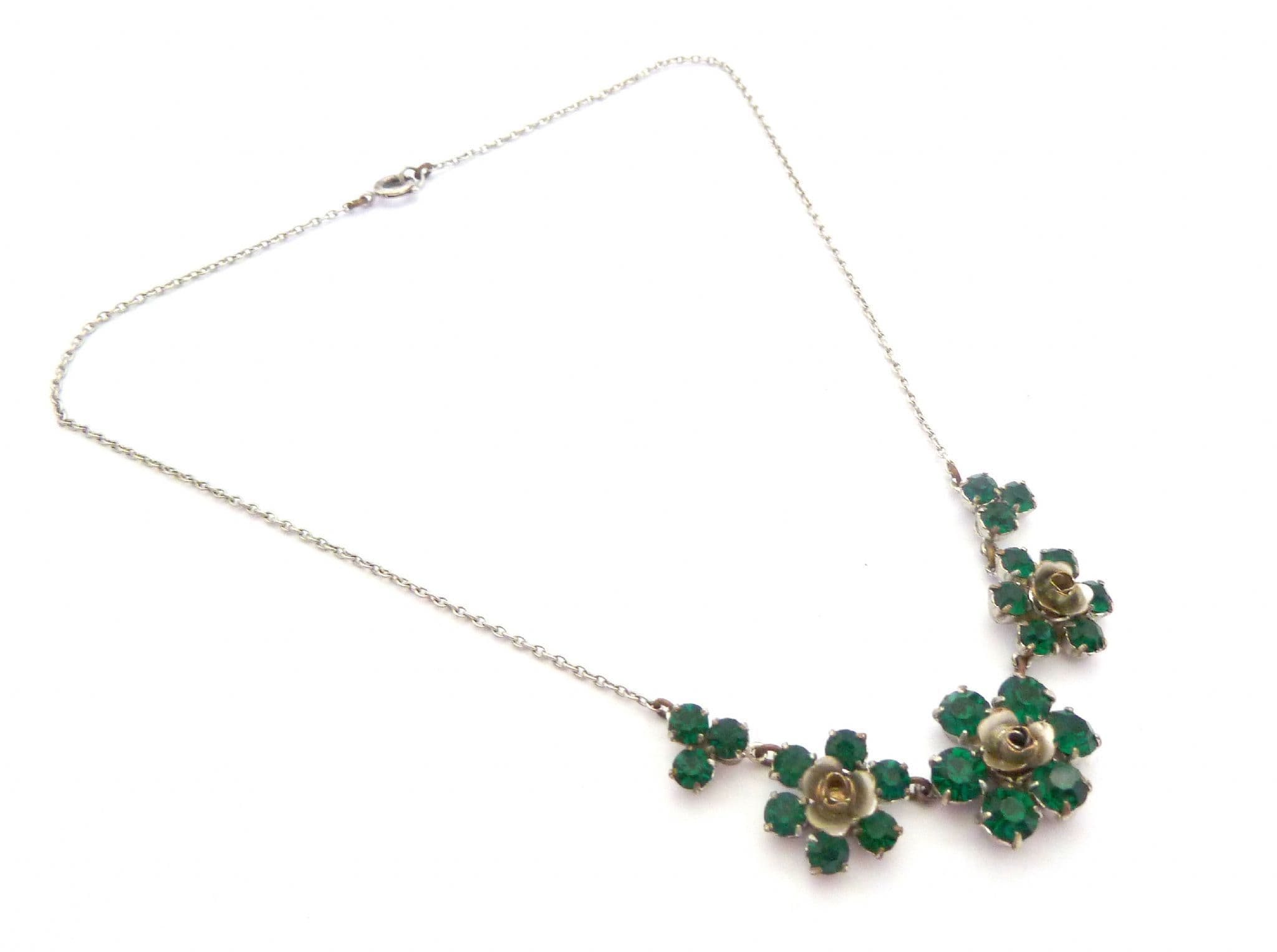 A vintage emerald green rhinestone set floral design choker length necklace. Measuring approx 42.5cms with emerald green rhinestone detailing forming a trio of flowers to the front 8cm, the center of the flowers are formed from silver tone metal. The rest of the necklace is set on a fine silver tone chain. All the stones are claw set, the necklace fastens with a spring ring clasp. Circa 1950s.