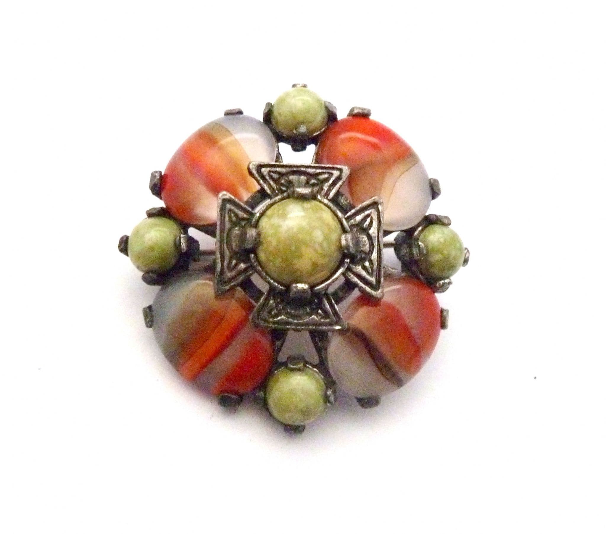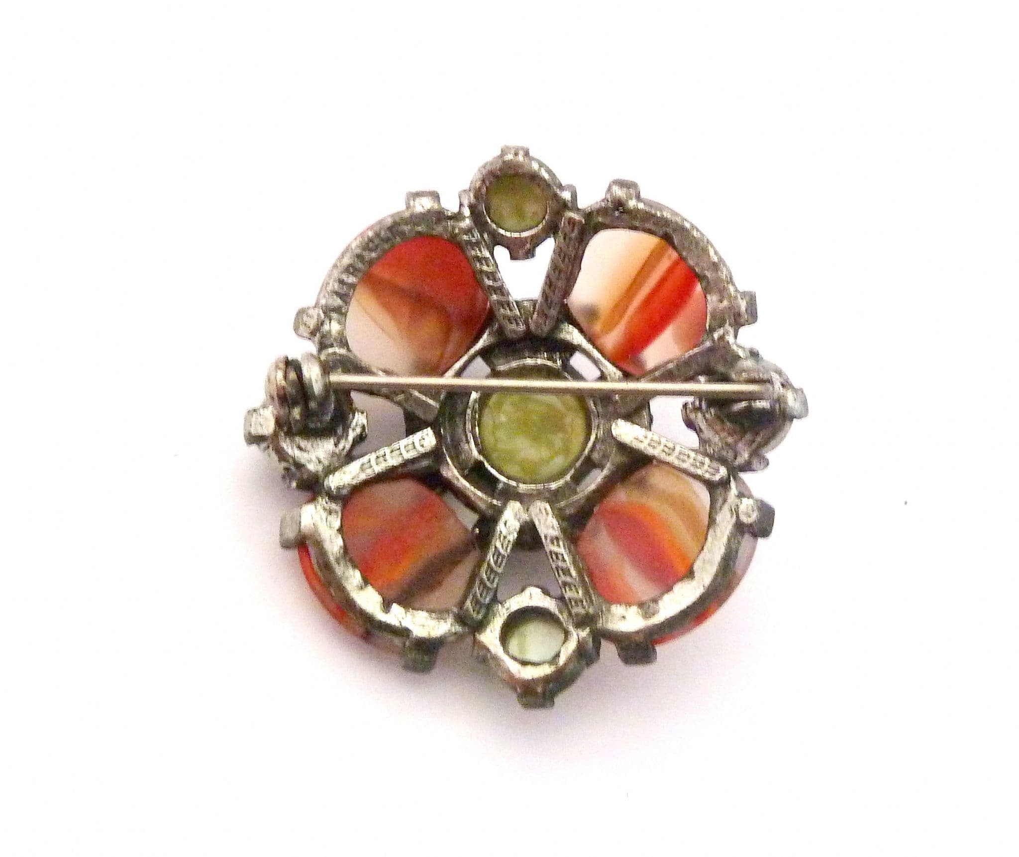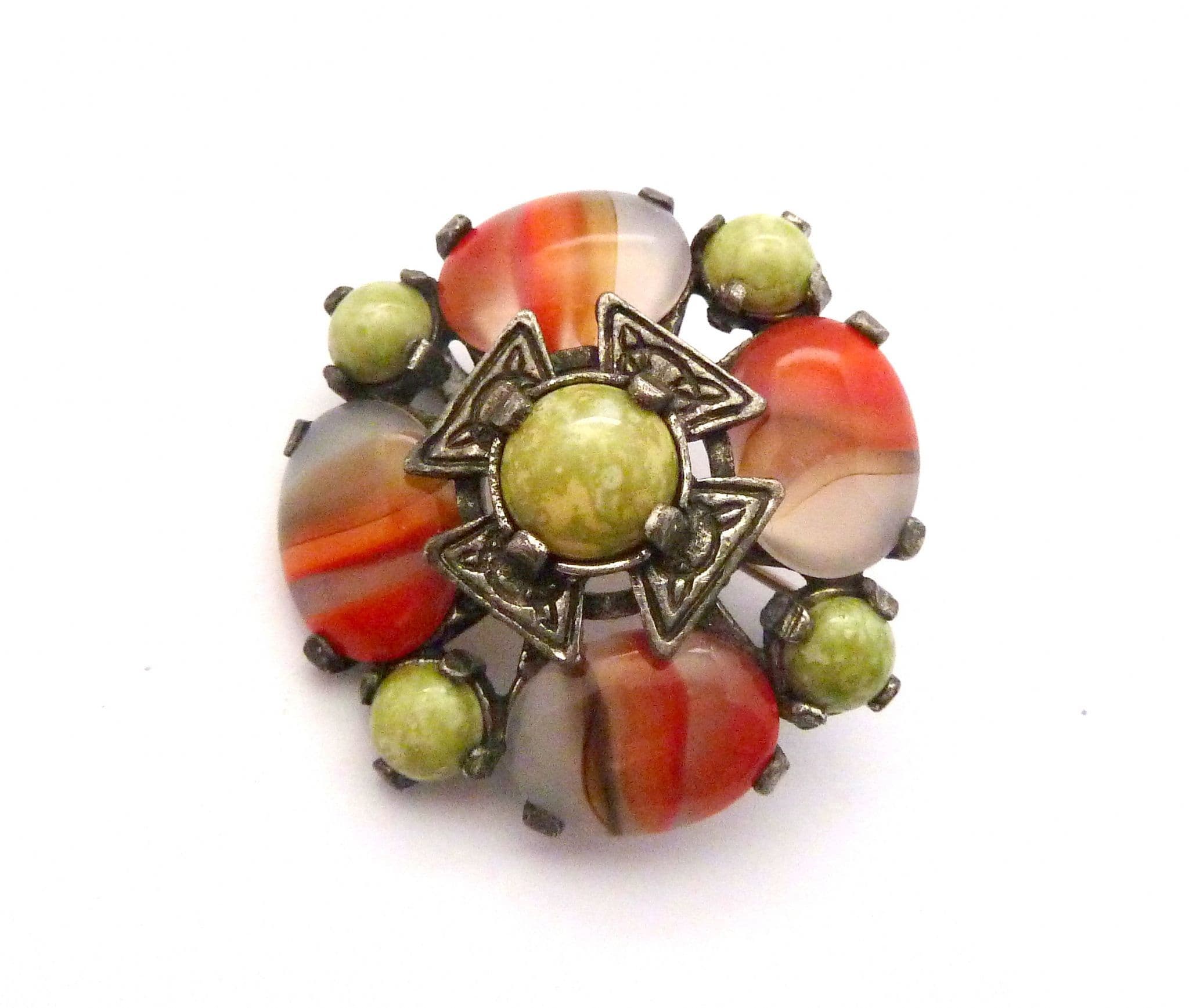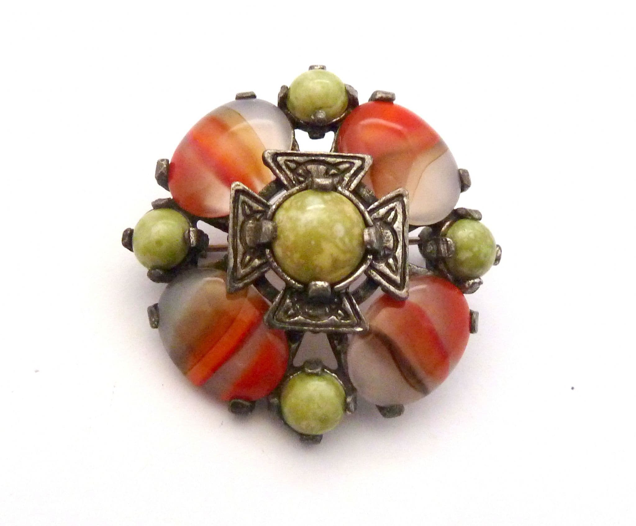 A vintage Scottish Celtic style faux Connemara marble and agate glass cabochon set brooch by Miracle. The brooch is formed from silver tone metal fashioned in a Celtic Scottish shield style design set with faux Connemara marble and faux agate glass cabochons. Circa 1970's - 80's.