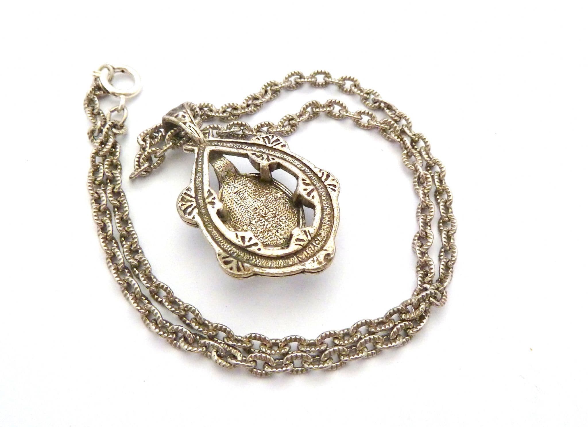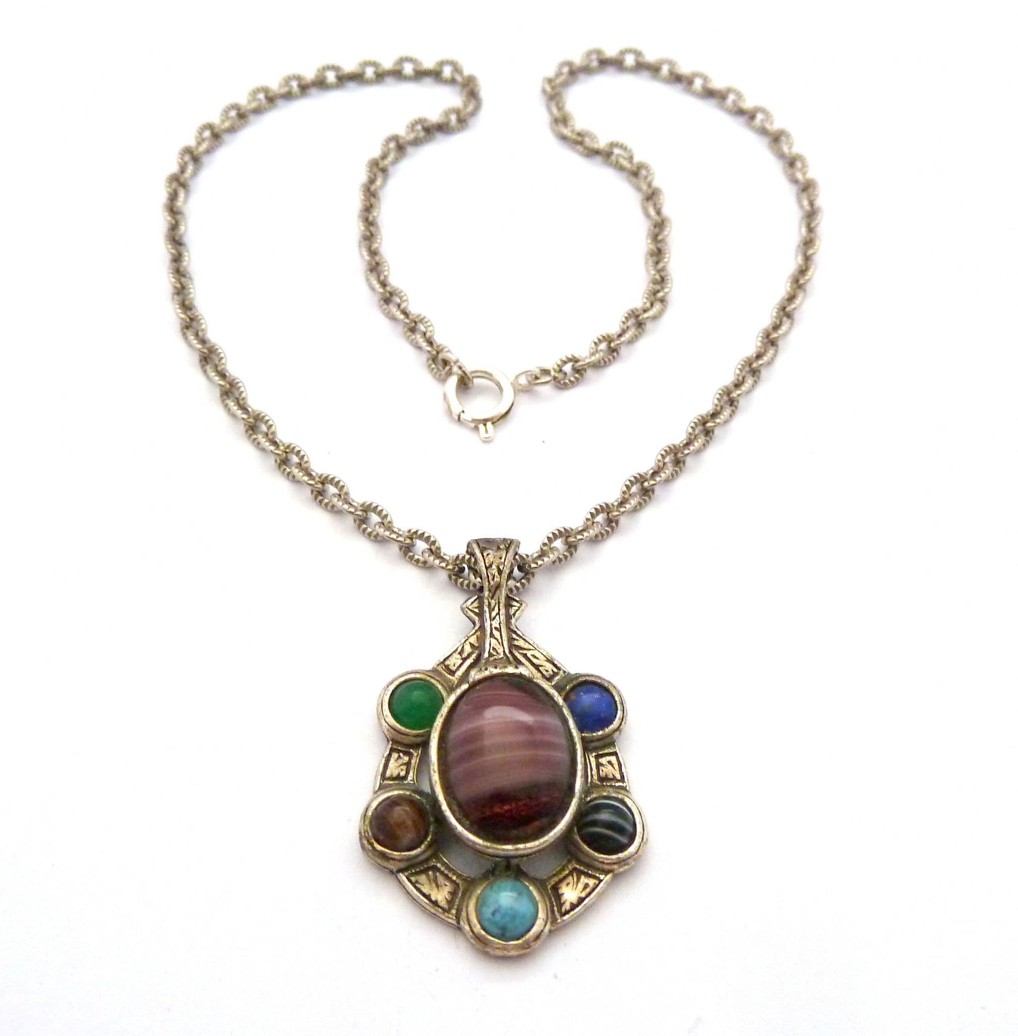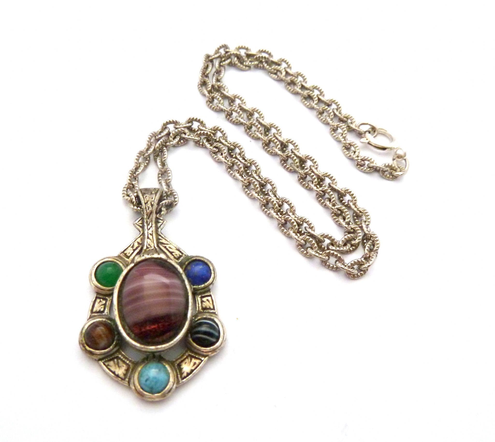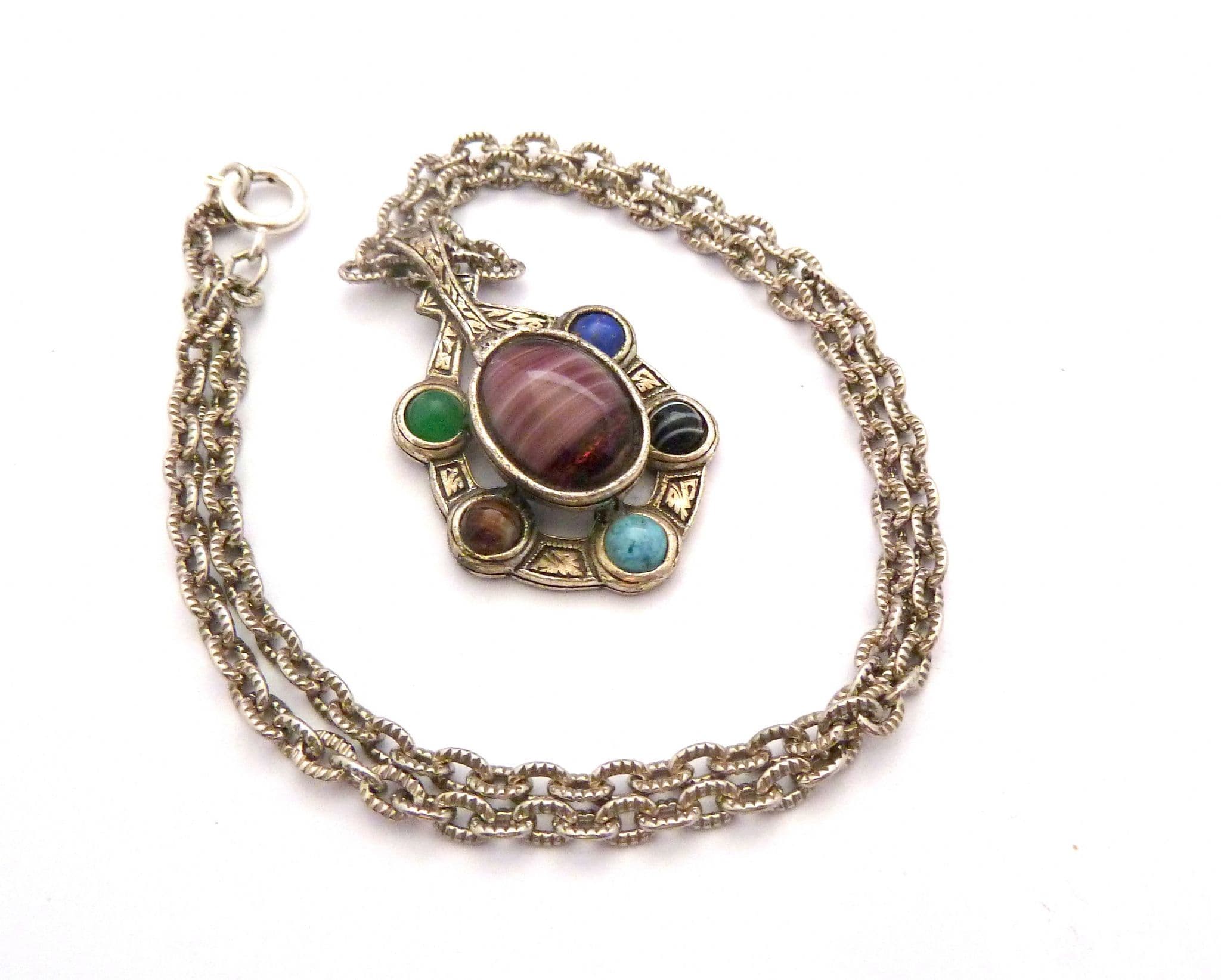 Vintage Celtic faux gem set necklace manufactured under the trade name Miracle by A Hill and company Ltd. The pendant is set with five faux gem glass cabochons and one large faux marbled amethyst glass cabochon, set in a silver tone setting with Celtic patterns. The chain measures approx 51.5cms in length. Circa 1970's - 80's. Signed Miracle to the back of the pendant.