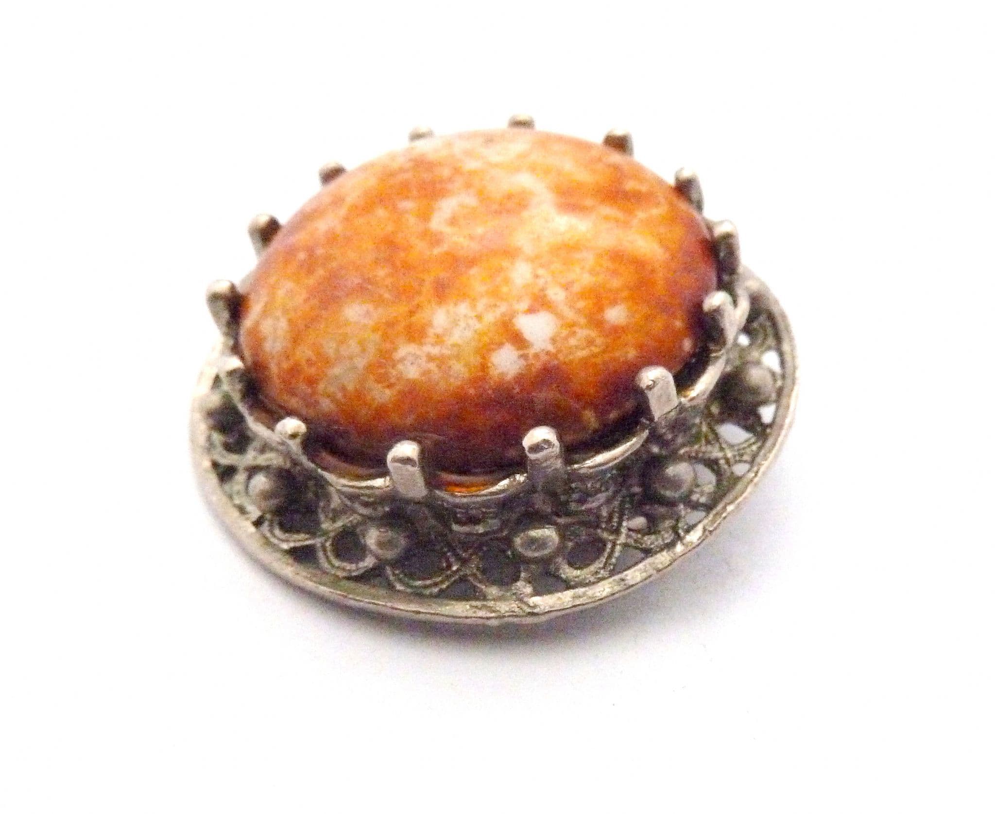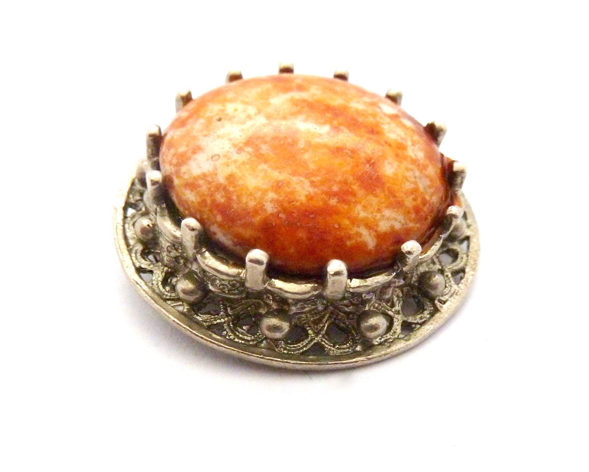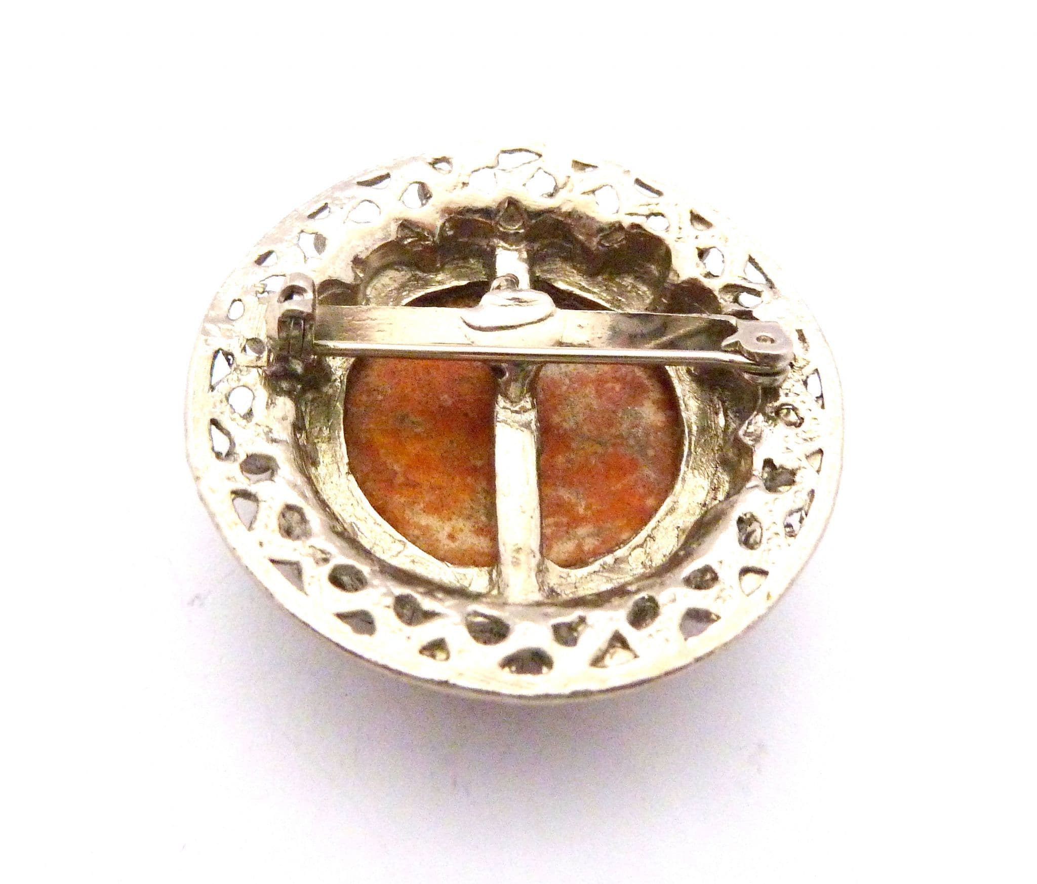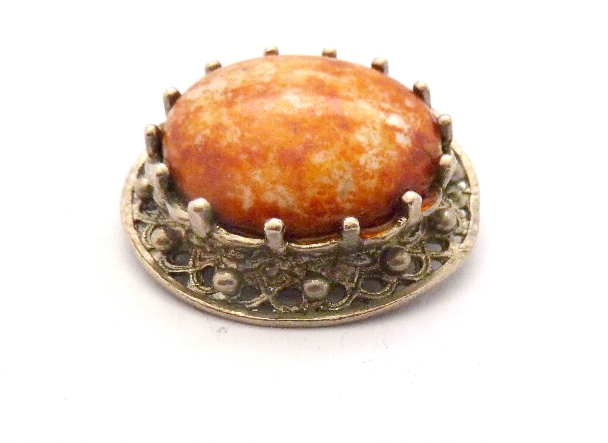 A vintage faux gem set Scottish Celtic style brooch. Formed from silver tone metal in a circular shape set with a large faux gem cabochon. Secure roll over safety clasp. Circa 1960's - early 70's