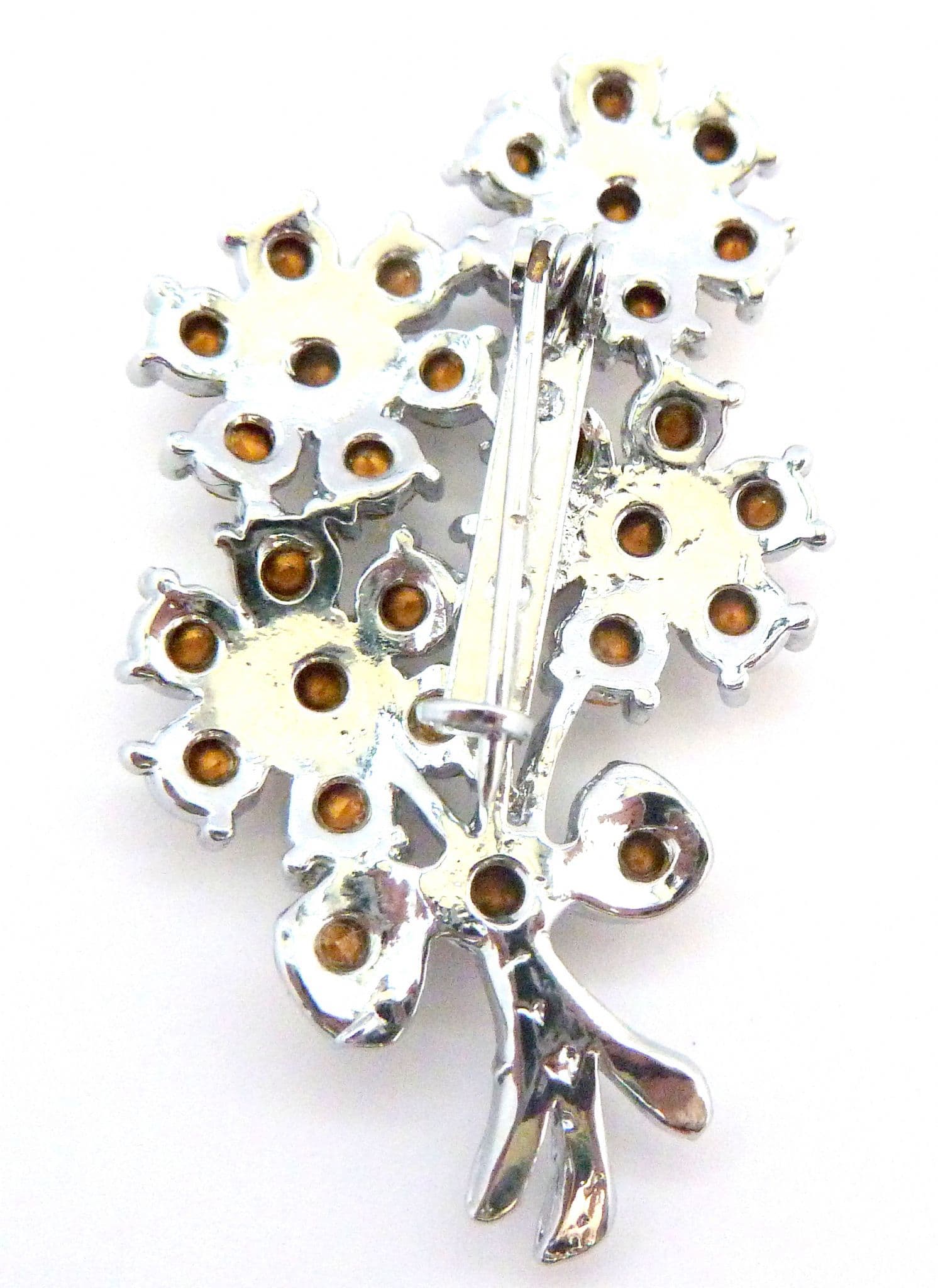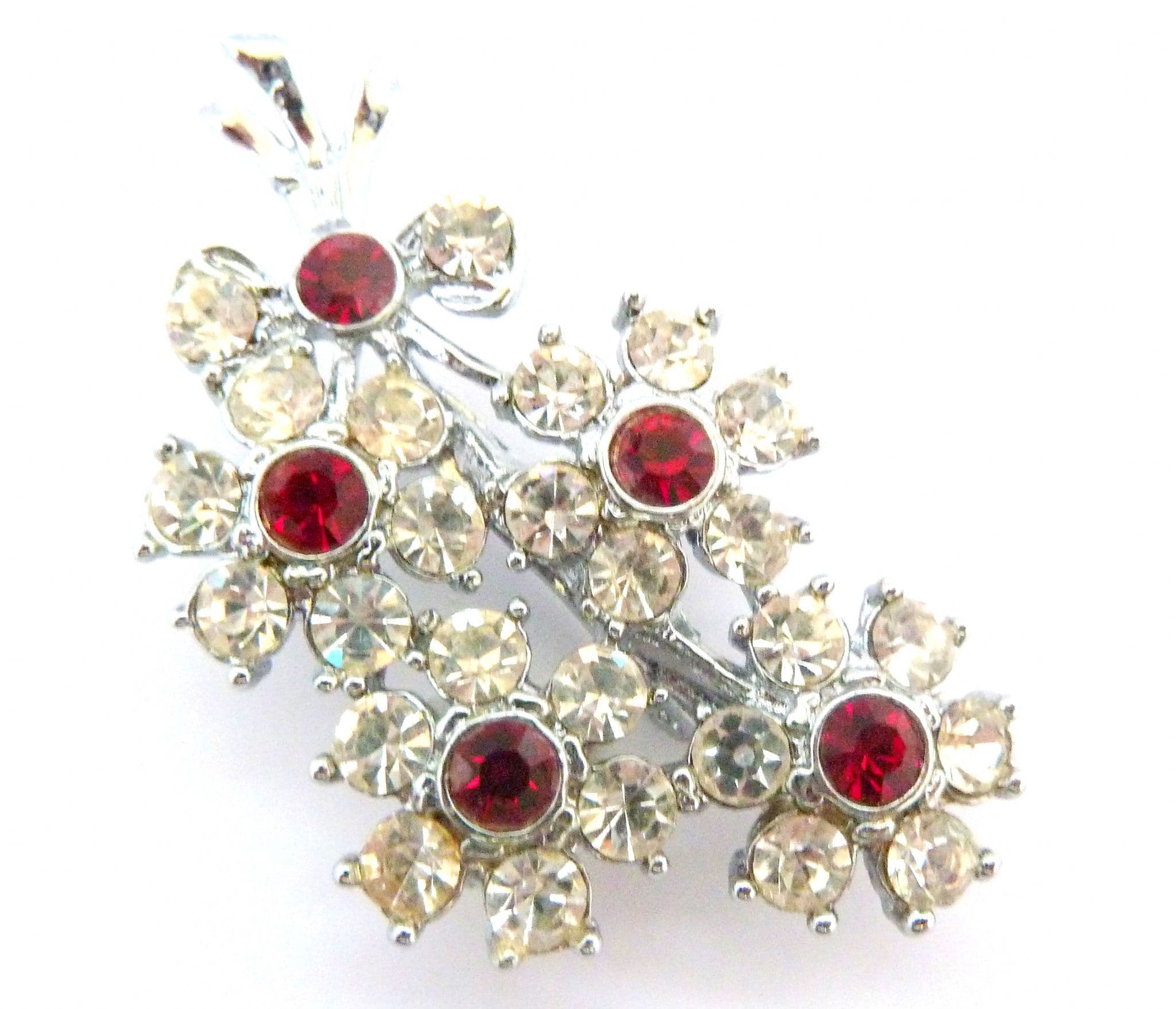Vintage clear and red rhinestone floral posy design brooch. Formed from silver tone metal, in the shape of four flowers the petals of which are set with clear and red rhinestones, complete with a rhinestone set bow at the base of the flowers. Fastens with a roll over safety clasp. Circa 1950's - 60's.