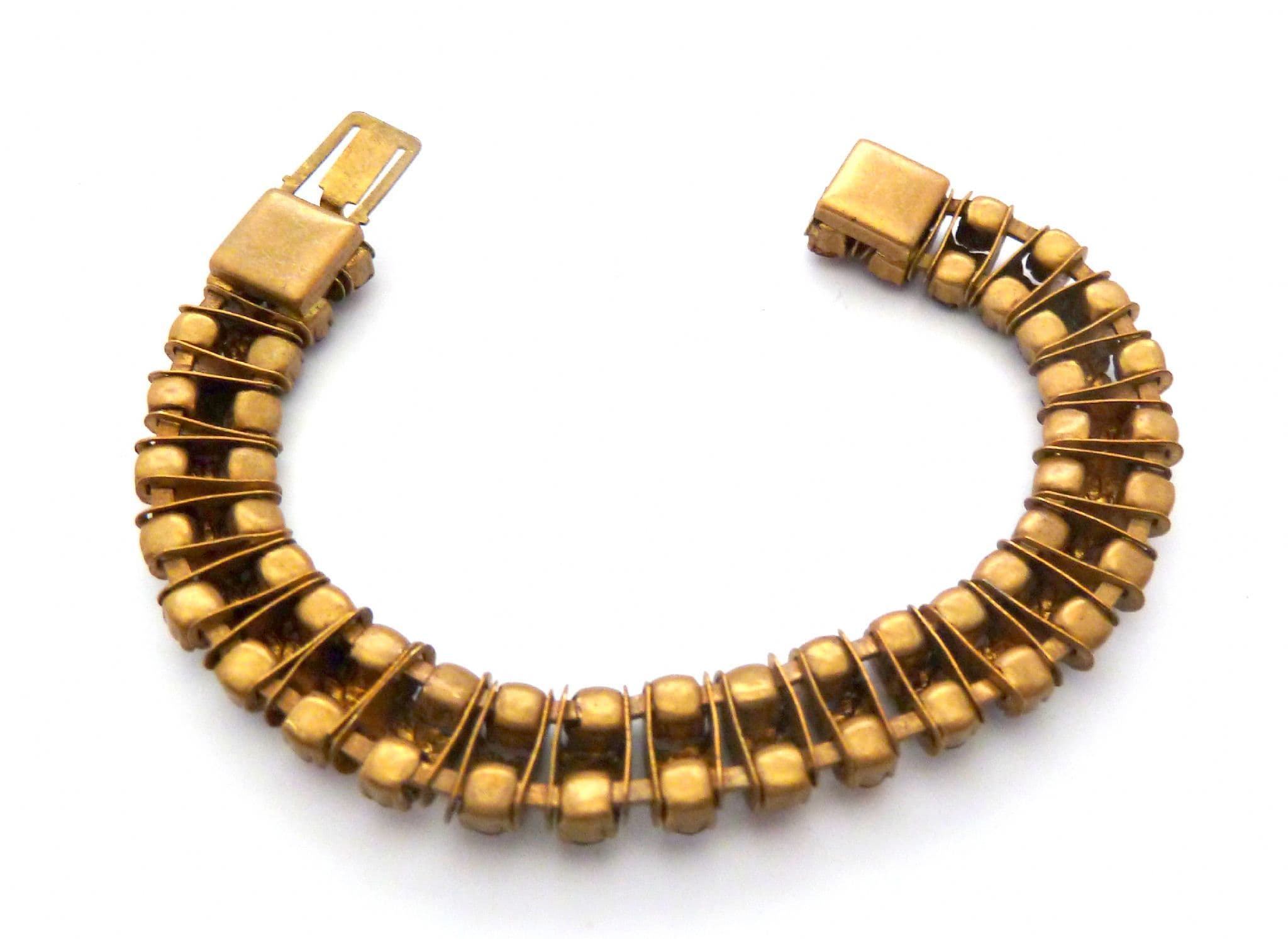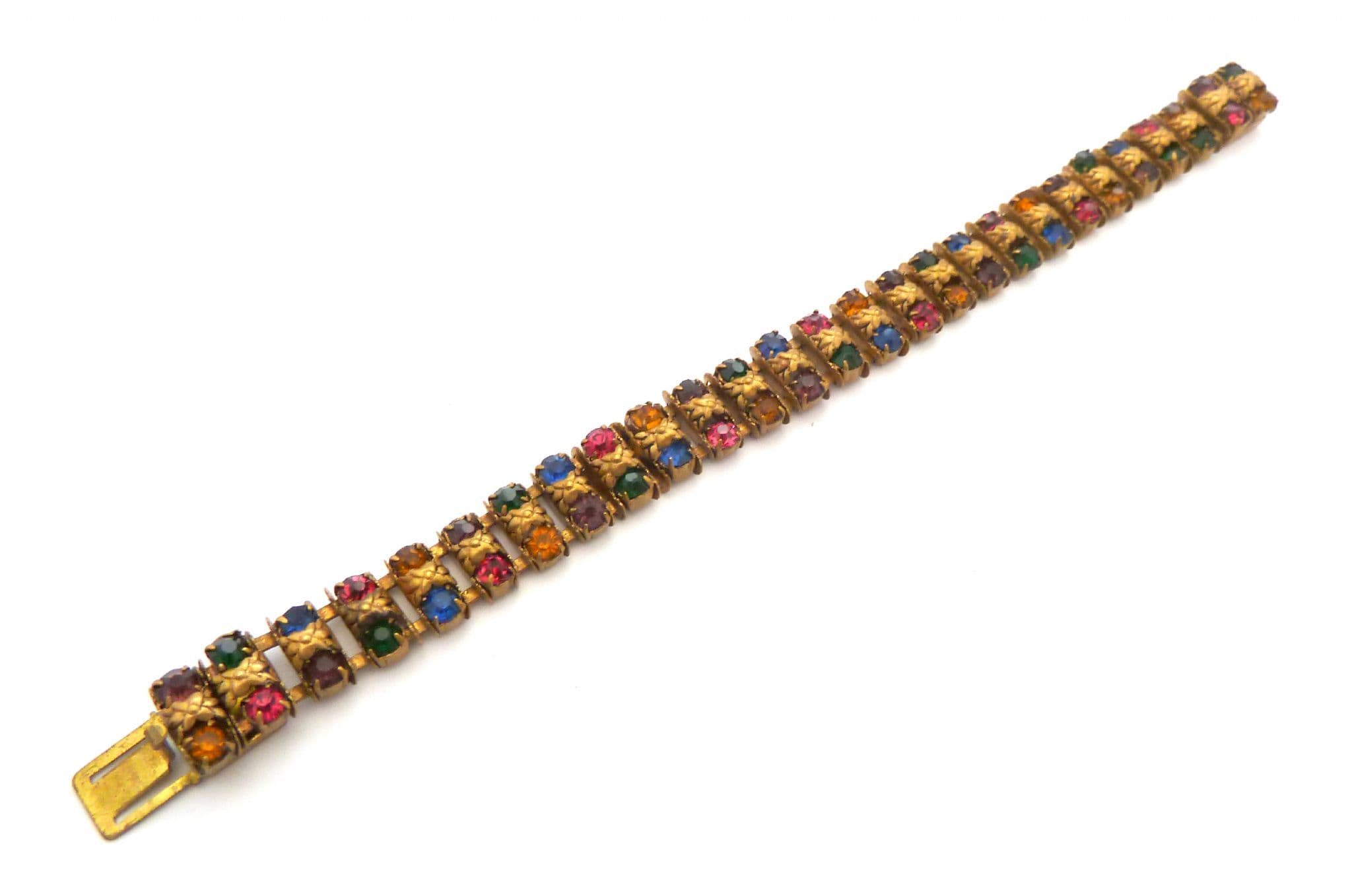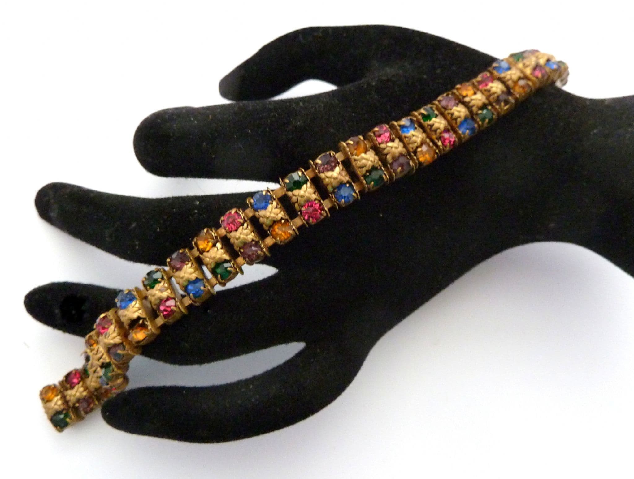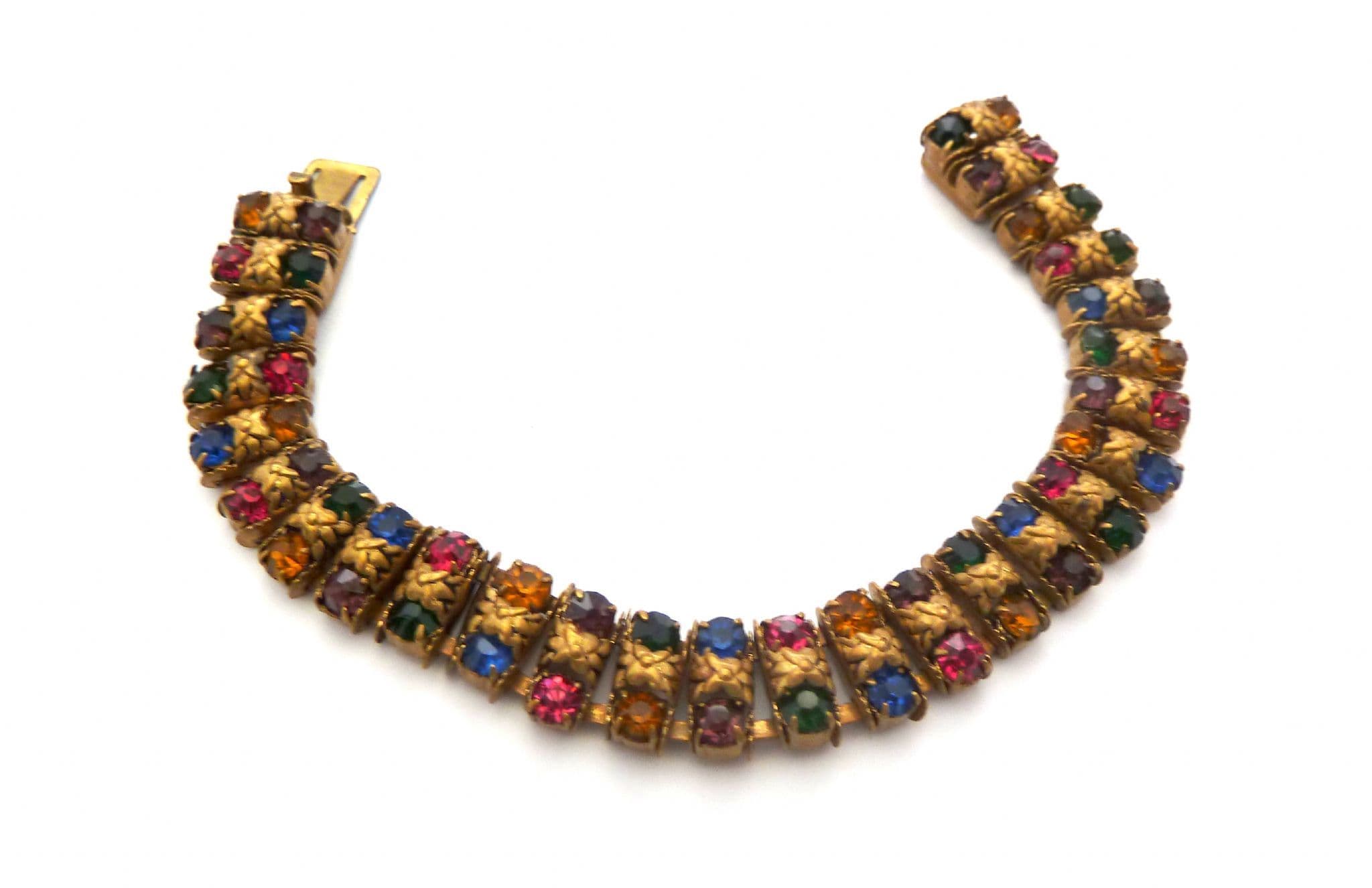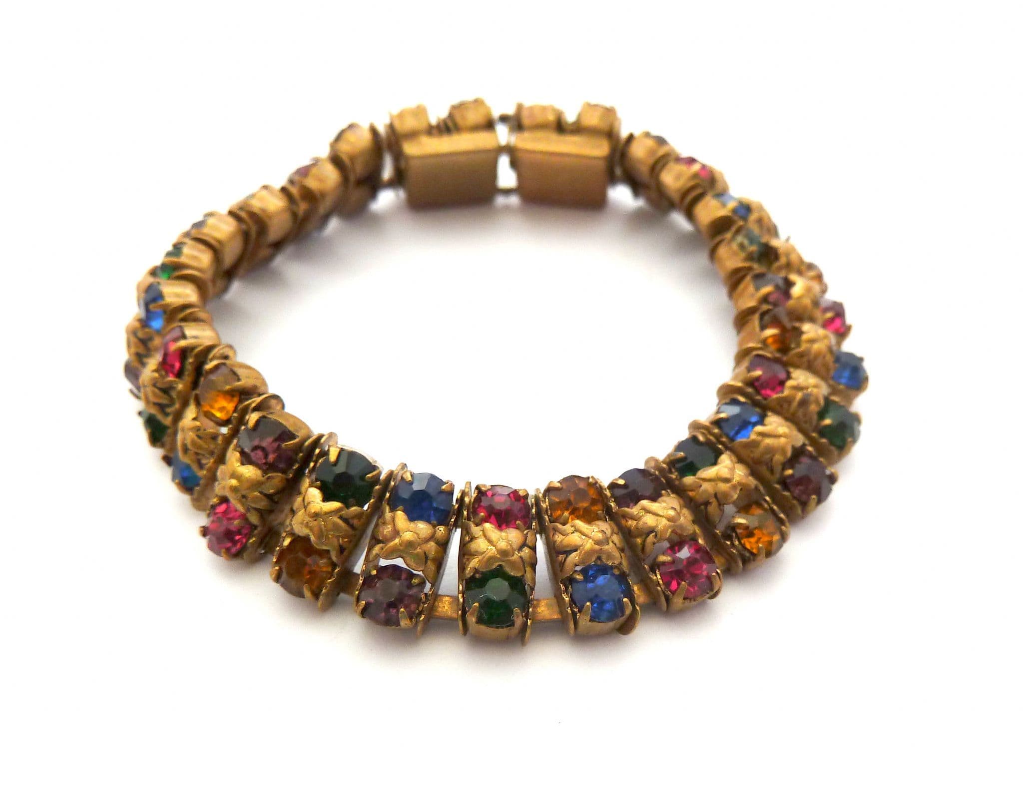 Vintage brass and glass, fruit salad rhinestone set double row ornate design bracelet. The bracelet is formed from two rows of symmetrically set uniform in size fruit salad rhinestones. Secure push box clasp. Circa 1940's - 50's