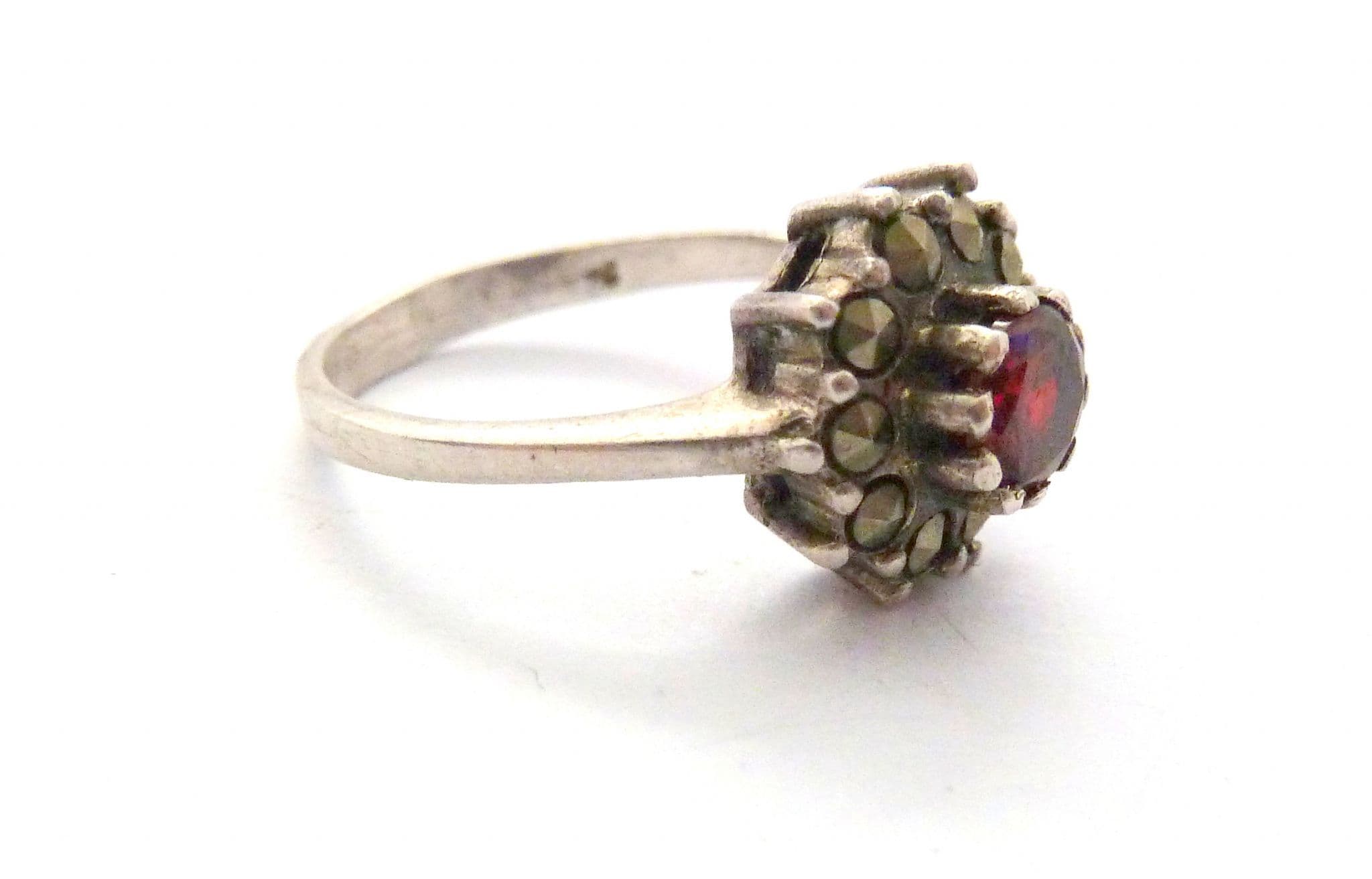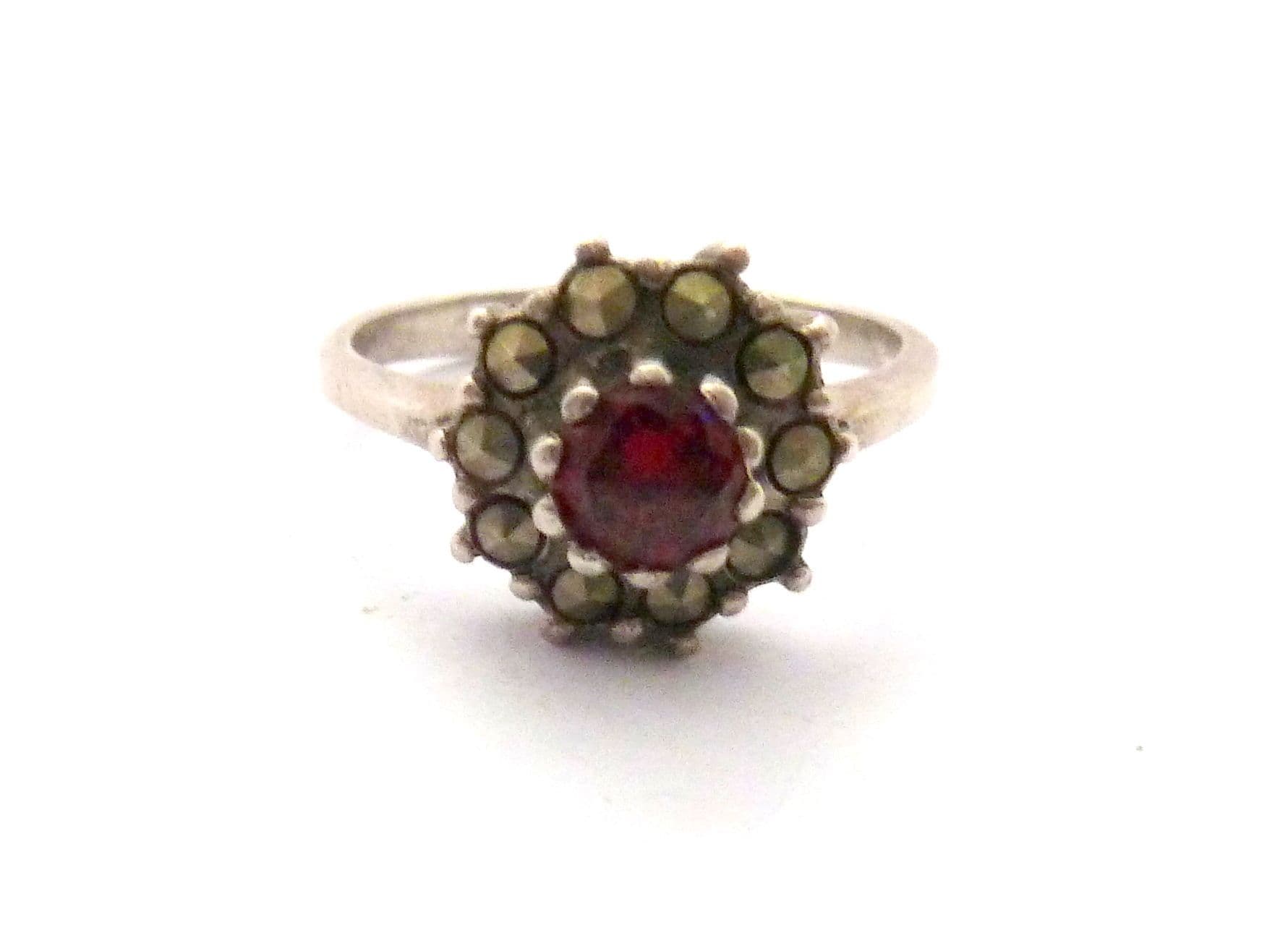 A vintage sterling silver, garnet and marcasite set small dress ring The ring is stamped 925 to the inside of the band . The central design is small and formed from marcasites bordering a garnet It is suitable for a UK size L 1/2, US size 5 3/4.