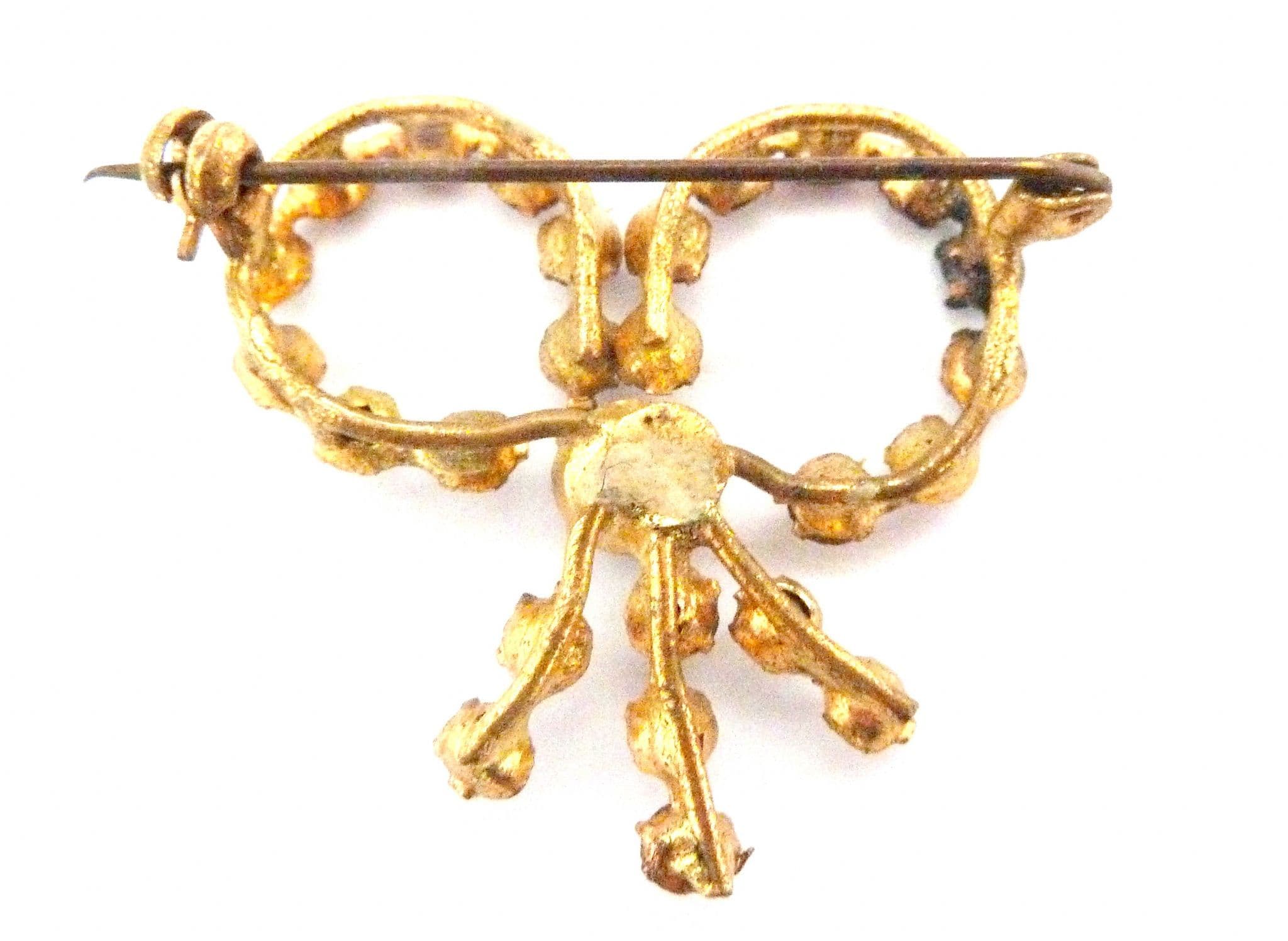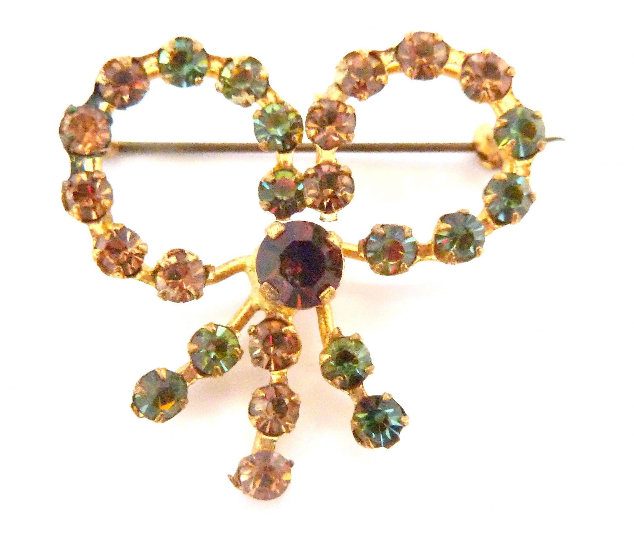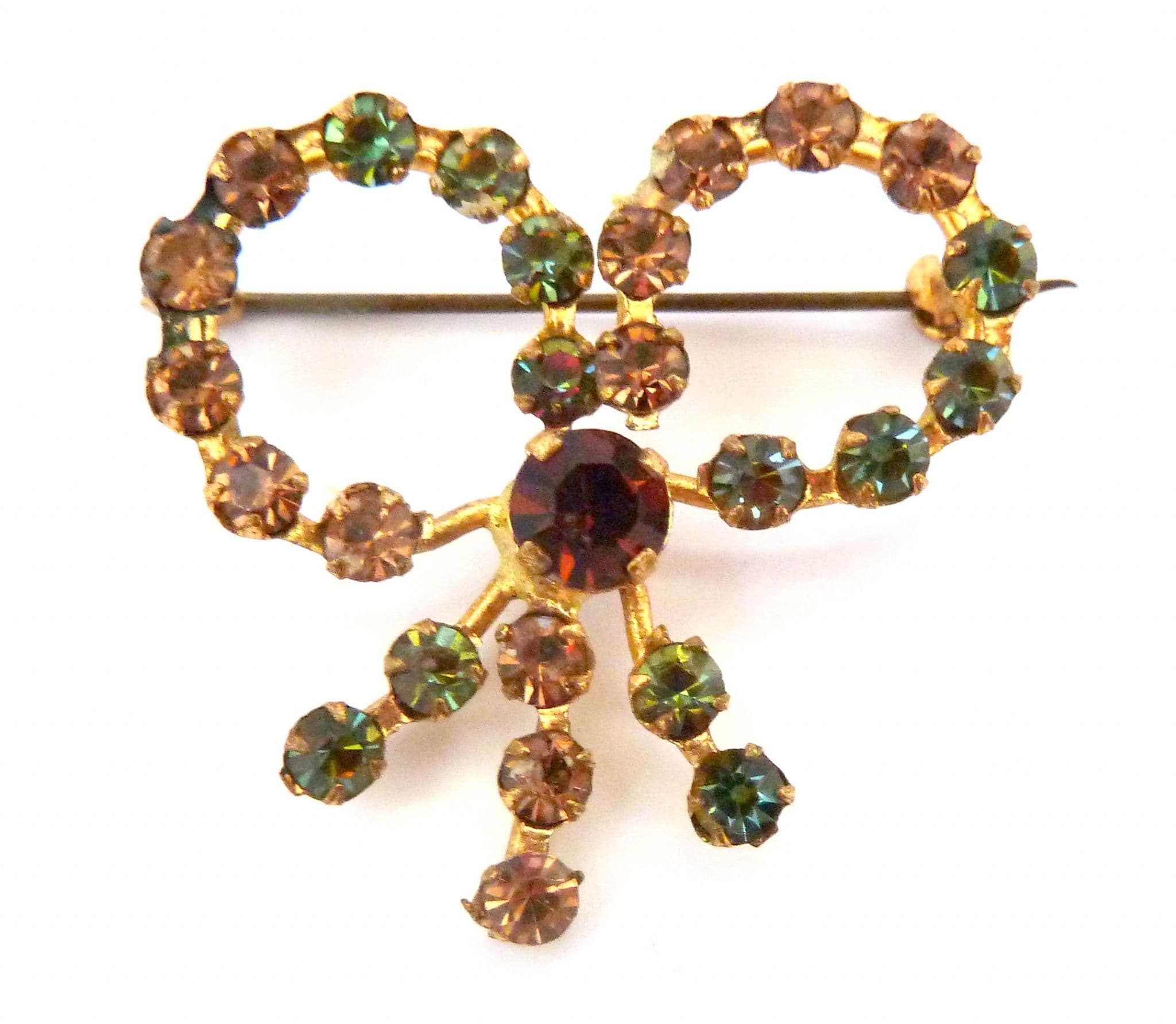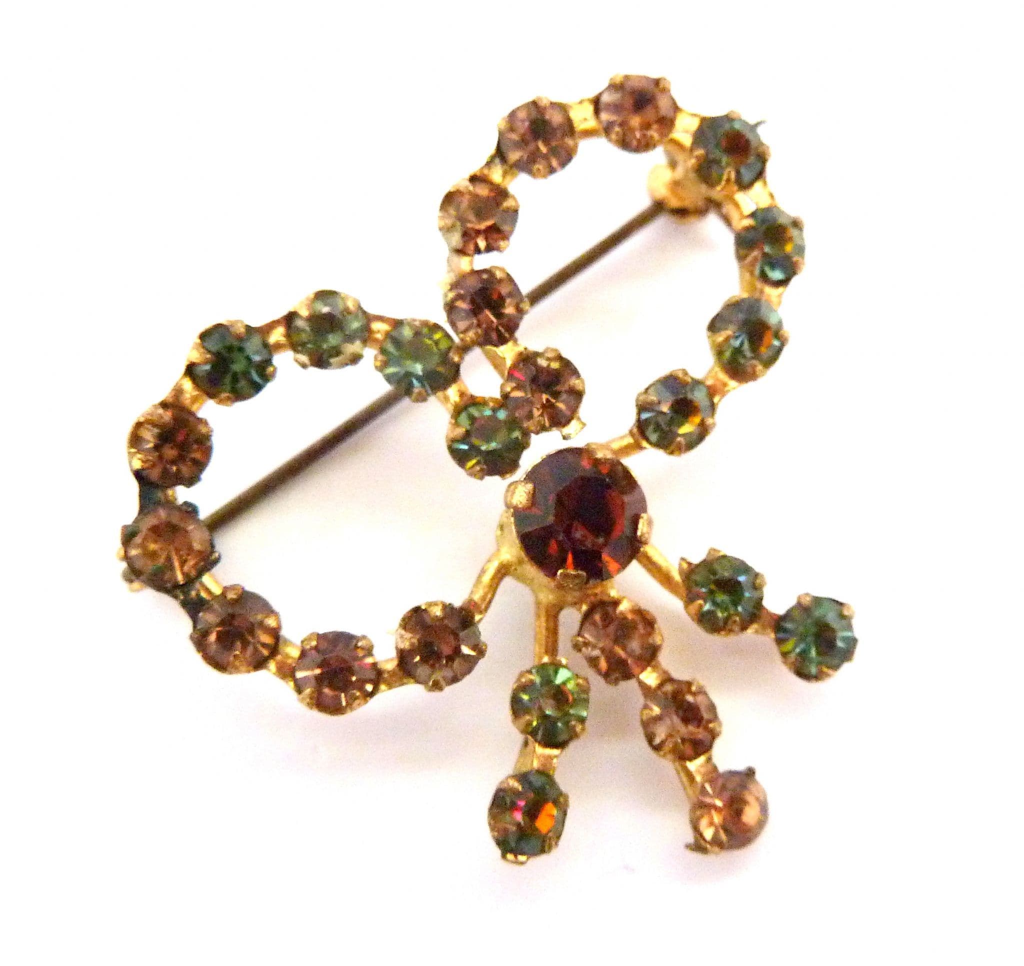 Vintage rhinestone set bow design brooch. The brooch is formed from gold tone metal in the shape of a ribbon bow set with unusual dusky green, orange and pale brown rhinestones. Secure roll over safety clasp, circa 1950's - 60's.