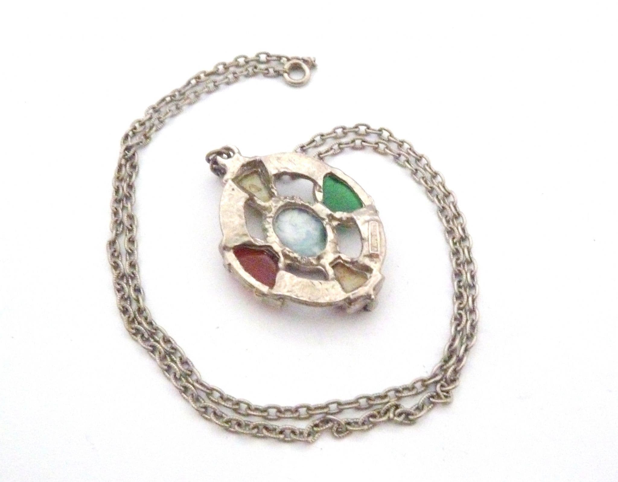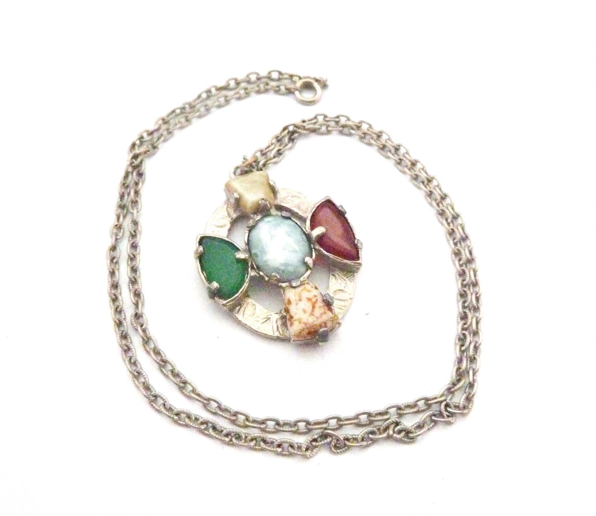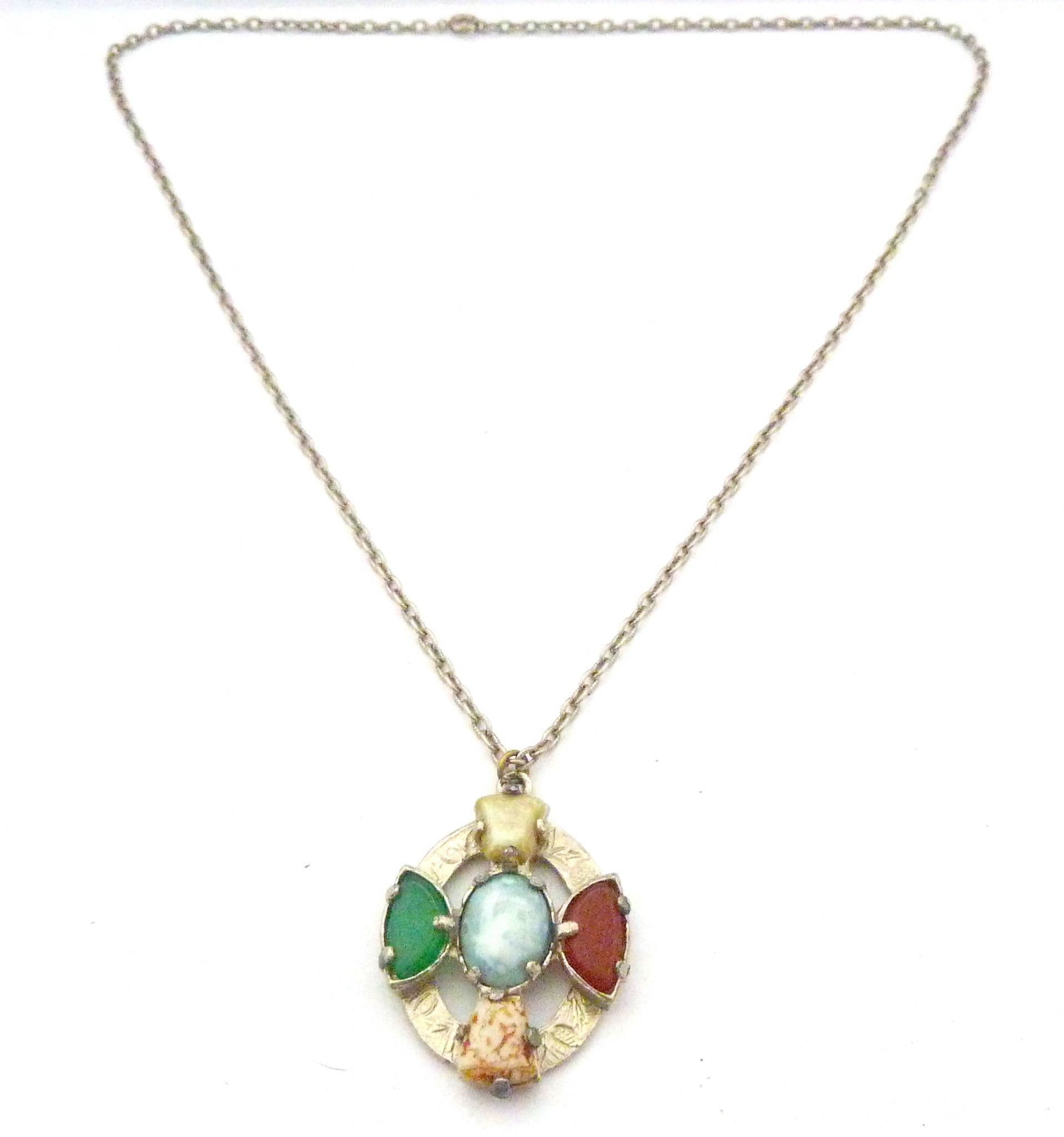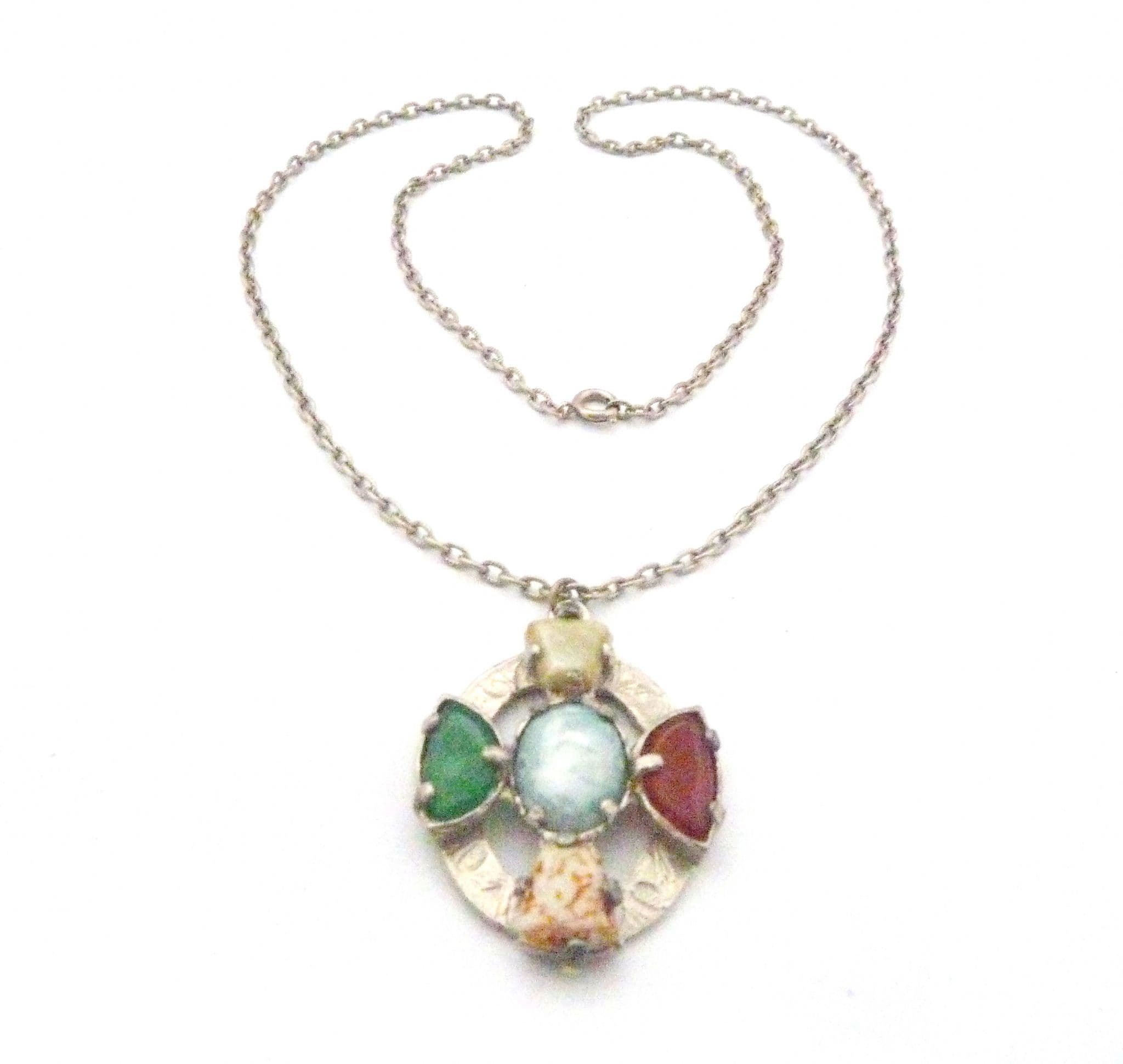 Vintage large, faux agate Celtic cross style pendant and necklace by Jacobite. The pendant is formed from silver tone metal in the design of a Celtic cross set, with faux gemstones including mock agate, carnelian and Connemara marble. The pendant is set on its original long necklace chain. Signed Jacobite to the back of the pendant. Circa 1960's - 70's.