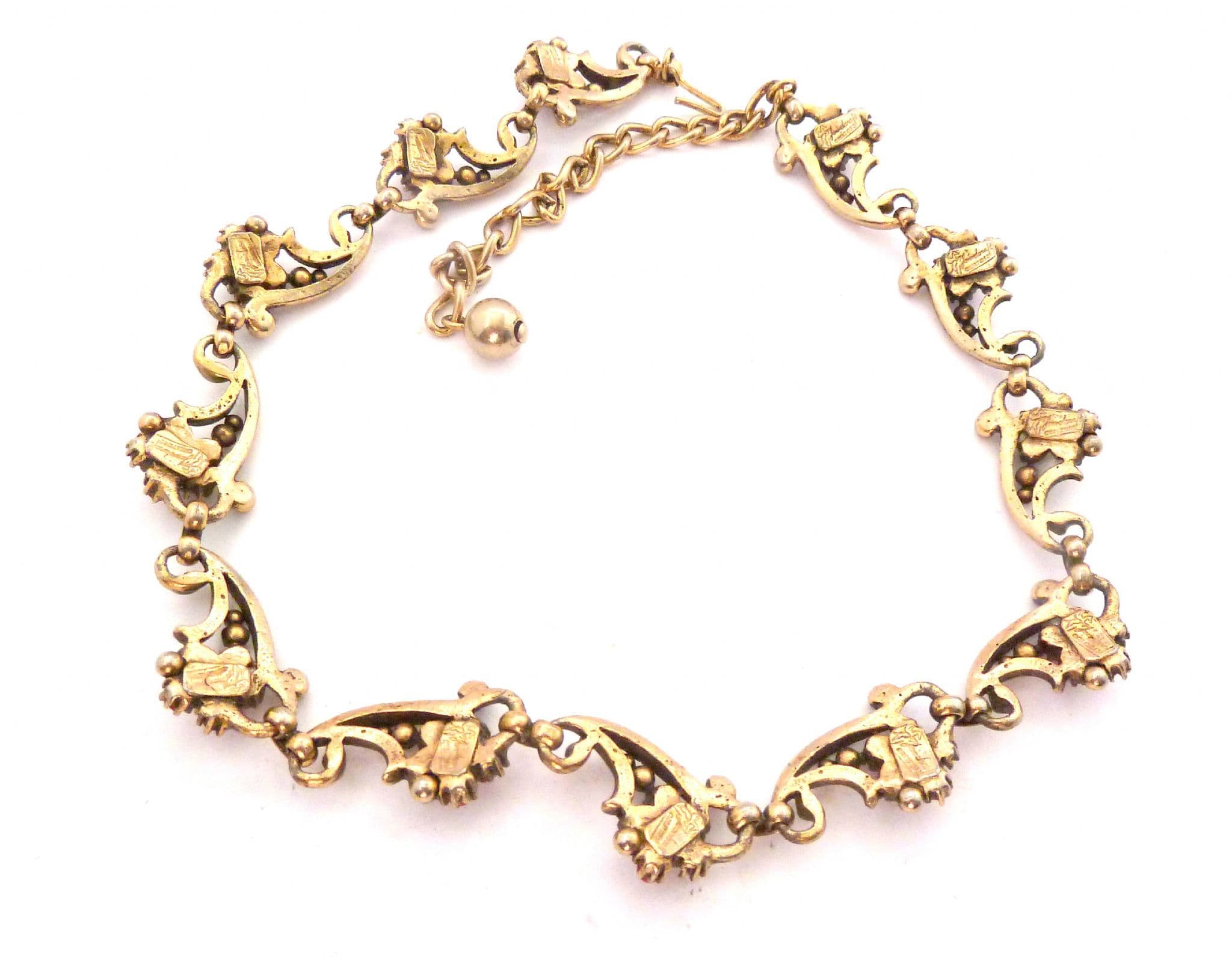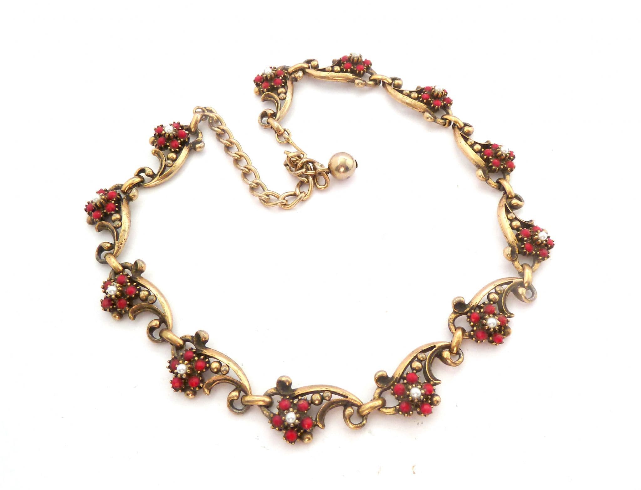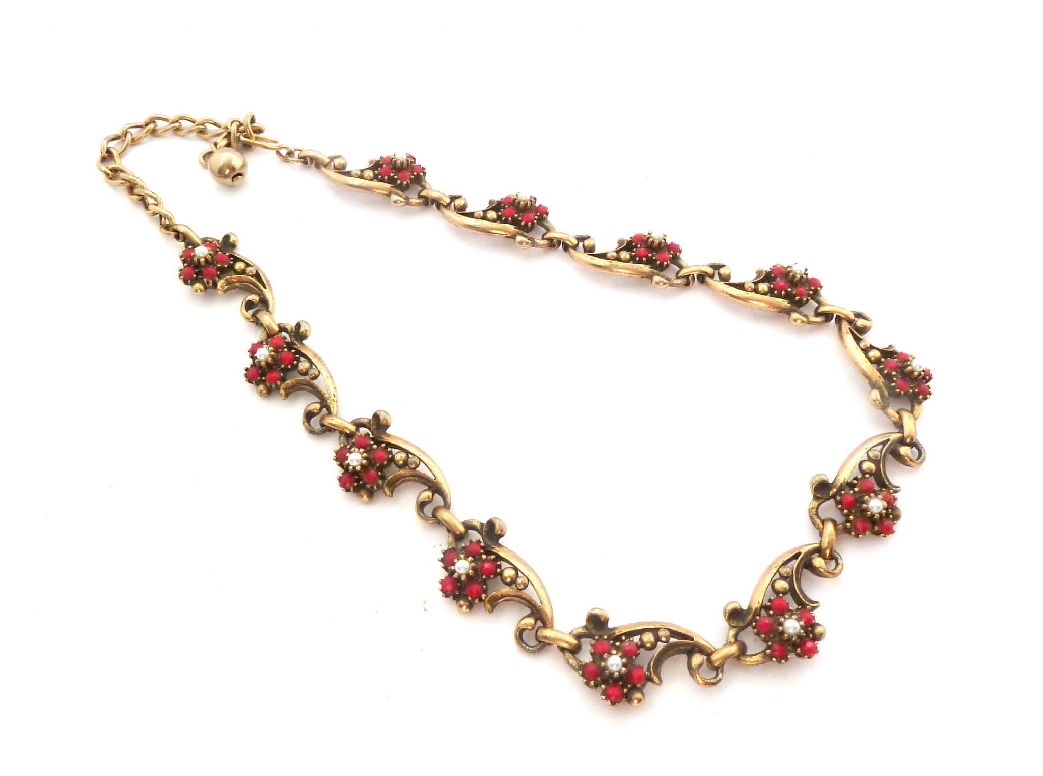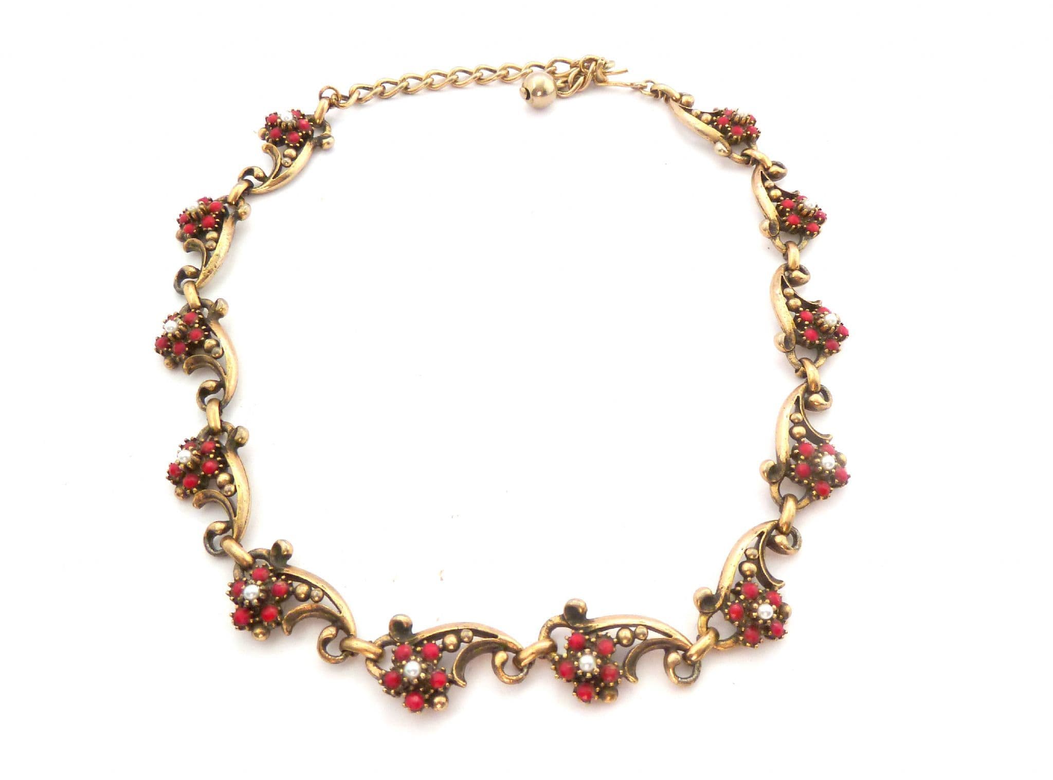 A vintage faux pearl and red rhinestone set, floral design adjustable length panel necklace by Jewelcraft. The necklace is formed from gold tone metal, to the front is set twelve faux pearl and red opaque rhinestone detailed floral design panels. Fastened with an adjustable length hook clasp. Circa 1940s - 50s.