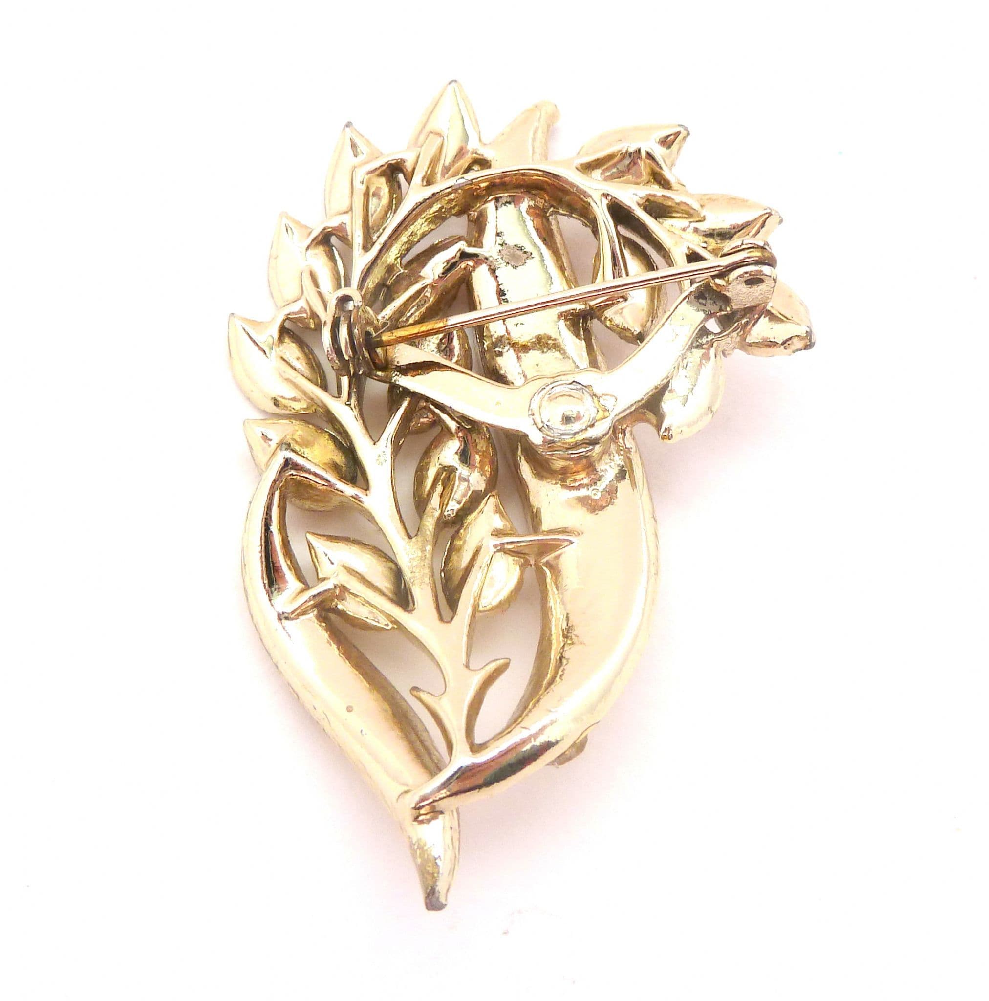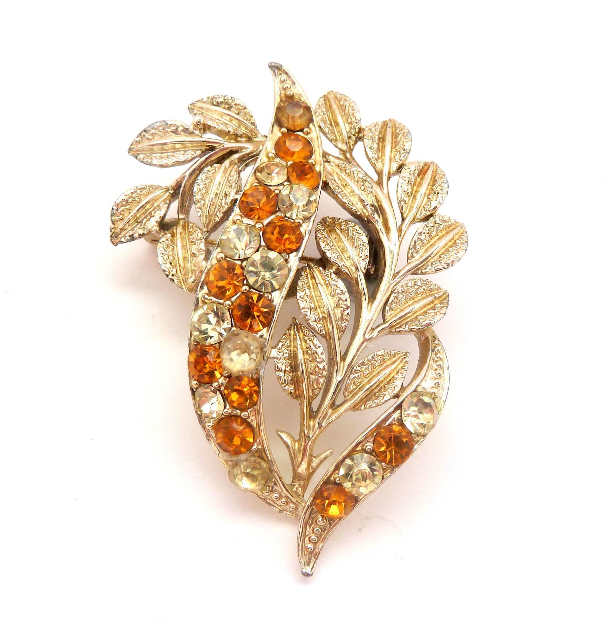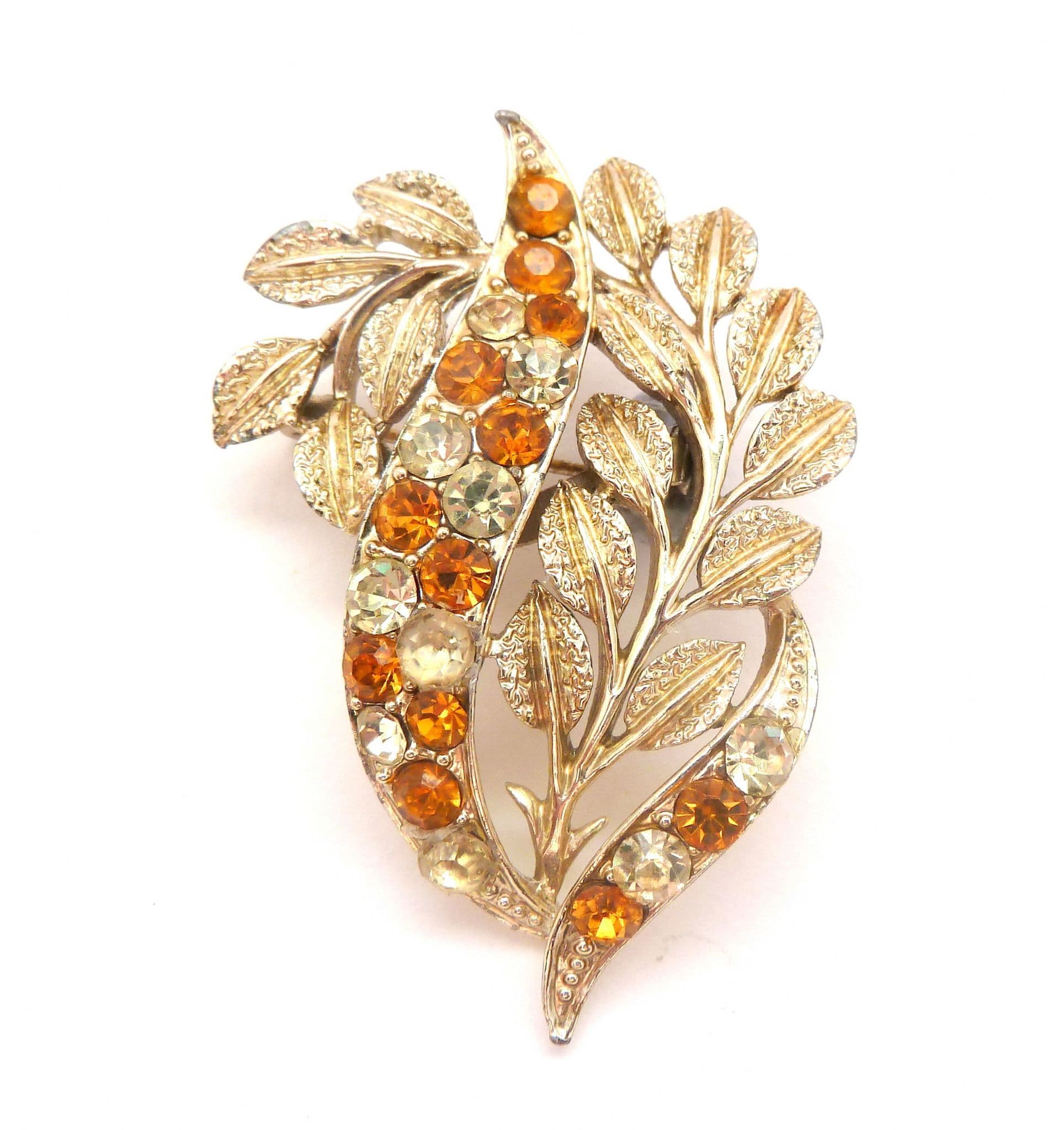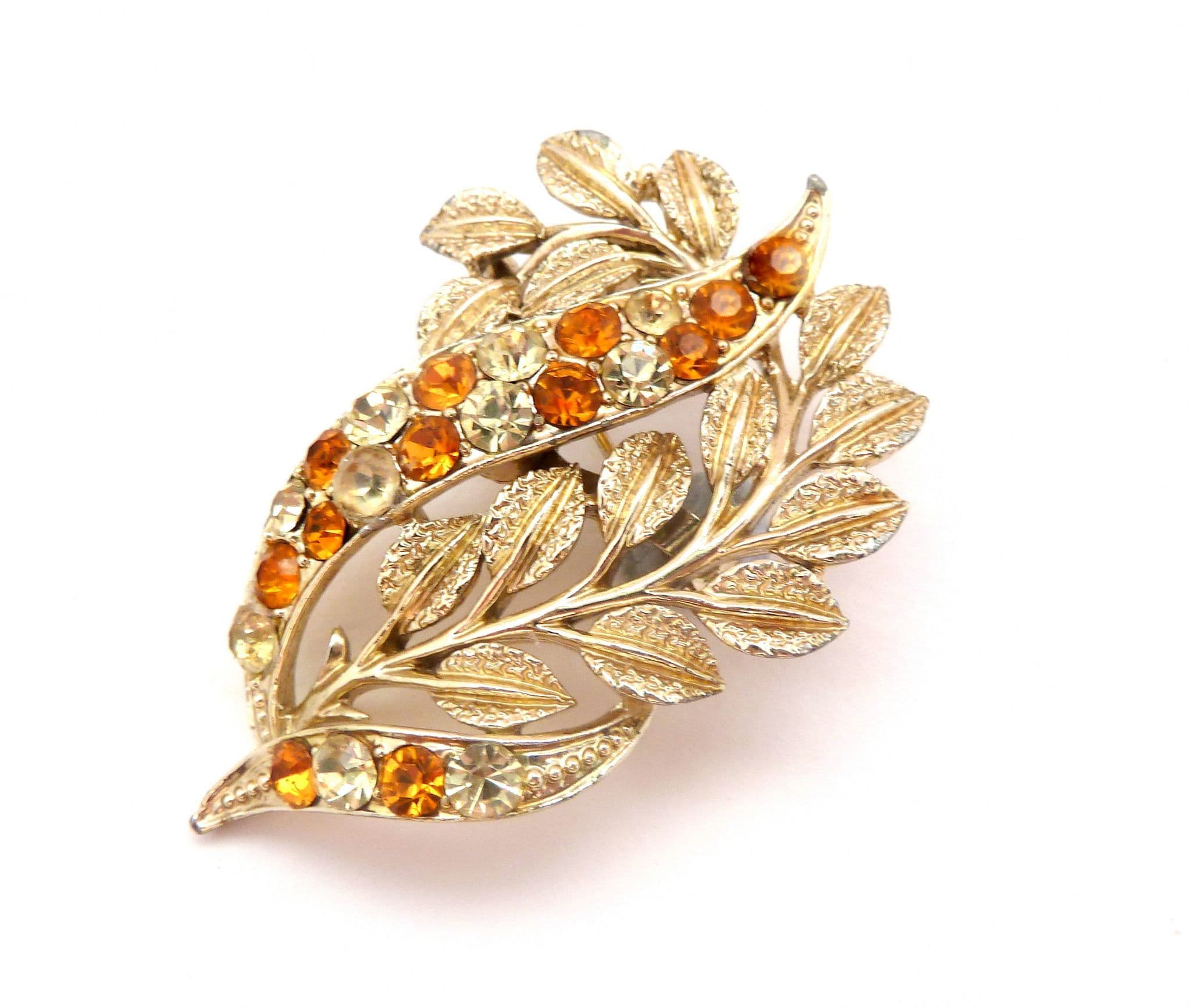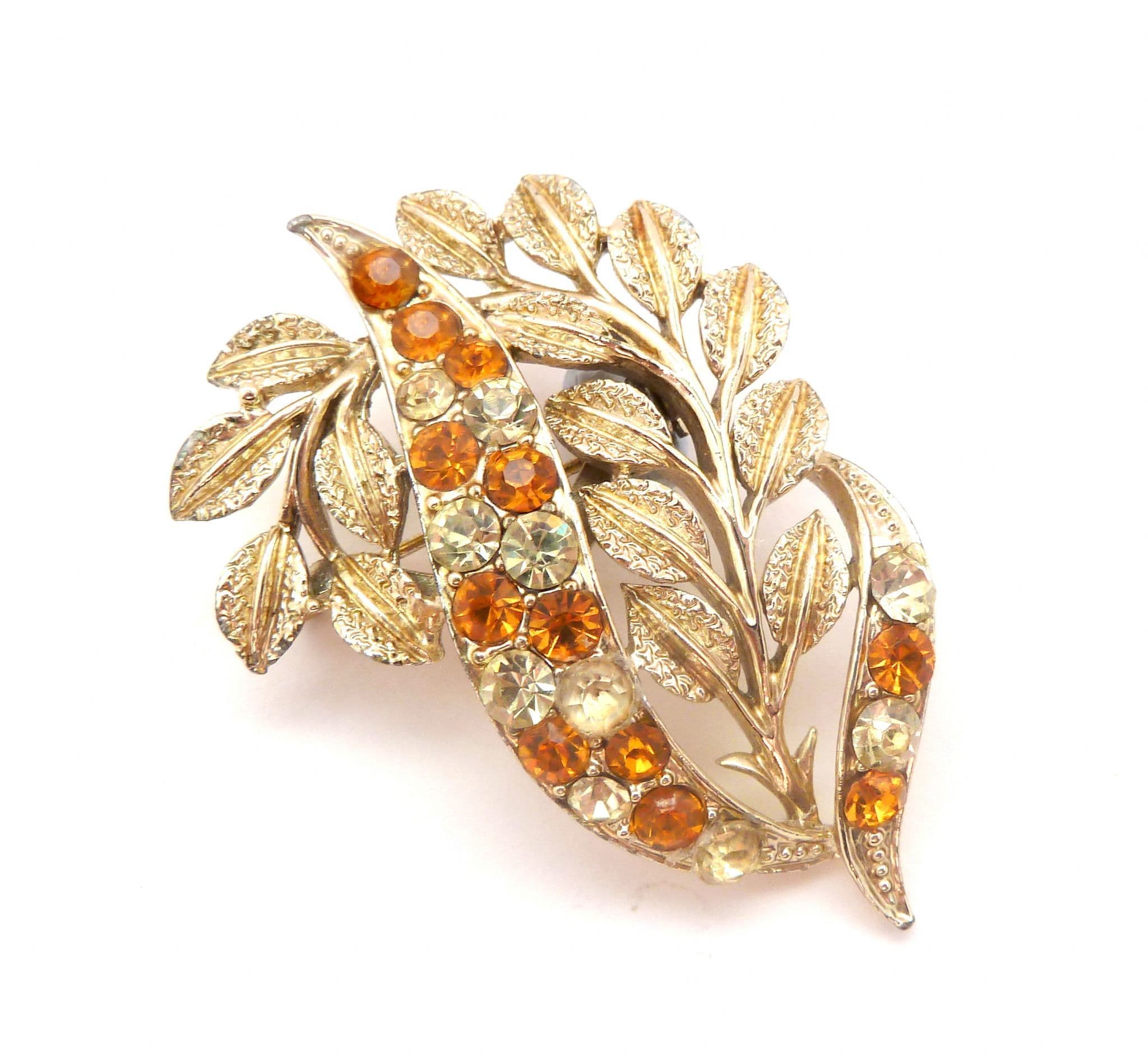 A vintage large amber and jonquil yellow rhinestone set leaf design brooch. The brooch is formed from gold tone metal in a large leaf style design set with amber and jonquil yellow coloured rhinestones. The brooch has a secure old roll over safety safety clasp fastening. Circa late 1950's - 60's.