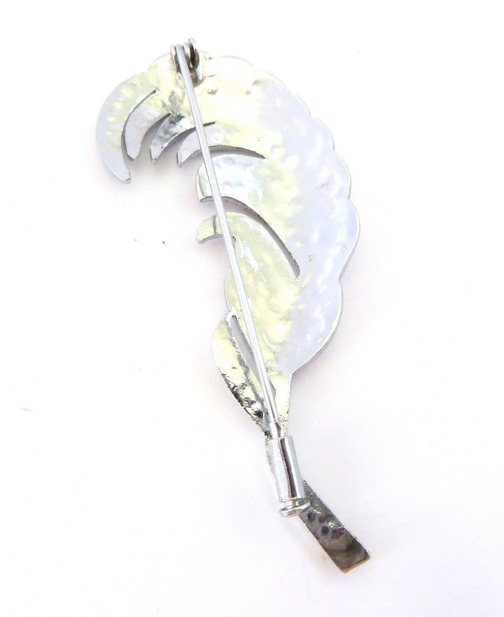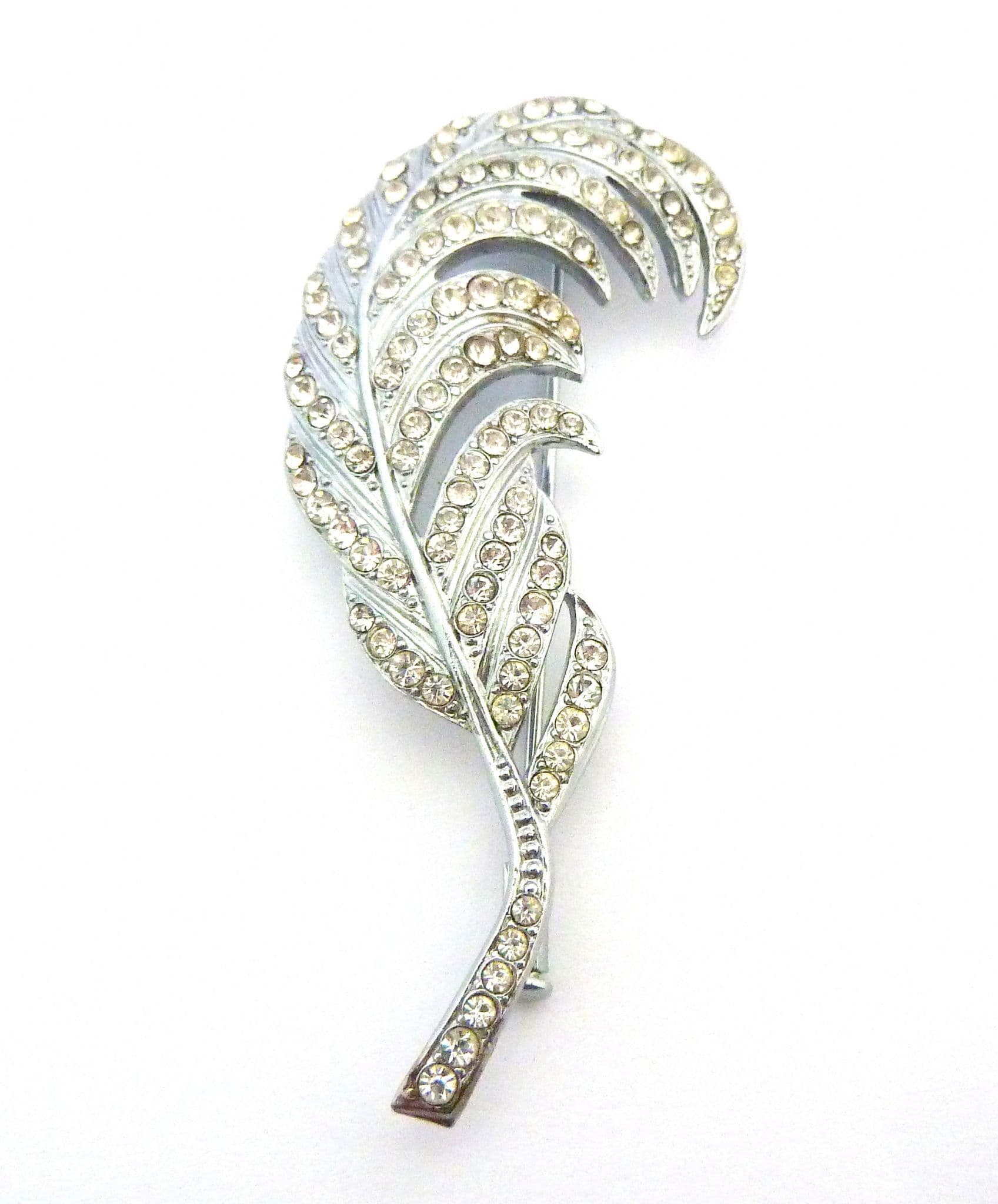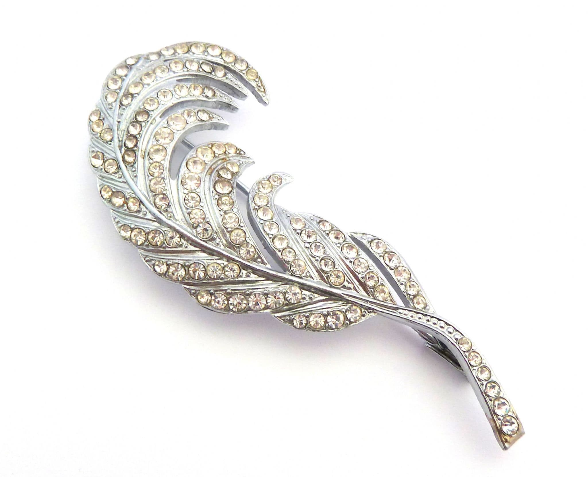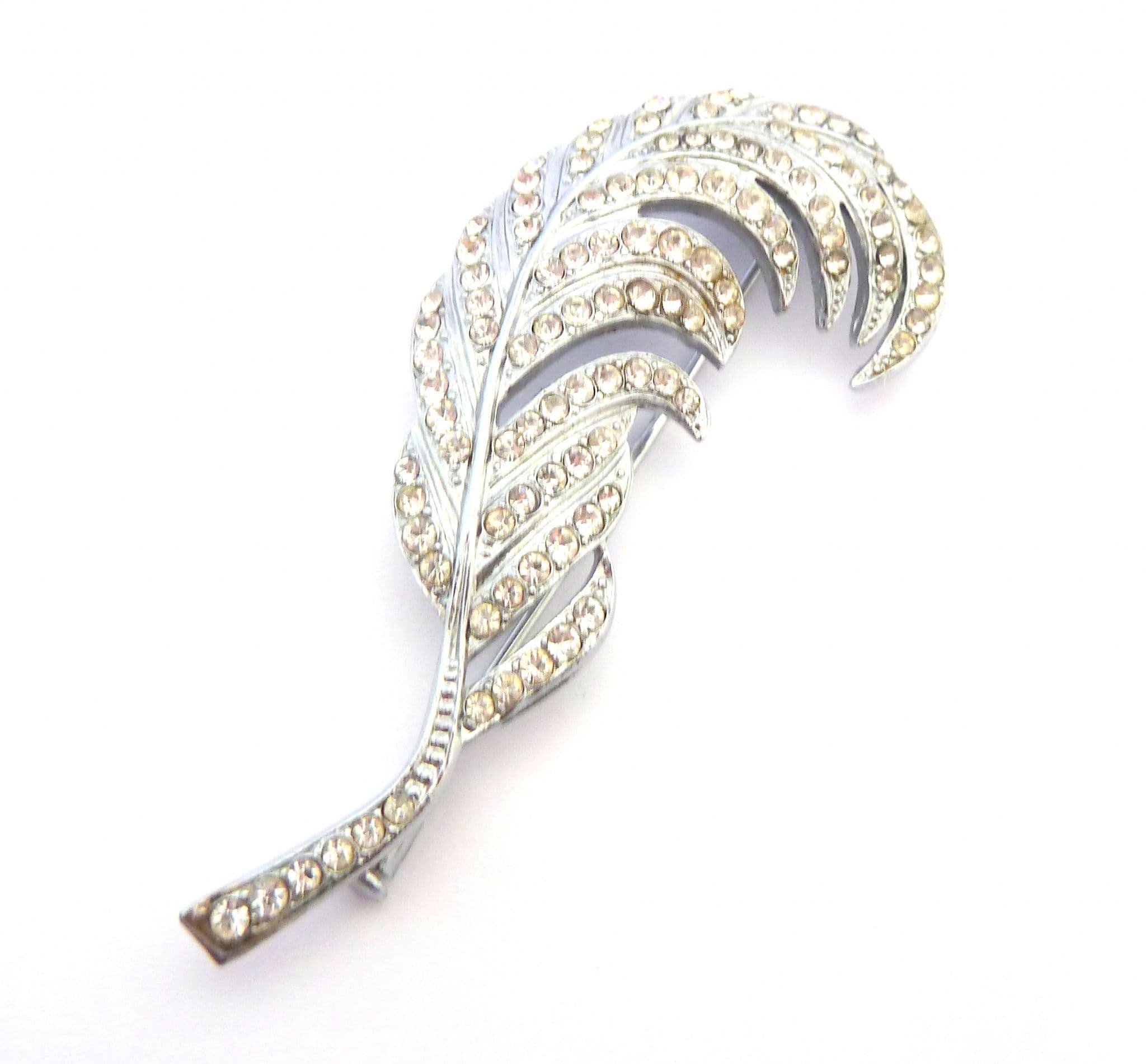 A vintage art deco era rhinestone set curving leaf design brooch. Formed from silver tone metal set with clear rhinestones in a curving leaf design. Circa 1930's - early 40's