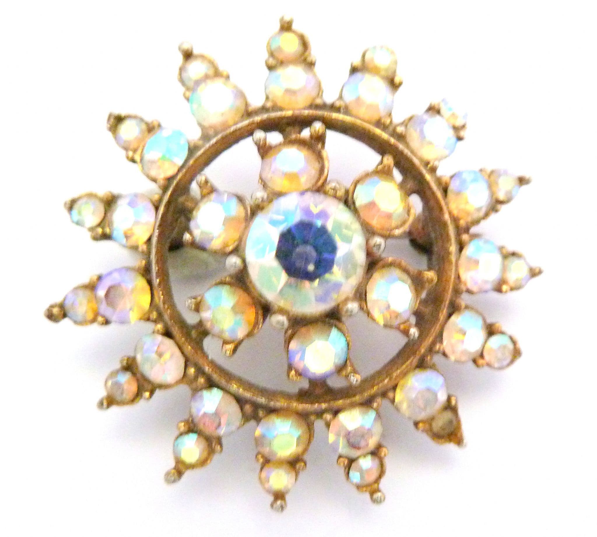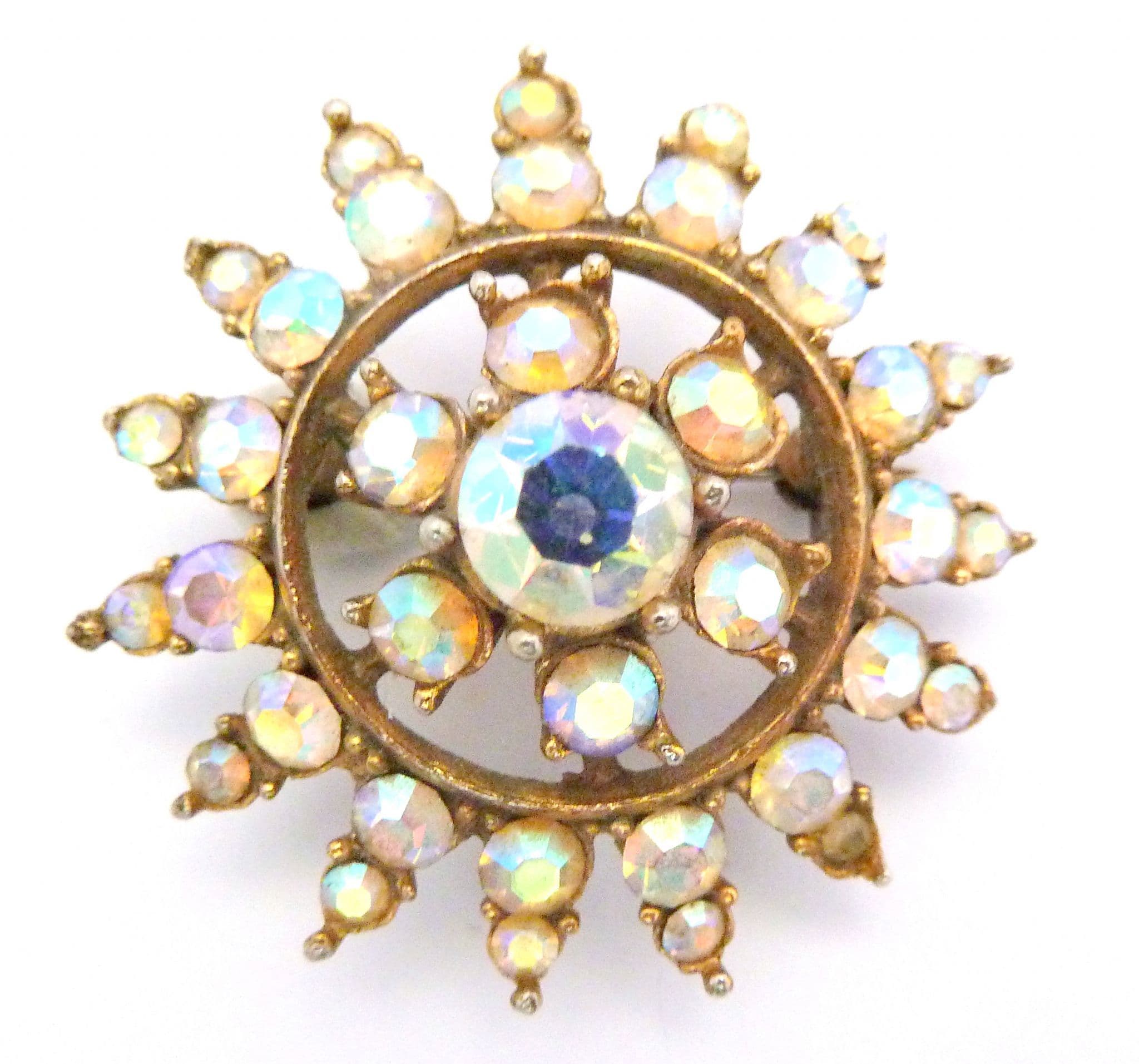 A vintage large aurora borealis raised rhinestone atomic flower design brooch. The brooch is formed from gold tone metal in a raised floral atomic design set with aurora borealis rhinestones. The central raised rhinestones create a lovely 3D effect. Circa 1950's.